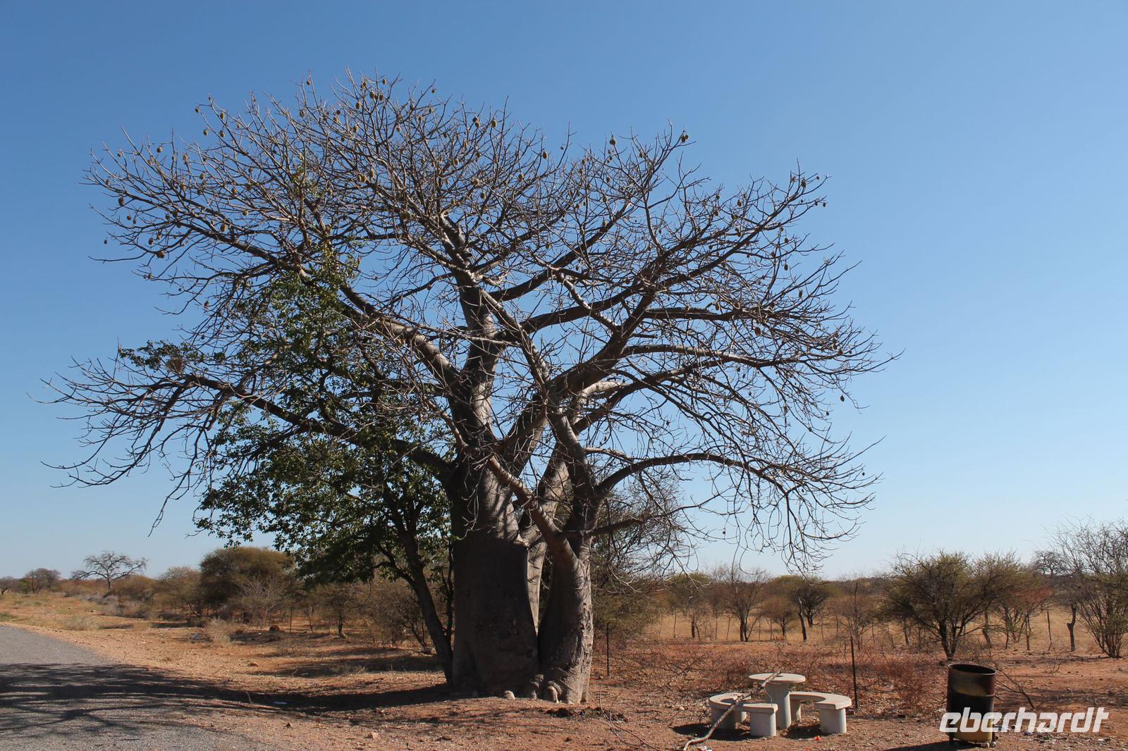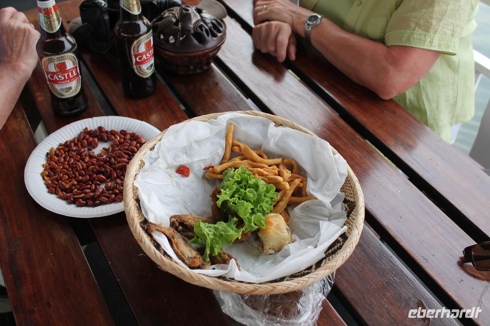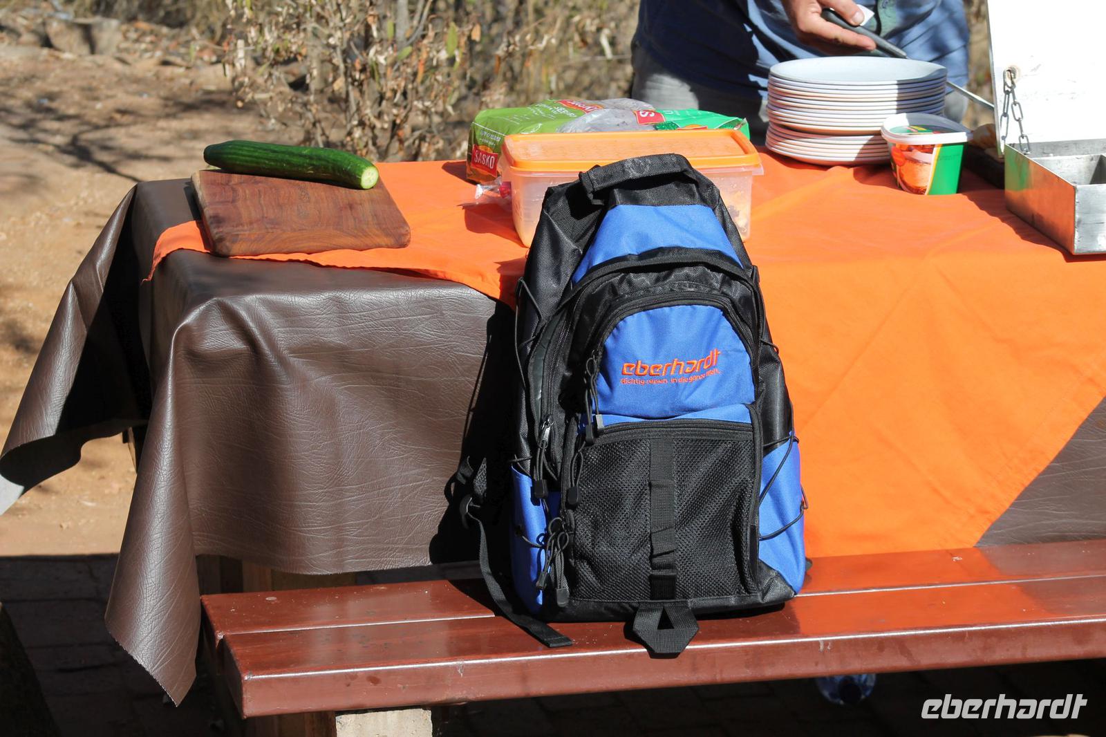 Unsere Reise führt uns weiter bis kurz vor der Grenze zu Botswana, wo wir am schönen Straßenrand ein Picknick aufbauen. Gott sei Dank hat unser Safari Truck immer eine Campingausrüstung dabei und so können wir innerhalb weniger Minuten leckeres Brot mit Aufstrich, Wurst und Käse und andere Köstlichkeiten von Tom genießen. Der Wein