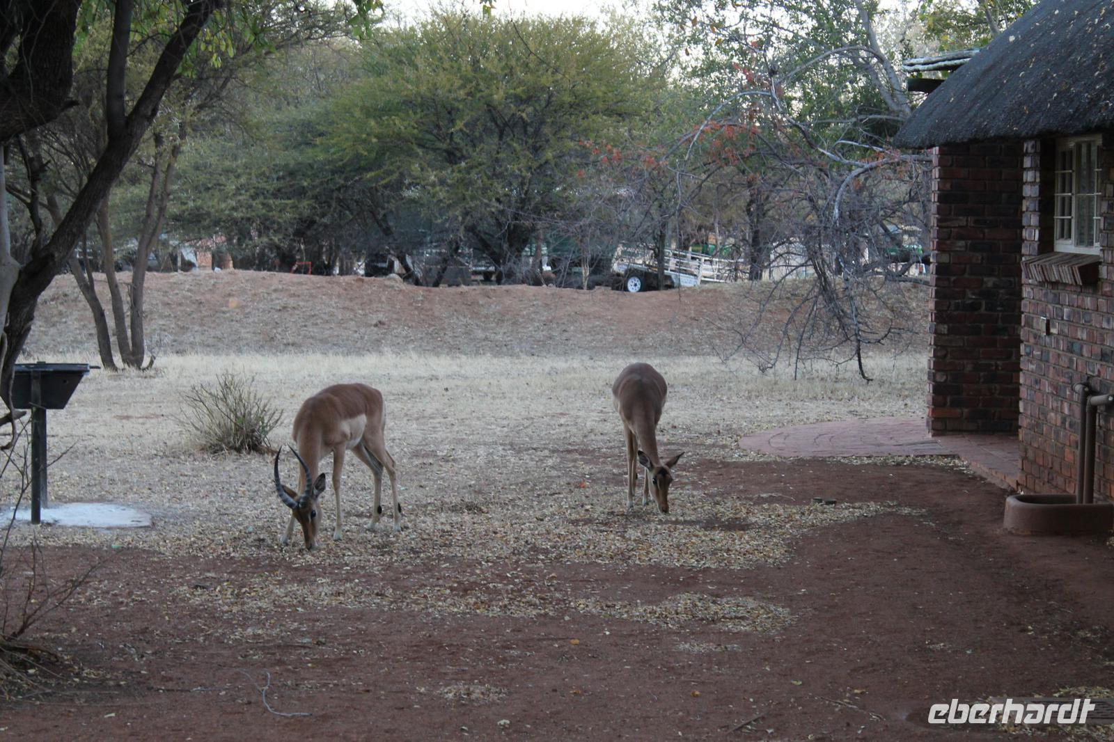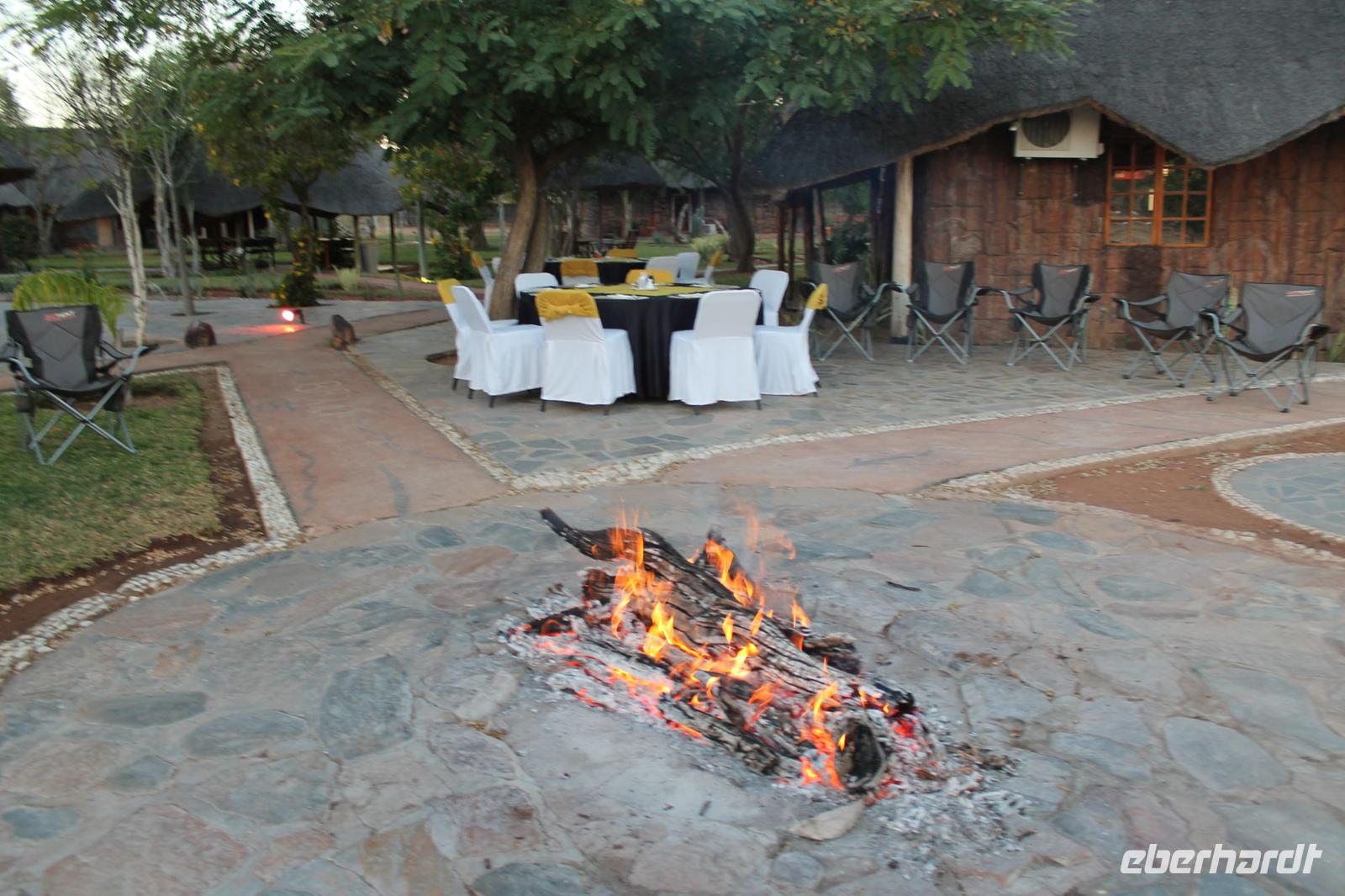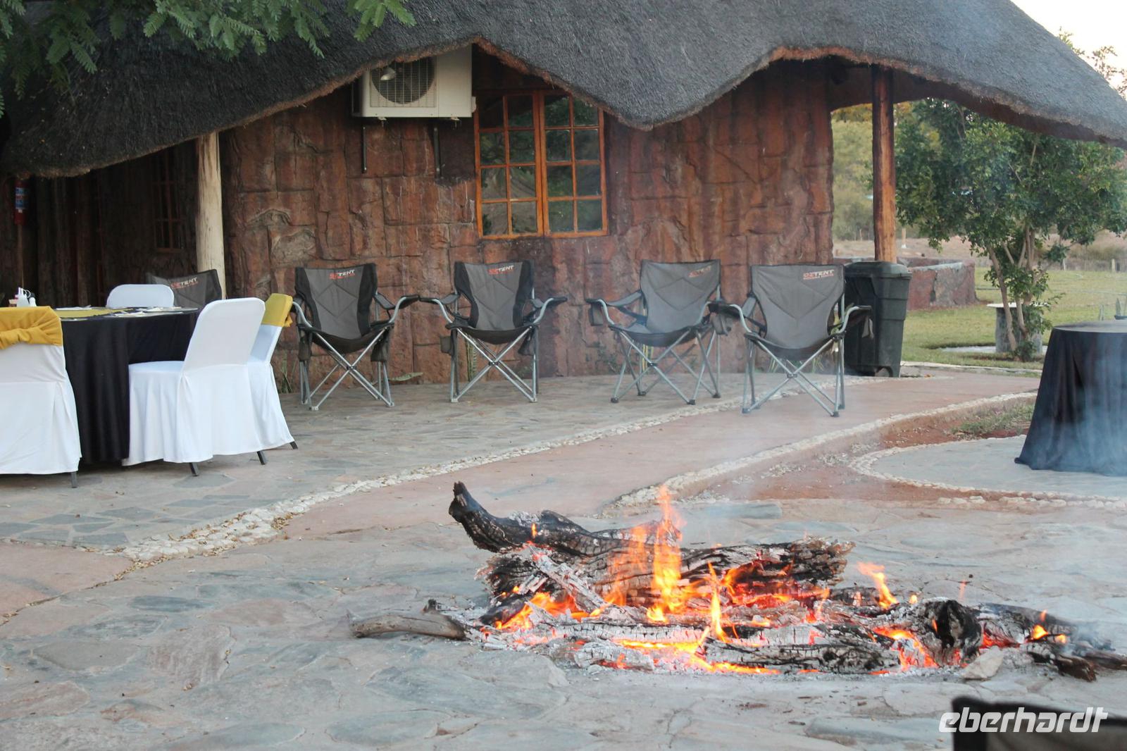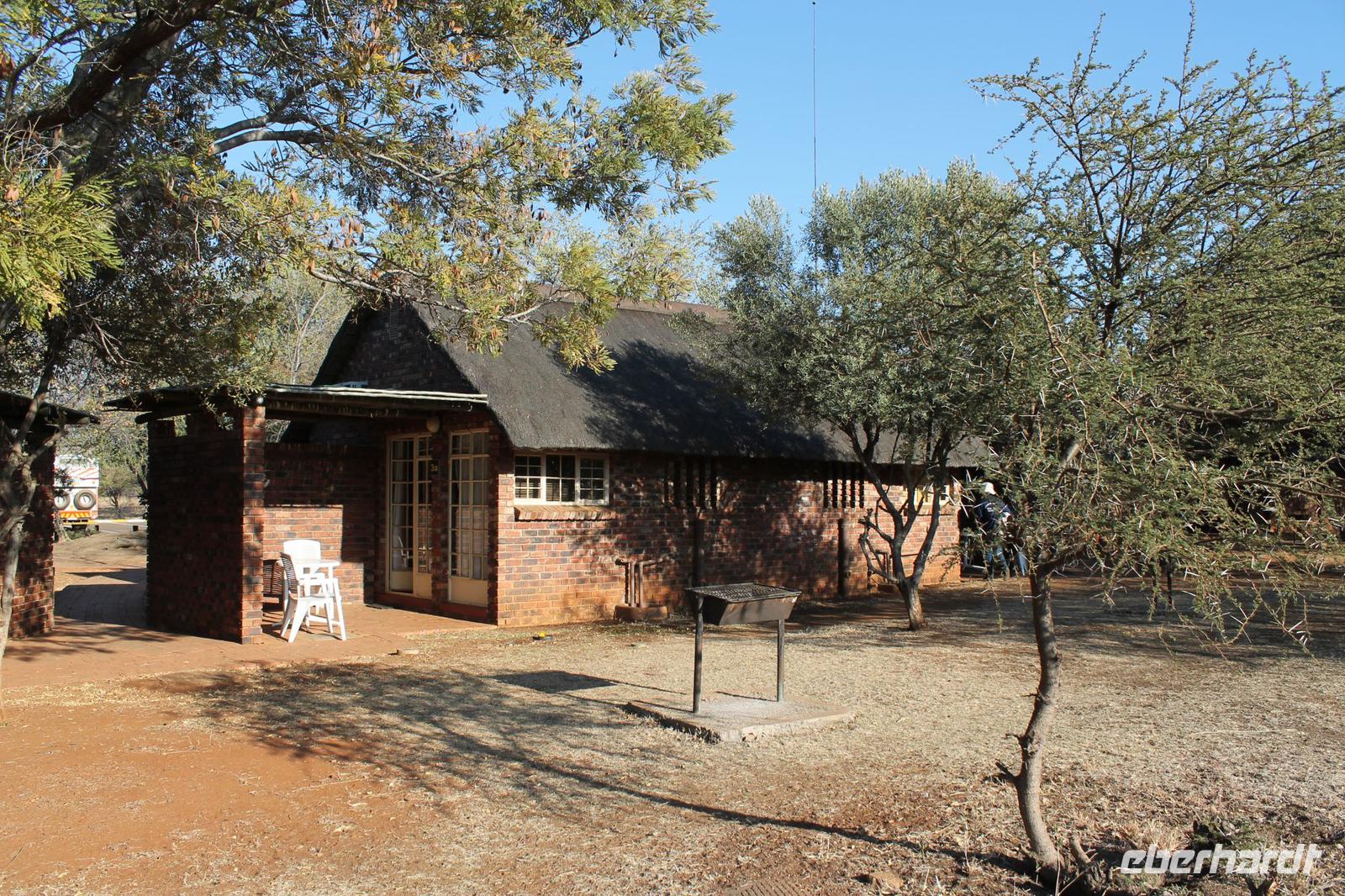 Unsere Fahrt führt uns weiter zur Golden Leopard Lodge in Bakgatla im Pilanesberg-Nationalpark. Leider passt unser Bus nicht durch das eigentlich vorgesehene Tor und so nehmen wir eben den Seiteneingang mit Schotterpiste In Afrika geht eben alles. Auf unserem Weg sehen wir einige Impalas und an der Lodge kleine Affen und eine Mange Perlhühner. Wir sind endlich angekommen in unserem Afrika. So beziehen wir unsere Hütten oder nobler ausgedrückt unsere Châlets und freuen uns bereits auf unser Abendessen, denn heute kocht der Chef persönlich für uns. So treffen wir uns am Abend vor seiner Hütte und stoßen mit unserem südafrikanischen Wein und einem einheimischen Bier auf die nächsten Tage an. Währenddessen bereitet Tom ein leckeres südafrikanisches Braai (deutsch: Barbecue) zu. Nach den ersten Gesprächen und einer aufschlussreichen Vorstellungsrunde genießen wir südafrikanische Spezialitäten wie den „Pab" mit einer Soße aus Bohnen, Tomaten und Rote Beete sowie frisch gegrillte Würste und Steaks und schmackhaften Salat. Allen schmeckt es wunderbar und so lassen wir den Abend gemütlich ausklingen. Schnell stellen wir fest, dass es in Südafrika bereits 18:15 Uhr stockdunkel ist und die Temperaturen im Gegensatz zum Tag schnell auf unter 10 Grad sinken. Die lange Anreise steckt uns noch in den Knochen und so gehen wir heute früh schlafen und träumen von so machen Giraffen, Elefanten und Nashörnern, die wir am nächsten Tag hoffentlich noch sehen werden.