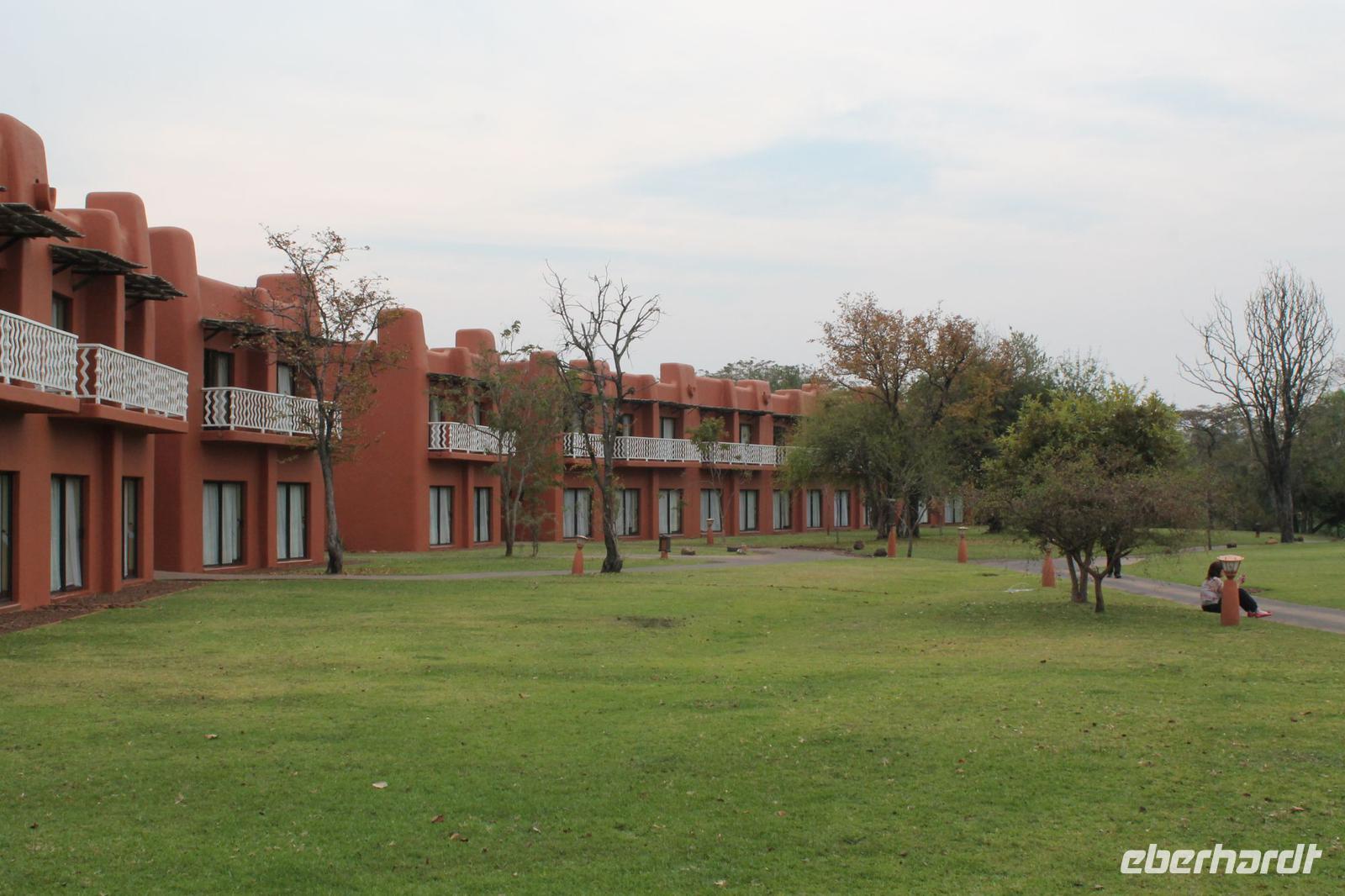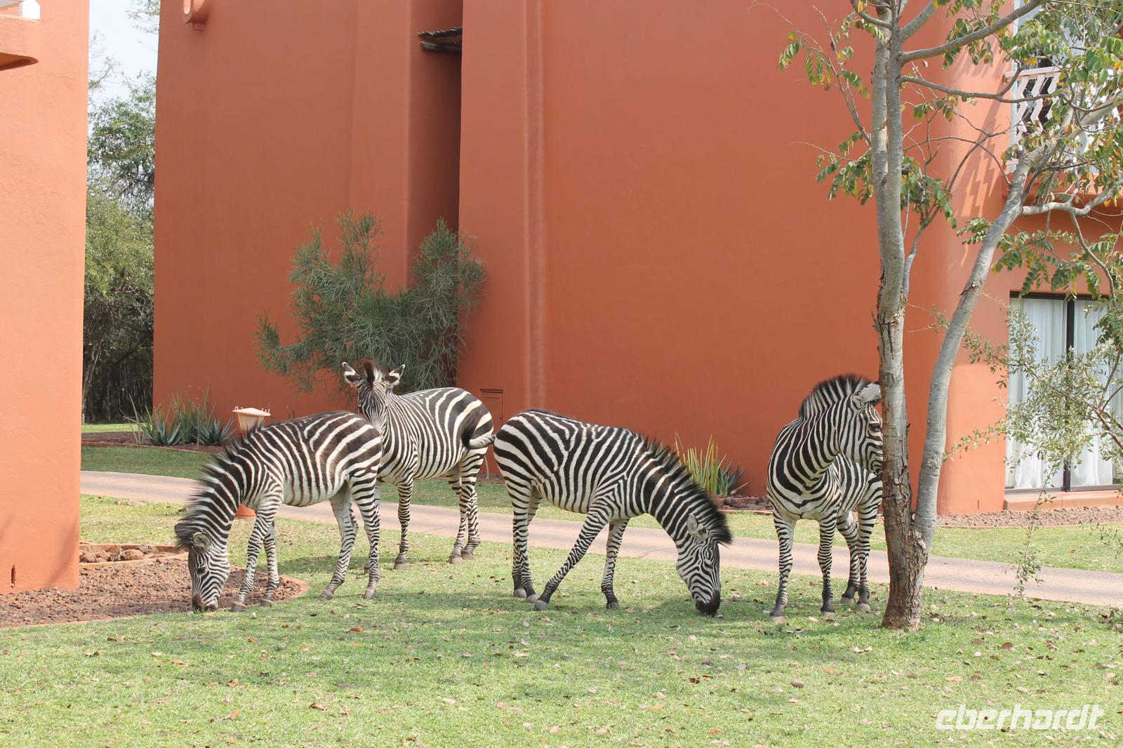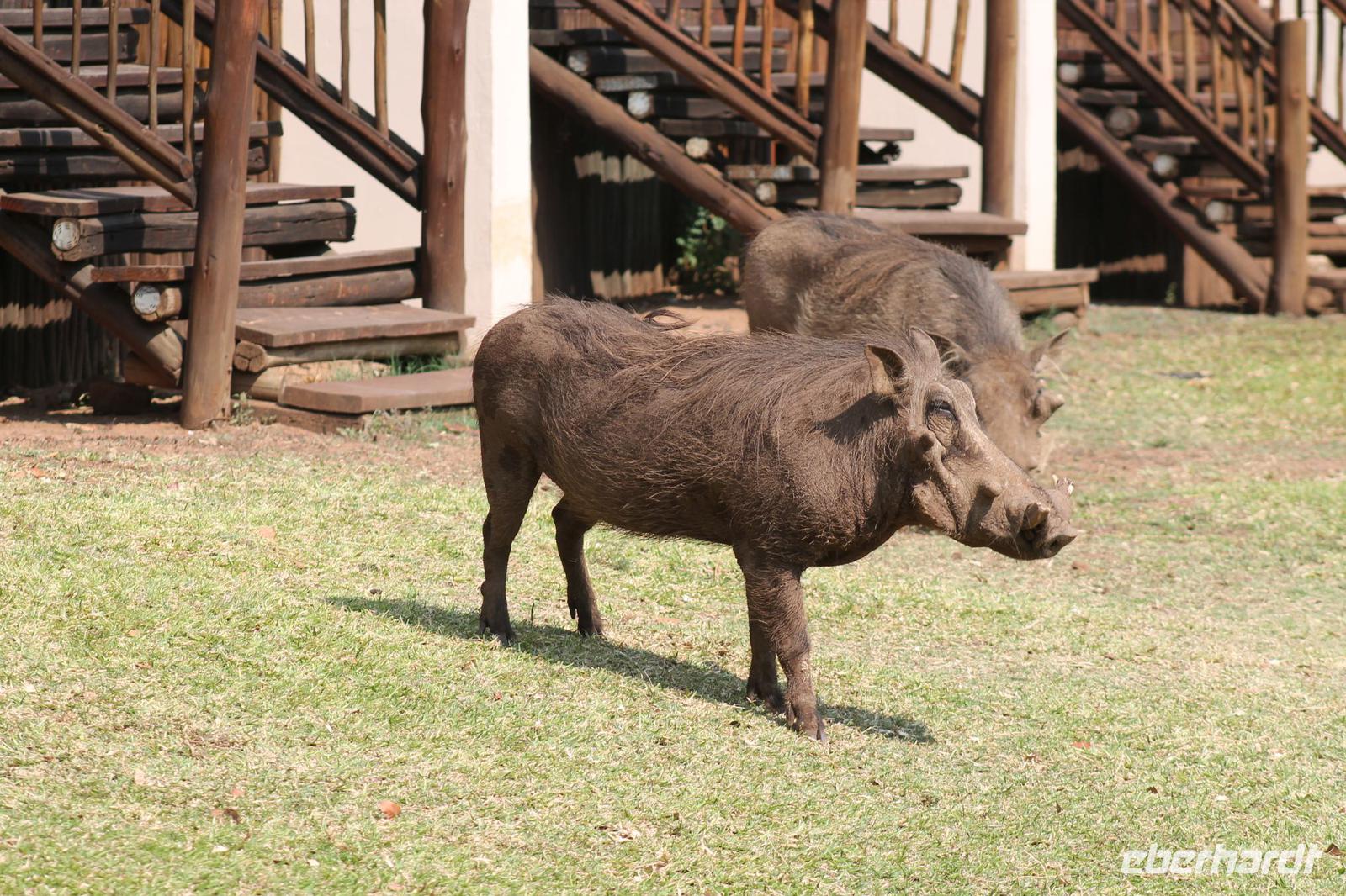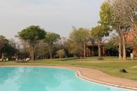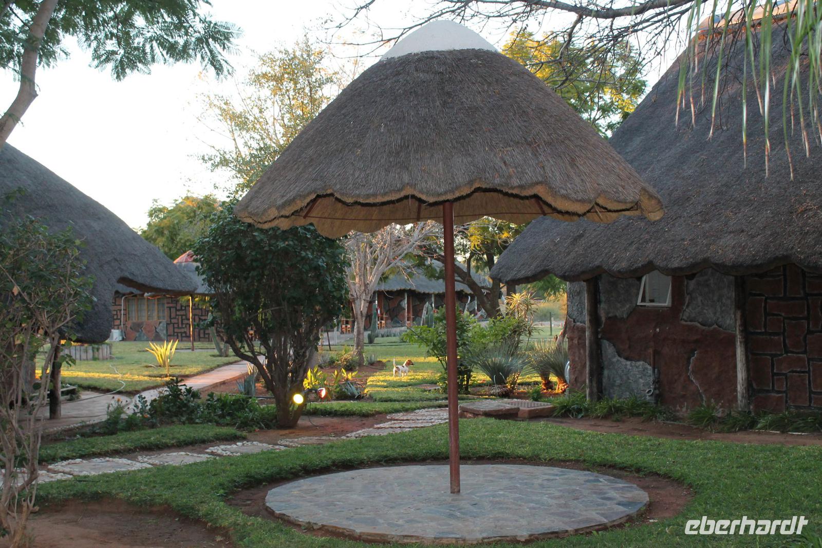 Unsere Fahrt führt uns weiter zur Golden Leopard Lodge in Bakgatla im Pilanesberg-Nationalpark. Leider passt unser Bus nicht durch das eigentlich vorgesehene Tor und so nehmen wir eben den Seiteneingang mit Schotterpiste In Afrika geht eben alles. Auf unserem Weg sehen wir einige Impalas und an der Lodge kleine Affen und eine Mange Perlhühner. Wir sind endlich angekommen in unserem Afrika. So beziehen wir unsere Hütten oder nobler ausgedrückt unsere Châlets und freuen uns bereits auf unser Abendessen, denn heute kocht der Chef persönlich für uns. So treffen wir uns am Abend vor seiner Hütte und stoßen mit unserem südafrikanischen Wein und einem einheimischen Bier auf die nächsten Tage an. Währenddessen bereitet Tom ein leckeres südafrikanisches Braai (deutsch: Barbecue) zu. Nach den ersten Gesprächen und einer aufschlussreichen Vorstellungsrunde genießen wir südafrikanische Spezialitäten wie den „Pab" mit einer Soße aus Bohnen, Tomaten und Rote Beete sowie frisch gegrillte Würste und Steaks und schmackhaften Salat. Allen schmeckt es wunderbar und so lassen wir den Abend gemütlich ausklingen. Schnell stellen wir fest, dass es in Südafrika bereits 18:15 Uhr stockdunkel ist und die Temperaturen im Gegensatz zum Tag schnell auf unter 10 Grad sinken. Die lange Anreise steckt uns noch in den Knochen und so gehen wir heute früh schlafen und träumen von so machen Giraffen, Elefanten und Nashörnern, die wir am nächsten Tag hoffentlich noch sehen werden.