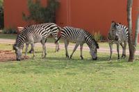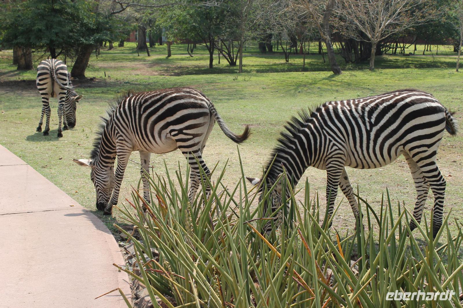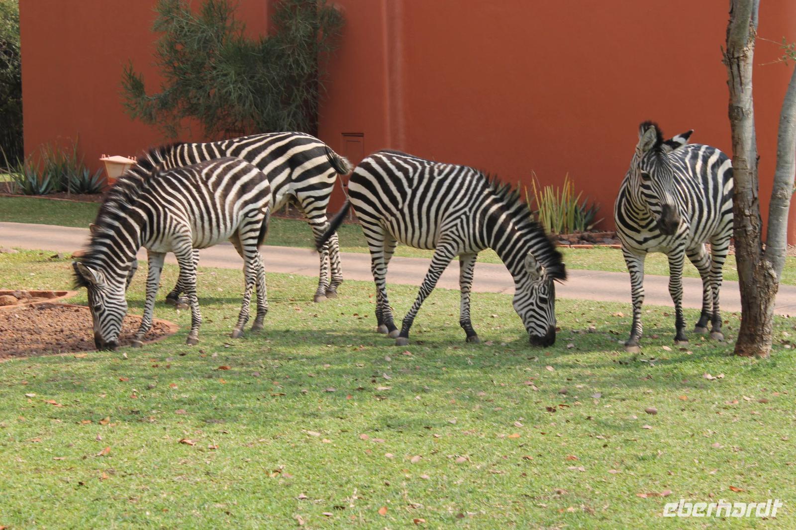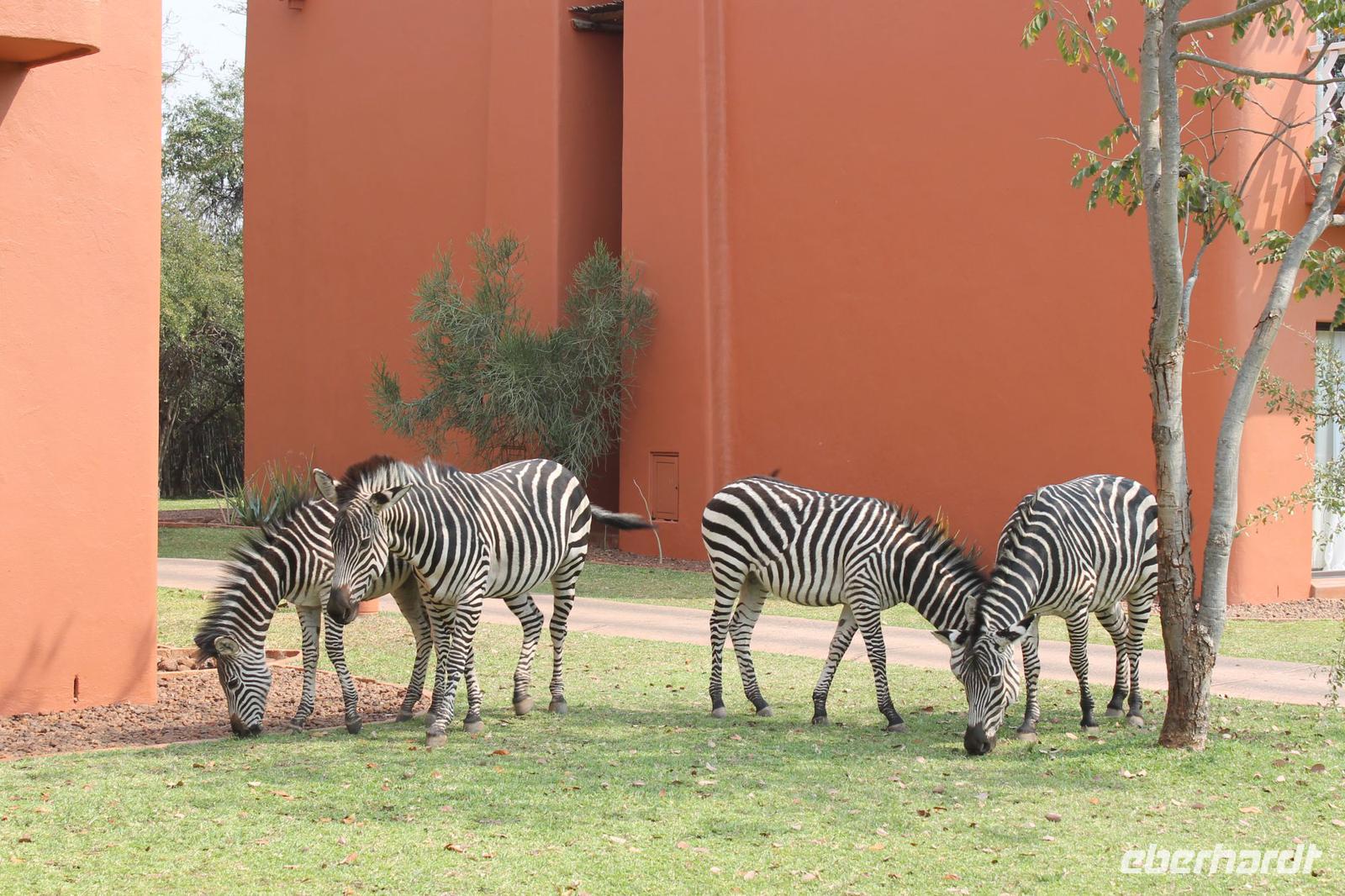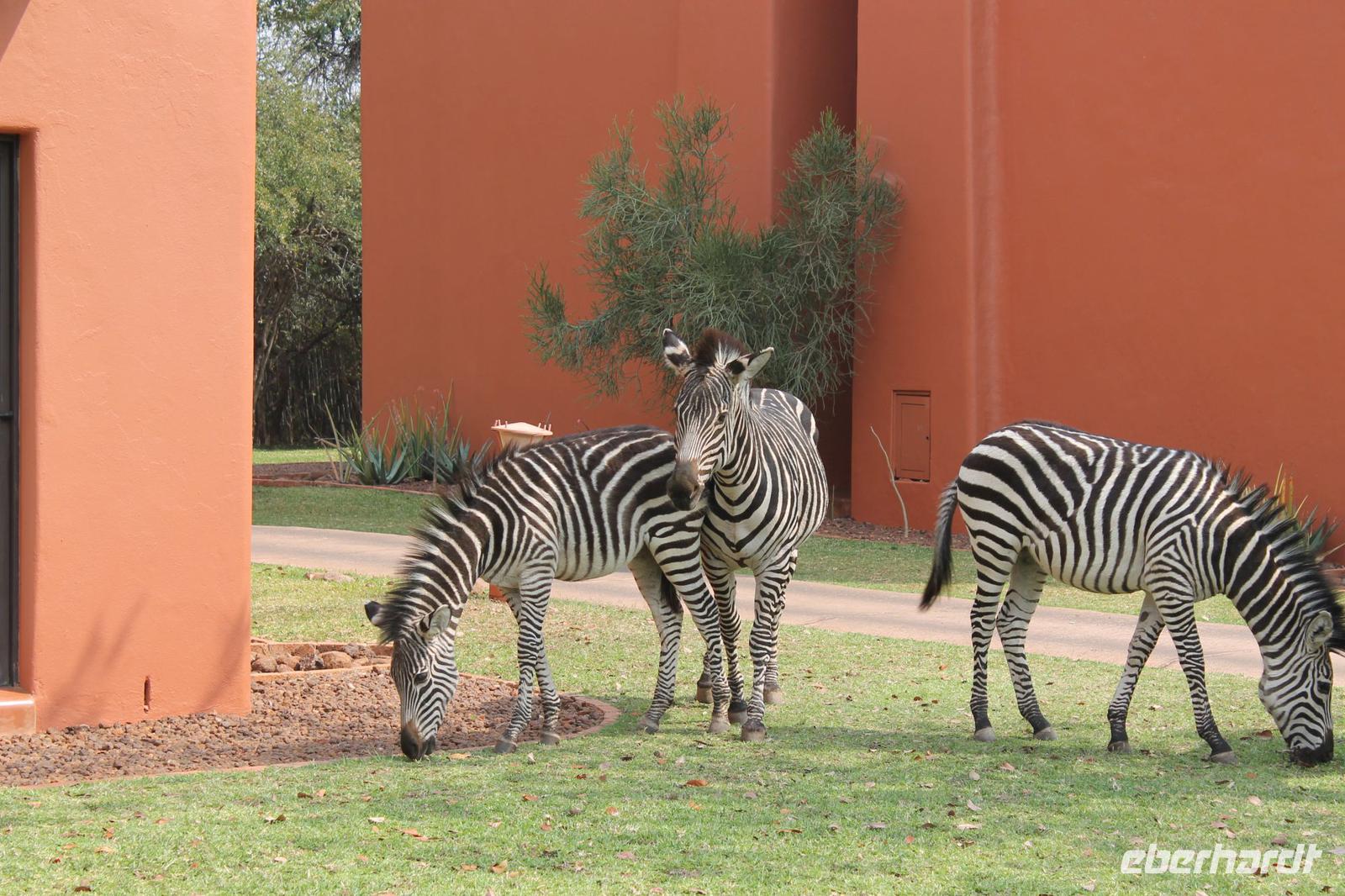 Unsere Fahrt führt uns weiter zur Golden Leopard Lodge in Bakgatla im Pilanesberg-Nationalpark. Leider passt unser Bus nicht durch das eigentlich vorgesehene Tor und so nehmen wir eben den Seiteneingang mit Schotterpiste In Afrika geht eben alles. Auf unserem Weg sehen wir einige Impalas und an der Lodge kleine Affen und eine Mange Perlhühner. Wir sind endlich angekommen in unserem Afrika. So beziehen wir unsere Hütten oder nobler ausgedrückt unsere Châlets und freuen uns bereits auf unser Abendessen, denn heute kocht der Chef persönlich für uns. So treffen wir uns am Abend vor seiner Hütte und stoßen mit unserem südafrikanischen Wein und einem einheimischen Bier auf die nächsten Tage an. Währenddessen bereitet Tom ein leckeres südafrikanisches Braai (deutsch: Barbecue) zu. Nach den ersten Gesprächen und einer aufschlussreichen Vorstellungsrunde genießen wir südafrikanische Spezialitäten wie den „Pab" mit einer Soße aus Bohnen, Tomaten und Rote Beete sowie frisch gegrillte Würste und Steaks und schmackhaften Salat. Allen schmeckt es wunderbar und so lassen wir den Abend gemütlich ausklingen. Schnell stellen wir fest, dass es in Südafrika bereits 18:15 Uhr stockdunkel ist und die Temperaturen im Gegensatz zum Tag schnell auf unter 10 Grad sinken. Die lange Anreise steckt uns noch in den Knochen und so gehen wir heute früh schlafen und träumen von so machen Giraffen, Elefanten und Nashörnern, die wir am nächsten Tag hoffentlich noch sehen werden.