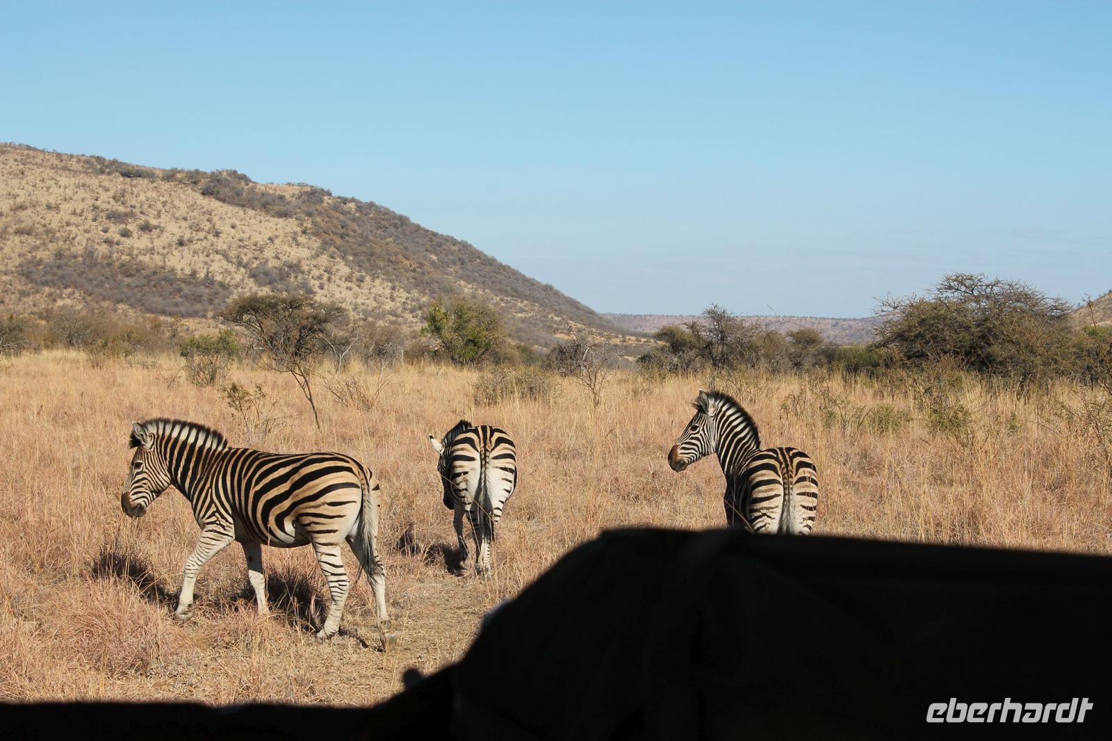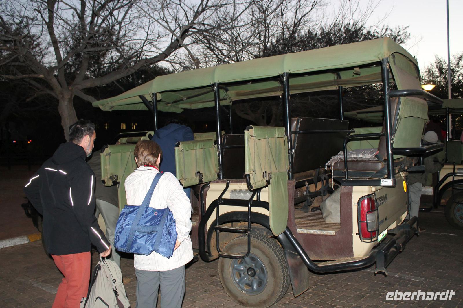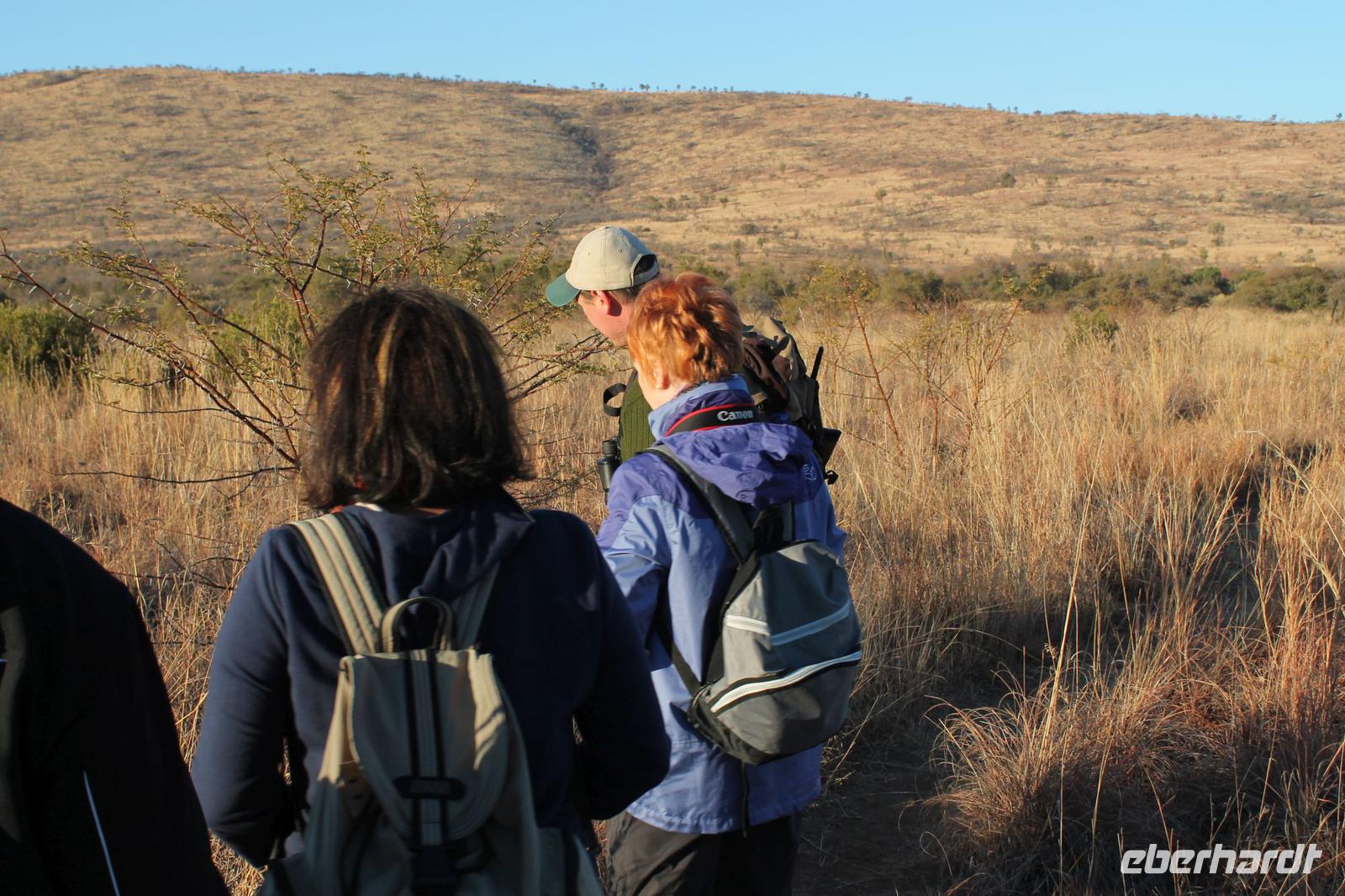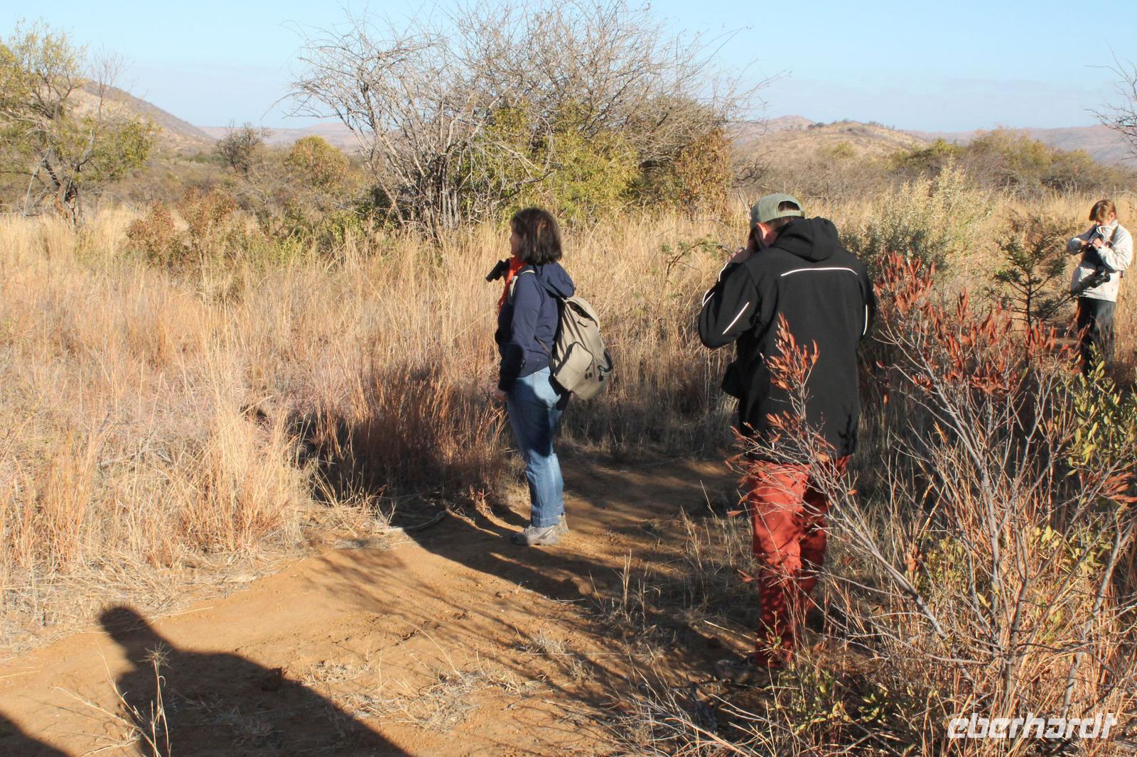Heute müssen wir schon zeitig aufstehen, denn ein ausgiebiger Spaziergang im Pilanesberg -Nationalpark erwartet uns am frühen Morgen. Alle haben gut in Ihren Châlets geschlafen und so starten wir ausgeruht um 06:15 Uhr mit unserem Tom und jeweils zwei Rangern pro Jeep zu unserer Fußpirsch.