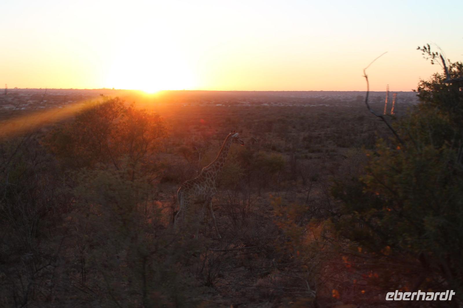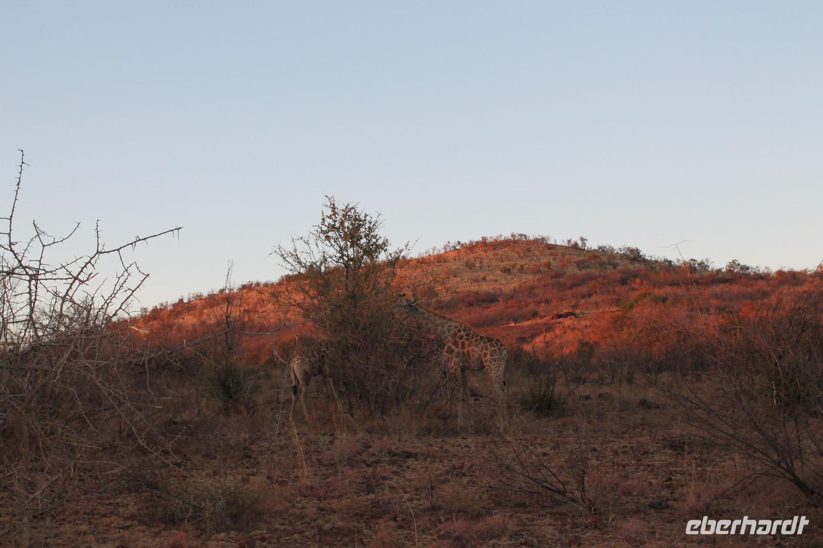 Bei gefühlten 0 Grad fahren wir zunächst etwa 15 Minuten bis zu unserem Startpunkt unserer Pirsch. Mit Decken bewaffnet halten wir uns während unserer Fahrt warm. Die Kälte ist schnell verflogen als wir bereits nach kurzer Zeit mehrere Giraffen am Wegesrand entdecken. Wenig später folgen die seltenen Spitzmaul-Nashörner, die selbst Tom seit zwei Jahren nicht im Park gesehen hat. So können wir unser Glück am ersten Morgen kaum fassen. Bei Sonnenaufgang erreichen wir zusammen mit unseren Rangern Daran und Nicko den Startpunkt unserer Pirsch.