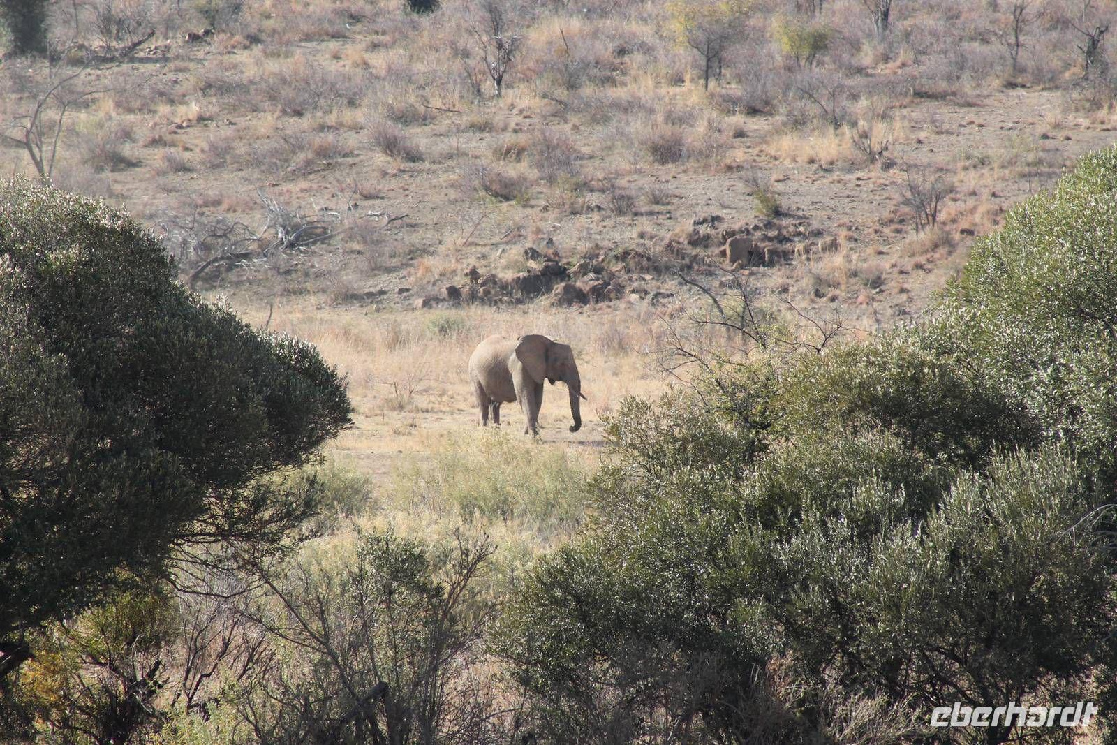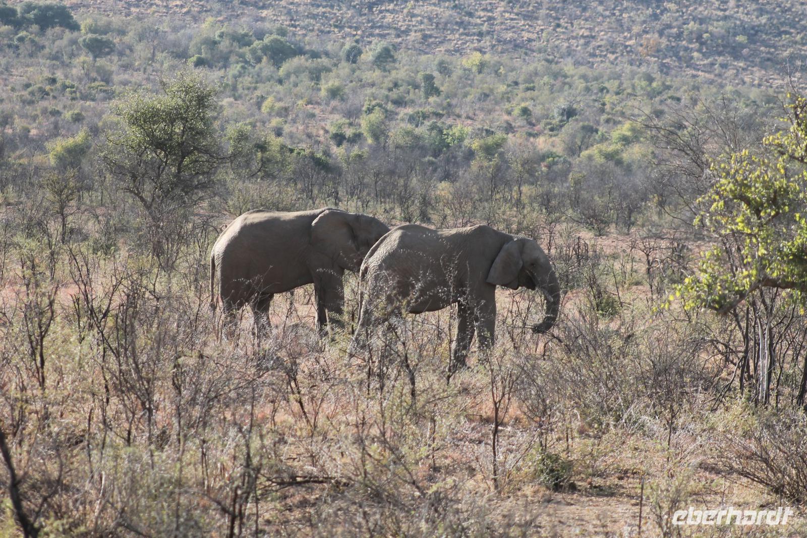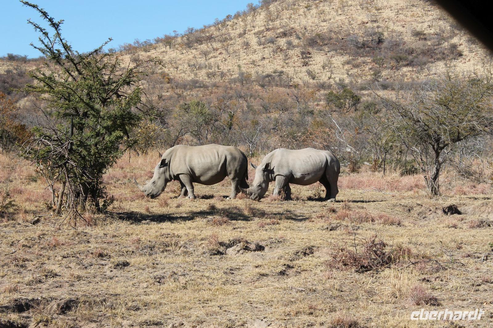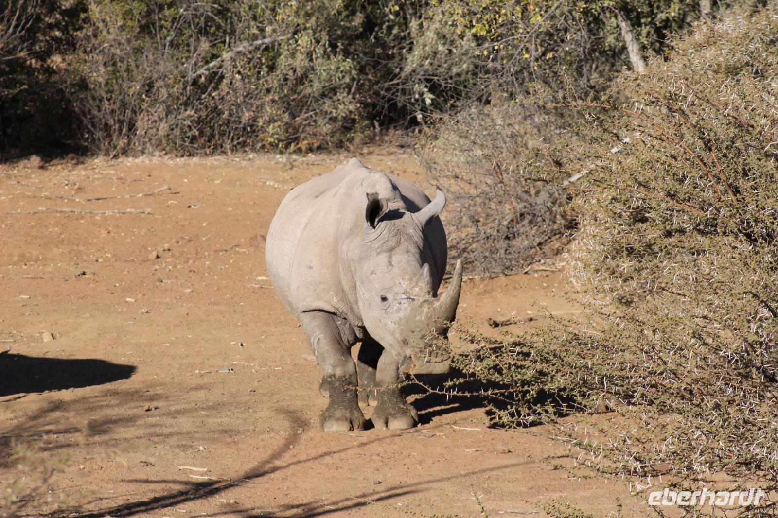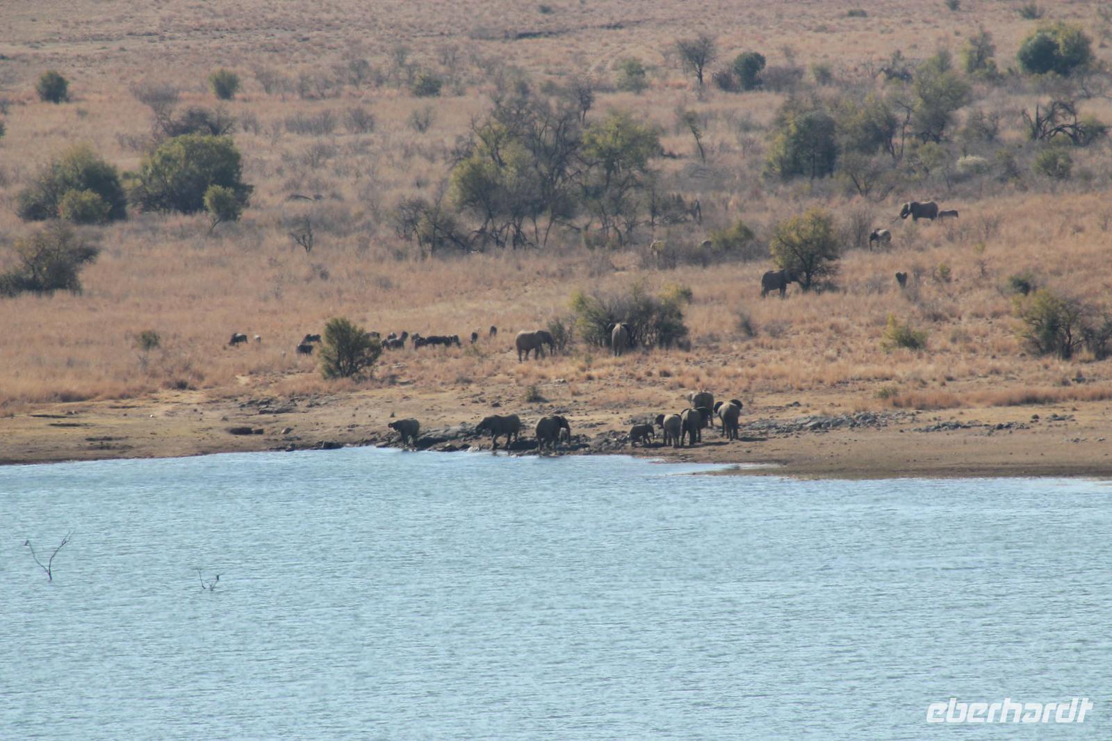 Ca. 2 Stunden spazieren wir durch das Buschfeld und erhalten Erläuterungen zu Fußabdrücken und den Hinterlassenschaften der Tiere Diese sehen wir in Vielzahl nur leider nicht die passenden Tiere dazu. Trotzdem war es eine erfolgreiche Tour und wir sind beeindruckt von der Landschaft und der unendlichen Natur. Wieder in unserem Jeep angekommen fahren wir zurück zu unserer Lodge und sehen kaum zu glauben zwei weitere Nashörner, diesmal aber die Breitmaulnashörner sowie einige Zebras. An der Lodge angekommen genießen wir ein wohl verdientes Frühstück mit frischem Kaffee und allerlei Köstlichkeiten. Wir können uns somit nicht beklagen. Nach einer kurzen Pause erwartet uns unser Bus mit Fahrer Chris und unser Reiseleiter Tom und wir unternehmen am Mittag eine weitere ausführliche Pirsch durch den Nationalpark. Viel haben wir gesehen: Unzählige Zebras, Gnus, Giraffen, Hippos, Warzenschweine, einen Schakal und als Höhepunkt riesige Elephanten. Die Zeit vergeht wie im Flug und so mancher fühlt sich wie in einem guten Film über Afrika. Wir sind alle begeistert und können die vielen Tiere schon kaum mehr zählen. Wir kommen den „Big Five" schon heute sehr nah.