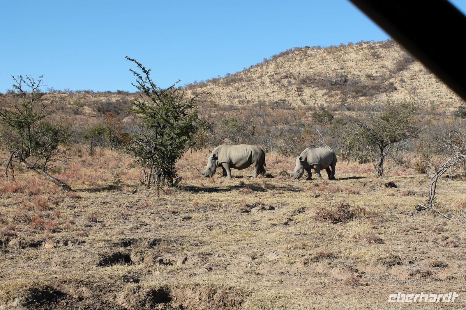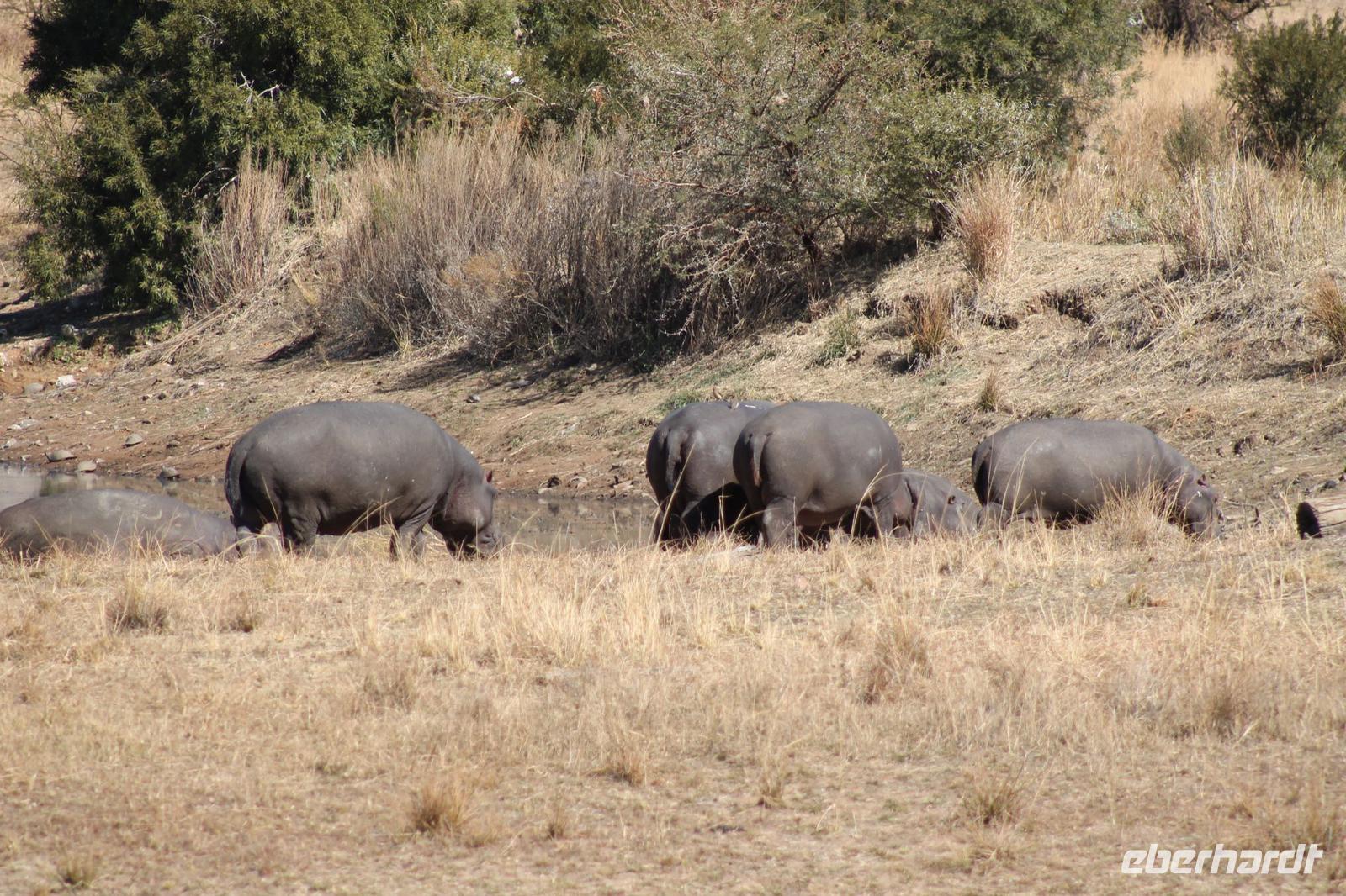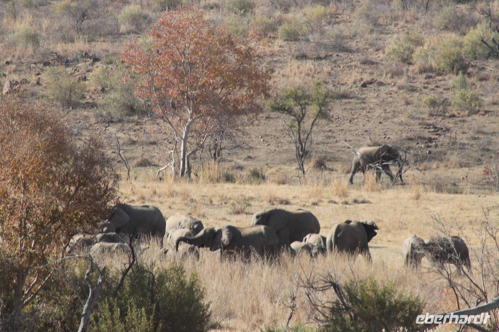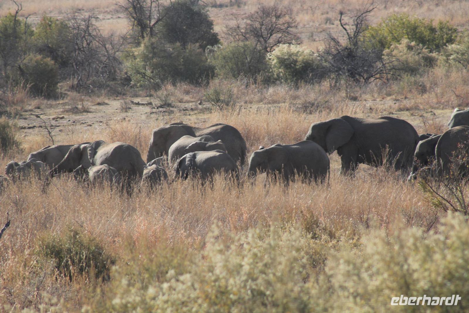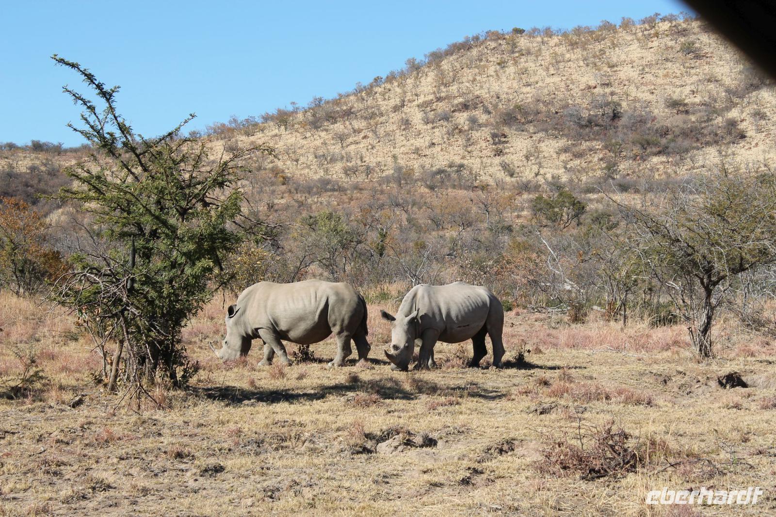 Ca. 2 Stunden spazieren wir durch das Buschfeld und erhalten Erläuterungen zu Fußabdrücken und den Hinterlassenschaften der Tiere Diese sehen wir in Vielzahl nur leider nicht die passenden Tiere dazu. Trotzdem war es eine erfolgreiche Tour und wir sind beeindruckt von der Landschaft und der unendlichen Natur. Wieder in unserem Jeep angekommen fahren wir zurück zu unserer Lodge und sehen kaum zu glauben zwei weitere Nashörner, diesmal aber die Breitmaulnashörner sowie einige Zebras. An der Lodge angekommen genießen wir ein wohl verdientes Frühstück mit frischem Kaffee und allerlei Köstlichkeiten. Wir können uns somit nicht beklagen. Nach einer kurzen Pause erwartet uns unser Bus mit Fahrer Chris und unser Reiseleiter Tom und wir unternehmen am Mittag eine weitere ausführliche Pirsch durch den Nationalpark. Viel haben wir gesehen: Unzählige Zebras, Gnus, Giraffen, Hippos, Warzenschweine, einen Schakal und als Höhepunkt riesige Elephanten. Die Zeit vergeht wie im Flug und so mancher fühlt sich wie in einem guten Film über Afrika. Wir sind alle begeistert und können die vielen Tiere schon kaum mehr zählen. Wir kommen den „Big Five" schon heute sehr nah.
