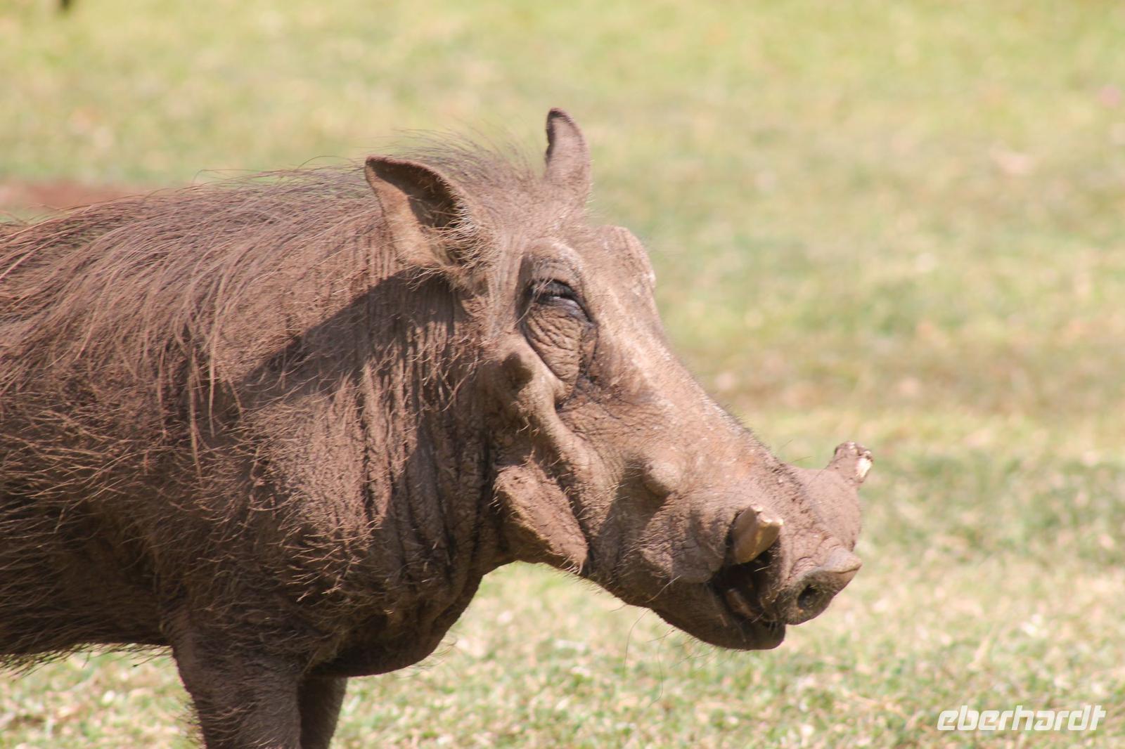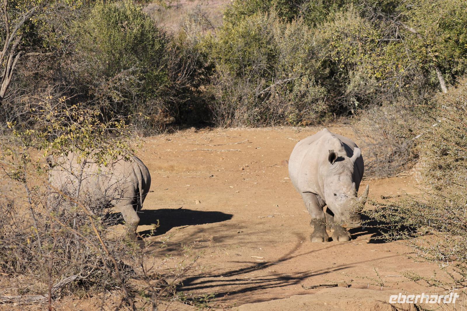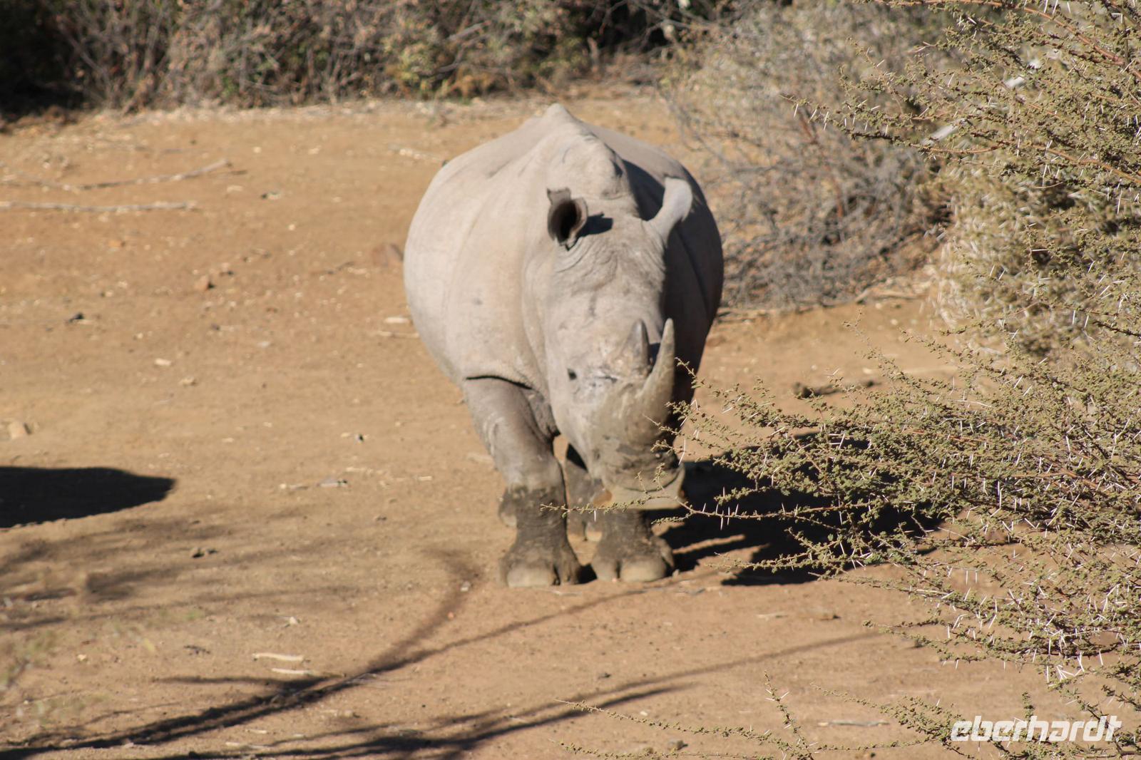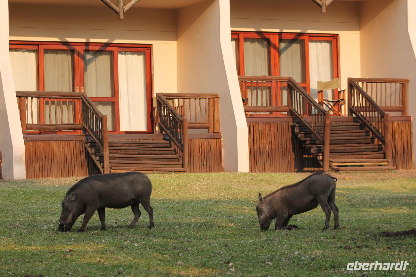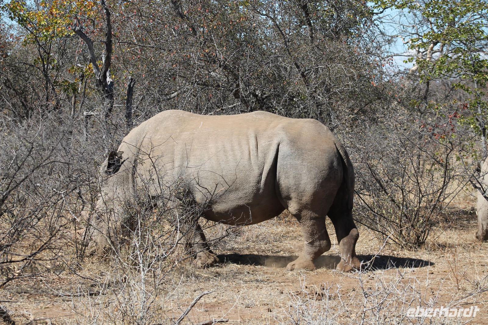 Ca. 2 Stunden spazieren wir durch das Buschfeld und erhalten Erläuterungen zu Fußabdrücken und den Hinterlassenschaften der Tiere Diese sehen wir in Vielzahl nur leider nicht die passenden Tiere dazu. Trotzdem war es eine erfolgreiche Tour und wir sind beeindruckt von der Landschaft und der unendlichen Natur. Wieder in unserem Jeep angekommen fahren wir zurück zu unserer Lodge und sehen kaum zu glauben zwei weitere Nashörner, diesmal aber die Breitmaulnashörner sowie einige Zebras. An der Lodge angekommen genießen wir ein wohl verdientes Frühstück mit frischem Kaffee und allerlei Köstlichkeiten. Wir können uns somit nicht beklagen. Nach einer kurzen Pause erwartet uns unser Bus mit Fahrer Chris und unser Reiseleiter Tom und wir unternehmen am Mittag eine weitere ausführliche Pirsch durch den Nationalpark. Viel haben wir gesehen: Unzählige Zebras, Gnus, Giraffen, Hippos, Warzenschweine, einen Schakal und als Höhepunkt riesige Elephanten. Die Zeit vergeht wie im Flug und so mancher fühlt sich wie in einem guten Film über Afrika. Wir sind alle begeistert und können die vielen Tiere schon kaum mehr zählen. Wir kommen den „Big Five" schon heute sehr nah.