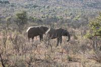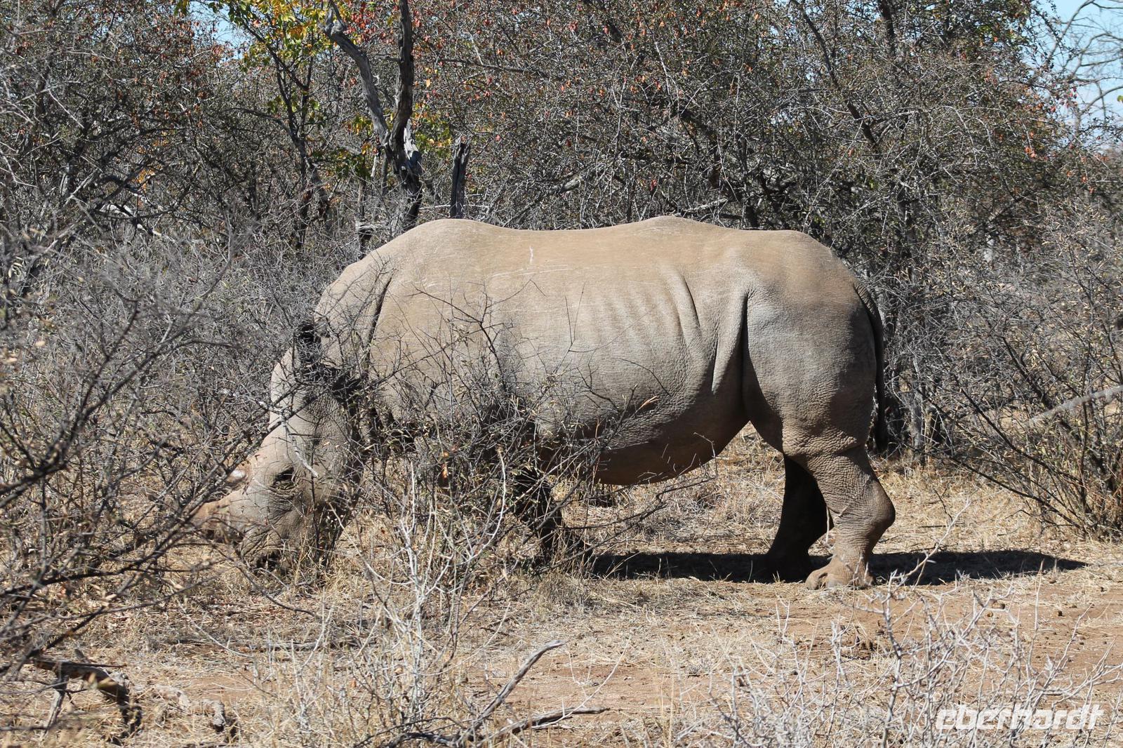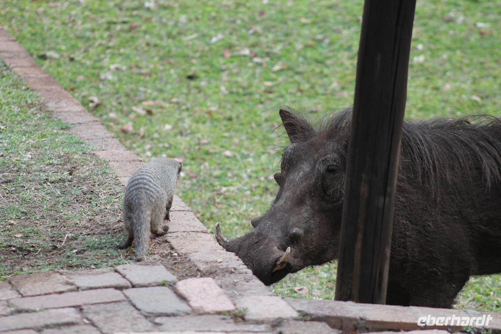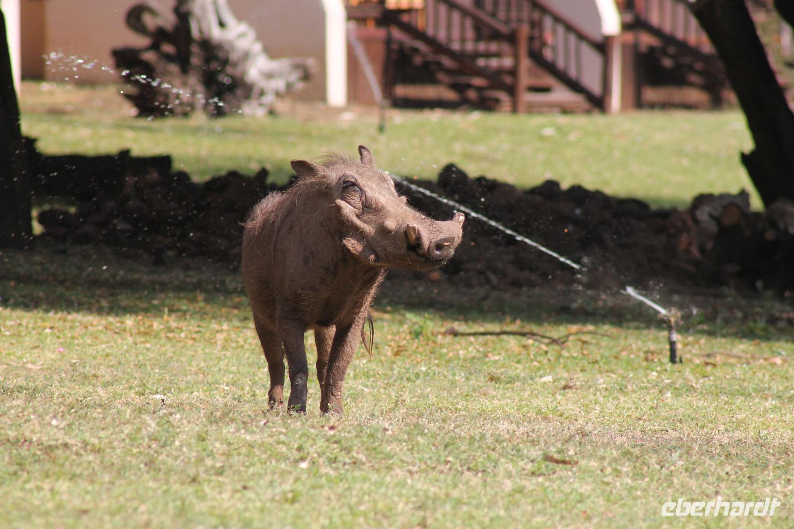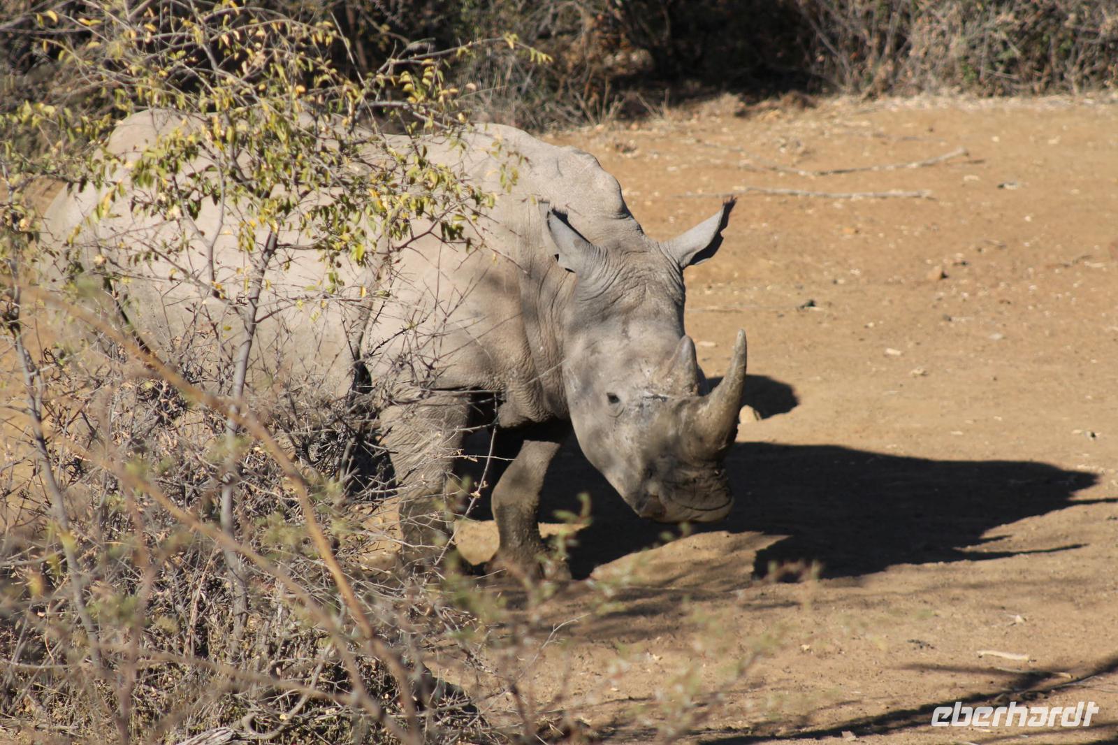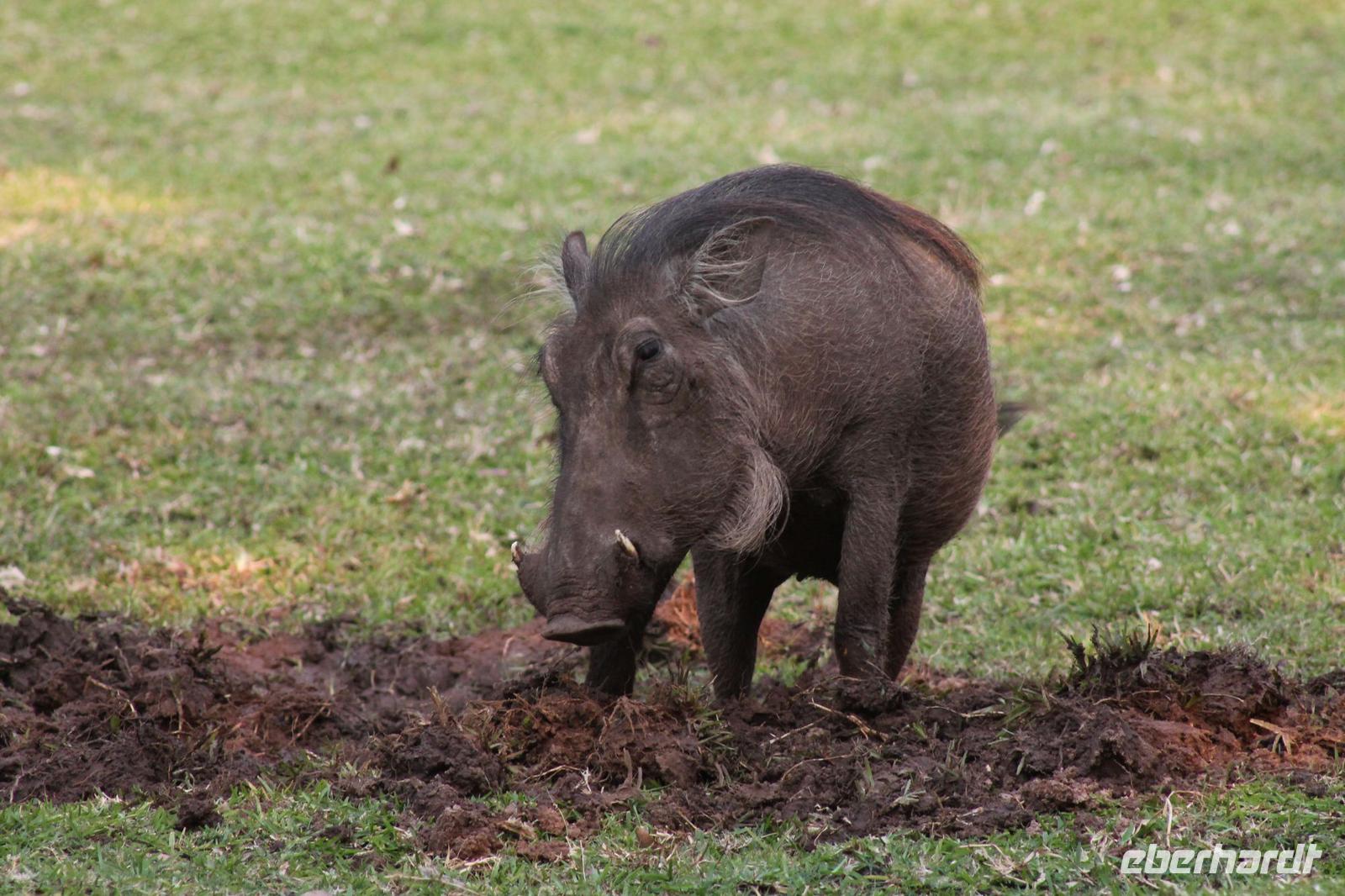 Ca. 2 Stunden spazieren wir durch das Buschfeld und erhalten Erläuterungen zu Fußabdrücken und den Hinterlassenschaften der Tiere Diese sehen wir in Vielzahl nur leider nicht die passenden Tiere dazu. Trotzdem war es eine erfolgreiche Tour und wir sind beeindruckt von der Landschaft und der unendlichen Natur. Wieder in unserem Jeep angekommen fahren wir zurück zu unserer Lodge und sehen kaum zu glauben zwei weitere Nashörner, diesmal aber die Breitmaulnashörner sowie einige Zebras. An der Lodge angekommen genießen wir ein wohl verdientes Frühstück mit frischem Kaffee und allerlei Köstlichkeiten. Wir können uns somit nicht beklagen. Nach einer kurzen Pause erwartet uns unser Bus mit Fahrer Chris und unser Reiseleiter Tom und wir unternehmen am Mittag eine weitere ausführliche Pirsch durch den Nationalpark. Viel haben wir gesehen: Unzählige Zebras, Gnus, Giraffen, Hippos, Warzenschweine, einen Schakal und als Höhepunkt riesige Elephanten. Die Zeit vergeht wie im Flug und so mancher fühlt sich wie in einem guten Film über Afrika. Wir sind alle begeistert und können die vielen Tiere schon kaum mehr zählen. Wir kommen den „Big Five" schon heute sehr nah.