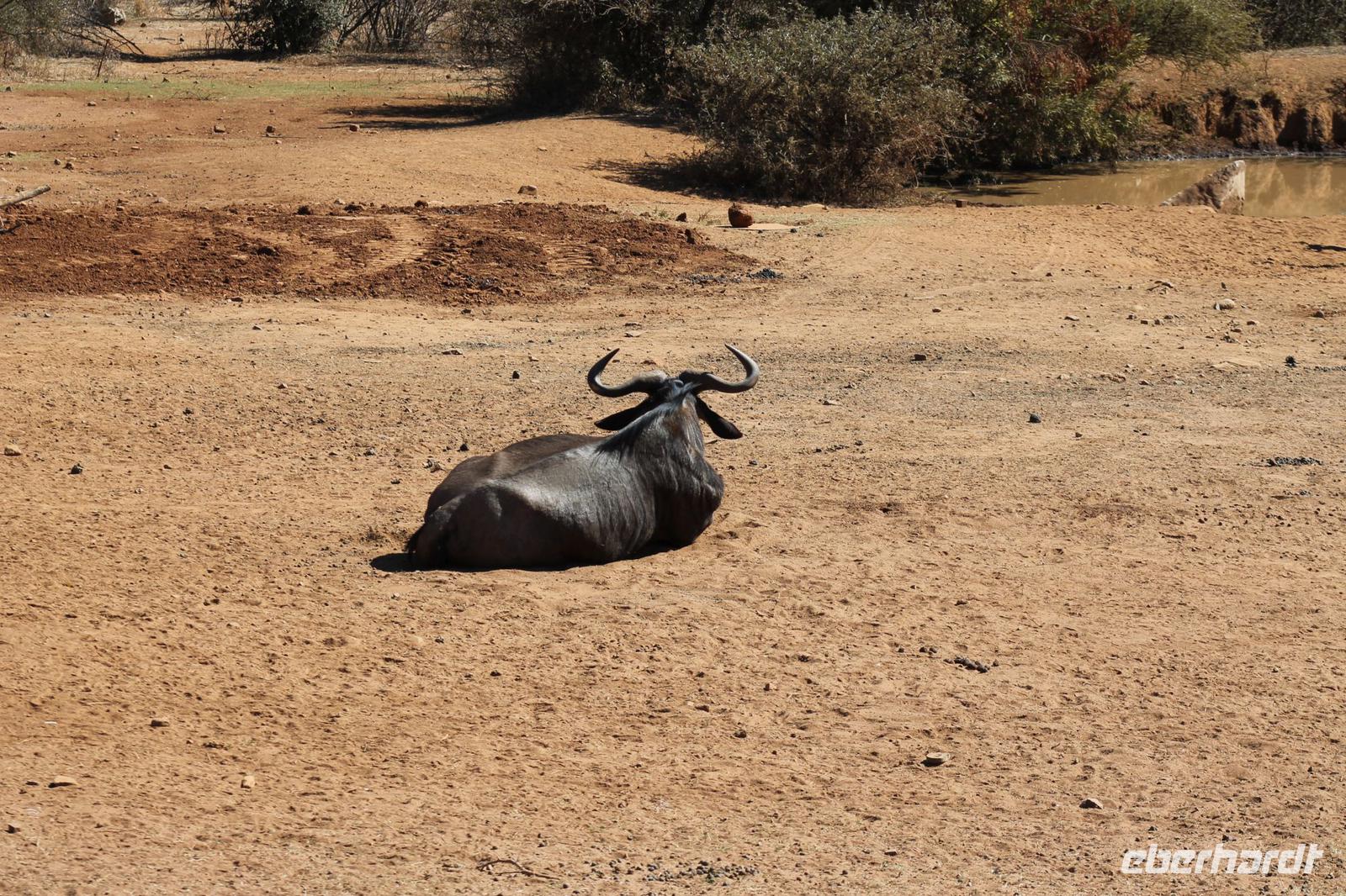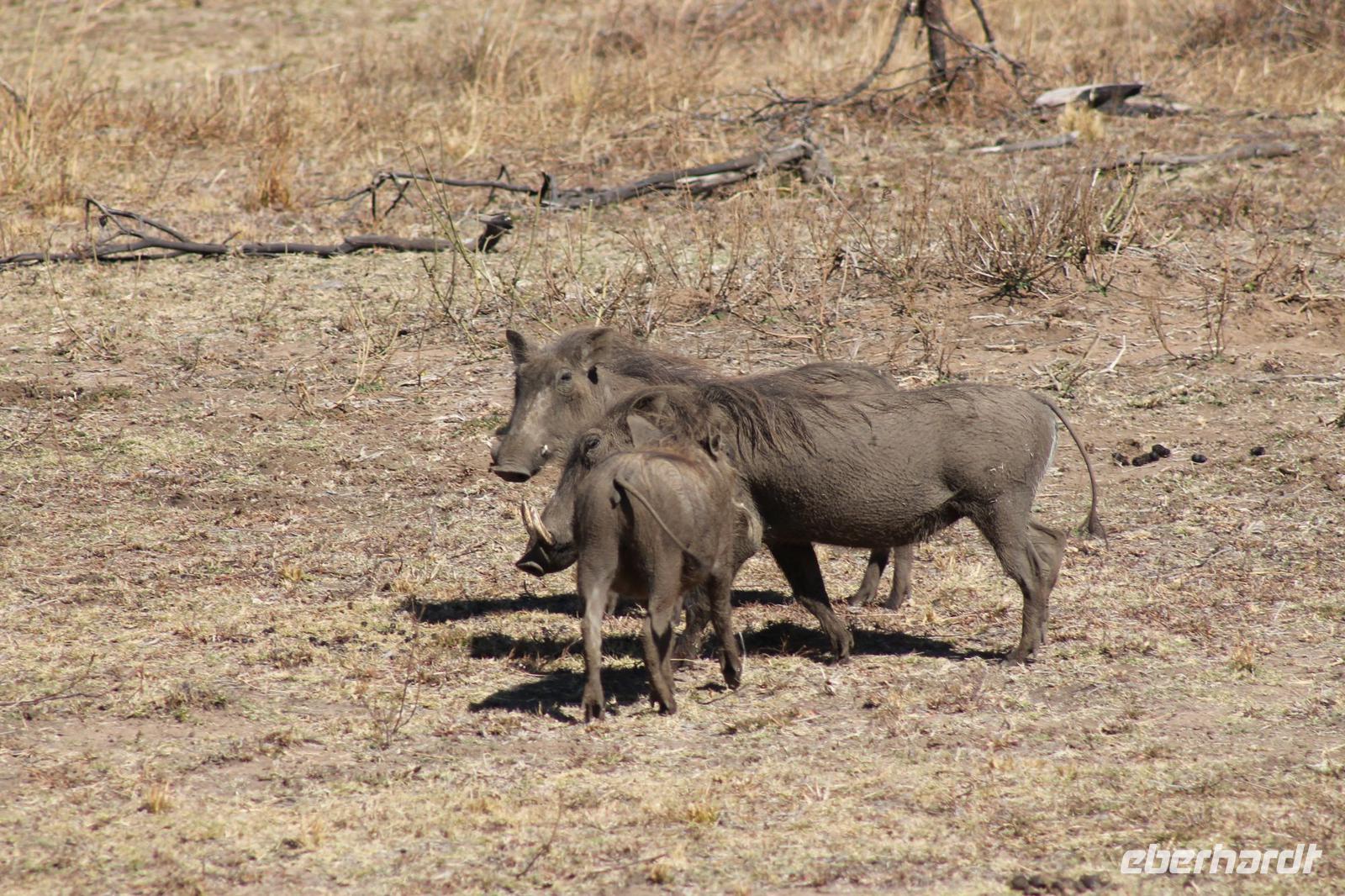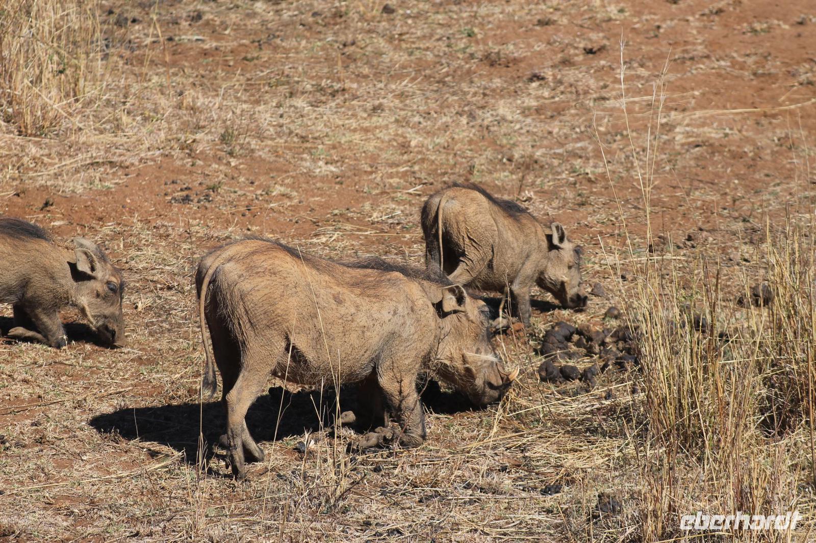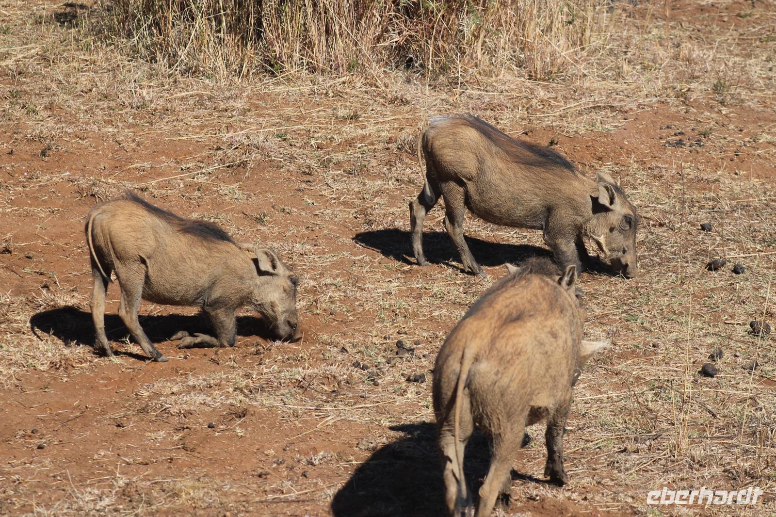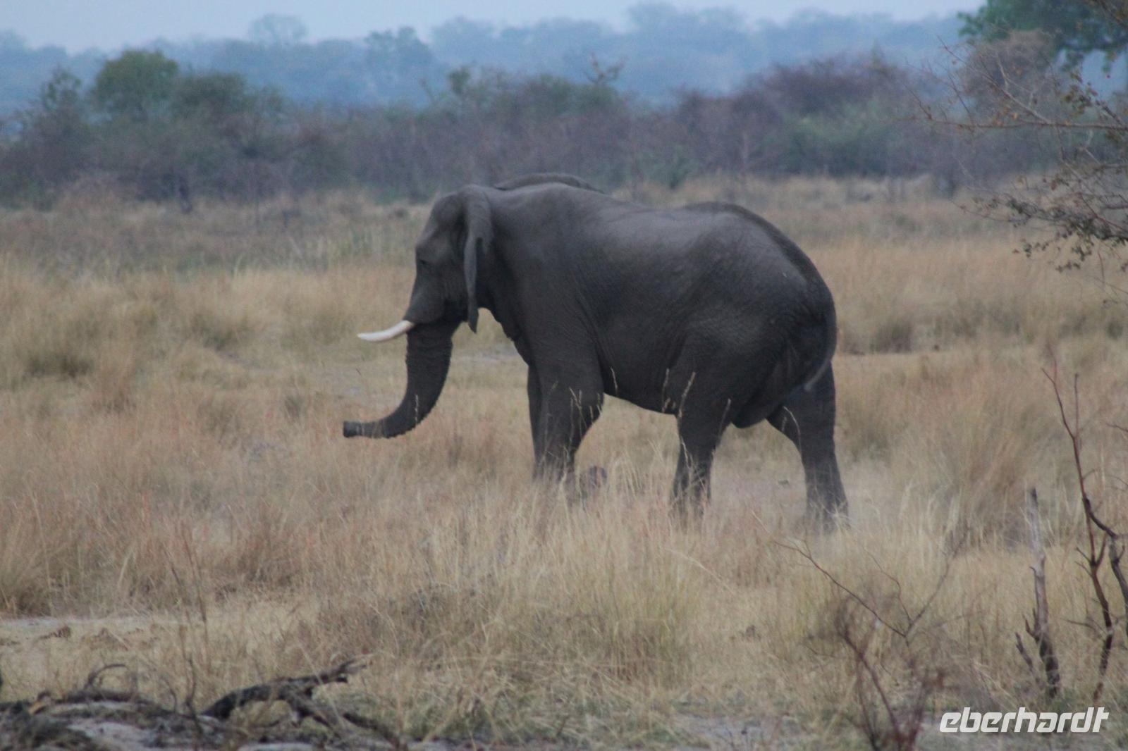 Ca. 2 Stunden spazieren wir durch das Buschfeld und erhalten Erläuterungen zu Fußabdrücken und den Hinterlassenschaften der Tiere Diese sehen wir in Vielzahl nur leider nicht die passenden Tiere dazu. Trotzdem war es eine erfolgreiche Tour und wir sind beeindruckt von der Landschaft und der unendlichen Natur. Wieder in unserem Jeep angekommen fahren wir zurück zu unserer Lodge und sehen kaum zu glauben zwei weitere Nashörner, diesmal aber die Breitmaulnashörner sowie einige Zebras. An der Lodge angekommen genießen wir ein wohl verdientes Frühstück mit frischem Kaffee und allerlei Köstlichkeiten. Wir können uns somit nicht beklagen. Nach einer kurzen Pause erwartet uns unser Bus mit Fahrer Chris und unser Reiseleiter Tom und wir unternehmen am Mittag eine weitere ausführliche Pirsch durch den Nationalpark. Viel haben wir gesehen: Unzählige Zebras, Gnus, Giraffen, Hippos, Warzenschweine, einen Schakal und als Höhepunkt riesige Elephanten. Die Zeit vergeht wie im Flug und so mancher fühlt sich wie in einem guten Film über Afrika. Wir sind alle begeistert und können die vielen Tiere schon kaum mehr zählen. Wir kommen den „Big Five" schon heute sehr nah.