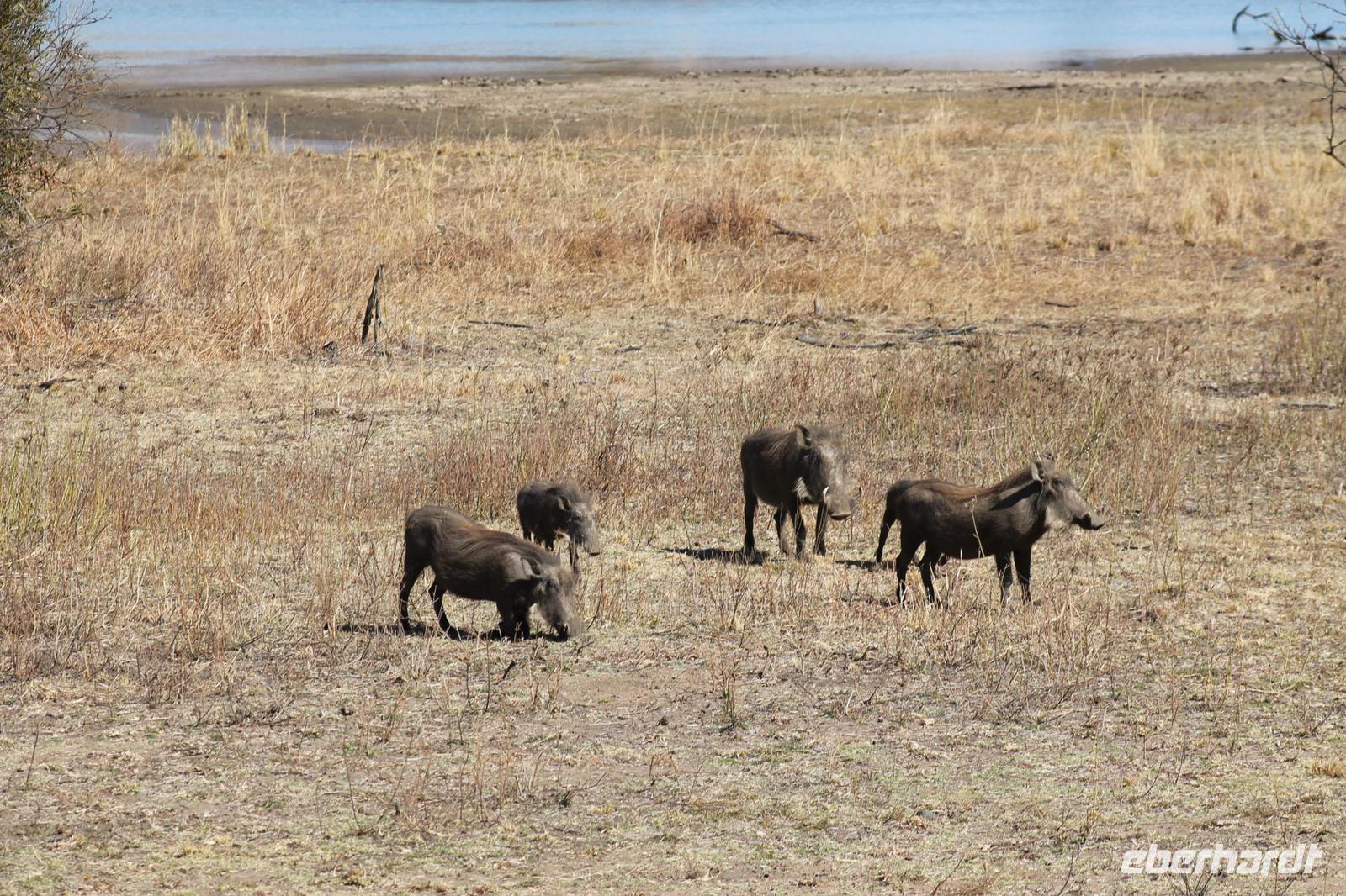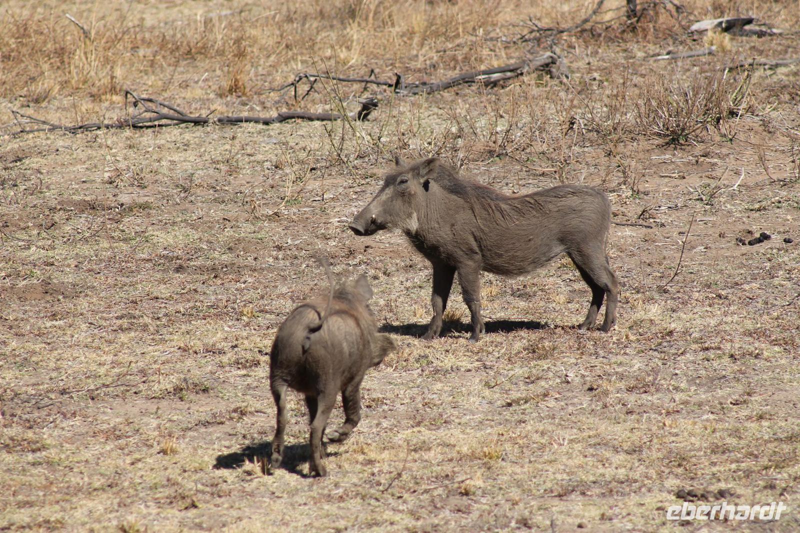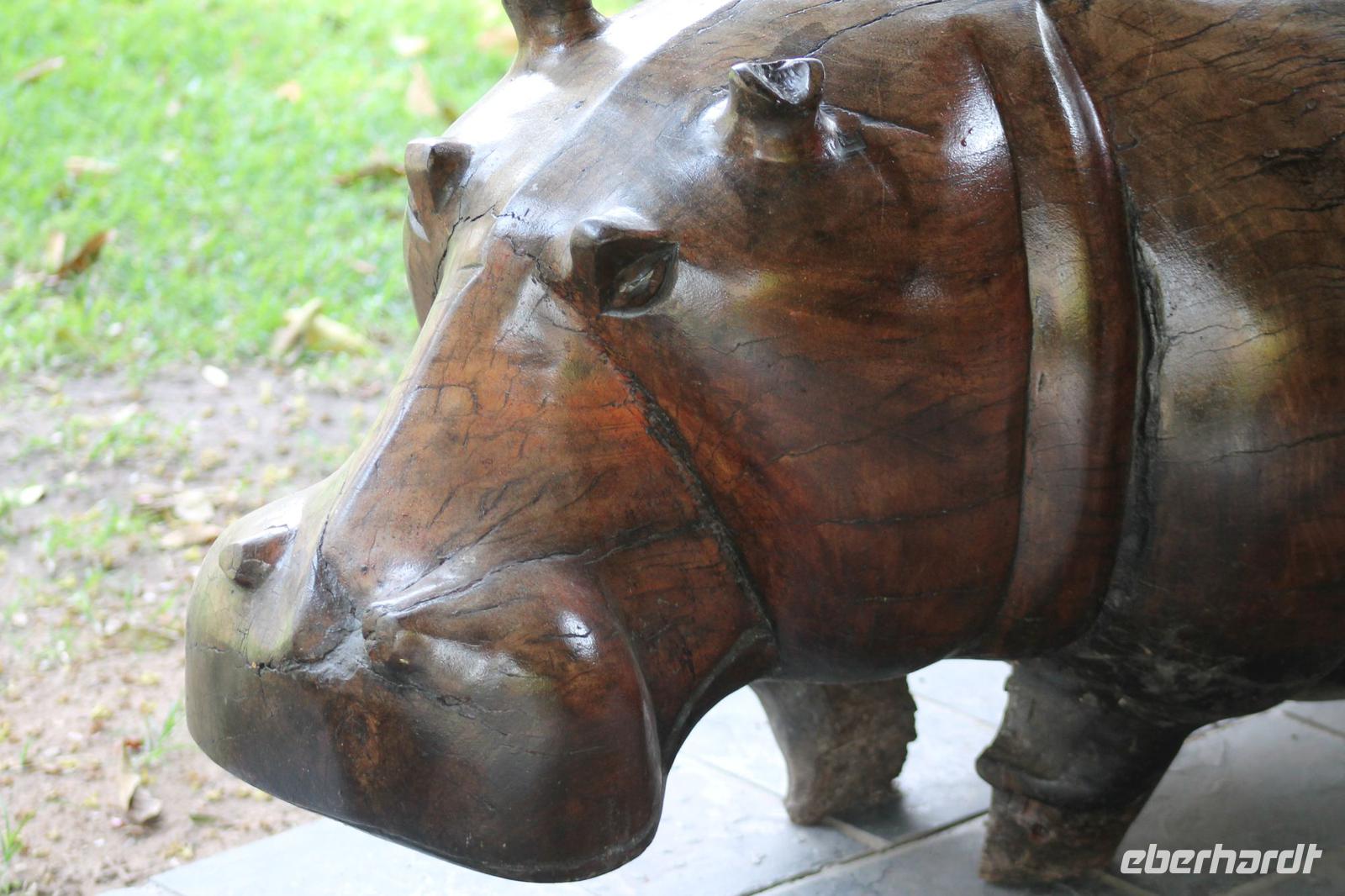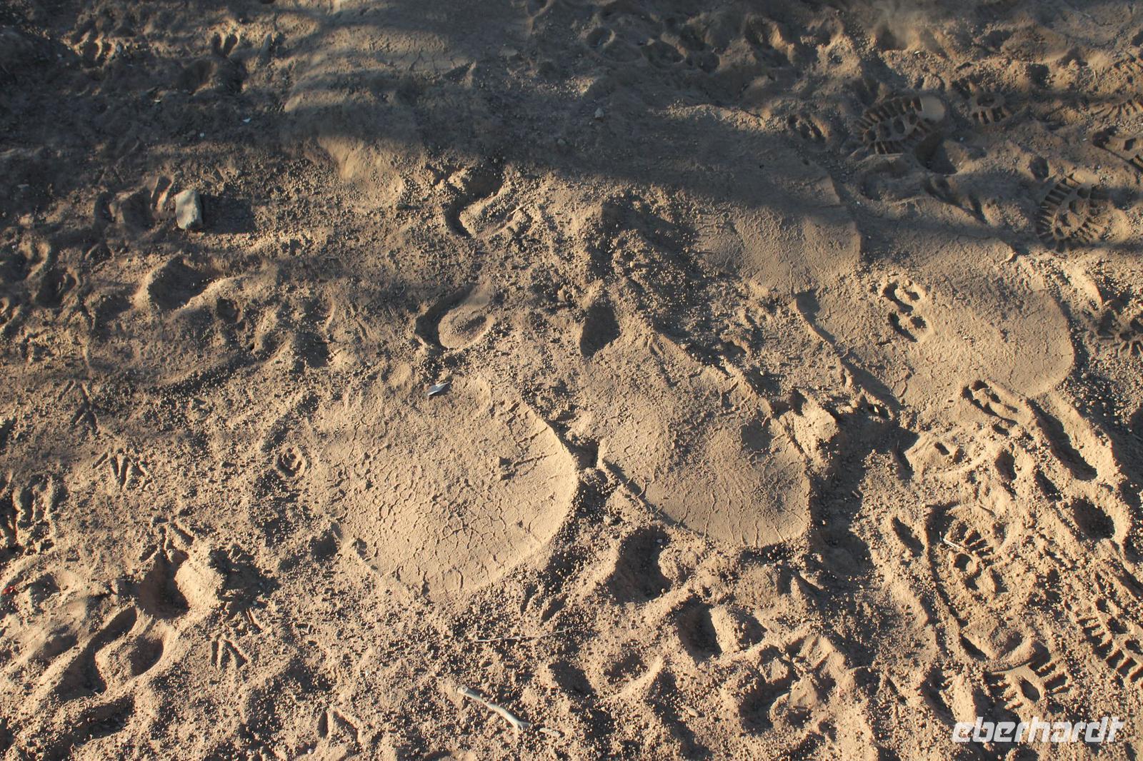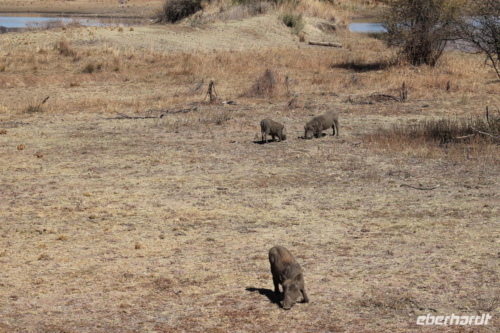 Ca. 2 Stunden spazieren wir durch das Buschfeld und erhalten Erläuterungen zu Fußabdrücken und den Hinterlassenschaften der Tiere Diese sehen wir in Vielzahl nur leider nicht die passenden Tiere dazu. Trotzdem war es eine erfolgreiche Tour und wir sind beeindruckt von der Landschaft und der unendlichen Natur. Wieder in unserem Jeep angekommen fahren wir zurück zu unserer Lodge und sehen kaum zu glauben zwei weitere Nashörner, diesmal aber die Breitmaulnashörner sowie einige Zebras. An der Lodge angekommen genießen wir ein wohl verdientes Frühstück mit frischem Kaffee und allerlei Köstlichkeiten. Wir können uns somit nicht beklagen. Nach einer kurzen Pause erwartet uns unser Bus mit Fahrer Chris und unser Reiseleiter Tom und wir unternehmen am Mittag eine weitere ausführliche Pirsch durch den Nationalpark. Viel haben wir gesehen: Unzählige Zebras, Gnus, Giraffen, Hippos, Warzenschweine, einen Schakal und als Höhepunkt riesige Elephanten. Die Zeit vergeht wie im Flug und so mancher fühlt sich wie in einem guten Film über Afrika. Wir sind alle begeistert und können die vielen Tiere schon kaum mehr zählen. Wir kommen den „Big Five" schon heute sehr nah.