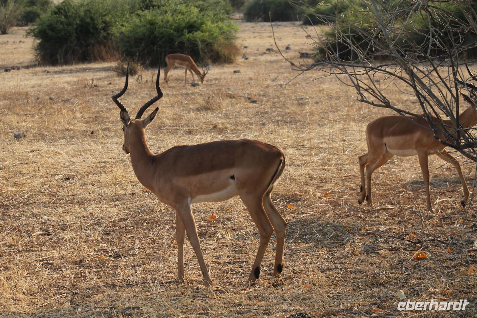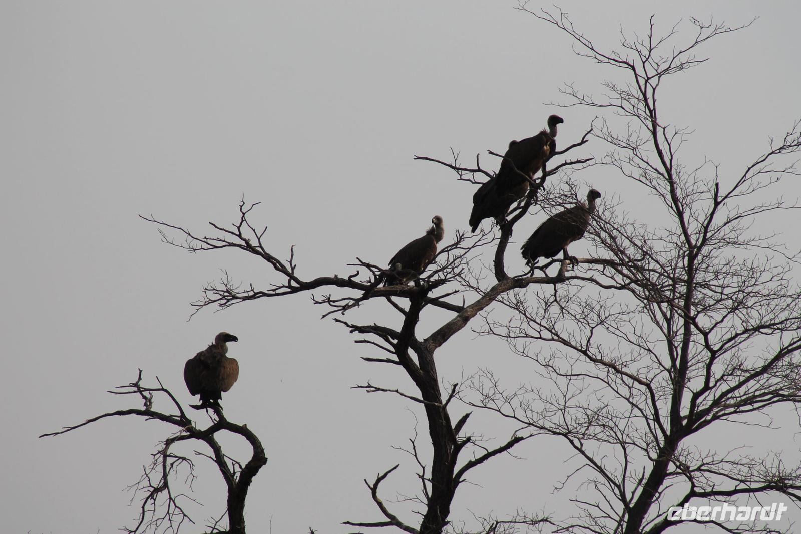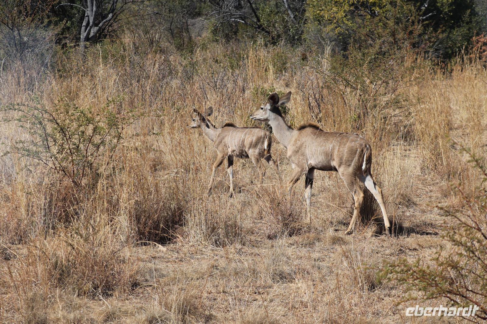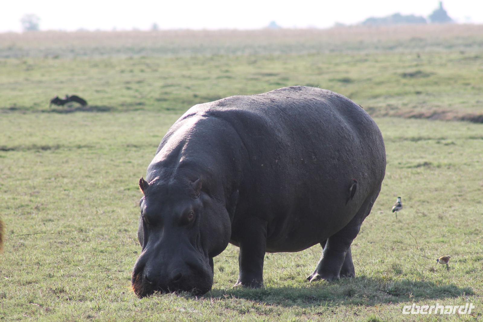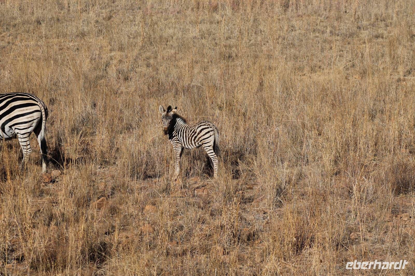 Ca. 2 Stunden spazieren wir durch das Buschfeld und erhalten Erläuterungen zu Fußabdrücken und den Hinterlassenschaften der Tiere Diese sehen wir in Vielzahl nur leider nicht die passenden Tiere dazu. Trotzdem war es eine erfolgreiche Tour und wir sind beeindruckt von der Landschaft und der unendlichen Natur. Wieder in unserem Jeep angekommen fahren wir zurück zu unserer Lodge und sehen kaum zu glauben zwei weitere Nashörner, diesmal aber die Breitmaulnashörner sowie einige Zebras. An der Lodge angekommen genießen wir ein wohl verdientes Frühstück mit frischem Kaffee und allerlei Köstlichkeiten. Wir können uns somit nicht beklagen. Nach einer kurzen Pause erwartet uns unser Bus mit Fahrer Chris und unser Reiseleiter Tom und wir unternehmen am Mittag eine weitere ausführliche Pirsch durch den Nationalpark. Viel haben wir gesehen: Unzählige Zebras, Gnus, Giraffen, Hippos, Warzenschweine, einen Schakal und als Höhepunkt riesige Elephanten. Die Zeit vergeht wie im Flug und so mancher fühlt sich wie in einem guten Film über Afrika. Wir sind alle begeistert und können die vielen Tiere schon kaum mehr zählen. Wir kommen den „Big Five" schon heute sehr nah.
