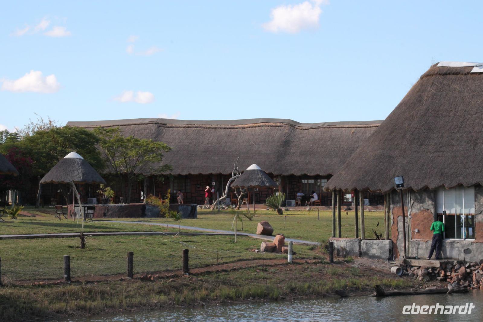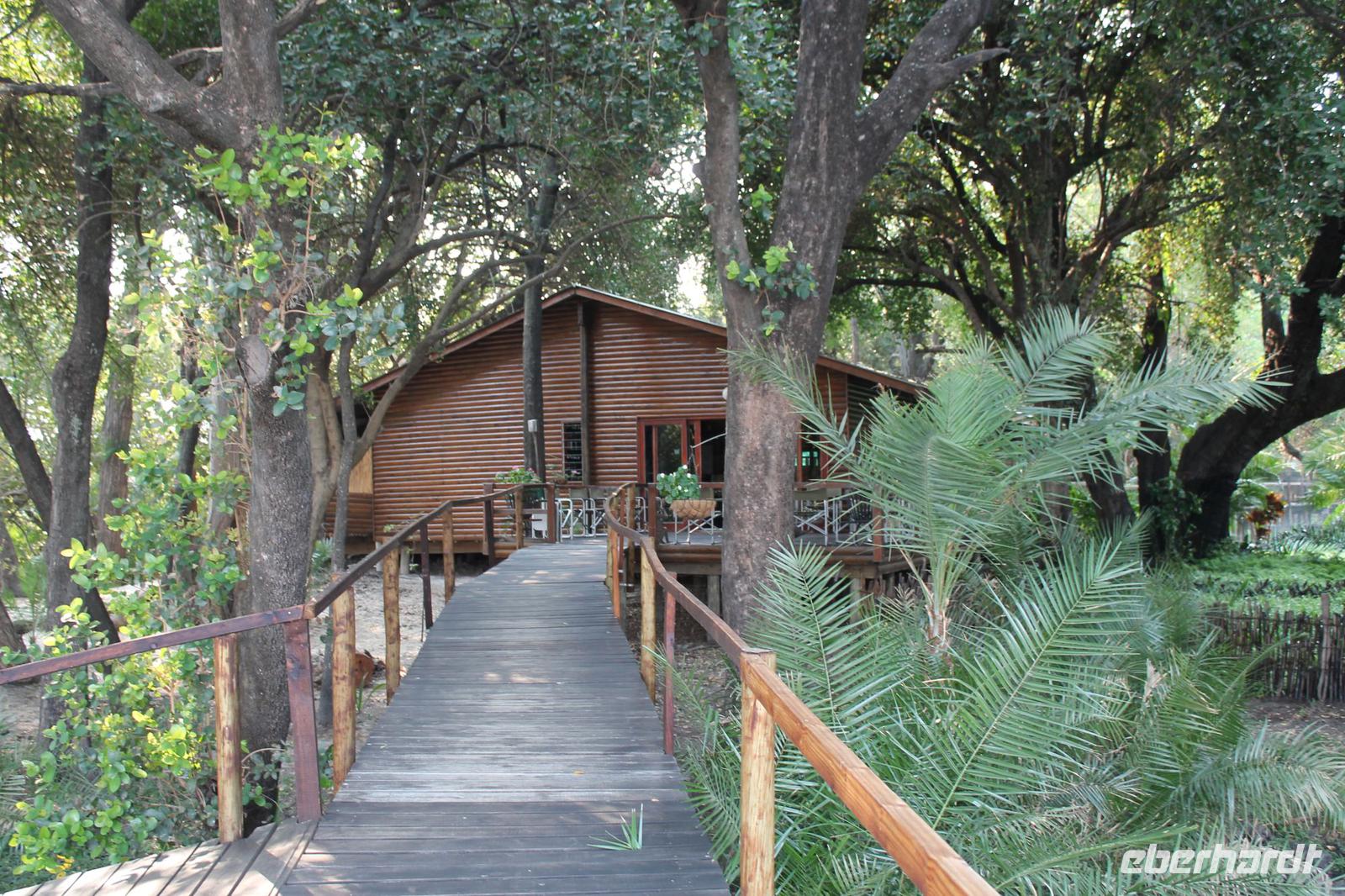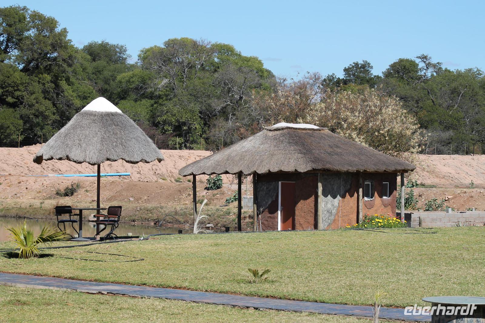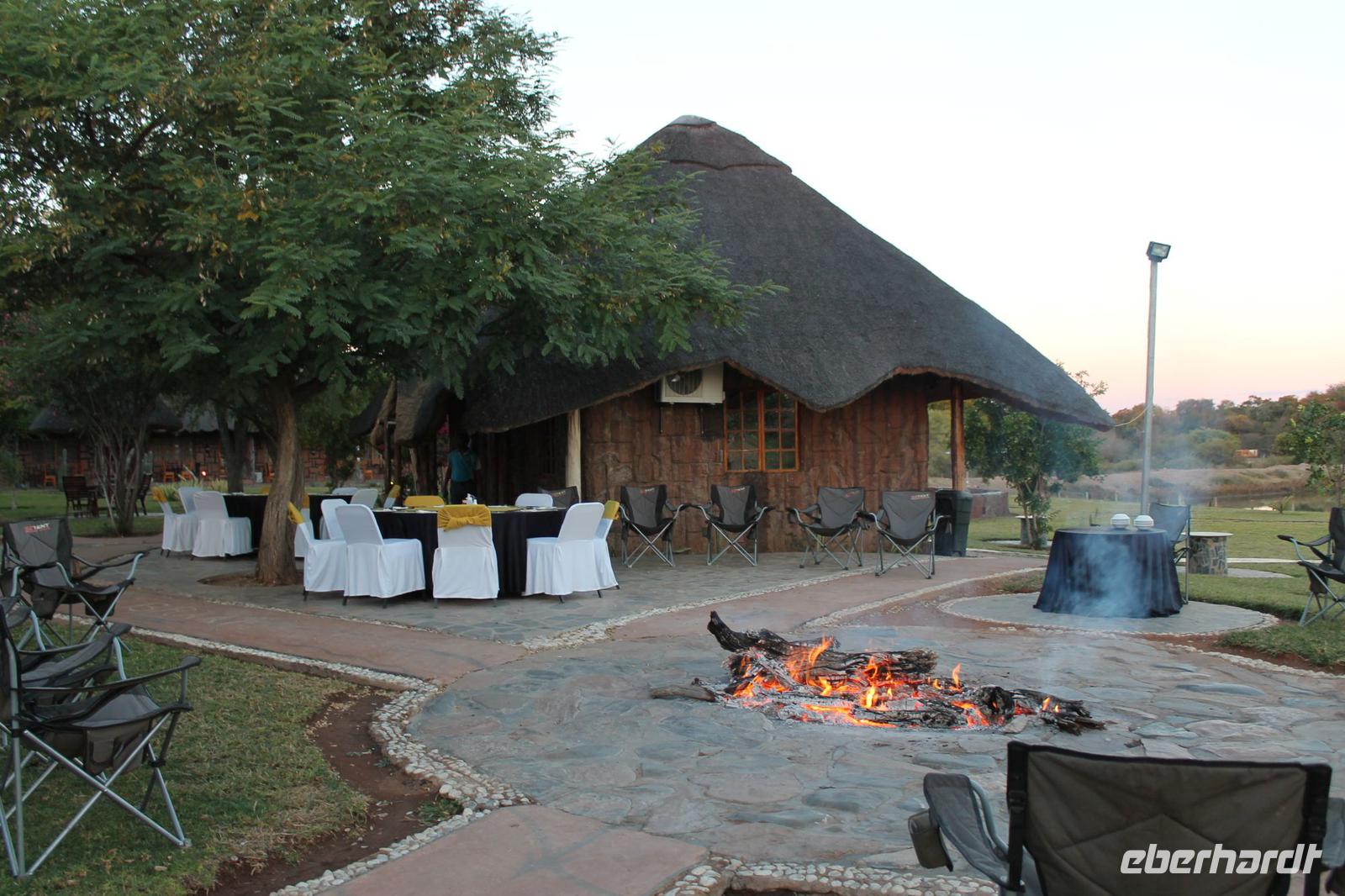 von den Vortagen macht den kulinarischen Genuss perfekt. Alles schnell wieder eingeräumt und dann geht es weiter in Richtung Botswana. An der Grenze angekommen zeigen wir alle unsere Reisepässe vor und erhalten einen Ausreisestempel für Südafrika. Schön war es da. Anschließend spazieren wir gemeinsam mit Tom über die Grenze und über den Limpopo Fluss und erreichen kurze Zeit später das Passbüro. Hier müssen wir unsere Einreisezettel ausfüllen und erhalten einen weiteren Stempel für die Einreise nach Botswana. Chris erwartet uns schon und wir halten noch schnell an einer Wechselstube um einige Euro oder Dollar in Pula zu tauschen und um uns am Bottle Store mit unseren Grundnahrungsmitteln Wein und Bier einzudecken. Von hier aus haben wir noch eine etwa zweistündige Fahrt vor uns die uns über eine Buckelpiste führt, bevor wir an unserer gemütlichen Oasis Zanzibar Lodge im „Tuli Block" ankommen. Unterwegs sehen wir afrikanische Hirsche und nicht ganz lebende Schlangen (Insider Witz). Hier angekommen werden wir herzlich vom Besitzer Jimmy und seiner Crew mit leckerem Orangensaft und einer Rasselbande von Hunden empfangen und beziehen unsere Zimmer. Nach einigen Anfangsschwierigkeiten ziehen wir nochmal um und genießen dann doch die wundervolle Anlage mitten am Limpopo Fluss. Wir erfahren, dass hier aller zwei Nächte eine Hippo Dame einkehrt um zu fressen und so verschließen wir alle gut unsere Türen, besonders Vicky J. Am Abend genießen wir ein geselliges Abendessen in lustiger Runde und freuen uns auf den nächsten Tage, auch wenn einige Reisegäste am rosa Kindertisch Platz