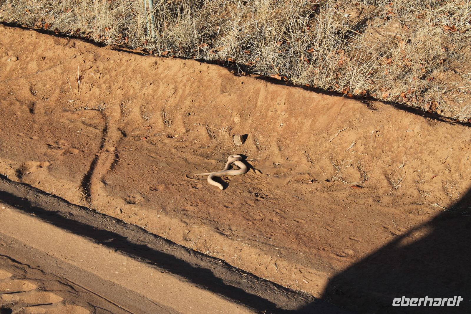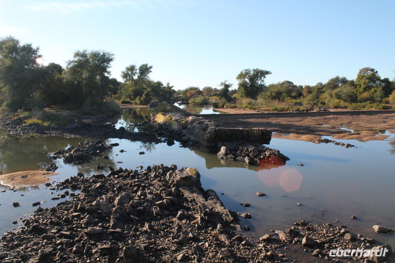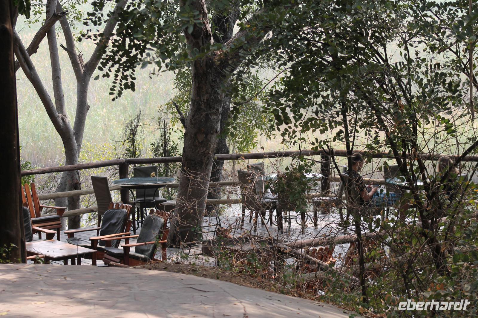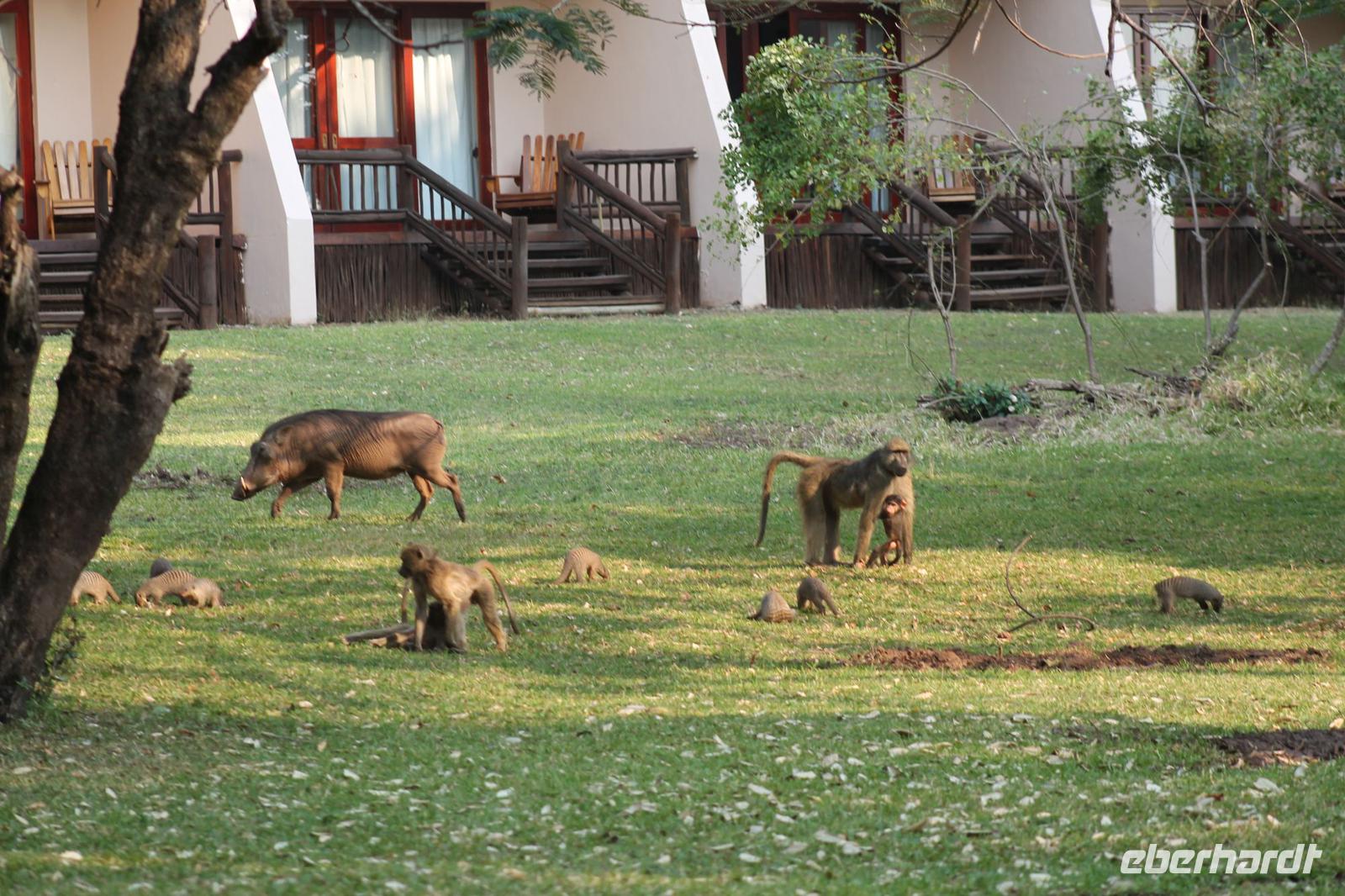 von den Vortagen macht den kulinarischen Genuss perfekt. Alles schnell wieder eingeräumt und dann geht es weiter in Richtung Botswana. An der Grenze angekommen zeigen wir alle unsere Reisepässe vor und erhalten einen Ausreisestempel für Südafrika. Schön war es da. Anschließend spazieren wir gemeinsam mit Tom über die Grenze und über den Limpopo Fluss und erreichen kurze Zeit später das Passbüro. Hier müssen wir unsere Einreisezettel ausfüllen und erhalten einen weiteren Stempel für die Einreise nach Botswana. Chris erwartet uns schon und wir halten noch schnell an einer Wechselstube um einige Euro oder Dollar in Pula zu tauschen und um uns am Bottle Store mit unseren Grundnahrungsmitteln Wein und Bier einzudecken. Von hier aus haben wir noch eine etwa zweistündige Fahrt vor uns die uns über eine Buckelpiste führt, bevor wir an unserer gemütlichen Oasis Zanzibar Lodge im „Tuli Block" ankommen. Unterwegs sehen wir afrikanische Hirsche und nicht ganz lebende Schlangen (Insider Witz). Hier angekommen werden wir herzlich vom Besitzer Jimmy und seiner Crew mit leckerem Orangensaft und einer Rasselbande von Hunden empfangen und beziehen unsere Zimmer. Nach einigen Anfangsschwierigkeiten ziehen wir nochmal um und genießen dann doch die wundervolle Anlage mitten am Limpopo Fluss. Wir erfahren, dass hier aller zwei Nächte eine Hippo Dame einkehrt um zu fressen und so verschließen wir alle gut unsere Türen, besonders Vicky J. Am Abend genießen wir ein geselliges Abendessen in lustiger Runde und freuen uns auf den nächsten Tage, auch wenn einige Reisegäste am rosa Kindertisch Platz