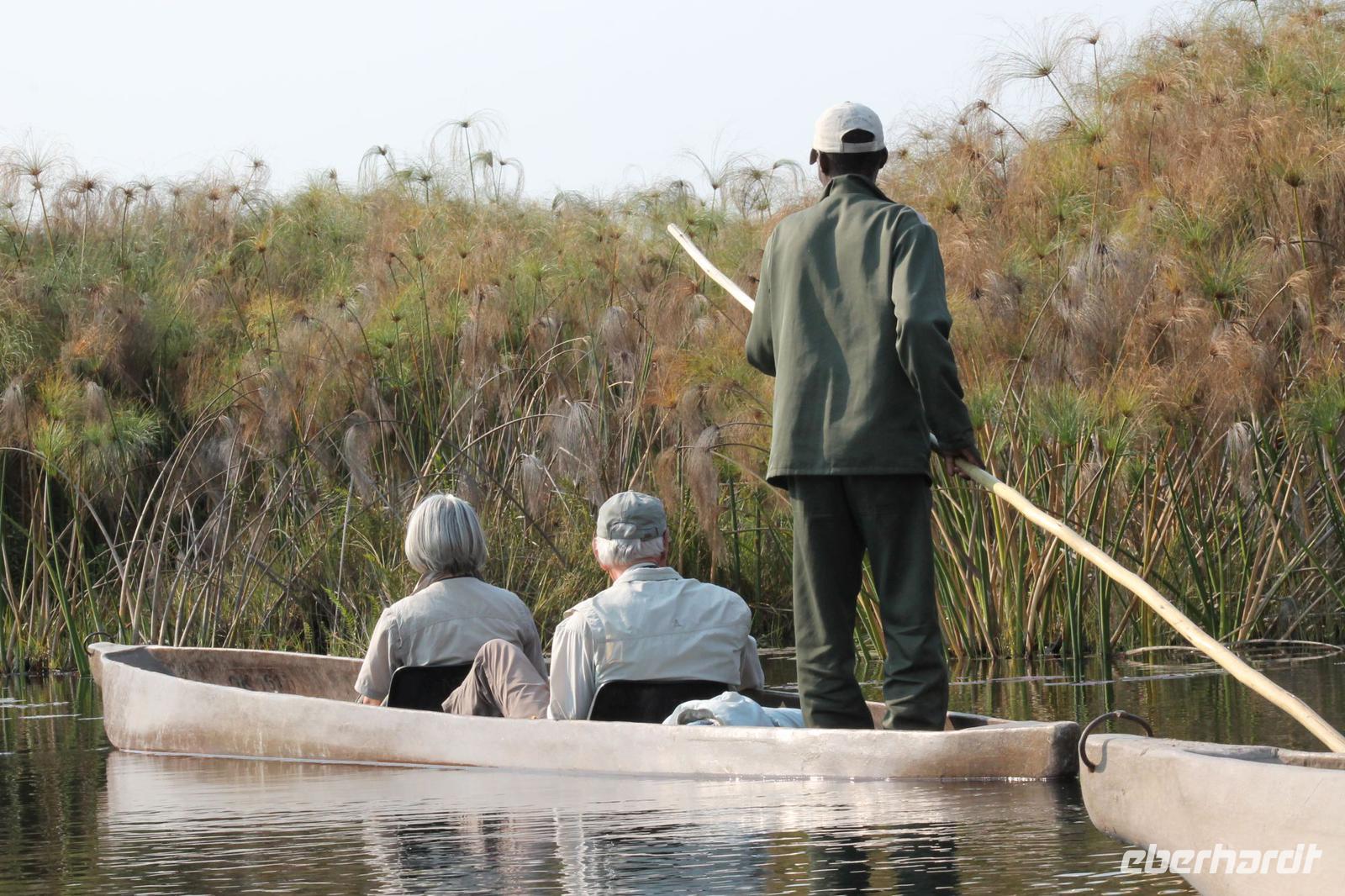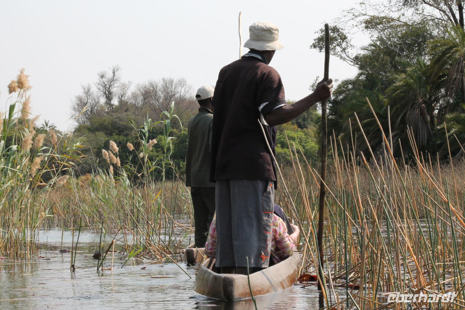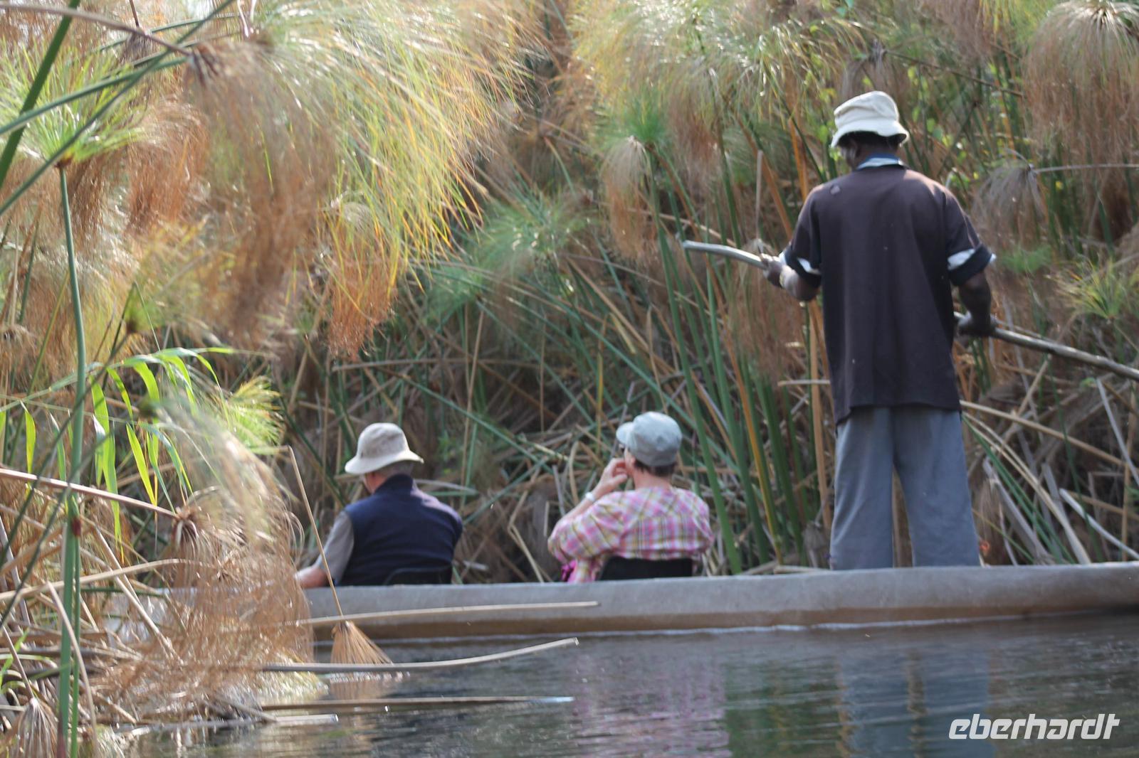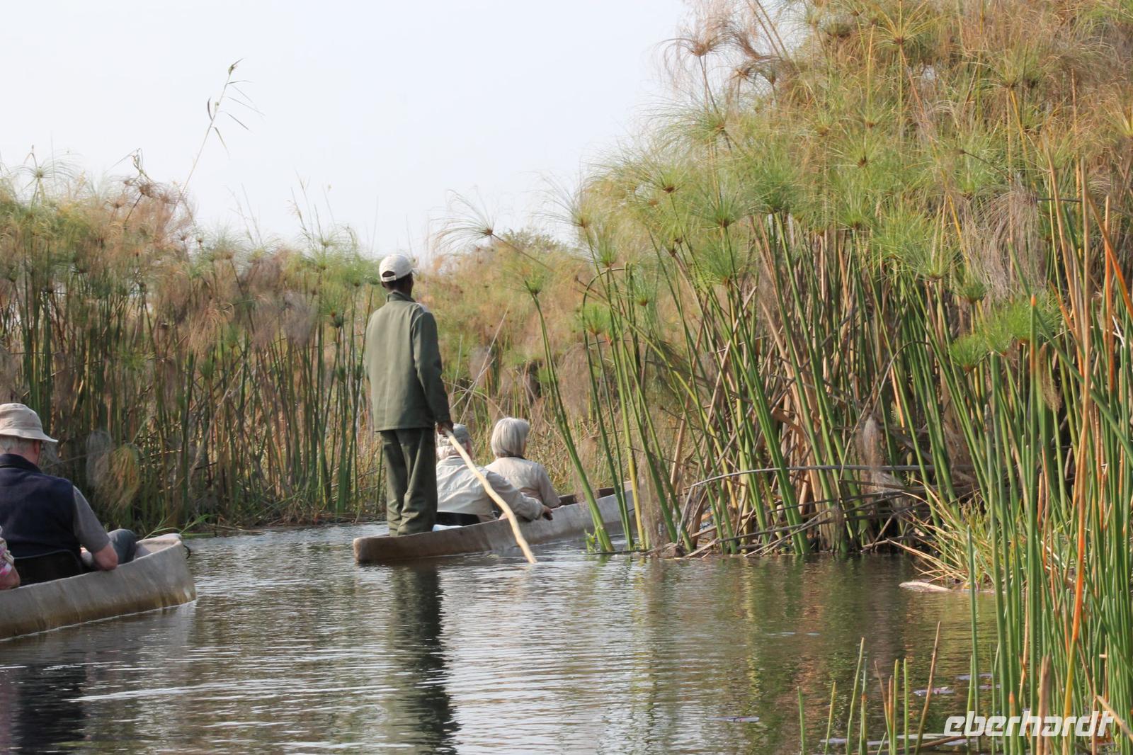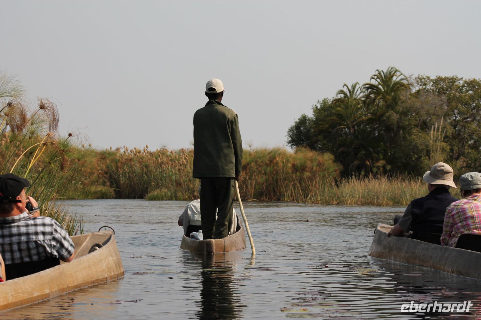 Nach einer kurzen Nacht, zumindest für einige, die aufgrund von manchmal nicht zuordnungsbaren Geräuschen vergeblich die Nachtruhe suchten, genießen wir heute Morgen bei Sonnenschein ein leckeres Frühstück. Anschließend stehen unsere Mokoros mit denen wir heute die Insel erkunden bereits am Bootssteg bereit. Es ist gar nicht so einfach, in diese Einbäume einzusteigen aber es ist auf jeden Fall ein Abenteuer wert. Etwas schunkelnd führen uns unsere Gondeliere jeweils zu zweit sicher durch das Wasser. So sehen wir viele Seerosen und auch einige Vögle wie den Bienenfresser aus nächster Nähe. Der Chef Poler erzählt uns einiges über die Pflanzenwelt und was die Einheimischen damit so alles anstellen. So erfahren wir, dass man aus den Seerosen auch Ketten und Hüte basteln kann und so küren wir die zwei Ältesten unserer Gruppe zur Delta Queen und zum Delta König. Beide können Ihr Glück kaum fassen. Anschließend fahren wir gemütlich weiter durch Papyrus Wälder und Schilflandschaft bis wir zu einer Insel gelangen. Wir unternehmen einen kurzen Spaziergang über die Insel und erfahren wieder viel über Pflanzen, Hinterlassenschaften der Tiere und Spuren. Ein Trinkgeld für diese herzlichen Poler darf natürlich auch nicht fehlen. Anschließend bringen Sie uns sicher zurück zu unserer Lodge und hier lassen wir uns ein Mittagessen schmecken. Den Nachmittag nutzen wir individuell und beobachten Vögel oder spazieren zum Ausschichtspunkt. Pünktlich um 16:00 Uhr werden wir von Nookie im Restaurant mit leckerem Schokoladenkuchen und einer Tasse Kaffee bereits erwartet und müssen feststellen, dass dieser Kuchen einfach wunderbar lecker schmeckt. So ein Drachen ist sie eigentlich auch gar nicht J Anschließend bestellen wir uns einige Getränke für unsere Sunddowner Fahrt am Abend, die wir gleich anschließend mit unserem Motorboot beginnen. So schippern wir gemütlich durch das Delta und sehen viele Vögel wie z.B. den Bienenfresser oder einen Golliathreiher. Außerdem genießen wir die wunderbare idyllische und romantische Landschaft zwischen den Papyruspflanzen. Ganz langsam fahren wir an diesen vorbei und sind erstaunt, als sich auf einem Platz zwischen den Pflanzen vor uns ein riesiges Krokodil in der restlichen Sonne rekelt. Wir können das etwa 3 Meter große Geschöpf aus nächster Nähe beobachten und fahren sogar dicht heran, bis es uns entdeckt und sich seinen Weg in die Tiefe des Wassers sucht. Danach suchen wir uns einen tollen Platz um mitten auf dem Delta einen wunderbaren Sonnenuntergang zu genießen. Wir schaffen es sogar 10 Sekunden kurz still zu sein und inne zu halten. Dem einen fällt das weniger, dem anderen mehr schwer. Wir genießen dabei ein leckeres Bier oder einen Gin Tonic und fahren dann zurück zu unserer Lodge, wo bereits die Dunkelheit wieder Einzug gehalten hat. Nachdem wir uns kurz frisch gemacht haben treffen wir uns wieder zum Abendessen, welches wieder köstlich schmeckt. Wieder lassen wir den Abend wie gewohnt an der Bar ausklingen und lauschen wieder einem tollen Märchen aus „Toms Sammlung" der Nelson Mandela Märchen. Ein gelungener Abschluss für einen wiedermal tollen ereignisreichen Tag. Dieser wird noch von zwei tollen Gesängen des „Harald and the Botswana Sisters" gekürt. (Insider Witz)