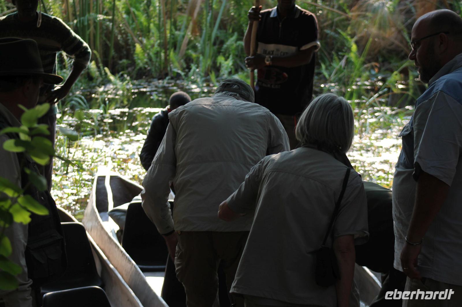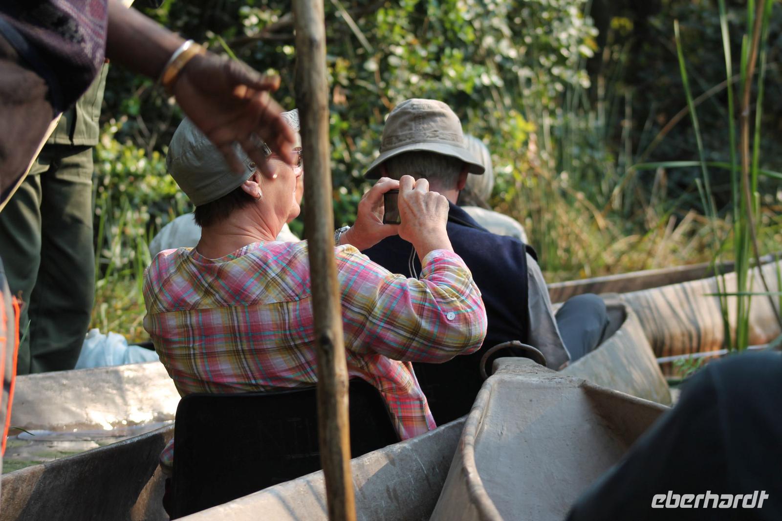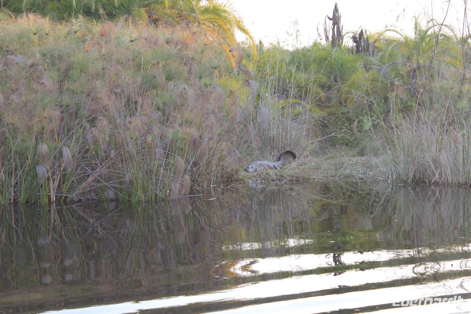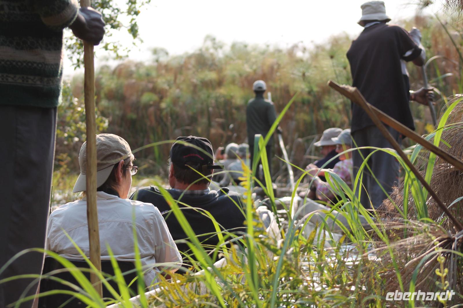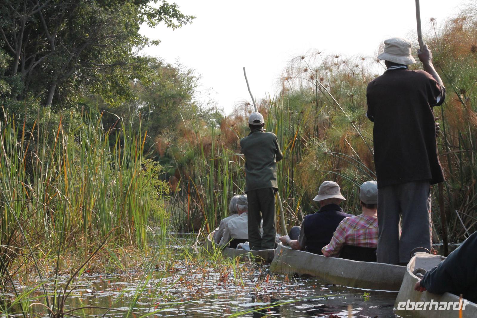 Nach einer kurzen Nacht, zumindest für einige, die aufgrund von manchmal nicht zuordnungsbaren Geräuschen vergeblich die Nachtruhe suchten, genießen wir heute Morgen bei Sonnenschein ein leckeres Frühstück. Anschließend stehen unsere Mokoros mit denen wir heute die Insel erkunden bereits am Bootssteg bereit. Es ist gar nicht so einfach, in diese Einbäume einzusteigen aber es ist auf jeden Fall ein Abenteuer wert. Etwas schunkelnd führen uns unsere Gondeliere jeweils zu zweit sicher durch das Wasser. So sehen wir viele Seerosen und auch einige Vögle wie den Bienenfresser aus nächster Nähe. Der Chef Poler erzählt uns einiges über die Pflanzenwelt und was die Einheimischen damit so alles anstellen. So erfahren wir, dass man aus den Seerosen auch Ketten und Hüte basteln kann und so küren wir die zwei Ältesten unserer Gruppe zur Delta Queen und zum Delta König. Beide können Ihr Glück kaum fassen. Anschließend fahren wir gemütlich weiter durch Papyrus Wälder und Schilflandschaft bis wir zu einer Insel gelangen. Wir unternehmen einen kurzen Spaziergang über die Insel und erfahren wieder viel über Pflanzen, Hinterlassenschaften der Tiere und Spuren. Ein Trinkgeld für diese herzlichen Poler darf natürlich auch nicht fehlen. Anschließend bringen Sie uns sicher zurück zu unserer Lodge und hier lassen wir uns ein Mittagessen schmecken. Den Nachmittag nutzen wir individuell und beobachten Vögel oder spazieren zum Ausschichtspunkt. Pünktlich um 16:00 Uhr werden wir von Nookie im Restaurant mit leckerem Schokoladenkuchen und einer Tasse Kaffee bereits erwartet und müssen feststellen, dass dieser Kuchen einfach wunderbar lecker schmeckt. So ein Drachen ist sie eigentlich auch gar nicht J Anschließend bestellen wir uns einige Getränke für unsere Sunddowner Fahrt am Abend, die wir gleich anschließend mit unserem Motorboot beginnen. So schippern wir gemütlich durch das Delta und sehen viele Vögel wie z.B. den Bienenfresser oder einen Golliathreiher. Außerdem genießen wir die wunderbare idyllische und romantische Landschaft zwischen den Papyruspflanzen. Ganz langsam fahren wir an diesen vorbei und sind erstaunt, als sich auf einem Platz zwischen den Pflanzen vor uns ein riesiges Krokodil in der restlichen Sonne rekelt. Wir können das etwa 3 Meter große Geschöpf aus nächster Nähe beobachten und fahren sogar dicht heran, bis es uns entdeckt und sich seinen Weg in die Tiefe des Wassers sucht. Danach suchen wir uns einen tollen Platz um mitten auf dem Delta einen wunderbaren Sonnenuntergang zu genießen. Wir schaffen es sogar 10 Sekunden kurz still zu sein und inne zu halten. Dem einen fällt das weniger, dem anderen mehr schwer. Wir genießen dabei ein leckeres Bier oder einen Gin Tonic und fahren dann zurück zu unserer Lodge, wo bereits die Dunkelheit wieder Einzug gehalten hat. Nachdem wir uns kurz frisch gemacht haben treffen wir uns wieder zum Abendessen, welches wieder köstlich schmeckt. Wieder lassen wir den Abend wie gewohnt an der Bar ausklingen und lauschen wieder einem tollen Märchen aus „Toms Sammlung" der Nelson Mandela Märchen. Ein gelungener Abschluss für einen wiedermal tollen ereignisreichen Tag. Dieser wird noch von zwei tollen Gesängen des „Harald and the Botswana Sisters" gekürt. (Insider Witz)