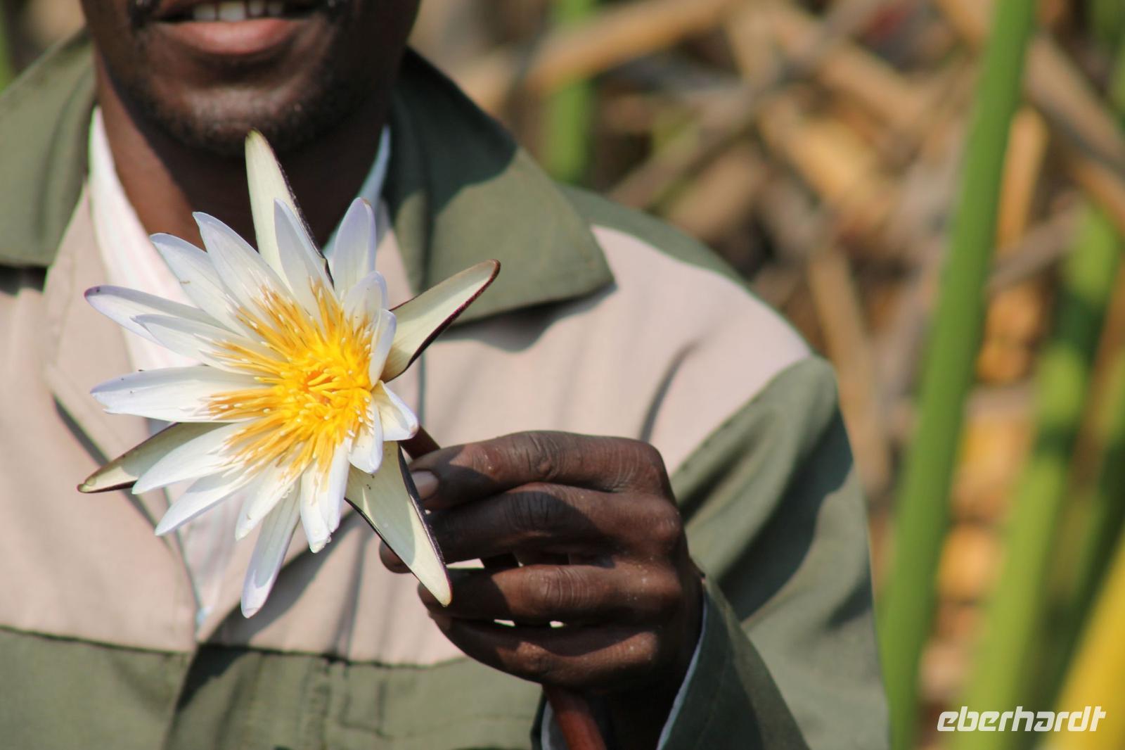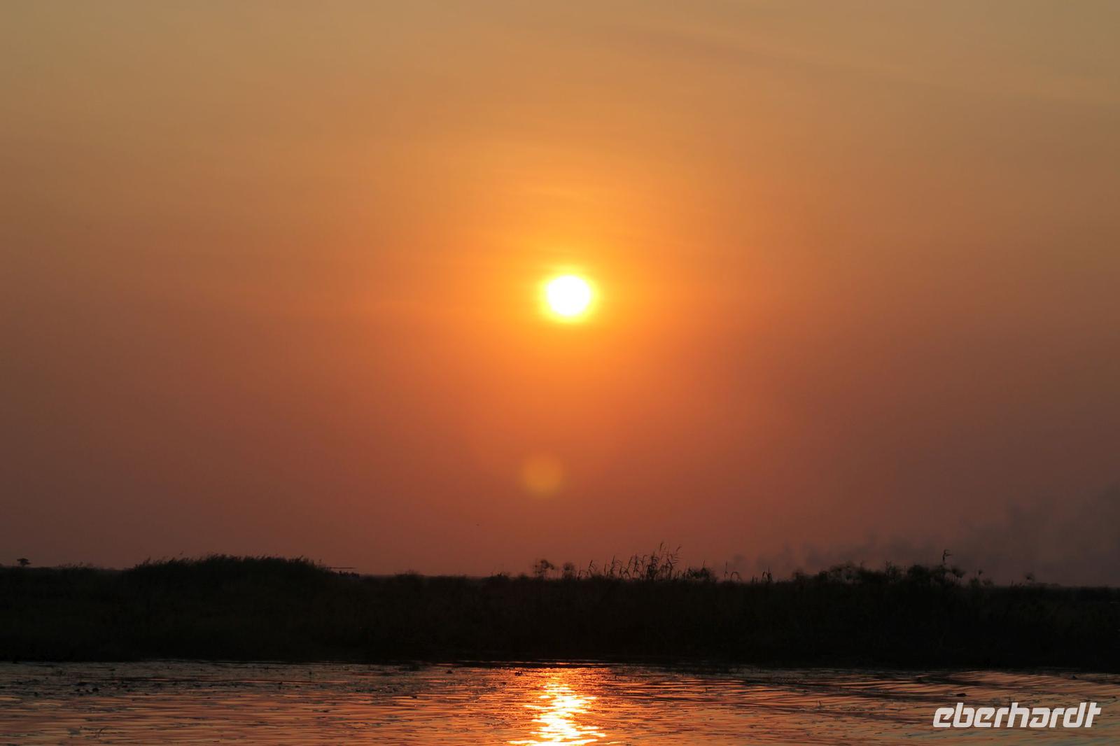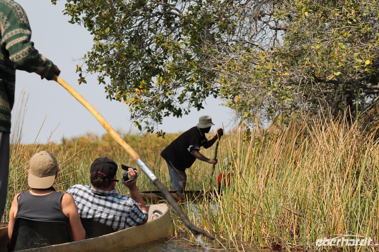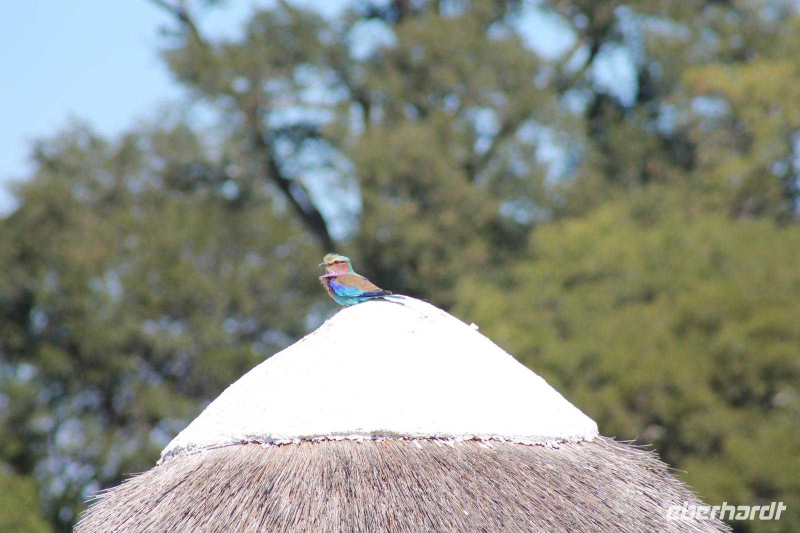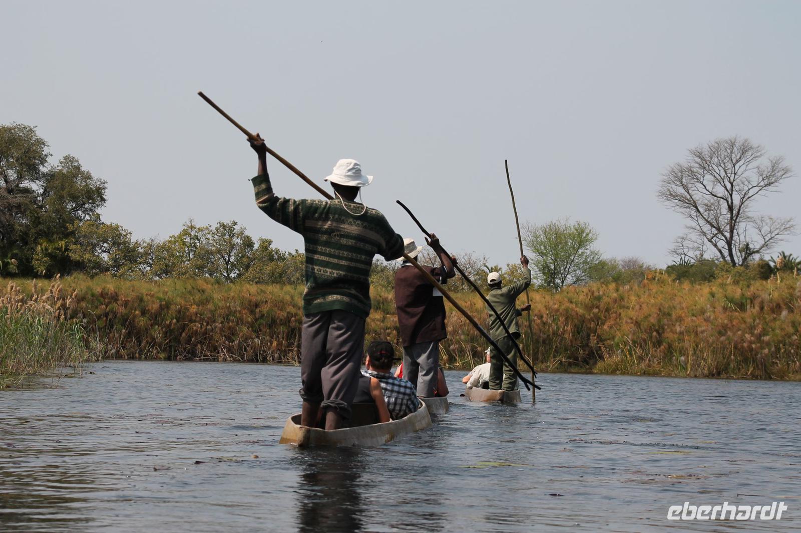 Nach einer kurzen Nacht, zumindest für einige, die aufgrund von manchmal nicht zuordnungsbaren Geräuschen vergeblich die Nachtruhe suchten, genießen wir heute Morgen bei Sonnenschein ein leckeres Frühstück. Anschließend stehen unsere Mokoros mit denen wir heute die Insel erkunden bereits am Bootssteg bereit. Es ist gar nicht so einfach, in diese Einbäume einzusteigen aber es ist auf jeden Fall ein Abenteuer wert. Etwas schunkelnd führen uns unsere Gondeliere jeweils zu zweit sicher durch das Wasser. So sehen wir viele Seerosen und auch einige Vögle wie den Bienenfresser aus nächster Nähe. Der Chef Poler erzählt uns einiges über die Pflanzenwelt und was die Einheimischen damit so alles anstellen. So erfahren wir, dass man aus den Seerosen auch Ketten und Hüte basteln kann und so küren wir die zwei Ältesten unserer Gruppe zur Delta Queen und zum Delta König. Beide können Ihr Glück kaum fassen. Anschließend fahren wir gemütlich weiter durch Papyrus Wälder und Schilflandschaft bis wir zu einer Insel gelangen. Wir unternehmen einen kurzen Spaziergang über die Insel und erfahren wieder viel über Pflanzen, Hinterlassenschaften der Tiere und Spuren. Ein Trinkgeld für diese herzlichen Poler darf natürlich auch nicht fehlen. Anschließend bringen Sie uns sicher zurück zu unserer Lodge und hier lassen wir uns ein Mittagessen schmecken. Den Nachmittag nutzen wir individuell und beobachten Vögel oder spazieren zum Ausschichtspunkt. Pünktlich um 16:00 Uhr werden wir von Nookie im Restaurant mit leckerem Schokoladenkuchen und einer Tasse Kaffee bereits erwartet und müssen feststellen, dass dieser Kuchen einfach wunderbar lecker schmeckt. So ein Drachen ist sie eigentlich auch gar nicht J Anschließend bestellen wir uns einige Getränke für unsere Sunddowner Fahrt am Abend, die wir gleich anschließend mit unserem Motorboot beginnen. So schippern wir gemütlich durch das Delta und sehen viele Vögel wie z.B. den Bienenfresser oder einen Golliathreiher. Außerdem genießen wir die wunderbare idyllische und romantische Landschaft zwischen den Papyruspflanzen. Ganz langsam fahren wir an diesen vorbei und sind erstaunt, als sich auf einem Platz zwischen den Pflanzen vor uns ein riesiges Krokodil in der restlichen Sonne rekelt. Wir können das etwa 3 Meter große Geschöpf aus nächster Nähe beobachten und fahren sogar dicht heran, bis es uns entdeckt und sich seinen Weg in die Tiefe des Wassers sucht. Danach suchen wir uns einen tollen Platz um mitten auf dem Delta einen wunderbaren Sonnenuntergang zu genießen. Wir schaffen es sogar 10 Sekunden kurz still zu sein und inne zu halten. Dem einen fällt das weniger, dem anderen mehr schwer. Wir genießen dabei ein leckeres Bier oder einen Gin Tonic und fahren dann zurück zu unserer Lodge, wo bereits die Dunkelheit wieder Einzug gehalten hat. Nachdem wir uns kurz frisch gemacht haben treffen wir uns wieder zum Abendessen, welches wieder köstlich schmeckt. Wieder lassen wir den Abend wie gewohnt an der Bar ausklingen und lauschen wieder einem tollen Märchen aus „Toms Sammlung" der Nelson Mandela Märchen. Ein gelungener Abschluss für einen wiedermal tollen ereignisreichen Tag. Dieser wird noch von zwei tollen Gesängen des „Harald and the Botswana Sisters" gekürt. (Insider Witz)