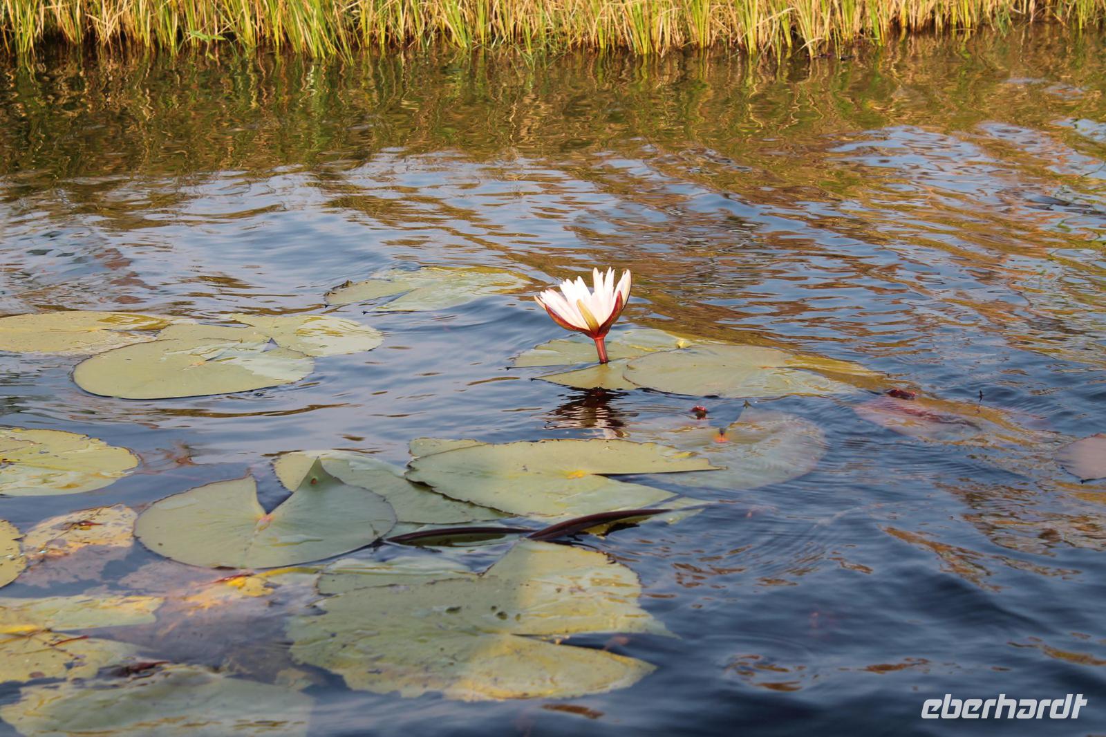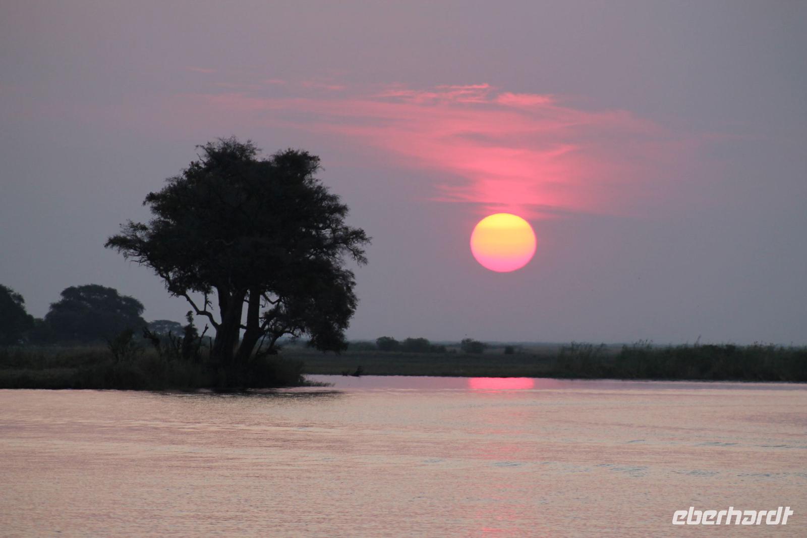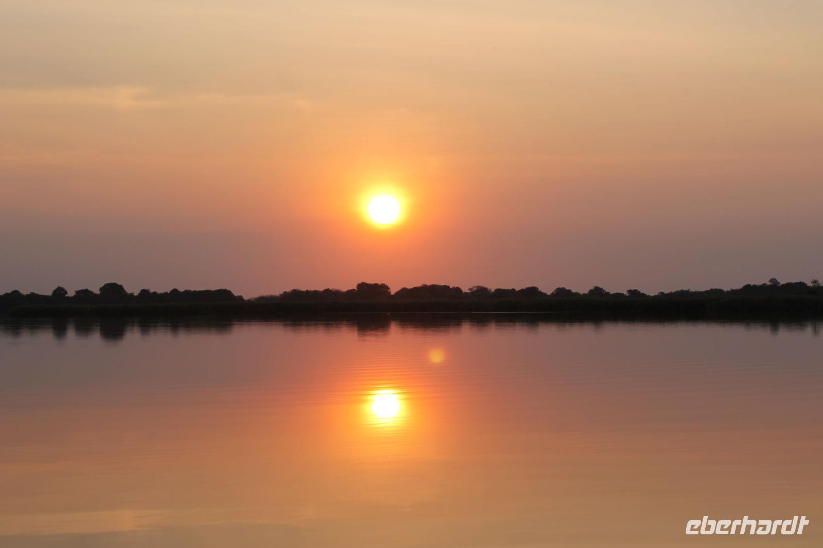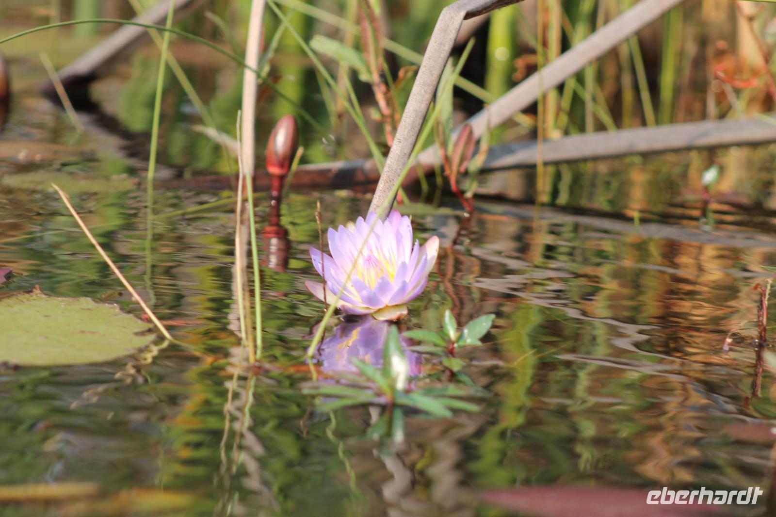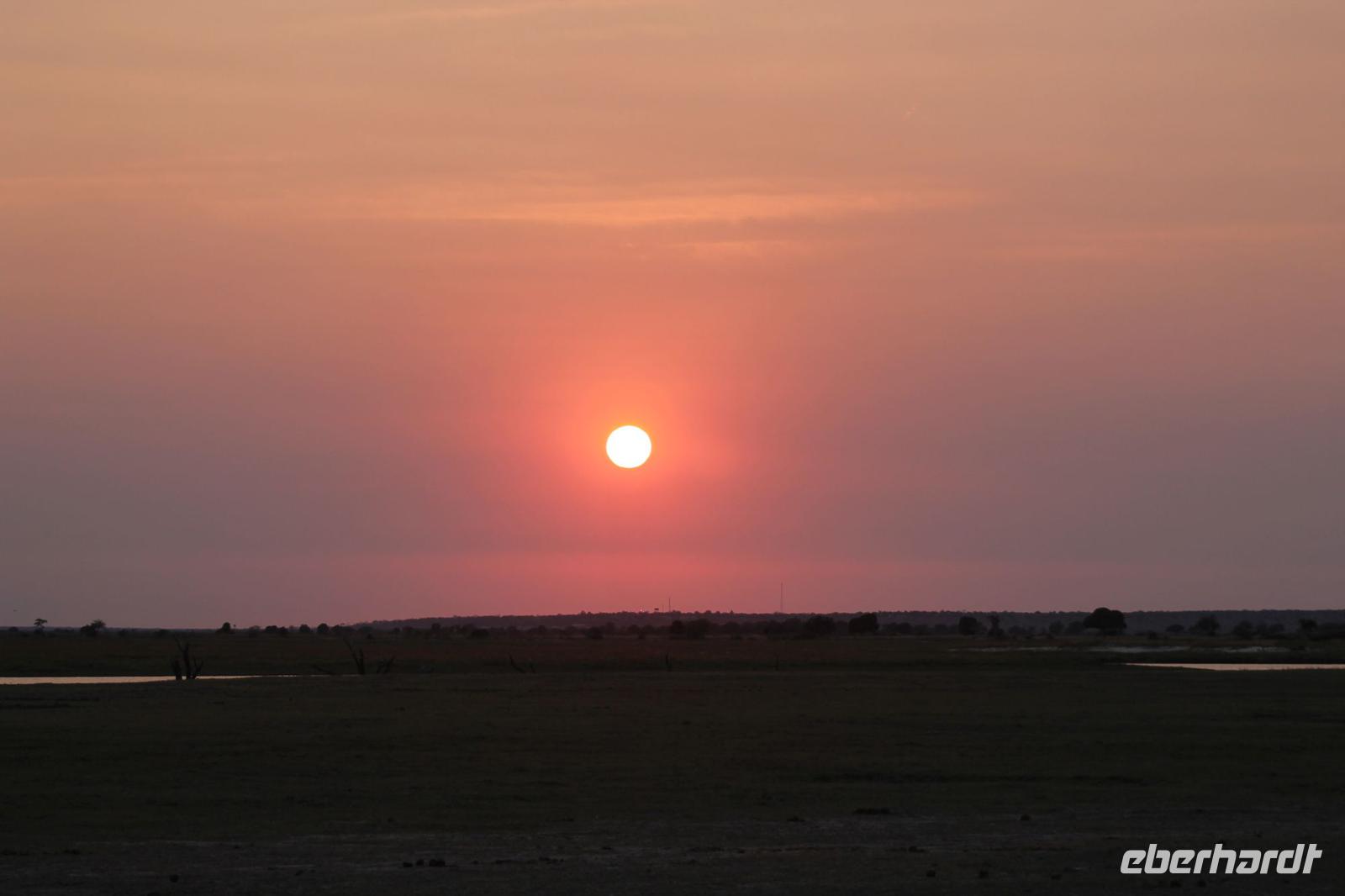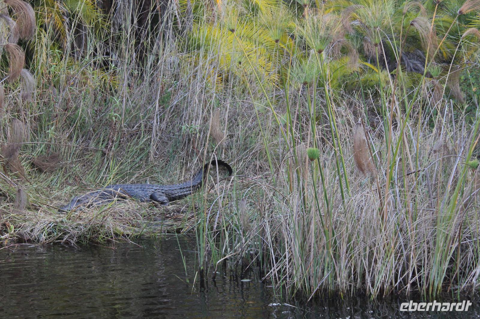 Nach einer kurzen Nacht, zumindest für einige, die aufgrund von manchmal nicht zuordnungsbaren Geräuschen vergeblich die Nachtruhe suchten, genießen wir heute Morgen bei Sonnenschein ein leckeres Frühstück. Anschließend stehen unsere Mokoros mit denen wir heute die Insel erkunden bereits am Bootssteg bereit. Es ist gar nicht so einfach, in diese Einbäume einzusteigen aber es ist auf jeden Fall ein Abenteuer wert. Etwas schunkelnd führen uns unsere Gondeliere jeweils zu zweit sicher durch das Wasser. So sehen wir viele Seerosen und auch einige Vögle wie den Bienenfresser aus nächster Nähe. Der Chef Poler erzählt uns einiges über die Pflanzenwelt und was die Einheimischen damit so alles anstellen. So erfahren wir, dass man aus den Seerosen auch Ketten und Hüte basteln kann und so küren wir die zwei Ältesten unserer Gruppe zur Delta Queen und zum Delta König. Beide können Ihr Glück kaum fassen. Anschließend fahren wir gemütlich weiter durch Papyrus Wälder und Schilflandschaft bis wir zu einer Insel gelangen. Wir unternehmen einen kurzen Spaziergang über die Insel und erfahren wieder viel über Pflanzen, Hinterlassenschaften der Tiere und Spuren. Ein Trinkgeld für diese herzlichen Poler darf natürlich auch nicht fehlen. Anschließend bringen Sie uns sicher zurück zu unserer Lodge und hier lassen wir uns ein Mittagessen schmecken. Den Nachmittag nutzen wir individuell und beobachten Vögel oder spazieren zum Ausschichtspunkt. Pünktlich um 16:00 Uhr werden wir von Nookie im Restaurant mit leckerem Schokoladenkuchen und einer Tasse Kaffee bereits erwartet und müssen feststellen, dass dieser Kuchen einfach wunderbar lecker schmeckt. So ein Drachen ist sie eigentlich auch gar nicht J Anschließend bestellen wir uns einige Getränke für unsere Sunddowner Fahrt am Abend, die wir gleich anschließend mit unserem Motorboot beginnen. So schippern wir gemütlich durch das Delta und sehen viele Vögel wie z.B. den Bienenfresser oder einen Golliathreiher. Außerdem genießen wir die wunderbare idyllische und romantische Landschaft zwischen den Papyruspflanzen. Ganz langsam fahren wir an diesen vorbei und sind erstaunt, als sich auf einem Platz zwischen den Pflanzen vor uns ein riesiges Krokodil in der restlichen Sonne rekelt. Wir können das etwa 3 Meter große Geschöpf aus nächster Nähe beobachten und fahren sogar dicht heran, bis es uns entdeckt und sich seinen Weg in die Tiefe des Wassers sucht. Danach suchen wir uns einen tollen Platz um mitten auf dem Delta einen wunderbaren Sonnenuntergang zu genießen. Wir schaffen es sogar 10 Sekunden kurz still zu sein und inne zu halten. Dem einen fällt das weniger, dem anderen mehr schwer. Wir genießen dabei ein leckeres Bier oder einen Gin Tonic und fahren dann zurück zu unserer Lodge, wo bereits die Dunkelheit wieder Einzug gehalten hat. Nachdem wir uns kurz frisch gemacht haben treffen wir uns wieder zum Abendessen, welches wieder köstlich schmeckt. Wieder lassen wir den Abend wie gewohnt an der Bar ausklingen und lauschen wieder einem tollen Märchen aus „Toms Sammlung" der Nelson Mandela Märchen. Ein gelungener Abschluss für einen wiedermal tollen ereignisreichen Tag. Dieser wird noch von zwei tollen Gesängen des „Harald and the Botswana Sisters" gekürt. (Insider Witz)