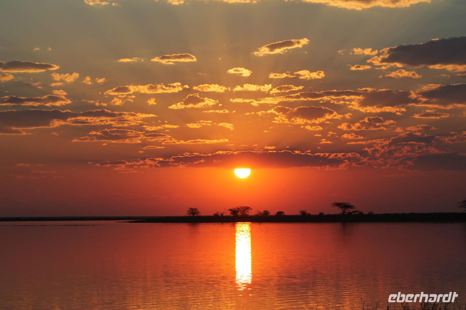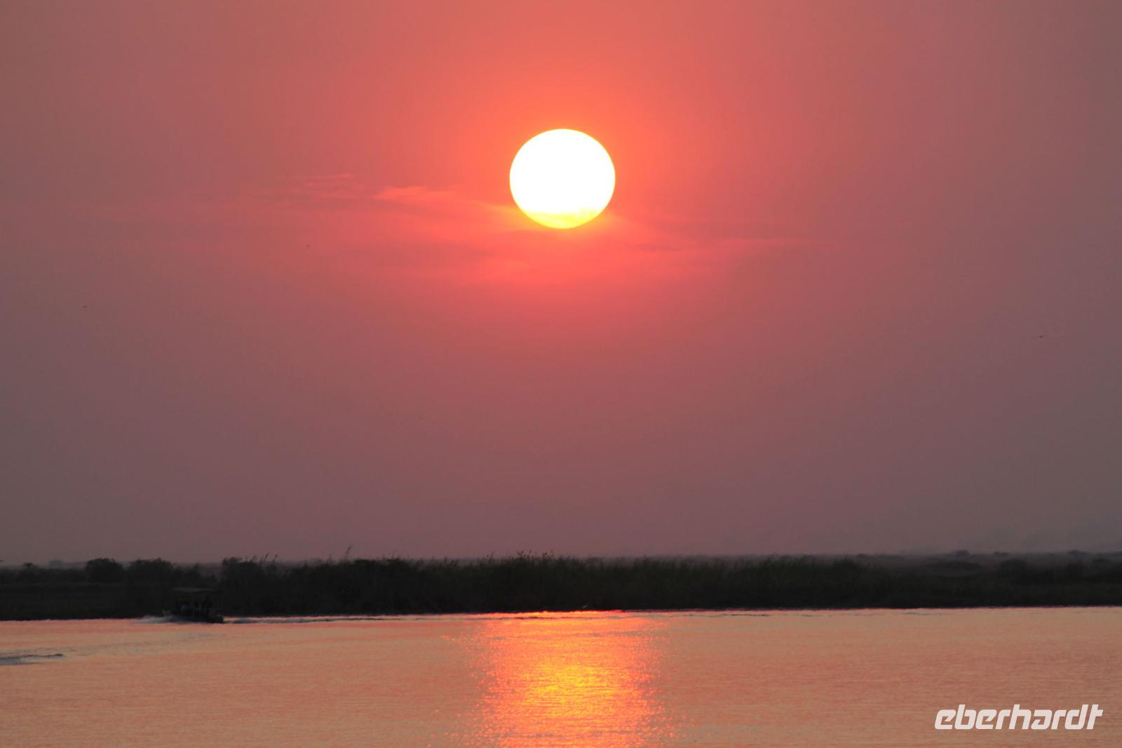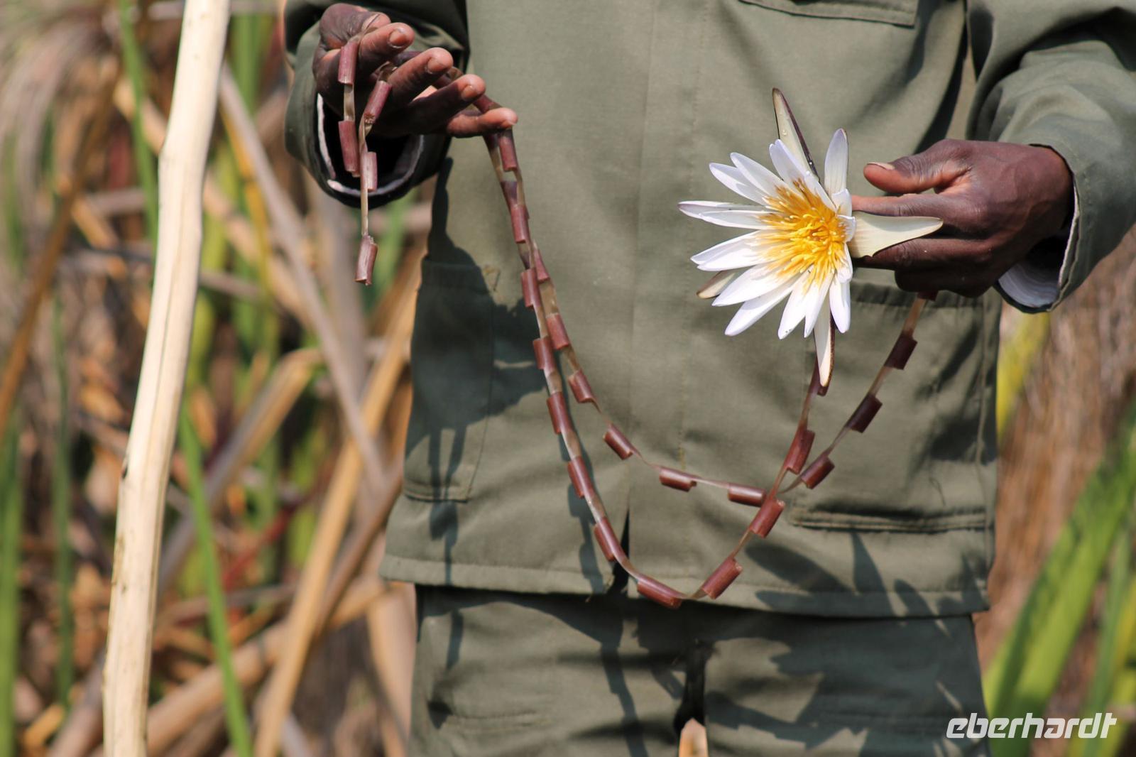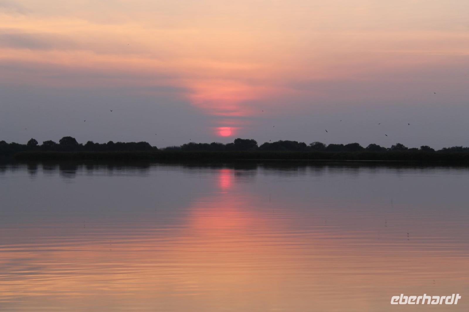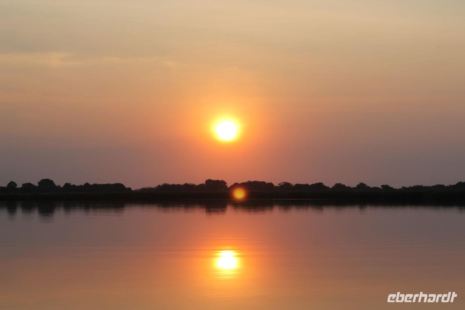 Nach einer kurzen Nacht, zumindest für einige, die aufgrund von manchmal nicht zuordnungsbaren Geräuschen vergeblich die Nachtruhe suchten, genießen wir heute Morgen bei Sonnenschein ein leckeres Frühstück. Anschließend stehen unsere Mokoros mit denen wir heute die Insel erkunden bereits am Bootssteg bereit. Es ist gar nicht so einfach, in diese Einbäume einzusteigen aber es ist auf jeden Fall ein Abenteuer wert. Etwas schunkelnd führen uns unsere Gondeliere jeweils zu zweit sicher durch das Wasser. So sehen wir viele Seerosen und auch einige Vögle wie den Bienenfresser aus nächster Nähe. Der Chef Poler erzählt uns einiges über die Pflanzenwelt und was die Einheimischen damit so alles anstellen. So erfahren wir, dass man aus den Seerosen auch Ketten und Hüte basteln kann und so küren wir die zwei Ältesten unserer Gruppe zur Delta Queen und zum Delta König. Beide können Ihr Glück kaum fassen. Anschließend fahren wir gemütlich weiter durch Papyrus Wälder und Schilflandschaft bis wir zu einer Insel gelangen. Wir unternehmen einen kurzen Spaziergang über die Insel und erfahren wieder viel über Pflanzen, Hinterlassenschaften der Tiere und Spuren. Ein Trinkgeld für diese herzlichen Poler darf natürlich auch nicht fehlen. Anschließend bringen Sie uns sicher zurück zu unserer Lodge und hier lassen wir uns ein Mittagessen schmecken. Den Nachmittag nutzen wir individuell und beobachten Vögel oder spazieren zum Ausschichtspunkt. Pünktlich um 16:00 Uhr werden wir von Nookie im Restaurant mit leckerem Schokoladenkuchen und einer Tasse Kaffee bereits erwartet und müssen feststellen, dass dieser Kuchen einfach wunderbar lecker schmeckt. So ein Drachen ist sie eigentlich auch gar nicht J Anschließend bestellen wir uns einige Getränke für unsere Sunddowner Fahrt am Abend, die wir gleich anschließend mit unserem Motorboot beginnen. So schippern wir gemütlich durch das Delta und sehen viele Vögel wie z.B. den Bienenfresser oder einen Golliathreiher. Außerdem genießen wir die wunderbare idyllische und romantische Landschaft zwischen den Papyruspflanzen. Ganz langsam fahren wir an diesen vorbei und sind erstaunt, als sich auf einem Platz zwischen den Pflanzen vor uns ein riesiges Krokodil in der restlichen Sonne rekelt. Wir können das etwa 3 Meter große Geschöpf aus nächster Nähe beobachten und fahren sogar dicht heran, bis es uns entdeckt und sich seinen Weg in die Tiefe des Wassers sucht. Danach suchen wir uns einen tollen Platz um mitten auf dem Delta einen wunderbaren Sonnenuntergang zu genießen. Wir schaffen es sogar 10 Sekunden kurz still zu sein und inne zu halten. Dem einen fällt das weniger, dem anderen mehr schwer. Wir genießen dabei ein leckeres Bier oder einen Gin Tonic und fahren dann zurück zu unserer Lodge, wo bereits die Dunkelheit wieder Einzug gehalten hat. Nachdem wir uns kurz frisch gemacht haben treffen wir uns wieder zum Abendessen, welches wieder köstlich schmeckt. Wieder lassen wir den Abend wie gewohnt an der Bar ausklingen und lauschen wieder einem tollen Märchen aus „Toms Sammlung" der Nelson Mandela Märchen. Ein gelungener Abschluss für einen wiedermal tollen ereignisreichen Tag. Dieser wird noch von zwei tollen Gesängen des „Harald and the Botswana Sisters" gekürt. (Insider Witz)