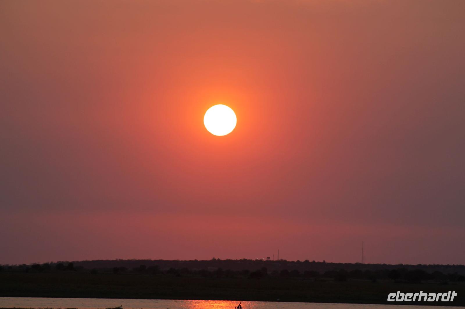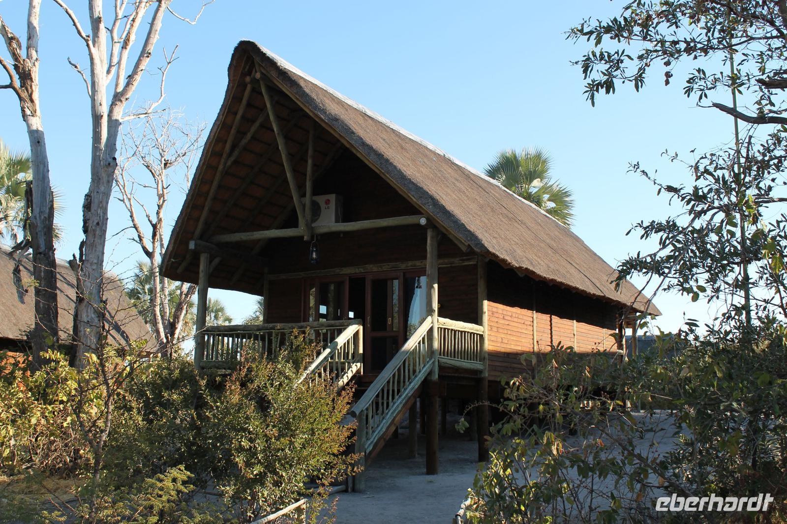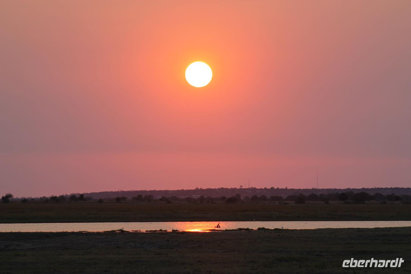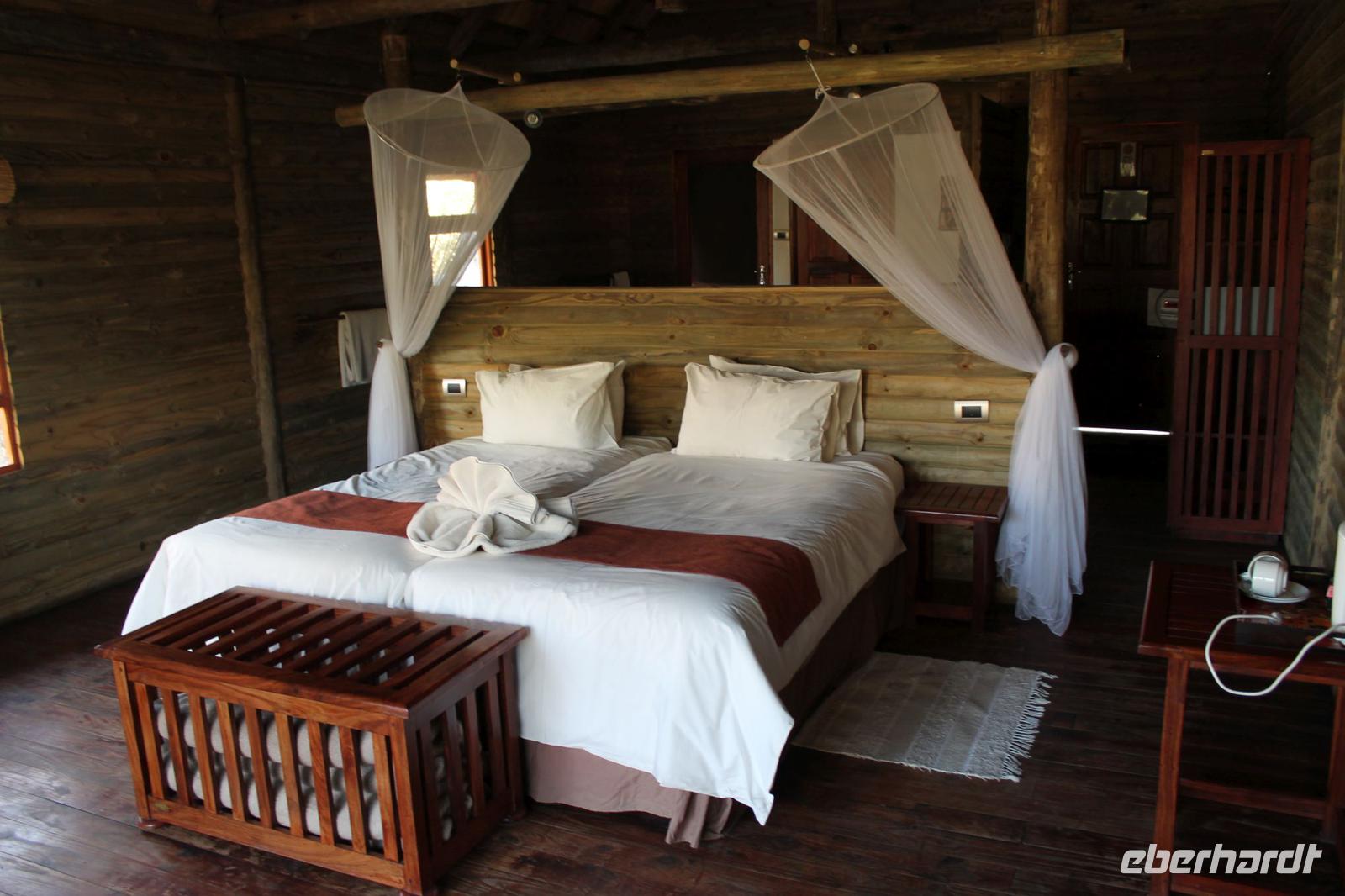 Nachdem wir heute auch die zweite Nacht überlebt haben, ohne von Hippos oder Elephanten angegriffen worden zu sein, verlassen wir heute N´Guma Island und fahren weiter in Richtung Caprivi-Streifen. „Die Privates" sowie auch alle anderen Gäste verlassen heute nach einem Frühstück Ihre Zelte und verabschieden sich noch herzlich von Nookie und Ihren Angestellten. Mit dem Jeep geht es zunächst zurück zu unserem Safari Truck. Hier angekommen werden wir bereits wieder von einigen Kindern erwartet und versorgen Sie mit Stiften und Schulheften. Sie freuen sich sehr darüber. Nach einer etwas längeren Fahrt erreichen wir schließlich gegen Mittag die Grenze zu Namibia. Bereits am Morgen haben wir glücklicherweise schon die Einreiseformulare ausgefüllt und so haben wir hier etwas weniger Schreibarbeit zu erledigen. Trotzdem füllen wir brav unseren Ausreisezettel für Botswana aus und zeigen an beiden Passbüros unsere Reisepässe vor, die kurze Zeit später zwei weitere Stempel zieren. Die ganzen Prozeduren ziehen sich eine Weil hin und so picknicken wir heute etwas später am Straßenrand. Der Platz ist aber nicht minder schön. Wir lassen uns frisches Brot mit Aufschnitt schmecken, welches wir am Morgen von Nookie bekommen haben. Die Männer bearbeiten das „zu bearbeitende Werkstück", so dass jeder eine Scheibe davon bekommt. Auch das obgliatorische Glas Wein aus Südafrika wahlweise Rot oder Rosé darf natürlich nicht fehlen. Von Tom erfahren wir, dass wir uns hier im Mahango Nationalpark befinden und es hier durchaus Löwen und Elephanten gibt. Aus diesem Grund halten wir stets die Augen offen. Noch etwa 260 Kilometer führen uns schließlich nach Namushasha, wo sich unsere heutige Lodge befindet. Unterwegs ist die Fahrt etwas beschwerlich uns staubig aber wir lauschen aufmerksam den Geschichten von Tom, der uns viel über den Krieg, der hier geherrscht erzählt und außerdem viel über die Menschen, die hier leben und vor allen Dingen über Ihre traditionellen Bräuche und Sitten. Kaum zu glauben, dass es noch Menschen gibt, die um Wasser zu bekommen mehrere Kilometer mit schweren Kanistern zum Fluss laufen müssen und wieder zurück. Wir sind schon etwas betroffen. Am frühen Abend erreichen wir nach einem anstrengenden Fahrtag schließlich unsere schöne Lodge direkt im Mudumu Nationalpark und am Fluss gelegen. Wir wohnen wieder in wunderbaren Chalets , die großzügig mit einer riesengroßen Terrasse ausgestattet sind und einer ebenso großen Dusche. Heute schlafen wir wie Prinzessinnen unter einem Himmelbett. Die Zimmer haben einen direkten Blick zum Fluss, so dass man hier wenn man Glück hat auch Hippos und Krokodile sehen, und vor allem aber hören kann. Das erfahren wir am eigenen Leib. Nach einer kurzen Pause genießen wir heute wieder ein Abendessen der Spitzenklasse und fühlen uns wie Gott in Frankreich. Einige gehen am Abend noch auf die Suche nach Hippos, haben aber kein Glück Sie zu sehen. Aber gehört hat Sie wohl fast ein jeder vor dem Schlafen gehen.