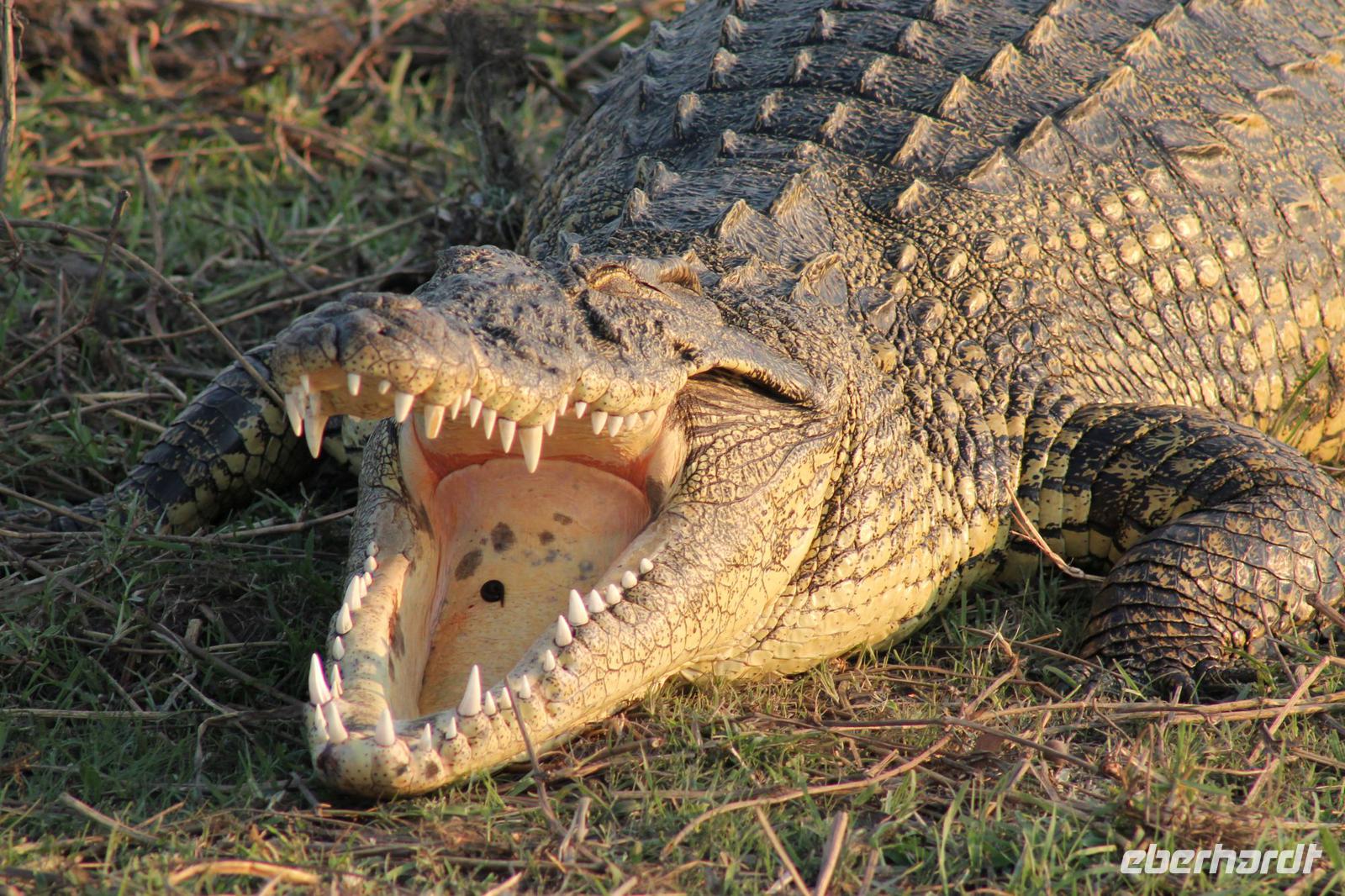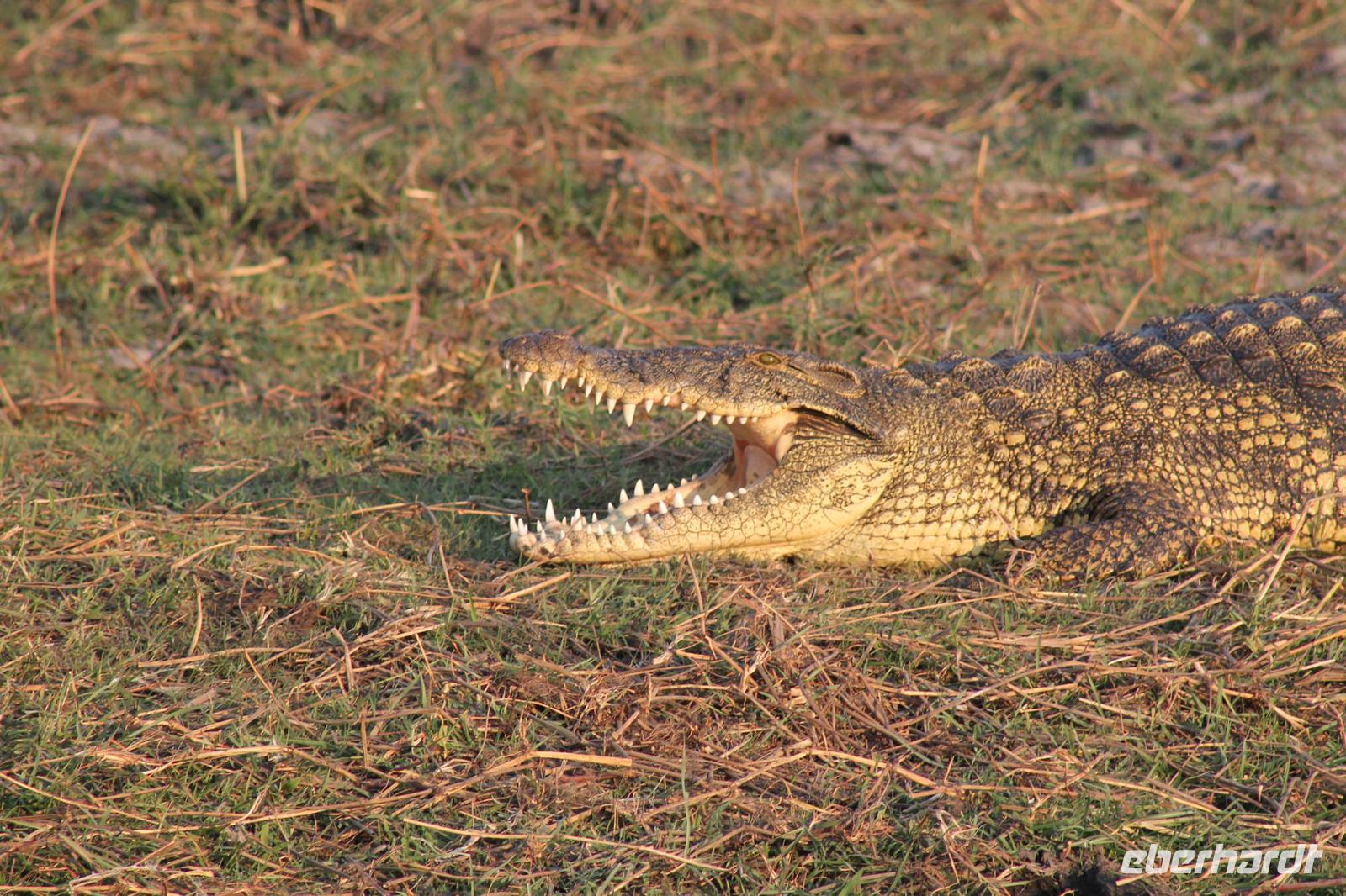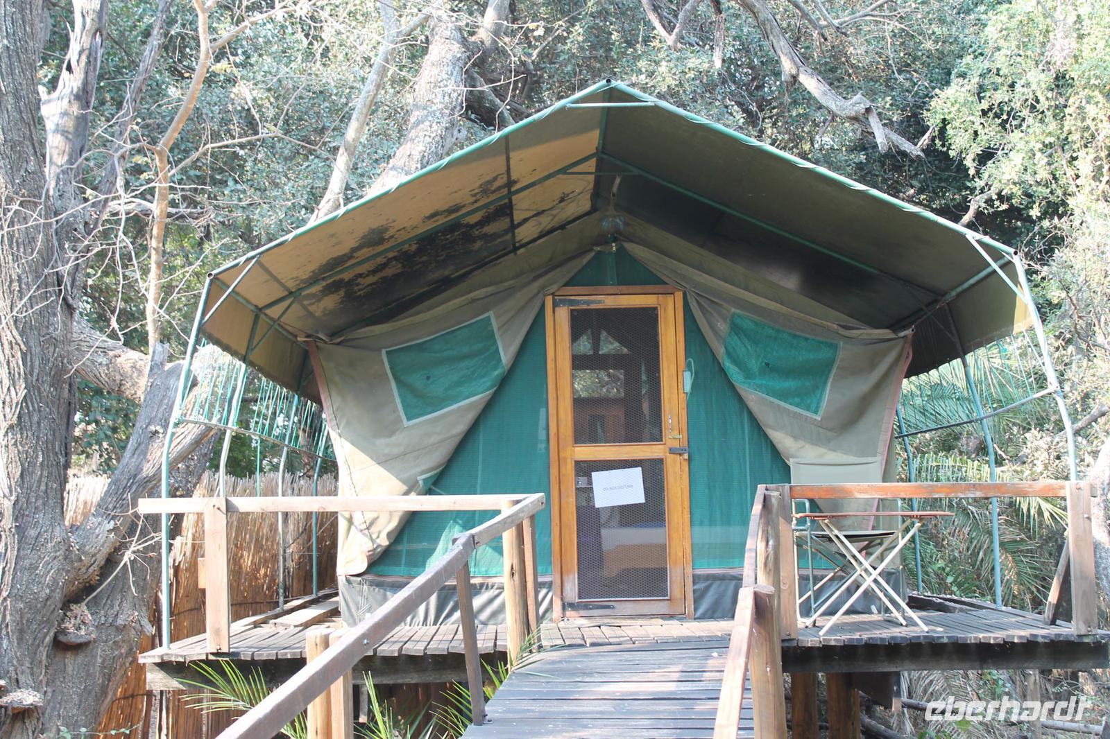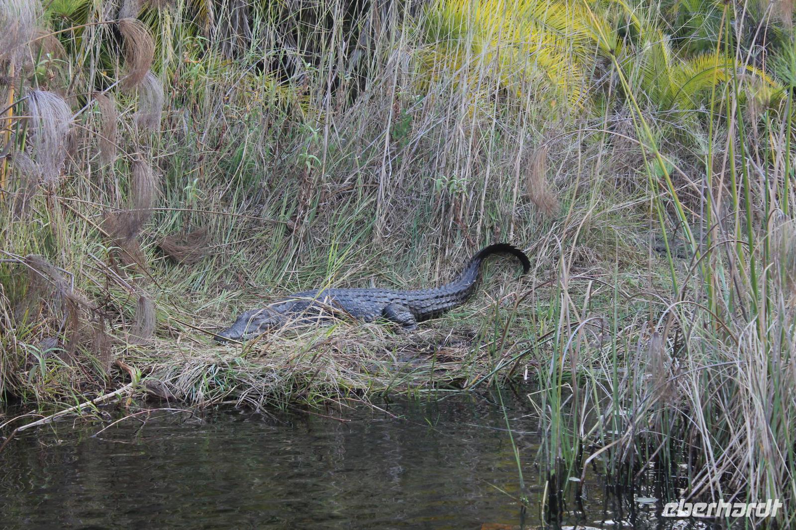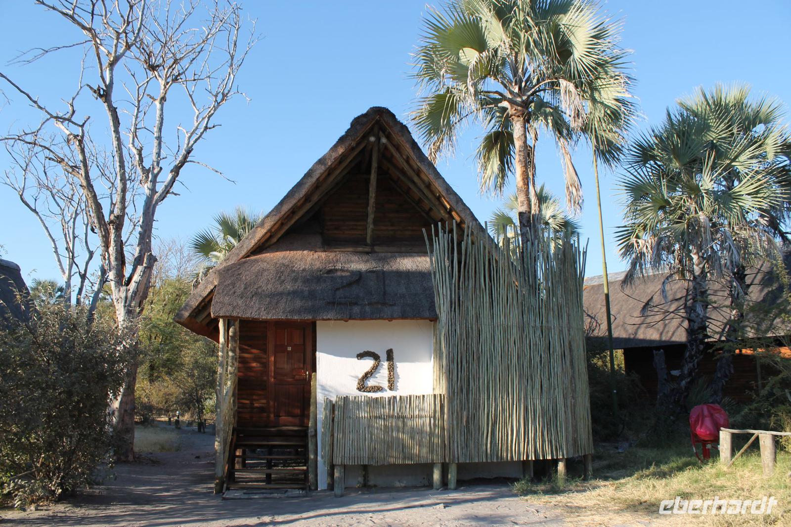 Heute verlassen wir Maun und fahren etwa 300 Kilometer weiter nach N´Guma Island. Vorher müssen wir aber noch Einkäufe für unsere Picknicks der nächsten Tage erledigen und Nivea Creme besorgen J Durch eine etwas trostlose Landschaft fahren wir zunächst nach Etsha 13. Bevor wir aber hier ankommen, picknicken wir zunächst mit leckeren neuen Speisen am Straßenrand und müssen feststellen, dass es gar nicht so einfach ist, ein schattiges Plätzchen ohne Kuh - oder Eselhinterlassenschaften zu finden. Letztendlich werden wir doch fündig und der ein oder andere nimmt selbst den Spaten in die Hand um uns ein idyllisches Plätzchen für unser heutiges Bergfest zu schaffen. So genießen wir leckeres Brot und zu Feier des Tages auch das ein oder andere Glas Wein aus Südafrika. Eine wunderbare Stimmung so wie jeden Tag. Leider sehen wir hier auch die vorherrschende Armut und lassen es uns nicht nehmen, um zwei unsere Brote abzugeben. Hier sehen wir mal wieder wieviel wir eigentlich zu Hause selbst haben. Nach einer weiteren kurzen Fahrt kommen wir schließlich nach Etsha 13 wo uns bereits unsere Jeeps erwarten um uns sicher zu unserer N´Guma Island Lodge auf einer Insel zu bringen. Die Trockenzeit hat deutlich Ihre Spuren hinterlassen und wo können wir über den Landweg die Lodge erreichen, die man sonst nur über Wasser erreichen kann. Ein wenig Staub haben wir zwar geschluckt, aber tut unserer Laune keinen Abbruch. Wir sind eben im Busch. Nach einer knappen Stunde mit den Jeeps durch eine schier traumhafte Landschaft erreichen wir dann unsere Zelte. Diese sind wirklich luxuriös ausgestattet und verfügen über zwei Betten, ein Außenbad mit Dusche und WC sowie diverse Ablagen. Wunderschön am Wasser gelegen beeindruckt uns die Lodge schon sehr zumal wir hier die einzigen Gäste sind. Wir haben Glück, denn der hier hausende Hausdrachen begegnet uns heute nicht, da Sie wohl für einige Zeit ausgeflogen ist. So beziehen wir mit unseren sieben Sachen unsere Zelte die lustige Namen tragen wie Tiger, Pink Happy oder Green Hat. Gemeinsam verbringen wir wieder einen tollen Nachmittag und genießen Kaffee und Kuchen wozu wir herzlich eingeladen worden. Wir sehen viele Vögel sowie einige Krokodile im Wasser. Stundenlang könnte man hier sitzen und einfach nur die Rolle des Beobachters einnehmen. Selbstverständlich gehört dieses Gebiet auch den Hippos und so erfahren wir, dass Sie sich abends nicht scheuen auch unter unseren Zelten hindurch zu kriechen. Vicky ist froh, dass Sie nicht mit Tom und Chris in einem Zelt wohnen muss und vor allen Dingen, dass Sie nicht das Zelt unten am Wasser bekommen hat. Ob die Hippos trotzdem Ihren Weg unter das Zelt finden bleibt abzuwarten. Am Abend genießen wir in Nookies Hütte ein tolles selbstgemachtes Abendessen mit Reis und leckerem Botswana Beef. Hier gilt noch die altbewehrte Regel: Ladies First. Uns allen schmeckt es köstlich und so lassen wir den Abend anschließend noch bei einem Bier, Wein oder Whiskey an der Bar ausklingen. Wir erfahren auch, dass fremde manchmal ins Zelt kommen um die dortige Dusche zu benutzen. Dies war aber glücklicherweise nicht bei allen der Fall J Der Weg zurück zu den Zelten ist nicht ganz ungefährlich aber schließlich finden wir zumindest für die erste Nacht doch unsere Ruhe. So viele Geräusche müssen wir während unserer Einschlafphase erstmal ordnen.