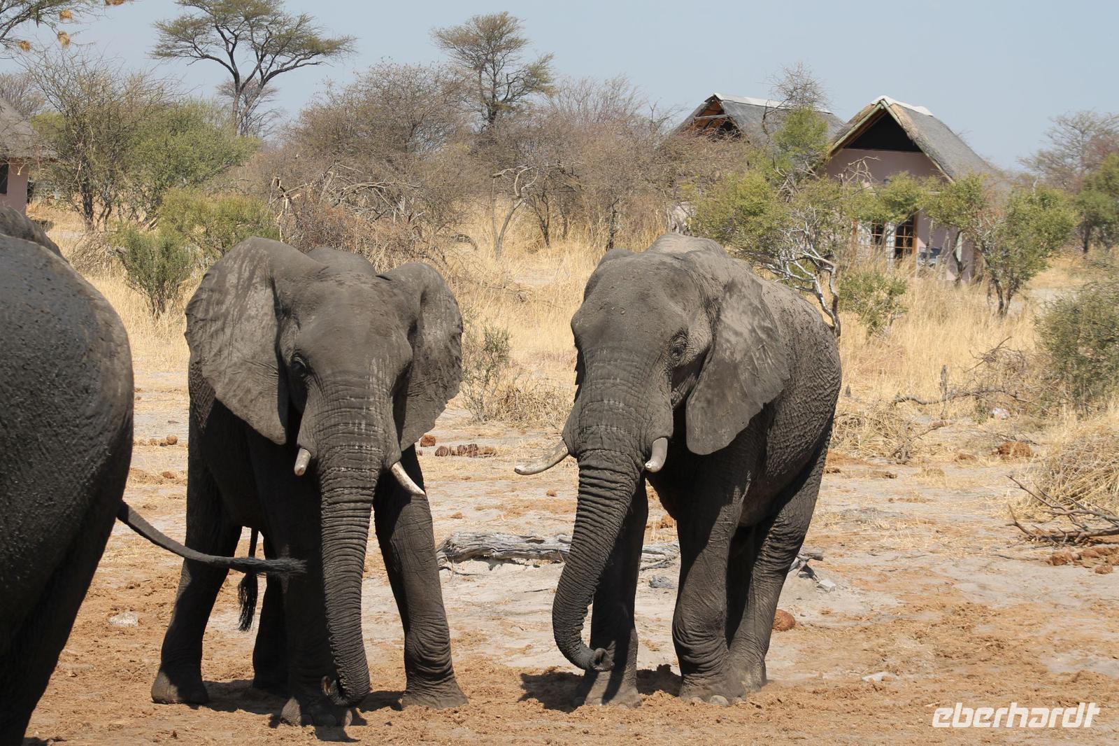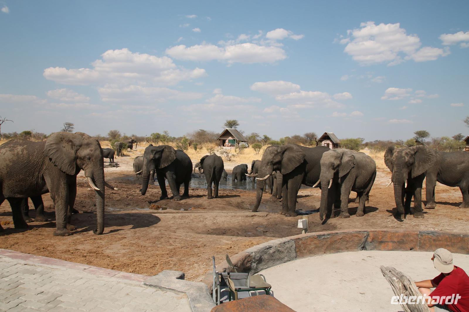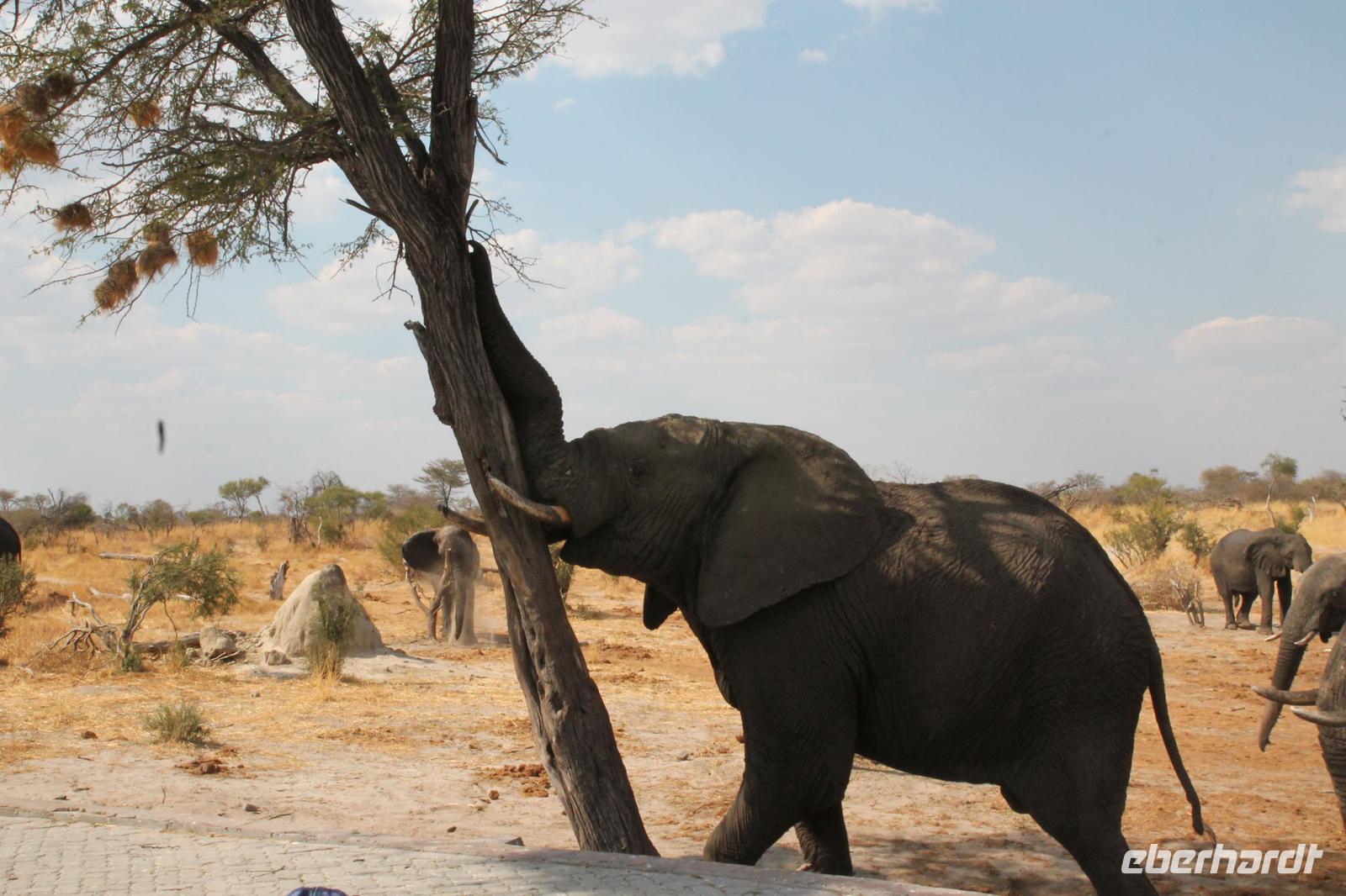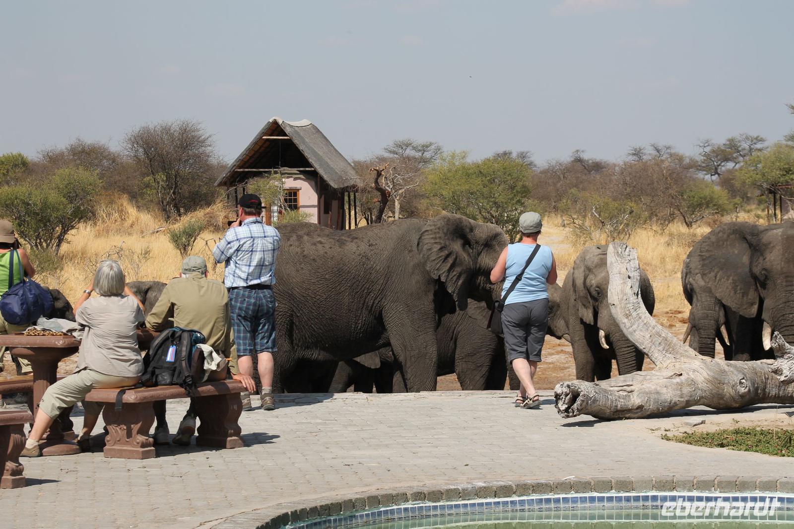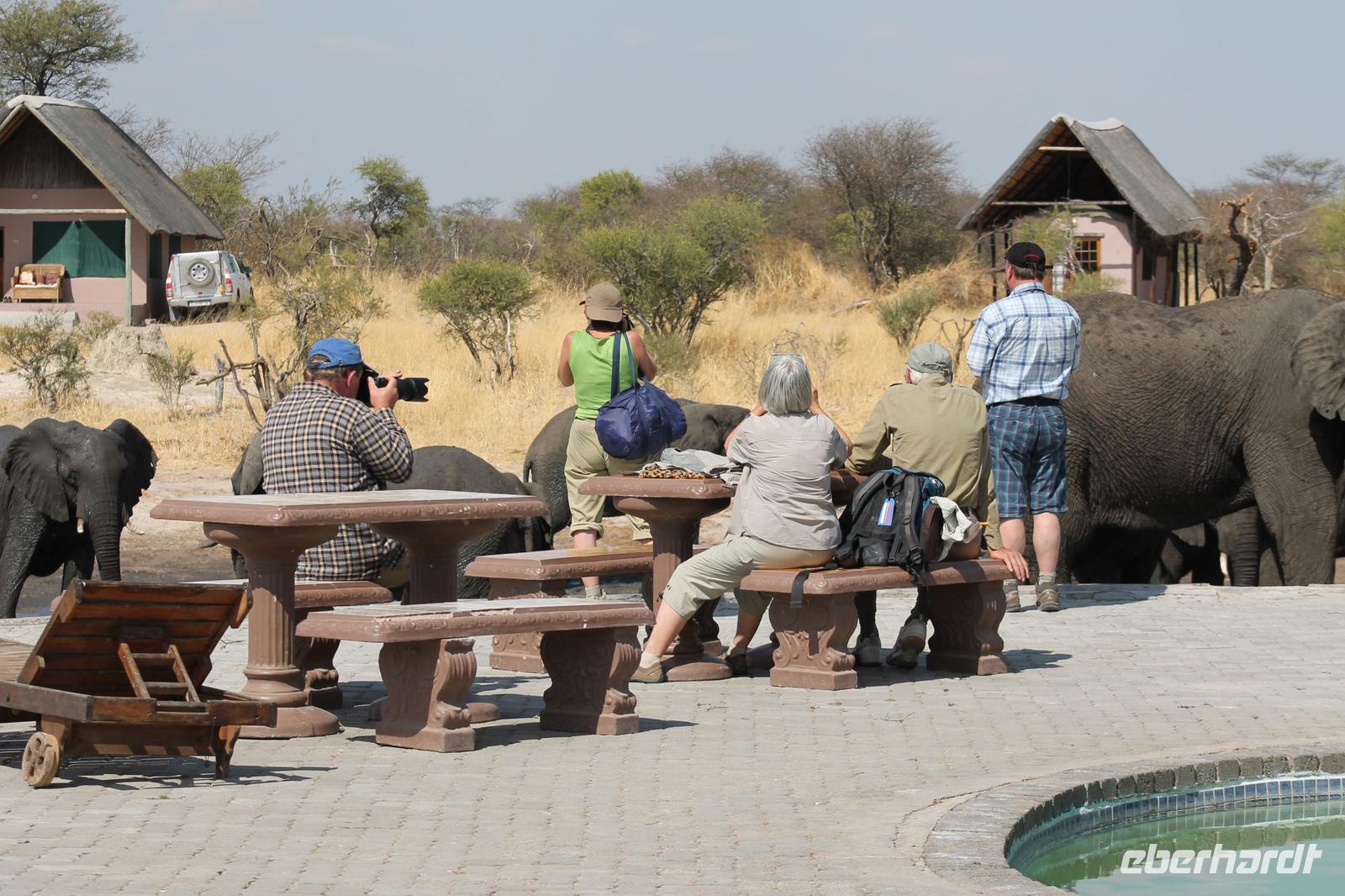 Heute Morgen stehen wir zeitig auf denn es erwartet und heute die Elephant Sands Lodge. Nach einem kurzen aber feinen Frühstück fahren wir etwa eine Stunde zur Elephants Sands Lodge. Unterwegs sehen wir einige Impalas und Esel, die es hier in Bostwana in Massen zu geben scheint. Am Resort angekommen werden wir bereits erwartet und hoffen darauf hier viele Elephanten aus nächster Nähe beobachten zu können. Nach einer kurzen Pause unternehmen wir eine drei stündige Pirsch durch das Reservat. Leider ist Trockenzeit und so sehen wir auf unserer Fahrt mit den Jeeps „nur" einige Impalas, Steinböcke und diverse Vögel. Zugegeben sind wir etwas enttäuscht, aber wenn man die Wasserlöcher sieht, stellt man schnell fest, dass es unmöglich für Elephanten sein muss hier Wasser zu finden. Unterwegs halten wir öfters an und genießen so ein kühles Getränk. Zurück an der Lodge sind wir daher umso überwältigter als sich vor uns eine Herde von Elefanten um das Wasserloch versammelt. Nur wenige Meter von uns entfernt können wir die Dickhäuter aus nächster Nähe beobachten und fotografieren. Diese Zeit nutzen wir natürlich ausgiebig. Bei einem leckeren Mittagessen auf der Lodge mit schmackhaften Sandwiches, Salat und Pommes genießen wir zusammen mit den Elefanten einen wunderbaren Augenblick. Um die 30 Elefanten befinden sich in der Zwischenzeit unmittelbar hinter uns. Natürlich darf hier auch ein Gruppenbild nicht fehlen. Etwas Abenteuerliches hat unser Besuch in jedem Fall, denn kurze Zeit später, tritt ein riesiger Elephant gegen einen Baum und schmeißt diesen direkt in den Pool der Lodge. Man merkt deutlich, dass die Tiere beginnen etwas aggressiv zu werden, da Sie nicht an die Wassermengen des Pools gelangen. So erleben wir das Abenteuer Afrika hautnah und haben äußerst Respekt vor diesen hochintelligenten Tieren. Am Nachmittag fahren wir erfasst von den vielen Eindrücken zurück zu unserer Lodge. Nach einer kurzen Erfrischungspause fahren wir am Nachmittag noch in Afrikas Salzpfanne - in die Makgadikgadi-Wüste. In offenen Jeeps erkunden wir die „Pfanne" ganz genau uns sehen vor unserem atemberaubenden Sonnenuntergang einige Sträuße, Gnus und Impalas. Am Fluss selbst begegnen uns außerdem Pelikane und Graureiher. Gegen 18:00 Uhr bewundern wir den wunderschönen Sonnenuntergang unter afrikanischem Himmel und genießen dabei das ein oder andere Bierchen. Ein „very romantisches" Gefühl um es mit Vickys Worten auszudrücken. Mit einzigartigen Eindrücken treten wir anschließend die Rückreise zu unserer Lodge an und genießen dort ein kühles Bier oder einen erfrischenden Wein und ein köstliches Abendmahl. Einige von uns begeben sich anschließend auf die Suche nach Buschbabys, die hier leben sollen und die einige Reisegäste bereits am Vortag gesehen haben. Leider haben wir kein Glück aber wir werden sicher weiter suchen.