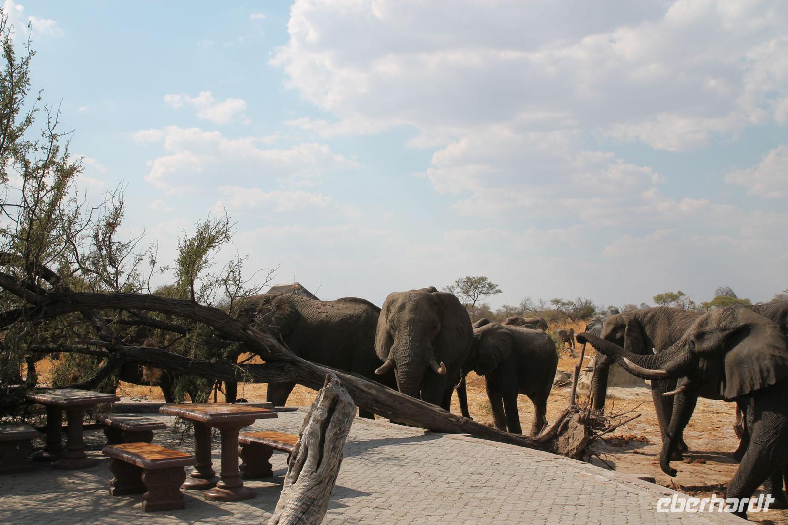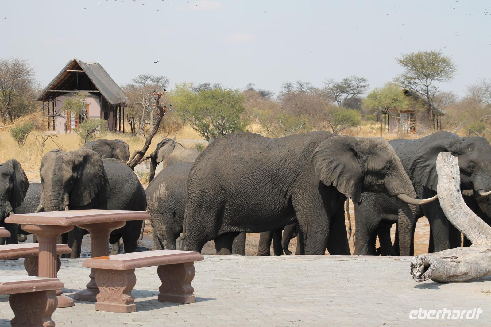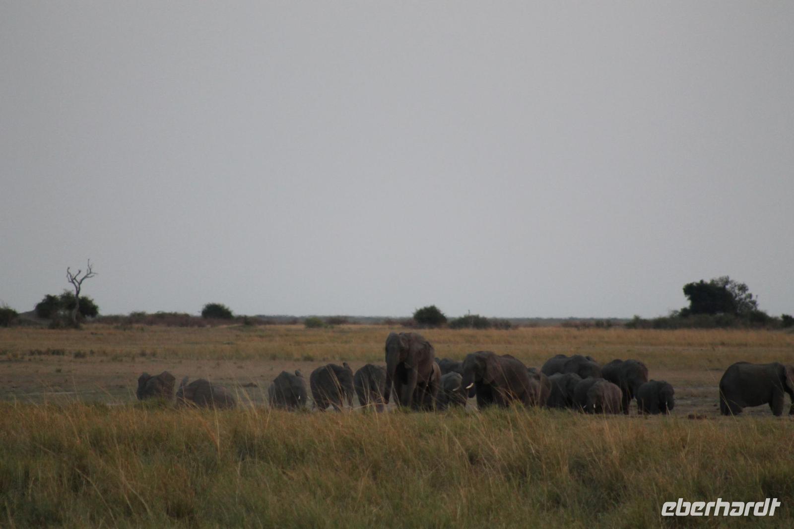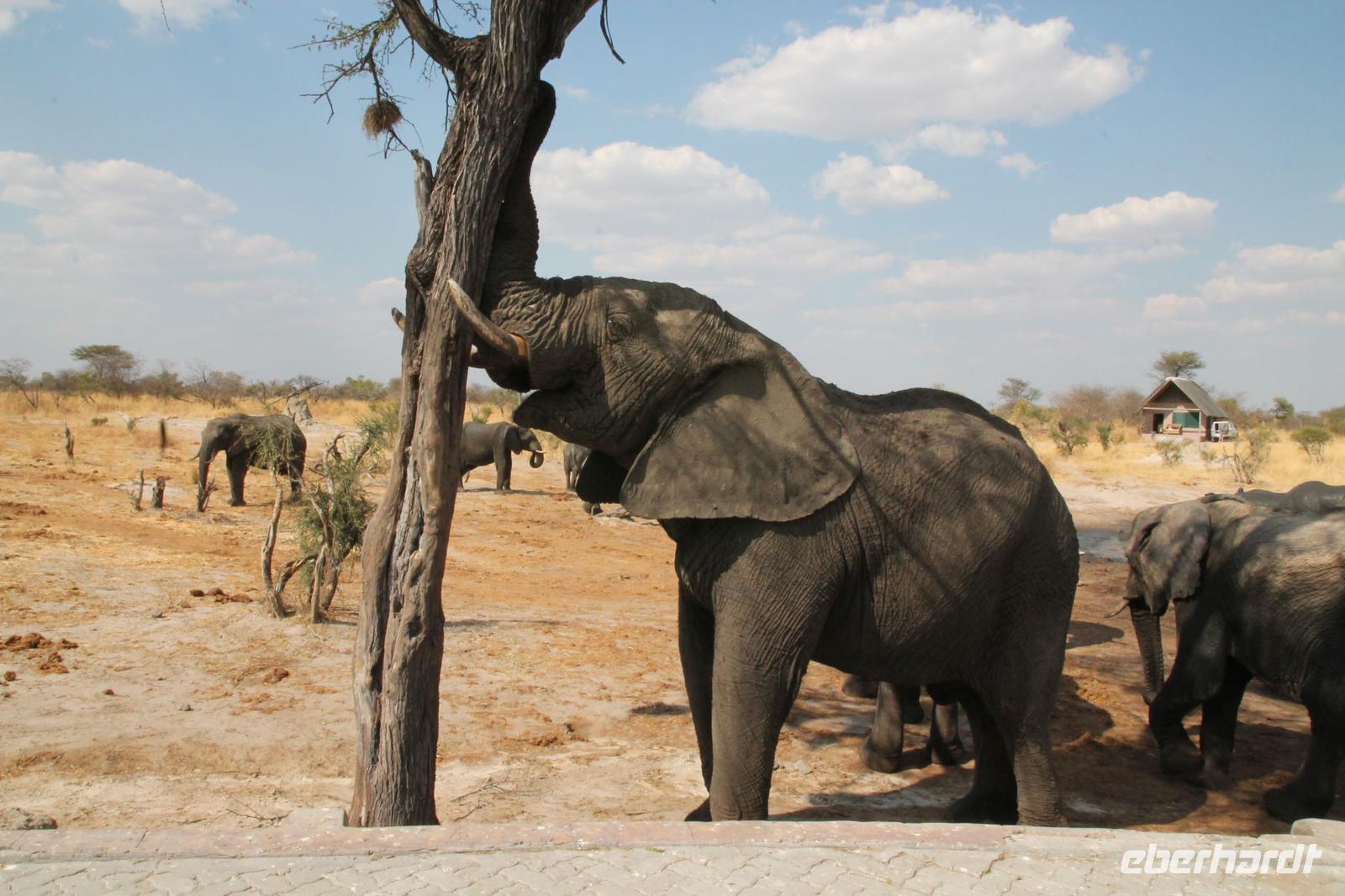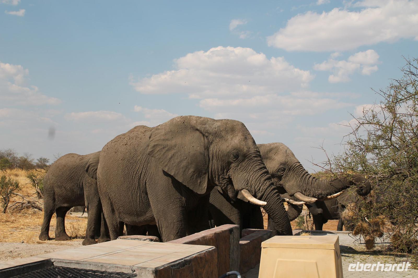 Heute Morgen stehen wir zeitig auf denn es erwartet und heute die Elephant Sands Lodge. Nach einem kurzen aber feinen Frühstück fahren wir etwa eine Stunde zur Elephants Sands Lodge. Unterwegs sehen wir einige Impalas und Esel, die es hier in Bostwana in Massen zu geben scheint. Am Resort angekommen werden wir bereits erwartet und hoffen darauf hier viele Elephanten aus nächster Nähe beobachten zu können. Nach einer kurzen Pause unternehmen wir eine drei stündige Pirsch durch das Reservat. Leider ist Trockenzeit und so sehen wir auf unserer Fahrt mit den Jeeps „nur" einige Impalas, Steinböcke und diverse Vögel. Zugegeben sind wir etwas enttäuscht, aber wenn man die Wasserlöcher sieht, stellt man schnell fest, dass es unmöglich für Elephanten sein muss hier Wasser zu finden. Unterwegs halten wir öfters an und genießen so ein kühles Getränk. Zurück an der Lodge sind wir daher umso überwältigter als sich vor uns eine Herde von Elefanten um das Wasserloch versammelt. Nur wenige Meter von uns entfernt können wir die Dickhäuter aus nächster Nähe beobachten und fotografieren. Diese Zeit nutzen wir natürlich ausgiebig. Bei einem leckeren Mittagessen auf der Lodge mit schmackhaften Sandwiches, Salat und Pommes genießen wir zusammen mit den Elefanten einen wunderbaren Augenblick. Um die 30 Elefanten befinden sich in der Zwischenzeit unmittelbar hinter uns. Natürlich darf hier auch ein Gruppenbild nicht fehlen. Etwas Abenteuerliches hat unser Besuch in jedem Fall, denn kurze Zeit später, tritt ein riesiger Elephant gegen einen Baum und schmeißt diesen direkt in den Pool der Lodge. Man merkt deutlich, dass die Tiere beginnen etwas aggressiv zu werden, da Sie nicht an die Wassermengen des Pools gelangen. So erleben wir das Abenteuer Afrika hautnah und haben äußerst Respekt vor diesen hochintelligenten Tieren. Am Nachmittag fahren wir erfasst von den vielen Eindrücken zurück zu unserer Lodge. Nach einer kurzen Erfrischungspause fahren wir am Nachmittag noch in Afrikas Salzpfanne - in die Makgadikgadi-Wüste. In offenen Jeeps erkunden wir die „Pfanne" ganz genau uns sehen vor unserem atemberaubenden Sonnenuntergang einige Sträuße, Gnus und Impalas. Am Fluss selbst begegnen uns außerdem Pelikane und Graureiher. Gegen 18:00 Uhr bewundern wir den wunderschönen Sonnenuntergang unter afrikanischem Himmel und genießen dabei das ein oder andere Bierchen. Ein „very romantisches" Gefühl um es mit Vickys Worten auszudrücken. Mit einzigartigen Eindrücken treten wir anschließend die Rückreise zu unserer Lodge an und genießen dort ein kühles Bier oder einen erfrischenden Wein und ein köstliches Abendmahl. Einige von uns begeben sich anschließend auf die Suche nach Buschbabys, die hier leben sollen und die einige Reisegäste bereits am Vortag gesehen haben. Leider haben wir kein Glück aber wir werden sicher weiter suchen.