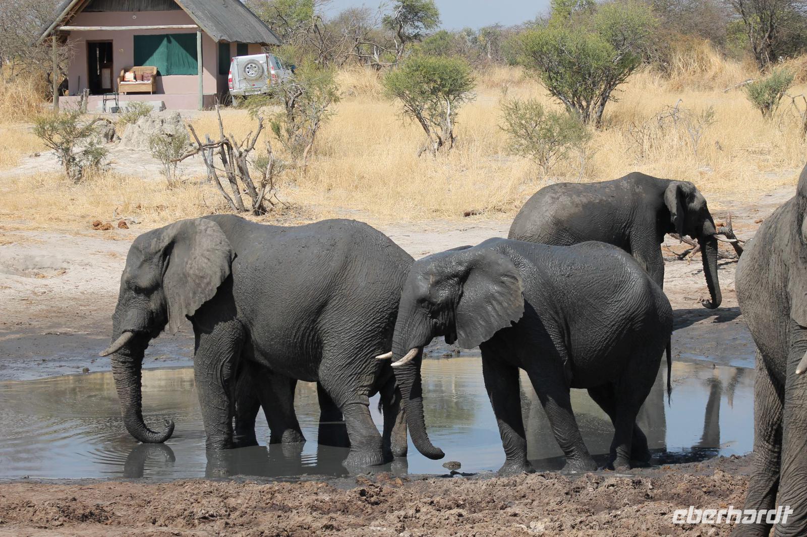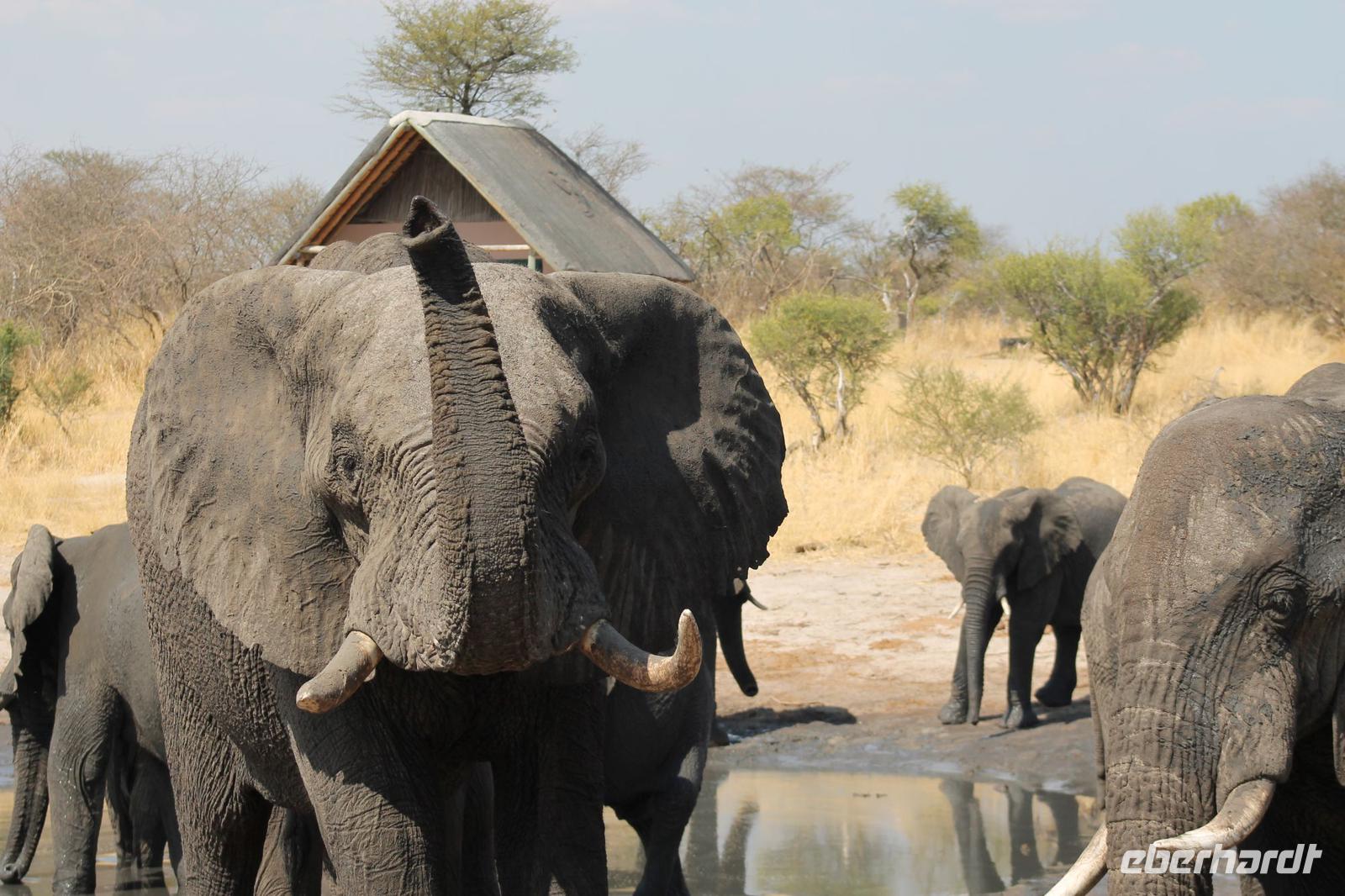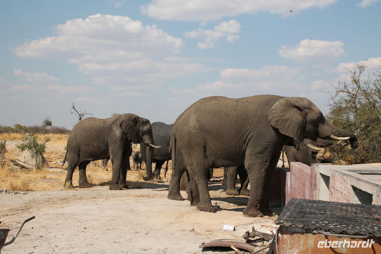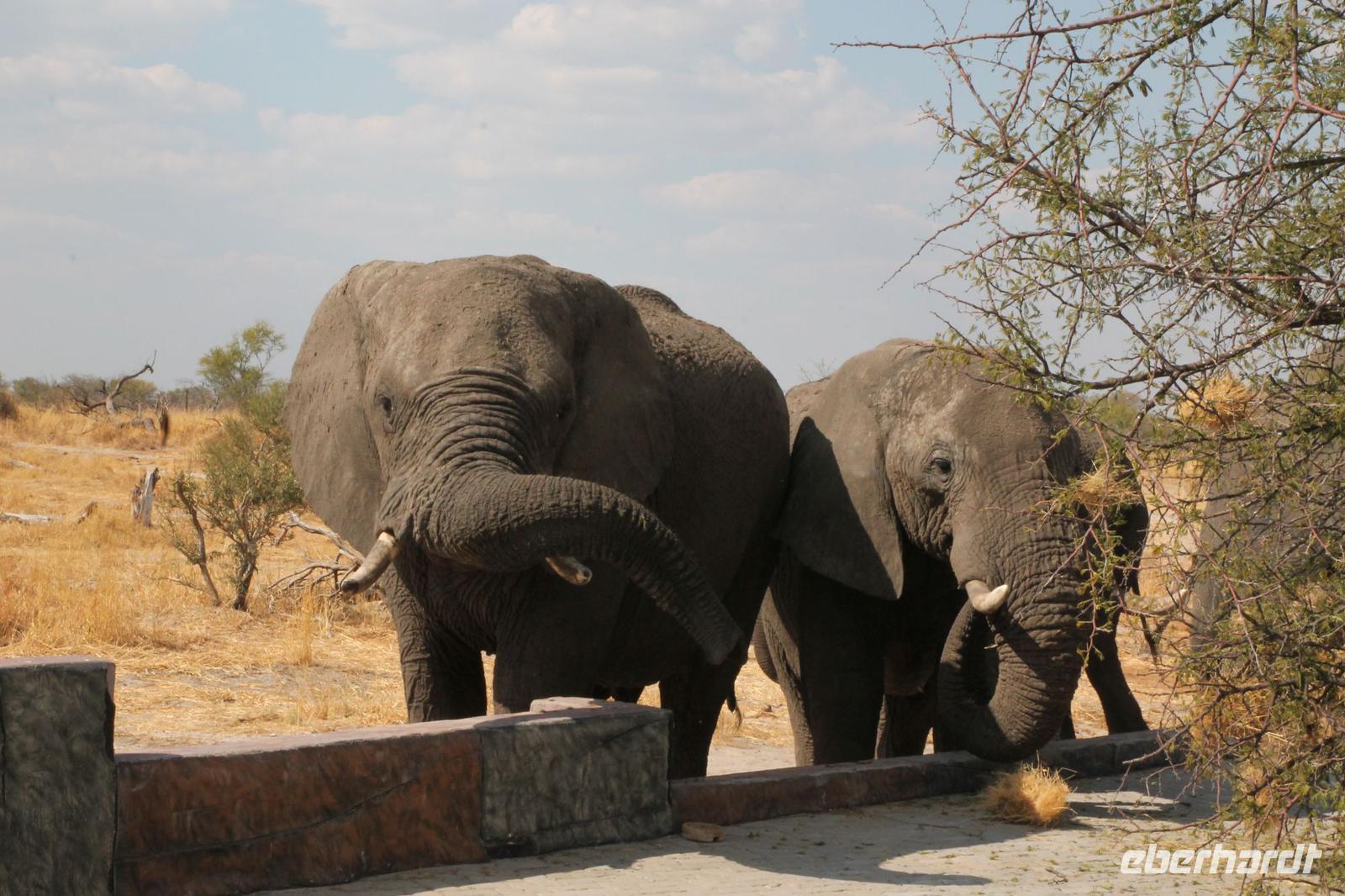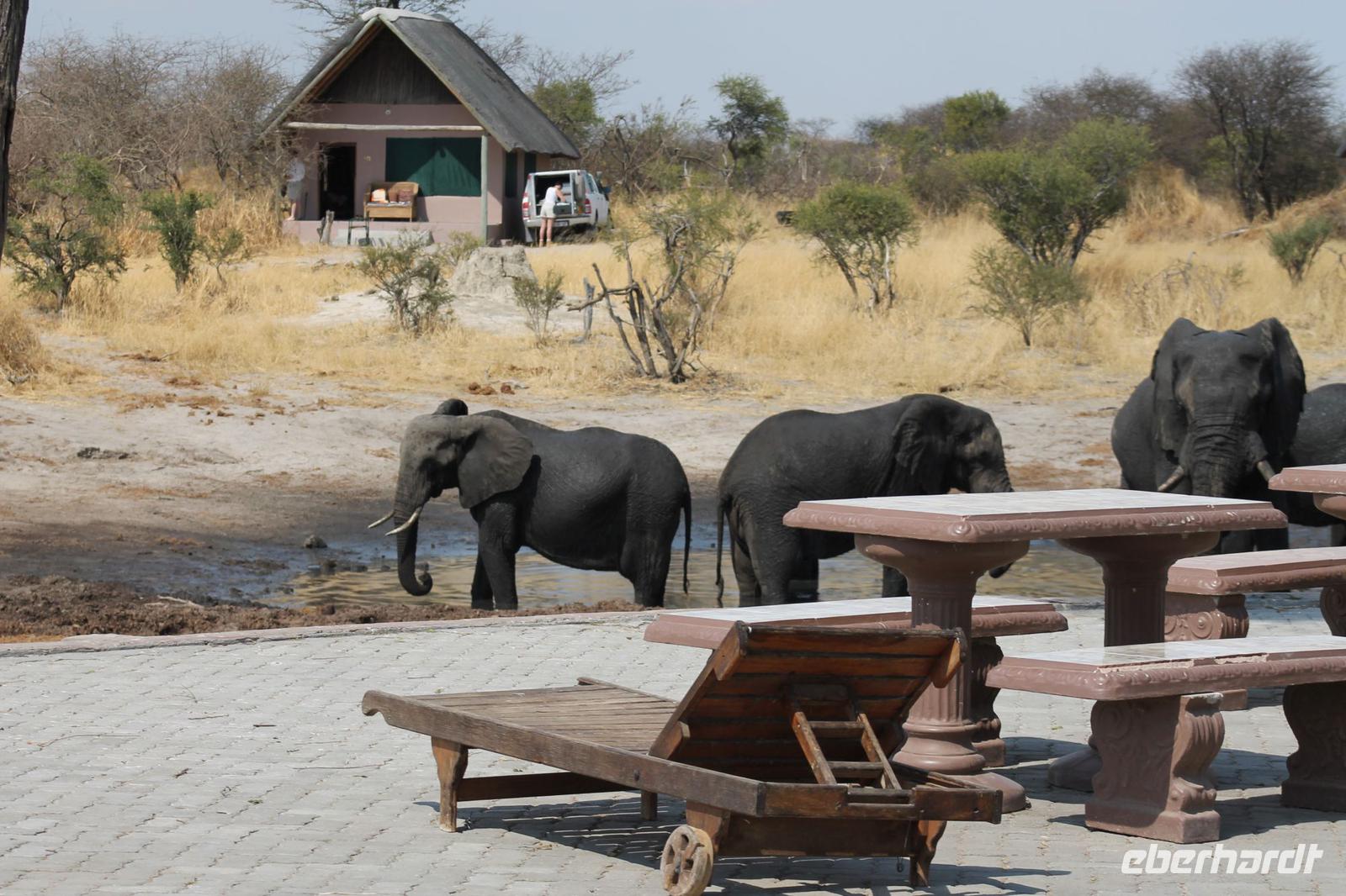 Heute Morgen stehen wir zeitig auf denn es erwartet und heute die Elephant Sands Lodge. Nach einem kurzen aber feinen Frühstück fahren wir etwa eine Stunde zur Elephants Sands Lodge. Unterwegs sehen wir einige Impalas und Esel, die es hier in Bostwana in Massen zu geben scheint. Am Resort angekommen werden wir bereits erwartet und hoffen darauf hier viele Elephanten aus nächster Nähe beobachten zu können. Nach einer kurzen Pause unternehmen wir eine drei stündige Pirsch durch das Reservat. Leider ist Trockenzeit und so sehen wir auf unserer Fahrt mit den Jeeps „nur" einige Impalas, Steinböcke und diverse Vögel. Zugegeben sind wir etwas enttäuscht, aber wenn man die Wasserlöcher sieht, stellt man schnell fest, dass es unmöglich für Elephanten sein muss hier Wasser zu finden. Unterwegs halten wir öfters an und genießen so ein kühles Getränk. Zurück an der Lodge sind wir daher umso überwältigter als sich vor uns eine Herde von Elefanten um das Wasserloch versammelt. Nur wenige Meter von uns entfernt können wir die Dickhäuter aus nächster Nähe beobachten und fotografieren. Diese Zeit nutzen wir natürlich ausgiebig. Bei einem leckeren Mittagessen auf der Lodge mit schmackhaften Sandwiches, Salat und Pommes genießen wir zusammen mit den Elefanten einen wunderbaren Augenblick. Um die 30 Elefanten befinden sich in der Zwischenzeit unmittelbar hinter uns. Natürlich darf hier auch ein Gruppenbild nicht fehlen. Etwas Abenteuerliches hat unser Besuch in jedem Fall, denn kurze Zeit später, tritt ein riesiger Elephant gegen einen Baum und schmeißt diesen direkt in den Pool der Lodge. Man merkt deutlich, dass die Tiere beginnen etwas aggressiv zu werden, da Sie nicht an die Wassermengen des Pools gelangen. So erleben wir das Abenteuer Afrika hautnah und haben äußerst Respekt vor diesen hochintelligenten Tieren. Am Nachmittag fahren wir erfasst von den vielen Eindrücken zurück zu unserer Lodge. Nach einer kurzen Erfrischungspause fahren wir am Nachmittag noch in Afrikas Salzpfanne - in die Makgadikgadi-Wüste. In offenen Jeeps erkunden wir die „Pfanne" ganz genau uns sehen vor unserem atemberaubenden Sonnenuntergang einige Sträuße, Gnus und Impalas. Am Fluss selbst begegnen uns außerdem Pelikane und Graureiher. Gegen 18:00 Uhr bewundern wir den wunderschönen Sonnenuntergang unter afrikanischem Himmel und genießen dabei das ein oder andere Bierchen. Ein „very romantisches" Gefühl um es mit Vickys Worten auszudrücken. Mit einzigartigen Eindrücken treten wir anschließend die Rückreise zu unserer Lodge an und genießen dort ein kühles Bier oder einen erfrischenden Wein und ein köstliches Abendmahl. Einige von uns begeben sich anschließend auf die Suche nach Buschbabys, die hier leben sollen und die einige Reisegäste bereits am Vortag gesehen haben. Leider haben wir kein Glück aber wir werden sicher weiter suchen.