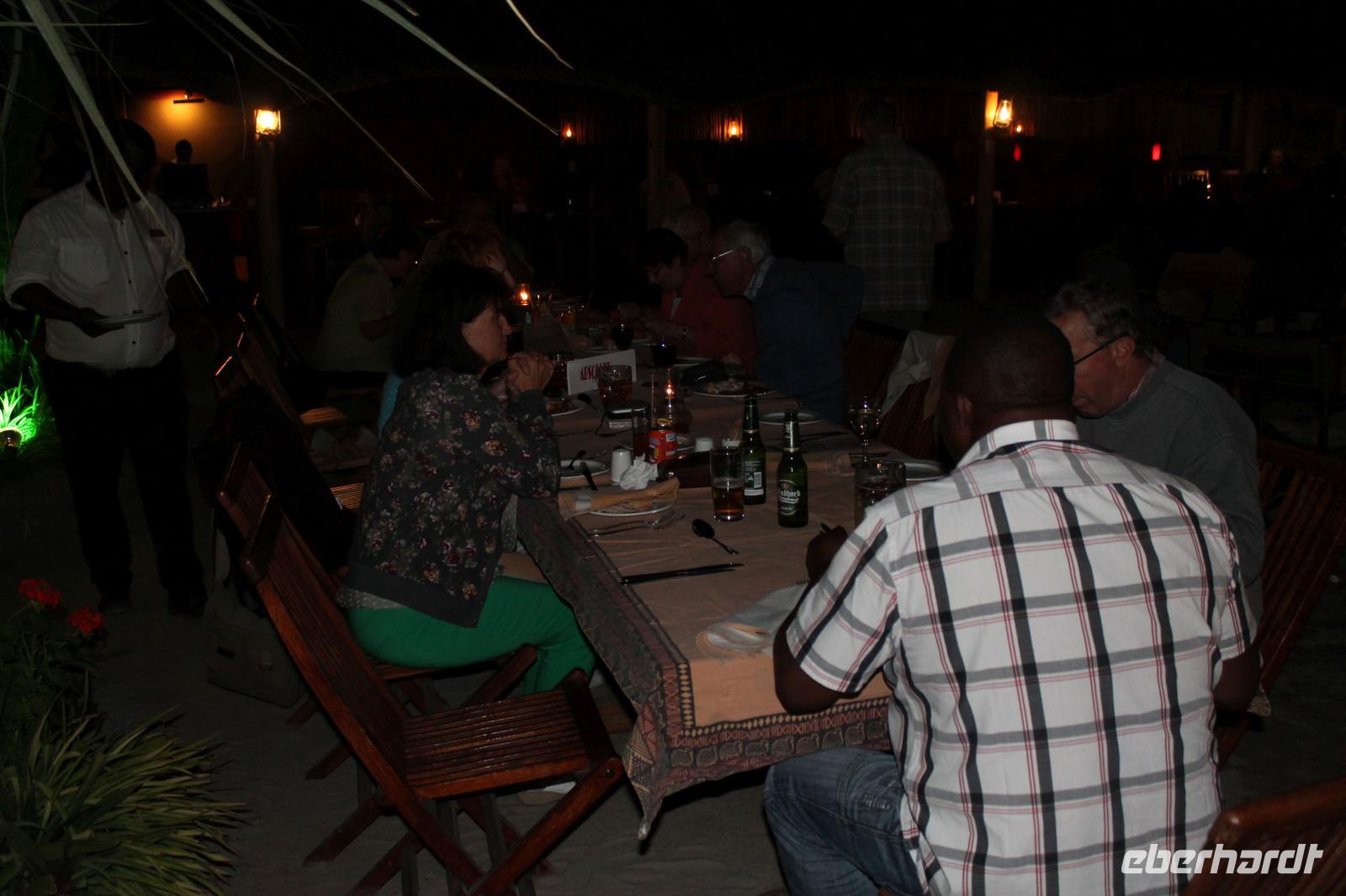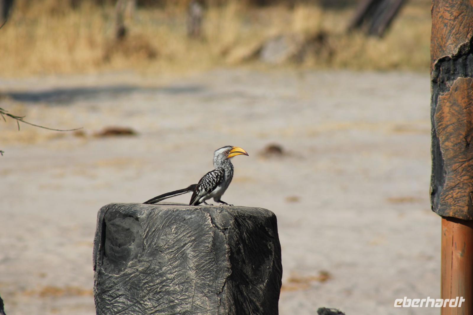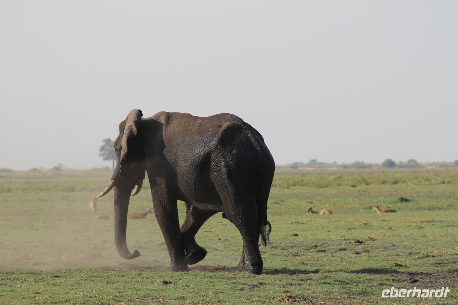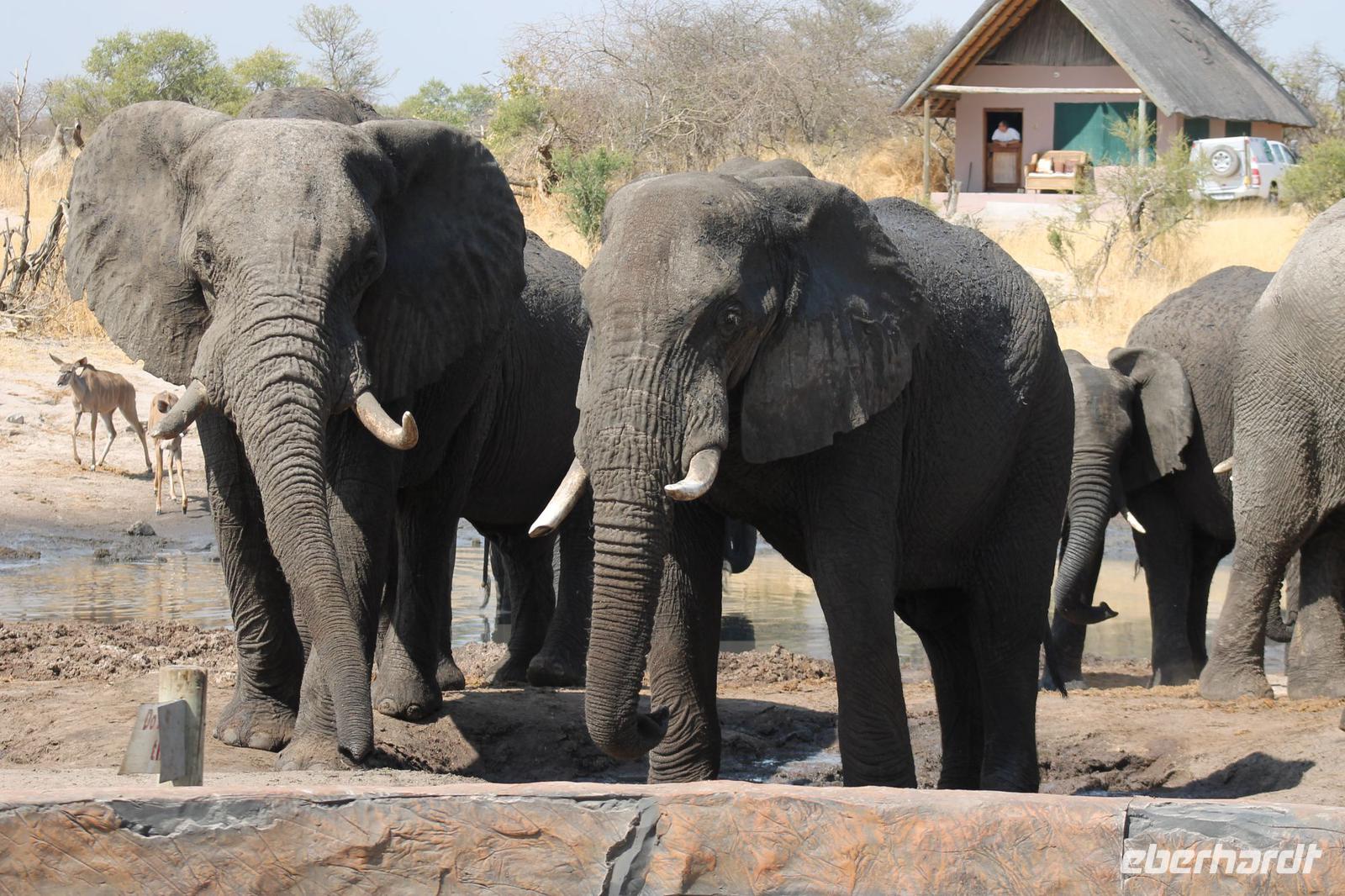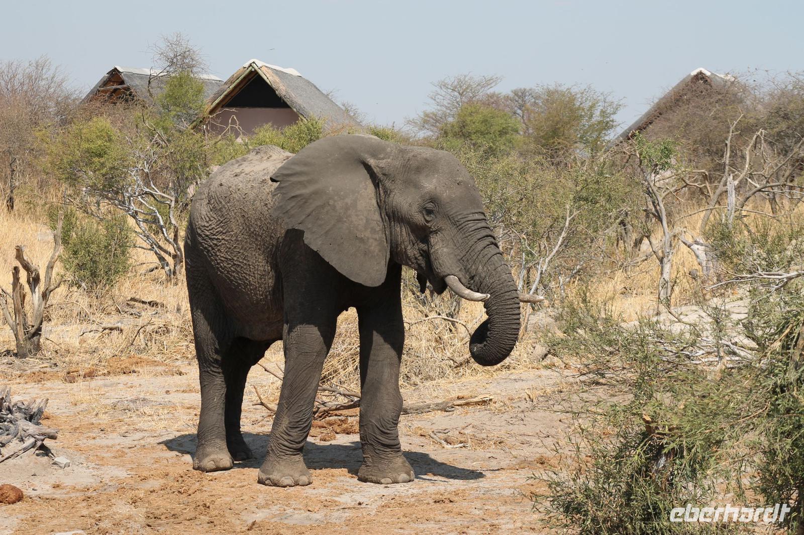 Heute Morgen stehen wir zeitig auf denn es erwartet und heute die Elephant Sands Lodge. Nach einem kurzen aber feinen Frühstück fahren wir etwa eine Stunde zur Elephants Sands Lodge. Unterwegs sehen wir einige Impalas und Esel, die es hier in Bostwana in Massen zu geben scheint. Am Resort angekommen werden wir bereits erwartet und hoffen darauf hier viele Elephanten aus nächster Nähe beobachten zu können. Nach einer kurzen Pause unternehmen wir eine drei stündige Pirsch durch das Reservat. Leider ist Trockenzeit und so sehen wir auf unserer Fahrt mit den Jeeps „nur" einige Impalas, Steinböcke und diverse Vögel. Zugegeben sind wir etwas enttäuscht, aber wenn man die Wasserlöcher sieht, stellt man schnell fest, dass es unmöglich für Elephanten sein muss hier Wasser zu finden. Unterwegs halten wir öfters an und genießen so ein kühles Getränk. Zurück an der Lodge sind wir daher umso überwältigter als sich vor uns eine Herde von Elefanten um das Wasserloch versammelt. Nur wenige Meter von uns entfernt können wir die Dickhäuter aus nächster Nähe beobachten und fotografieren. Diese Zeit nutzen wir natürlich ausgiebig. Bei einem leckeren Mittagessen auf der Lodge mit schmackhaften Sandwiches, Salat und Pommes genießen wir zusammen mit den Elefanten einen wunderbaren Augenblick. Um die 30 Elefanten befinden sich in der Zwischenzeit unmittelbar hinter uns. Natürlich darf hier auch ein Gruppenbild nicht fehlen. Etwas Abenteuerliches hat unser Besuch in jedem Fall, denn kurze Zeit später, tritt ein riesiger Elephant gegen einen Baum und schmeißt diesen direkt in den Pool der Lodge. Man merkt deutlich, dass die Tiere beginnen etwas aggressiv zu werden, da Sie nicht an die Wassermengen des Pools gelangen. So erleben wir das Abenteuer Afrika hautnah und haben äußerst Respekt vor diesen hochintelligenten Tieren. Am Nachmittag fahren wir erfasst von den vielen Eindrücken zurück zu unserer Lodge. Nach einer kurzen Erfrischungspause fahren wir am Nachmittag noch in Afrikas Salzpfanne - in die Makgadikgadi-Wüste. In offenen Jeeps erkunden wir die „Pfanne" ganz genau uns sehen vor unserem atemberaubenden Sonnenuntergang einige Sträuße, Gnus und Impalas. Am Fluss selbst begegnen uns außerdem Pelikane und Graureiher. Gegen 18:00 Uhr bewundern wir den wunderschönen Sonnenuntergang unter afrikanischem Himmel und genießen dabei das ein oder andere Bierchen. Ein „very romantisches" Gefühl um es mit Vickys Worten auszudrücken. Mit einzigartigen Eindrücken treten wir anschließend die Rückreise zu unserer Lodge an und genießen dort ein kühles Bier oder einen erfrischenden Wein und ein köstliches Abendmahl. Einige von uns begeben sich anschließend auf die Suche nach Buschbabys, die hier leben sollen und die einige Reisegäste bereits am Vortag gesehen haben. Leider haben wir kein Glück aber wir werden sicher weiter suchen.