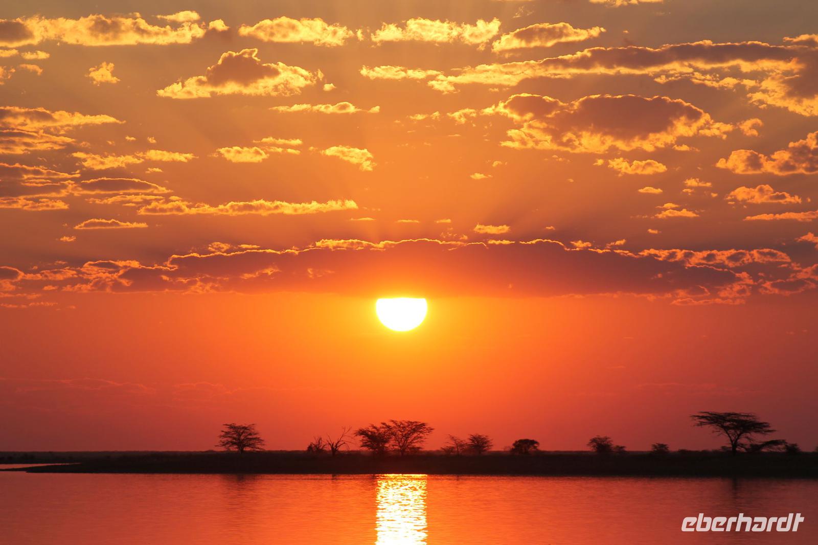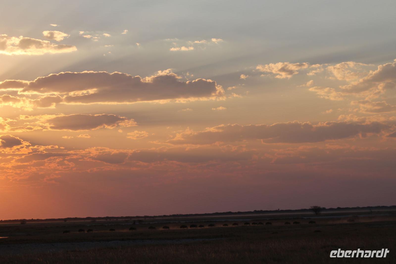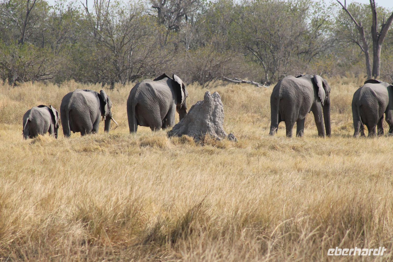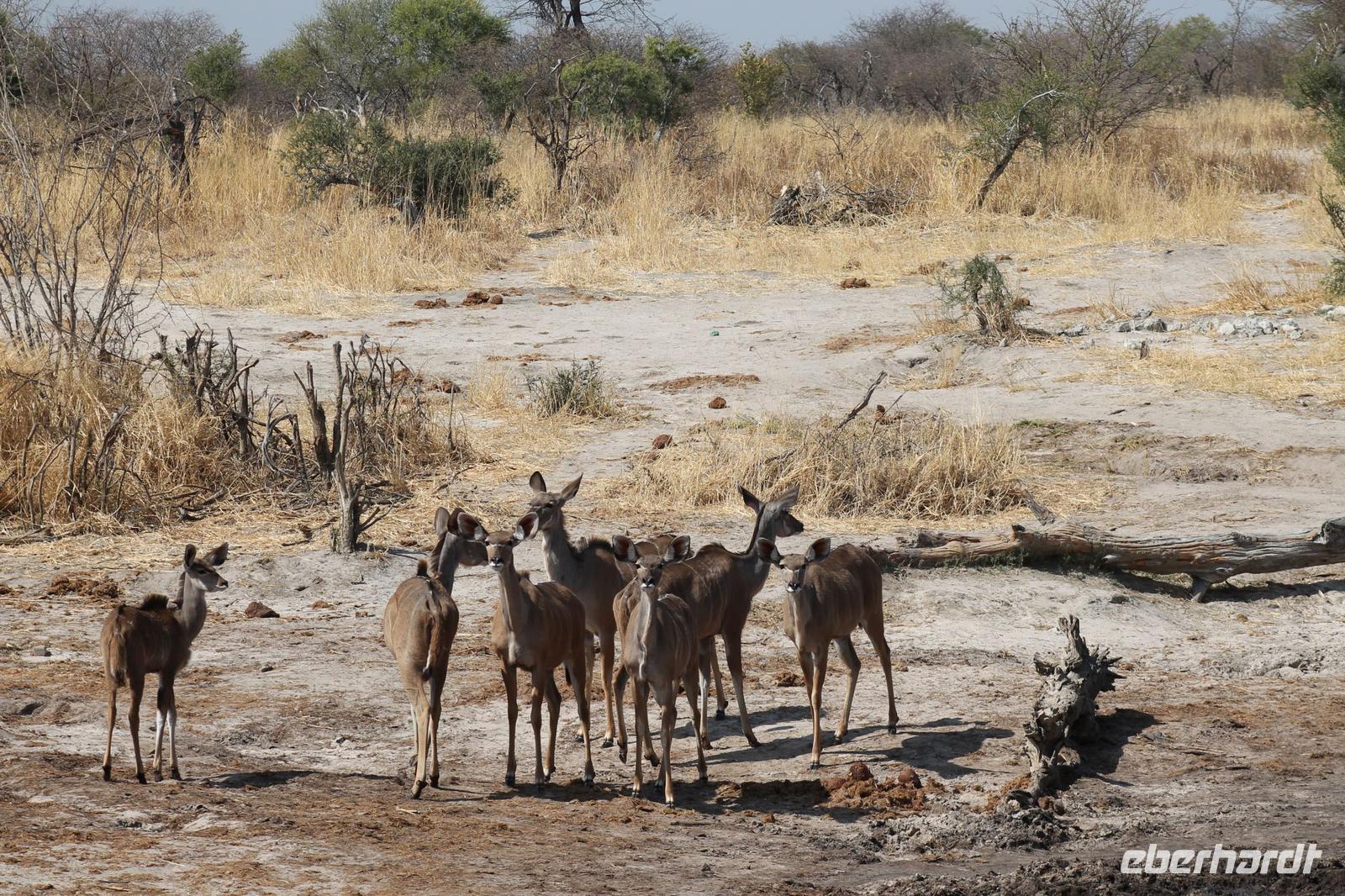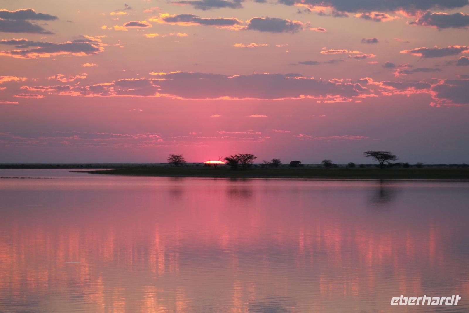 Heute Morgen stehen wir zeitig auf denn es erwartet und heute die Elephant Sands Lodge. Nach einem kurzen aber feinen Frühstück fahren wir etwa eine Stunde zur Elephants Sands Lodge. Unterwegs sehen wir einige Impalas und Esel, die es hier in Bostwana in Massen zu geben scheint. Am Resort angekommen werden wir bereits erwartet und hoffen darauf hier viele Elephanten aus nächster Nähe beobachten zu können. Nach einer kurzen Pause unternehmen wir eine drei stündige Pirsch durch das Reservat. Leider ist Trockenzeit und so sehen wir auf unserer Fahrt mit den Jeeps „nur" einige Impalas, Steinböcke und diverse Vögel. Zugegeben sind wir etwas enttäuscht, aber wenn man die Wasserlöcher sieht, stellt man schnell fest, dass es unmöglich für Elephanten sein muss hier Wasser zu finden. Unterwegs halten wir öfters an und genießen so ein kühles Getränk. Zurück an der Lodge sind wir daher umso überwältigter als sich vor uns eine Herde von Elefanten um das Wasserloch versammelt. Nur wenige Meter von uns entfernt können wir die Dickhäuter aus nächster Nähe beobachten und fotografieren. Diese Zeit nutzen wir natürlich ausgiebig. Bei einem leckeren Mittagessen auf der Lodge mit schmackhaften Sandwiches, Salat und Pommes genießen wir zusammen mit den Elefanten einen wunderbaren Augenblick. Um die 30 Elefanten befinden sich in der Zwischenzeit unmittelbar hinter uns. Natürlich darf hier auch ein Gruppenbild nicht fehlen. Etwas Abenteuerliches hat unser Besuch in jedem Fall, denn kurze Zeit später, tritt ein riesiger Elephant gegen einen Baum und schmeißt diesen direkt in den Pool der Lodge. Man merkt deutlich, dass die Tiere beginnen etwas aggressiv zu werden, da Sie nicht an die Wassermengen des Pools gelangen. So erleben wir das Abenteuer Afrika hautnah und haben äußerst Respekt vor diesen hochintelligenten Tieren. Am Nachmittag fahren wir erfasst von den vielen Eindrücken zurück zu unserer Lodge. Nach einer kurzen Erfrischungspause fahren wir am Nachmittag noch in Afrikas Salzpfanne - in die Makgadikgadi-Wüste. In offenen Jeeps erkunden wir die „Pfanne" ganz genau uns sehen vor unserem atemberaubenden Sonnenuntergang einige Sträuße, Gnus und Impalas. Am Fluss selbst begegnen uns außerdem Pelikane und Graureiher. Gegen 18:00 Uhr bewundern wir den wunderschönen Sonnenuntergang unter afrikanischem Himmel und genießen dabei das ein oder andere Bierchen. Ein „very romantisches" Gefühl um es mit Vickys Worten auszudrücken. Mit einzigartigen Eindrücken treten wir anschließend die Rückreise zu unserer Lodge an und genießen dort ein kühles Bier oder einen erfrischenden Wein und ein köstliches Abendmahl. Einige von uns begeben sich anschließend auf die Suche nach Buschbabys, die hier leben sollen und die einige Reisegäste bereits am Vortag gesehen haben. Leider haben wir kein Glück aber wir werden sicher weiter suchen.
