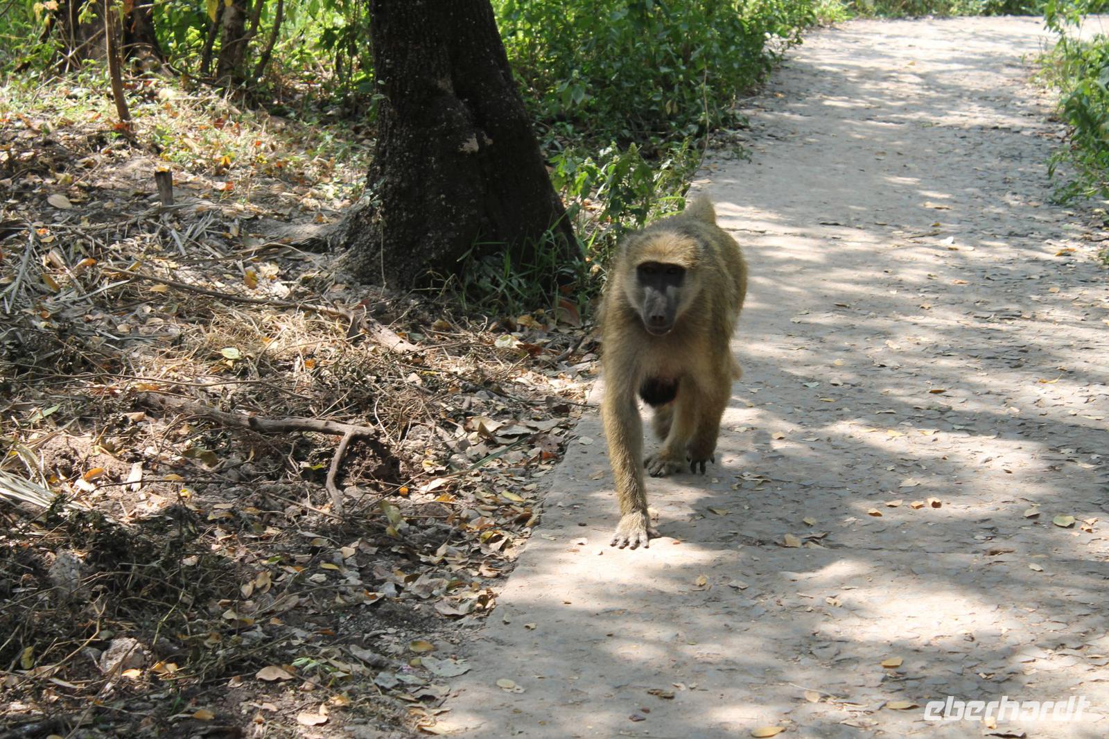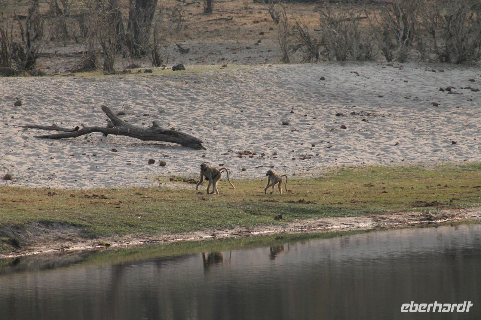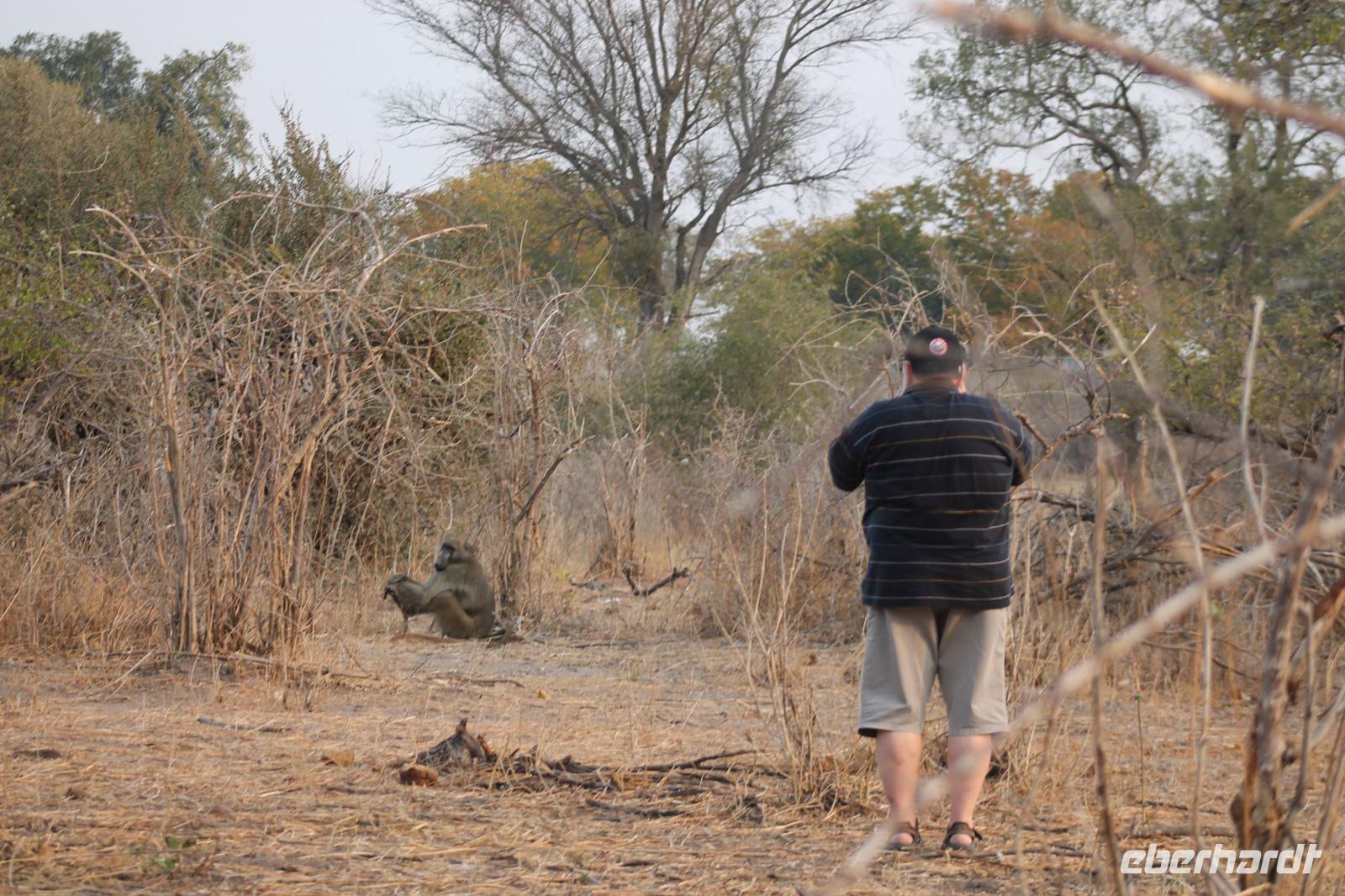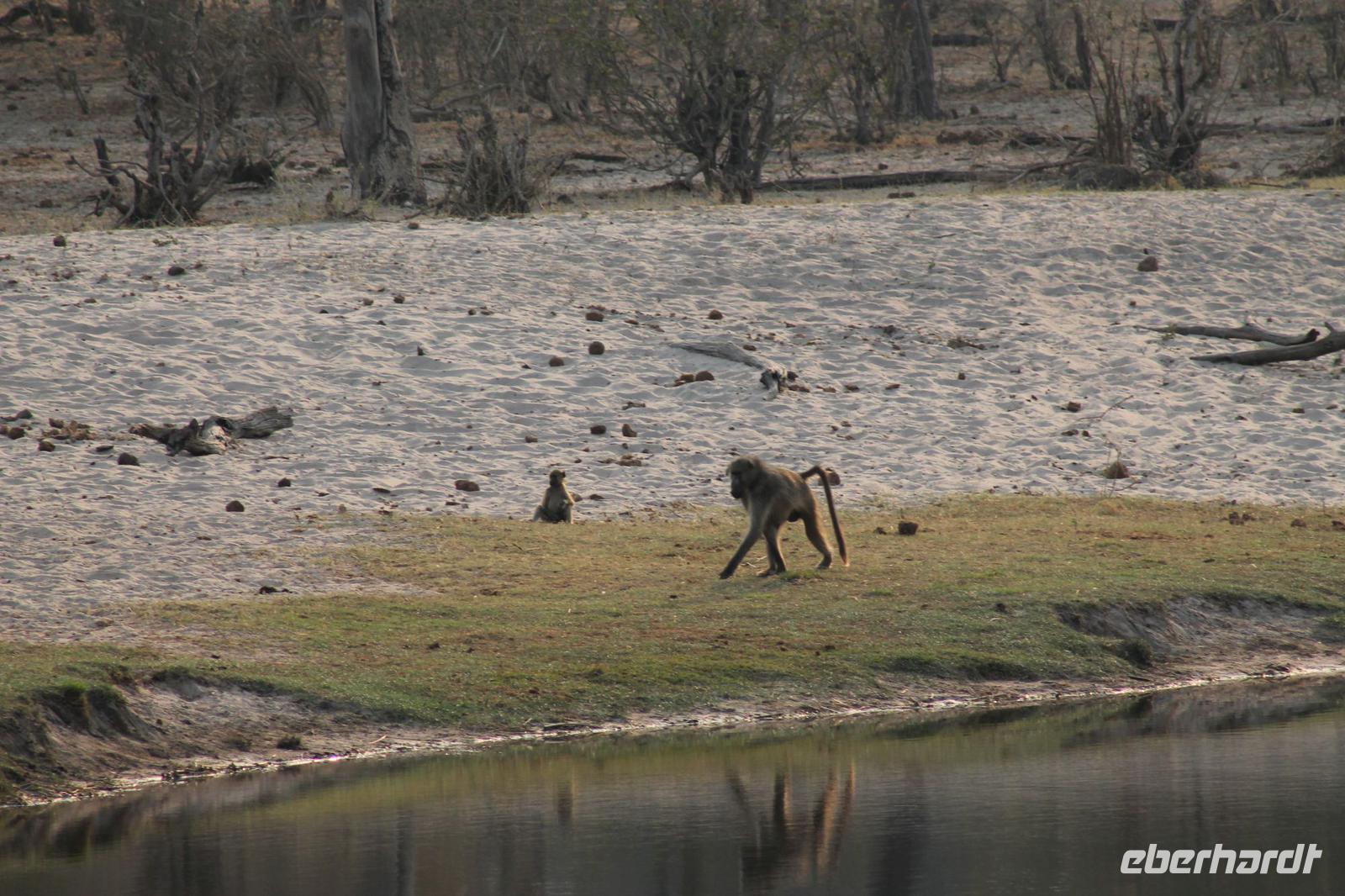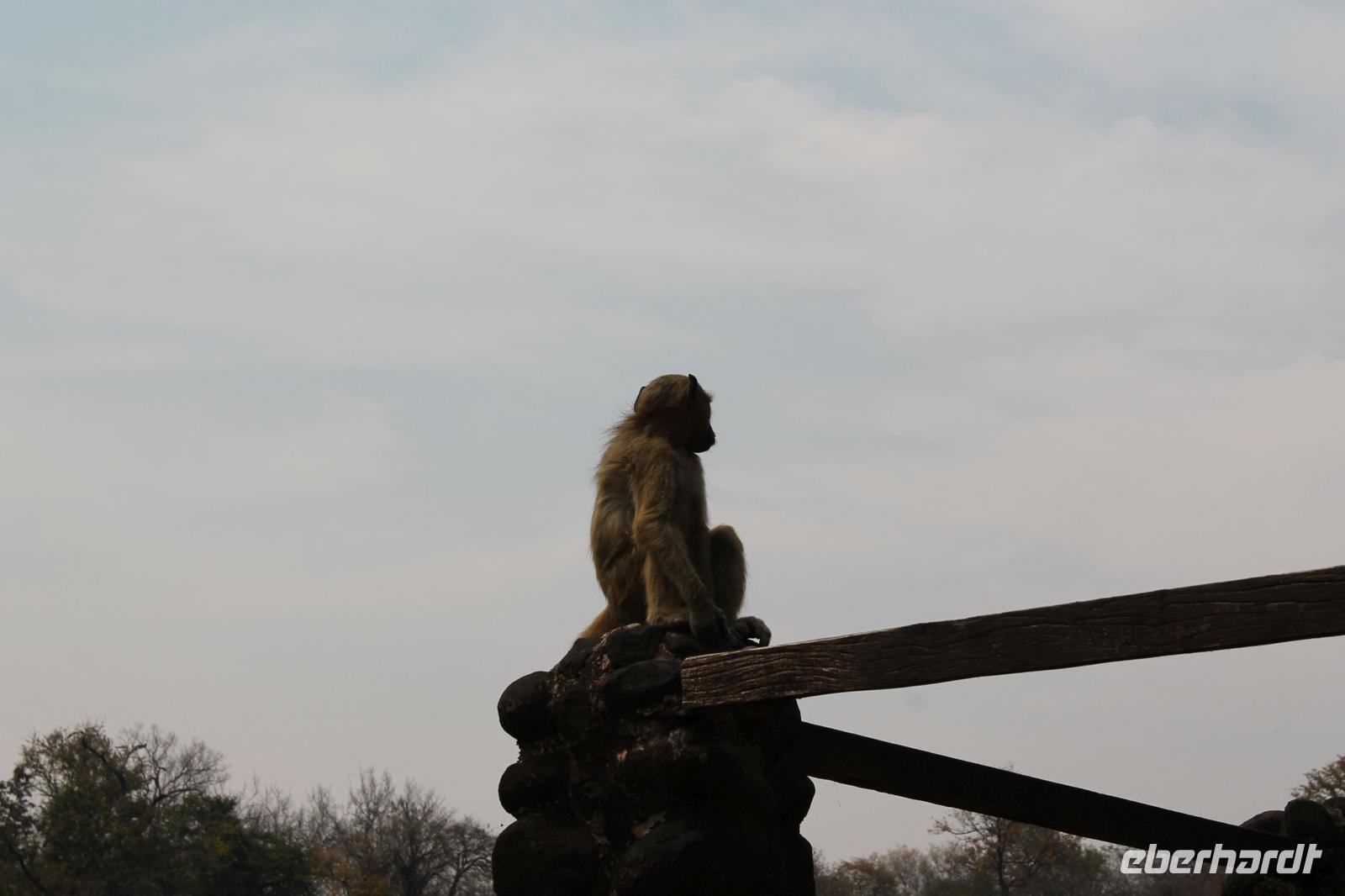 Am heutigen Morgen verlassen wir wieder Namibia und reisen zurück nach Botswana. Nach einem schmackhaften Frühstück und wieder einmal ausgefüllten Ausreiseformularen und bezahlten Rechnungen, fahren wir heute in Richtung Kasane. Auf unserem Weg sehen wir einige Hornraben, die hier sehr selten sind sowie Elefanten und einige Impalas. Außerdem halten wir kurz, um einige Kinder mit Schulheften und Stiften zu versorgen. Für diese Kinder ist der heutige Tag wie Weihnachten und wir können das Strahlen in Ihren Augen sehen. Nach einer längeren Fahrtstrecke erreichen wir letztendlich die Grenze Namibias. Hier zeigen wir unsere Pässe vor und geben unsere Formulare ab und erhalten wieder einen Stempel in unseren Pass. Anschließend erreichen wir das Niemandsland und genießen hier am Straßenrand unser leider letztes Picknick mit Pinky und Tom der Reise. So essen wir alle Reste auf und freuen uns, dass Tom für uns echtes deutsches Brot besorgt hat. Zumindest schmeckt es so. An diesem Platz können wir in der Weite auch Zebras und Elefanten beobachten. Mittlerweile hat die Sonne schon wieder eine Stärke von etwa 37 Grad. Der Wein schmeckt natürlich trotzdem noch. Alle nicht verwendeten Lebensmittel geben wir den Kindern am Straßenrand, die sich über diese Mahlzeit freuen. Mit unseren sieben Sachen fahren wir dann weiter zur botswanischen Grenze. Hier müssen wir durch eine Veterinärschleuse und unser zweites Paar Schuhe vorzeigen. Unser Bus wird ebenfalls kontrolliert aber wir sind „sauber". An der Grenze müssen wir Gott sei Dank nicht noch ein weiteres Formular ausfüllen und so reisen wir wieder ein nach Botswana. Kurze Zeit später sind wir bereits im Chobe-Nationalpark. Noch etwa 100 Kilometer sind wir hier von unserer Lodge in Kasane entfernt und spüren so die unheimliche Größe und Weite des Parks. Wir sehen einige Elefanten, denn nicht umsonst wird der Park auch als das „Land der Giganten" bezeichnet. Am Nachmittag erreichen wir unser wunderschön am Chobe Fluss gelegene luxuriöse Chobe Safari Lodge mitten im Park. Hier angekommen werden wir bereits herzlich von Meerkatzen, Pavianen, Zebramangusten und Warzenschweinen empfangen, die sich hier direkt in der Anlage tummeln und bereits unsere schönen Flusschalets belagern J Jeder von uns hat ein eigenes tolles Rundhäuschen mit einer hübschen Terrasse. Auch eine sehr gelungene Unterkunft. Den restlichen Nachmittag entspannen wir bei einem Kaffee in unseren Häuschen oder fotografieren das Getümmel der Affen am Fluss und im Garten. Wir genießen einfach die Zeit und hoffen insgeheim das diese nie zu Ende geht. Es wurde allerdings nicht beachtet, dass Vicky wieder das Chalet neben dem Fluss hat, wo sich nachts Hippos und Krokodile tummeln. Aber auch diese Nacht hat sie wieder überlebt J Am Abend genießen wir in gemütlicher Runde ein tolles abwechslungsreiches und riesiges Buffet in einer tollen Atmosphäre und gehen heute Abend früh zu Bett, da wir am nächsten Morgen eine zeitige ausgiebige Pirsch unternehmen.