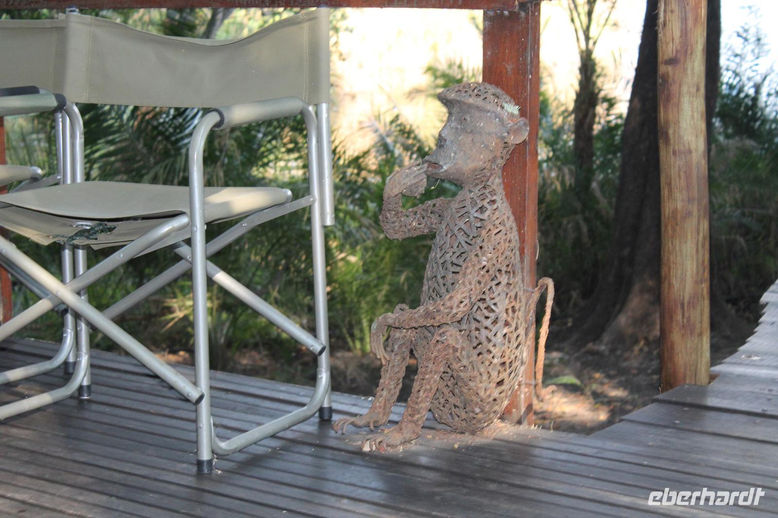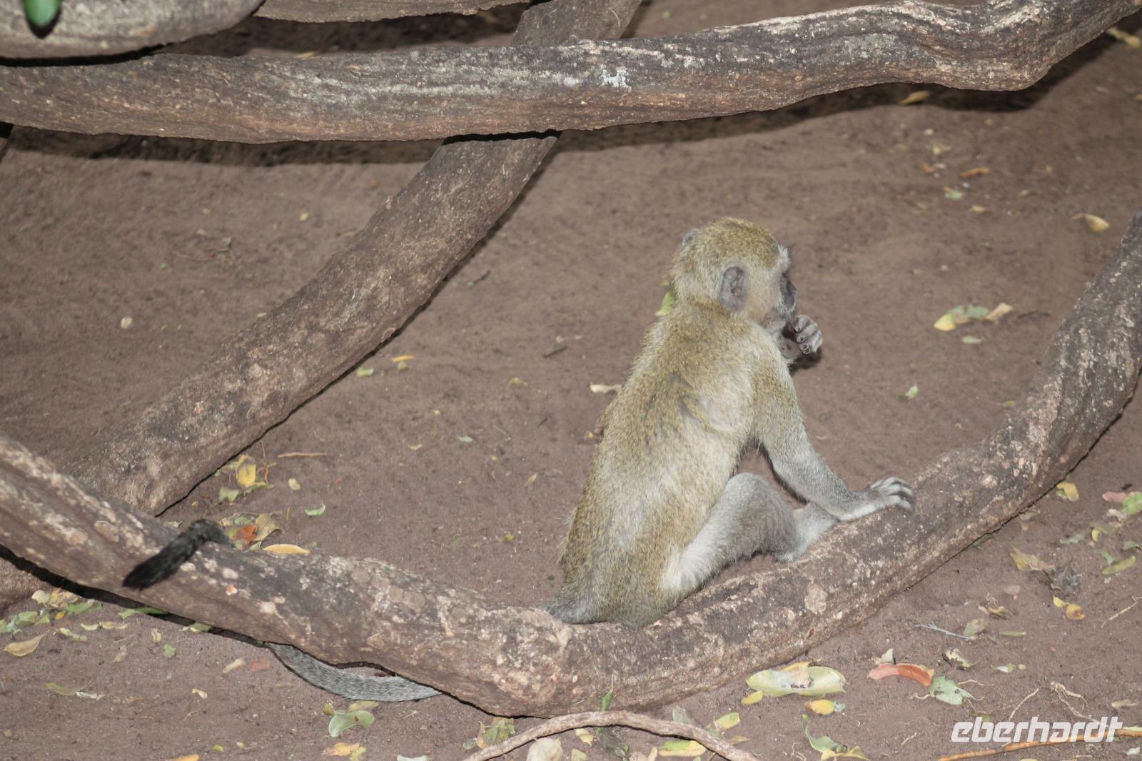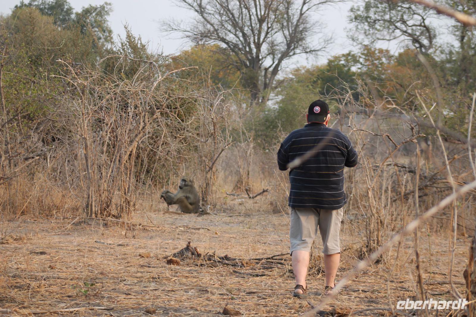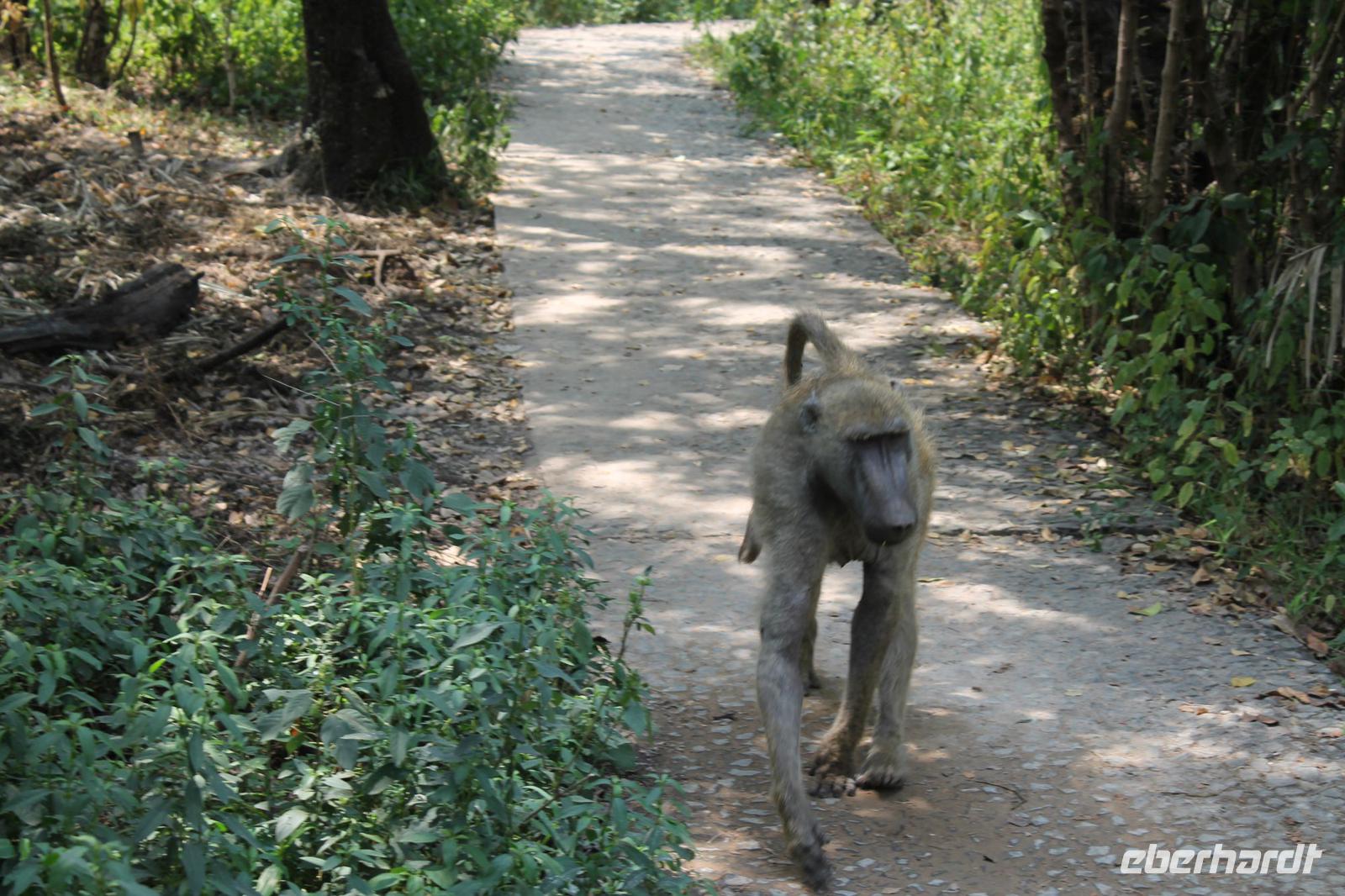Am heutigen Morgen verlassen wir wieder Namibia und reisen zurück nach Botswana. Nach einem schmackhaften Frühstück und wieder einmal ausgefüllten Ausreiseformularen und bezahlten Rechnungen, fahren wir heute in Richtung Kasane. Auf unserem Weg sehen wir einige Hornraben, die hier sehr selten sind sowie Elefanten und einige Impalas. Außerdem halten wir kurz, um einige Kinder mit Schulheften und Stiften zu versorgen. Für diese Kinder ist der heutige Tag wie Weihnachten und wir können das Strahlen in Ihren Augen sehen. Nach einer längeren Fahrtstrecke erreichen wir letztendlich die Grenze Namibias. Hier zeigen wir unsere Pässe vor und geben unsere Formulare ab und erhalten wieder einen Stempel in unseren Pass. Anschließend erreichen wir das Niemandsland und genießen hier am Straßenrand unser leider letztes Picknick mit Pinky und Tom der Reise. So essen wir alle Reste auf und freuen uns, dass Tom für uns echtes deutsches Brot besorgt hat. Zumindest schmeckt es so. An diesem Platz können wir in der Weite auch Zebras und Elefanten beobachten. Mittlerweile hat die Sonne schon wieder eine Stärke von etwa 37 Grad. Der Wein schmeckt natürlich trotzdem noch. Alle nicht verwendeten Lebensmittel geben wir den Kindern am Straßenrand, die sich über diese Mahlzeit freuen. Mit unseren sieben Sachen fahren wir dann weiter zur botswanischen Grenze. Hier müssen wir durch eine Veterinärschleuse und unser zweites Paar Schuhe vorzeigen. Unser Bus wird ebenfalls kontrolliert aber wir sind „sauber". An der Grenze müssen wir Gott sei Dank nicht noch ein weiteres Formular ausfüllen und so reisen wir wieder ein nach Botswana. Kurze Zeit später sind wir bereits im Chobe-Nationalpark. Noch etwa 100 Kilometer sind wir hier von unserer Lodge in Kasane entfernt und spüren so die unheimliche Größe und Weite des Parks. Wir sehen einige Elefanten, denn nicht umsonst wird der Park auch als das „Land der Giganten" bezeichnet. Am Nachmittag erreichen wir unser wunderschön am Chobe Fluss gelegene luxuriöse Chobe Safari Lodge mitten im Park. Hier angekommen werden wir bereits herzlich von Meerkatzen, Pavianen, Zebramangusten und Warzenschweinen empfangen, die sich hier direkt in der Anlage tummeln und bereits unsere schönen Flusschalets belagern J Jeder von uns hat ein eigenes tolles Rundhäuschen mit einer hübschen Terrasse. Auch eine sehr gelungene Unterkunft. Den restlichen Nachmittag entspannen wir bei einem Kaffee in unseren Häuschen oder fotografieren das Getümmel der Affen am Fluss und im Garten. Wir genießen einfach die Zeit und hoffen insgeheim das diese nie zu Ende geht. Es wurde allerdings nicht beachtet, dass Vicky wieder das Chalet neben dem Fluss hat, wo sich nachts Hippos und Krokodile tummeln. Aber auch diese Nacht hat sie wieder überlebt J Am Abend genießen wir in gemütlicher Runde ein tolles abwechslungsreiches und riesiges Buffet in einer tollen Atmosphäre und gehen heute Abend früh zu Bett, da wir am nächsten Morgen eine zeitige ausgiebige Pirsch unternehmen.