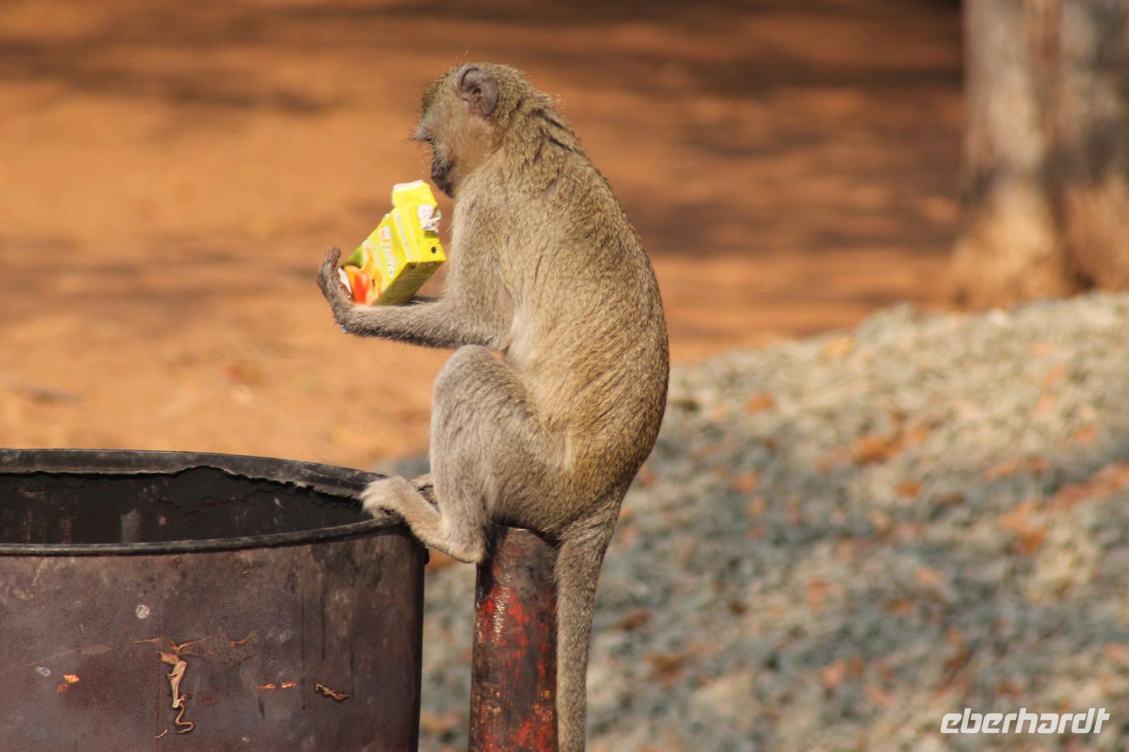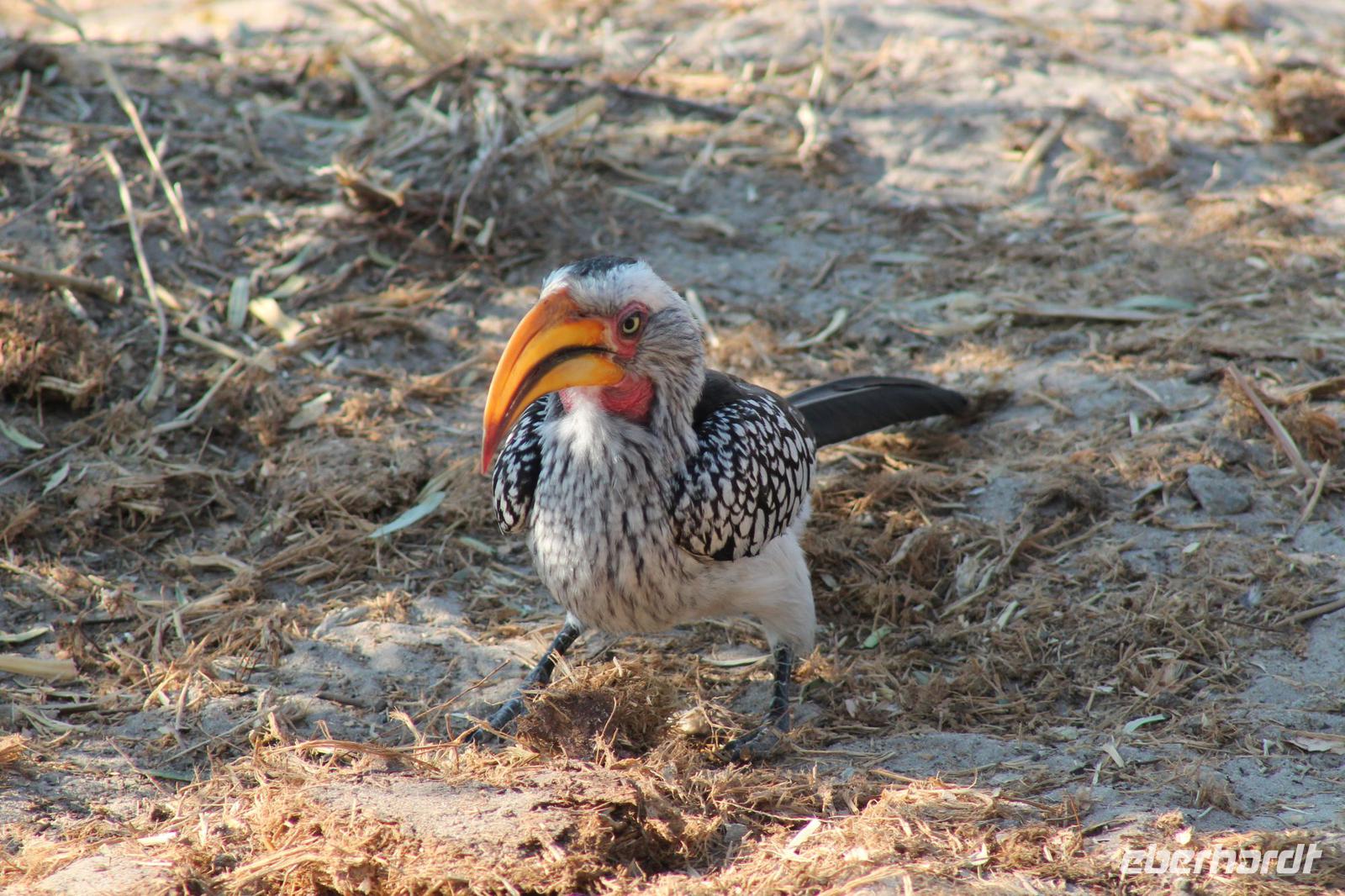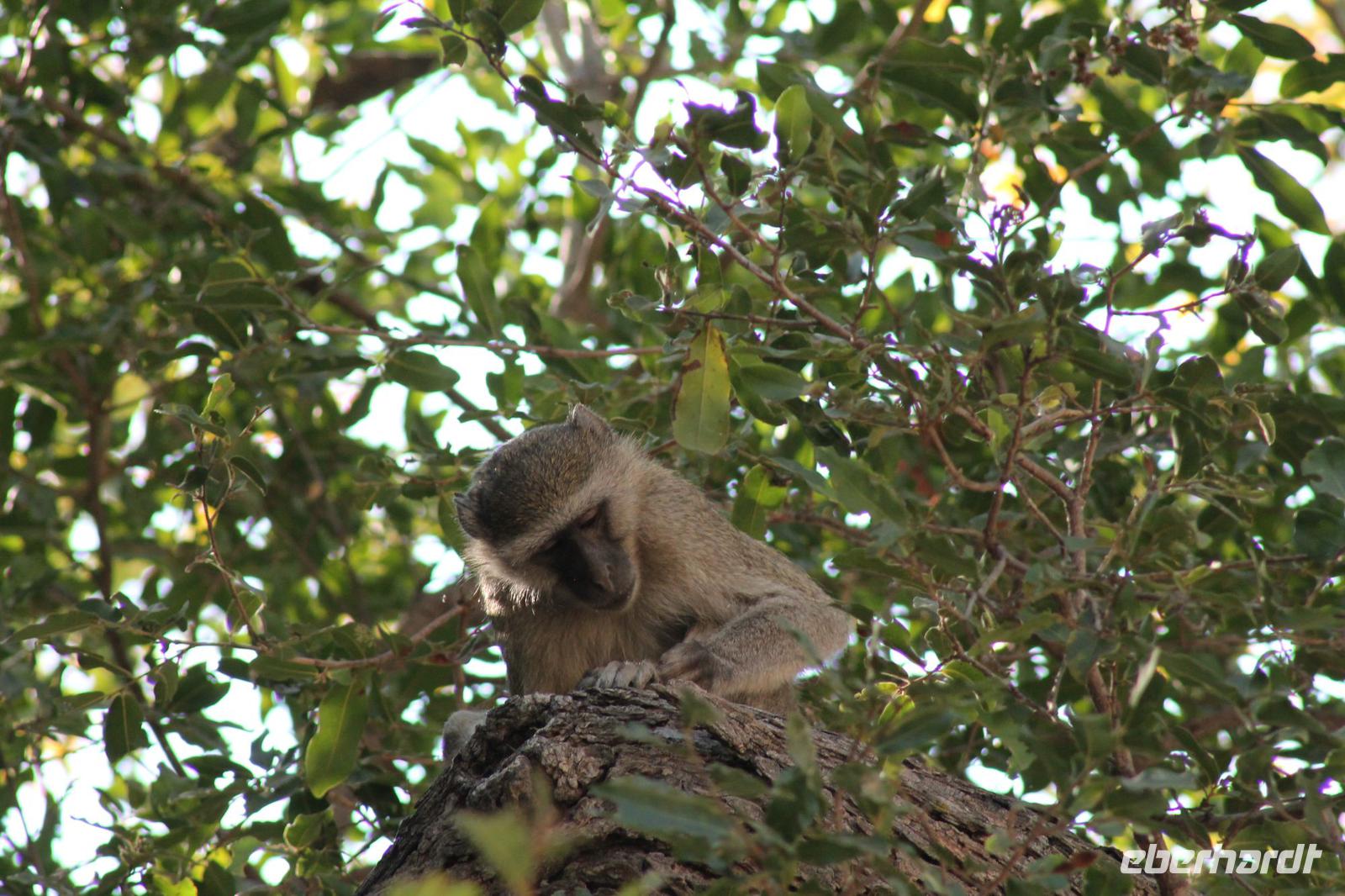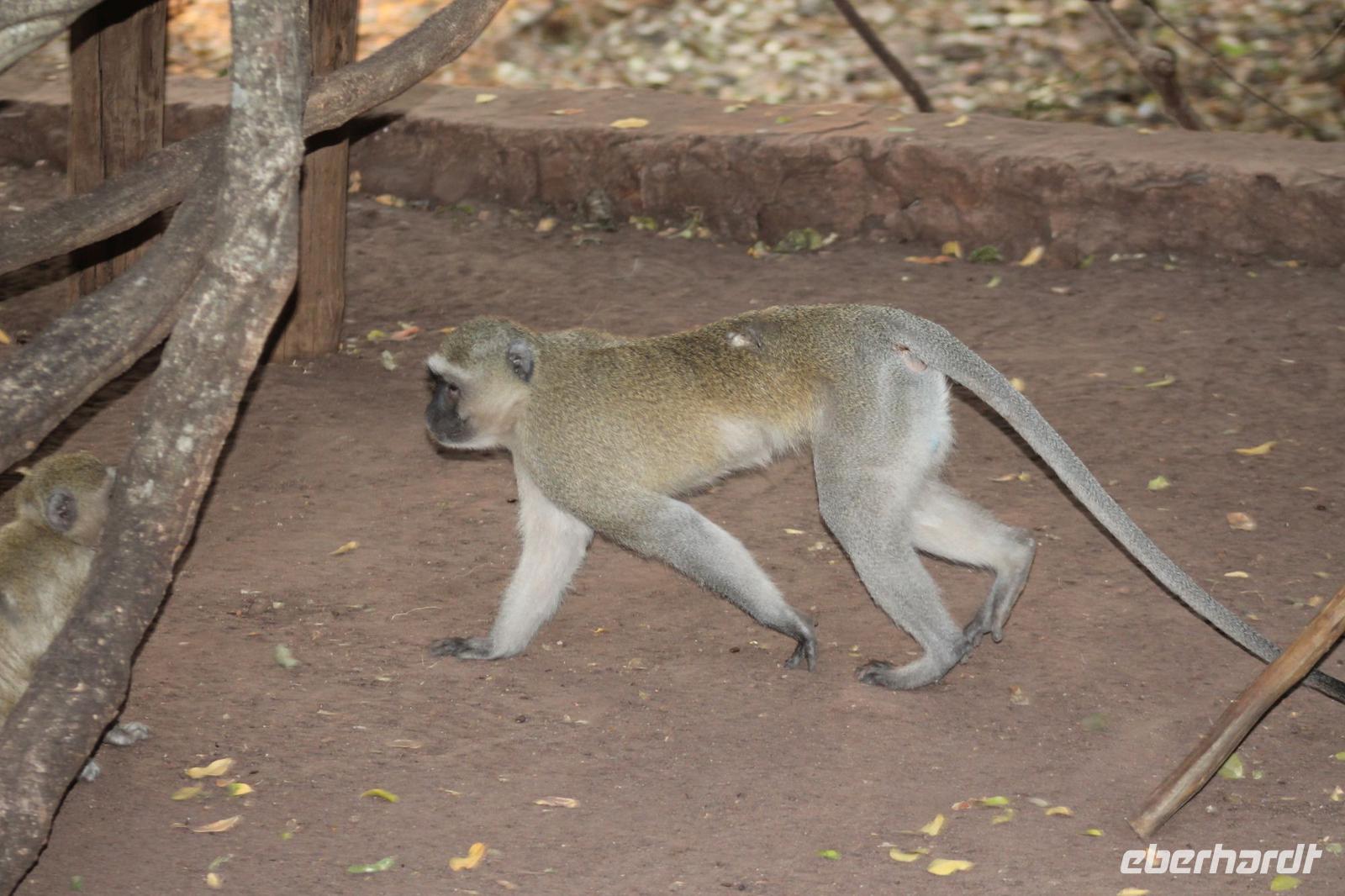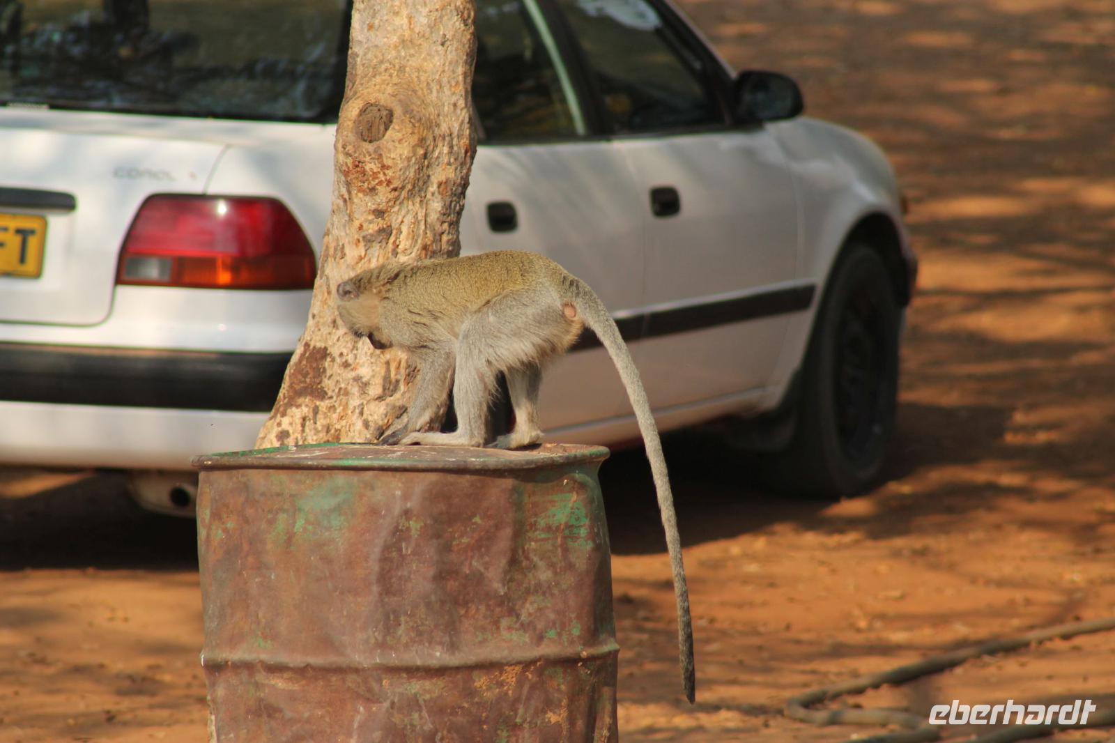 Am heutigen Morgen verlassen wir wieder Namibia und reisen zurück nach Botswana. Nach einem schmackhaften Frühstück und wieder einmal ausgefüllten Ausreiseformularen und bezahlten Rechnungen, fahren wir heute in Richtung Kasane. Auf unserem Weg sehen wir einige Hornraben, die hier sehr selten sind sowie Elefanten und einige Impalas. Außerdem halten wir kurz, um einige Kinder mit Schulheften und Stiften zu versorgen. Für diese Kinder ist der heutige Tag wie Weihnachten und wir können das Strahlen in Ihren Augen sehen. Nach einer längeren Fahrtstrecke erreichen wir letztendlich die Grenze Namibias. Hier zeigen wir unsere Pässe vor und geben unsere Formulare ab und erhalten wieder einen Stempel in unseren Pass. Anschließend erreichen wir das Niemandsland und genießen hier am Straßenrand unser leider letztes Picknick mit Pinky und Tom der Reise. So essen wir alle Reste auf und freuen uns, dass Tom für uns echtes deutsches Brot besorgt hat. Zumindest schmeckt es so. An diesem Platz können wir in der Weite auch Zebras und Elefanten beobachten. Mittlerweile hat die Sonne schon wieder eine Stärke von etwa 37 Grad. Der Wein schmeckt natürlich trotzdem noch. Alle nicht verwendeten Lebensmittel geben wir den Kindern am Straßenrand, die sich über diese Mahlzeit freuen. Mit unseren sieben Sachen fahren wir dann weiter zur botswanischen Grenze. Hier müssen wir durch eine Veterinärschleuse und unser zweites Paar Schuhe vorzeigen. Unser Bus wird ebenfalls kontrolliert aber wir sind „sauber". An der Grenze müssen wir Gott sei Dank nicht noch ein weiteres Formular ausfüllen und so reisen wir wieder ein nach Botswana. Kurze Zeit später sind wir bereits im Chobe-Nationalpark. Noch etwa 100 Kilometer sind wir hier von unserer Lodge in Kasane entfernt und spüren so die unheimliche Größe und Weite des Parks. Wir sehen einige Elefanten, denn nicht umsonst wird der Park auch als das „Land der Giganten" bezeichnet. Am Nachmittag erreichen wir unser wunderschön am Chobe Fluss gelegene luxuriöse Chobe Safari Lodge mitten im Park. Hier angekommen werden wir bereits herzlich von Meerkatzen, Pavianen, Zebramangusten und Warzenschweinen empfangen, die sich hier direkt in der Anlage tummeln und bereits unsere schönen Flusschalets belagern J Jeder von uns hat ein eigenes tolles Rundhäuschen mit einer hübschen Terrasse. Auch eine sehr gelungene Unterkunft. Den restlichen Nachmittag entspannen wir bei einem Kaffee in unseren Häuschen oder fotografieren das Getümmel der Affen am Fluss und im Garten. Wir genießen einfach die Zeit und hoffen insgeheim das diese nie zu Ende geht. Es wurde allerdings nicht beachtet, dass Vicky wieder das Chalet neben dem Fluss hat, wo sich nachts Hippos und Krokodile tummeln. Aber auch diese Nacht hat sie wieder überlebt J Am Abend genießen wir in gemütlicher Runde ein tolles abwechslungsreiches und riesiges Buffet in einer tollen Atmosphäre und gehen heute Abend früh zu Bett, da wir am nächsten Morgen eine zeitige ausgiebige Pirsch unternehmen.