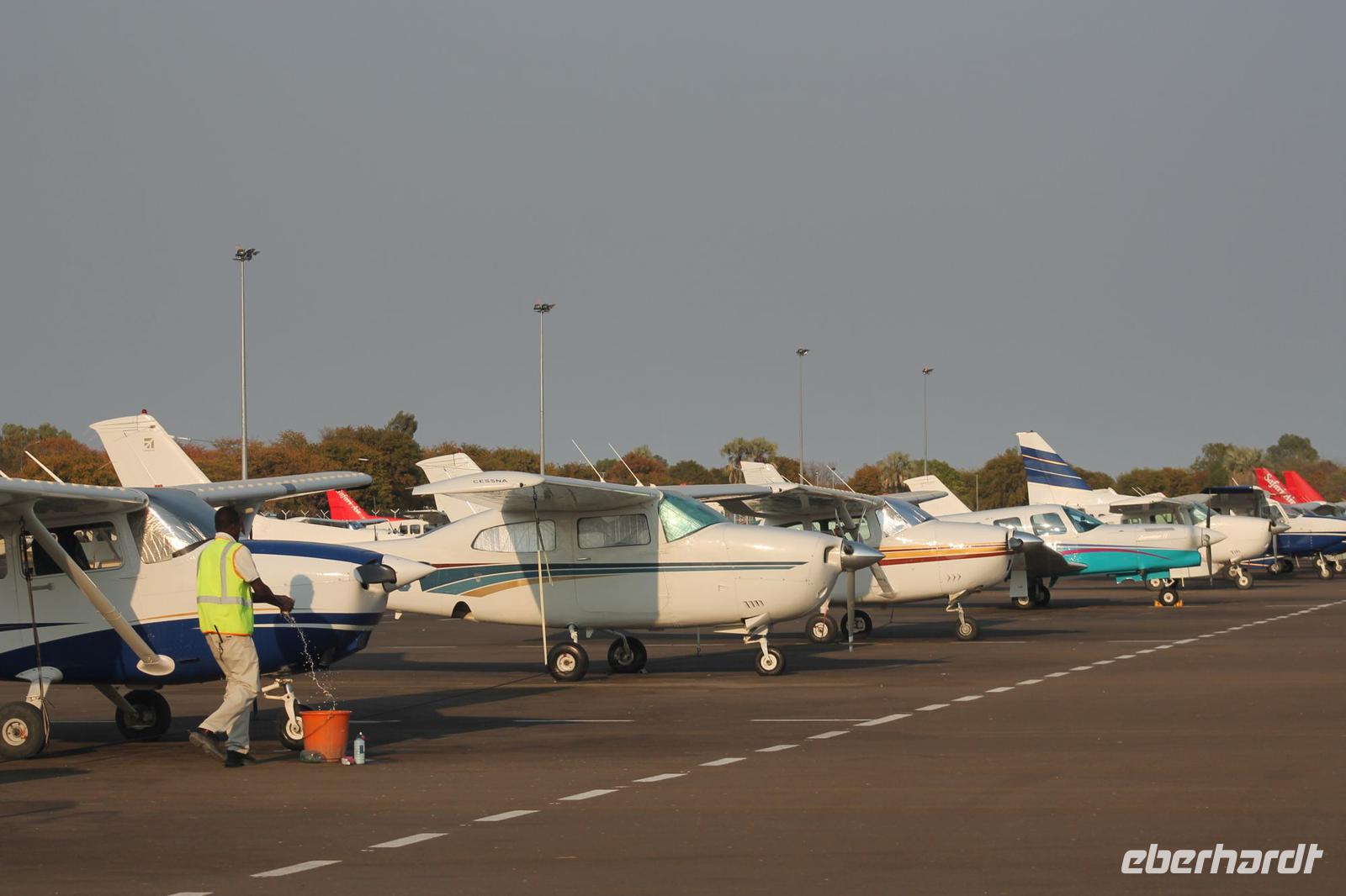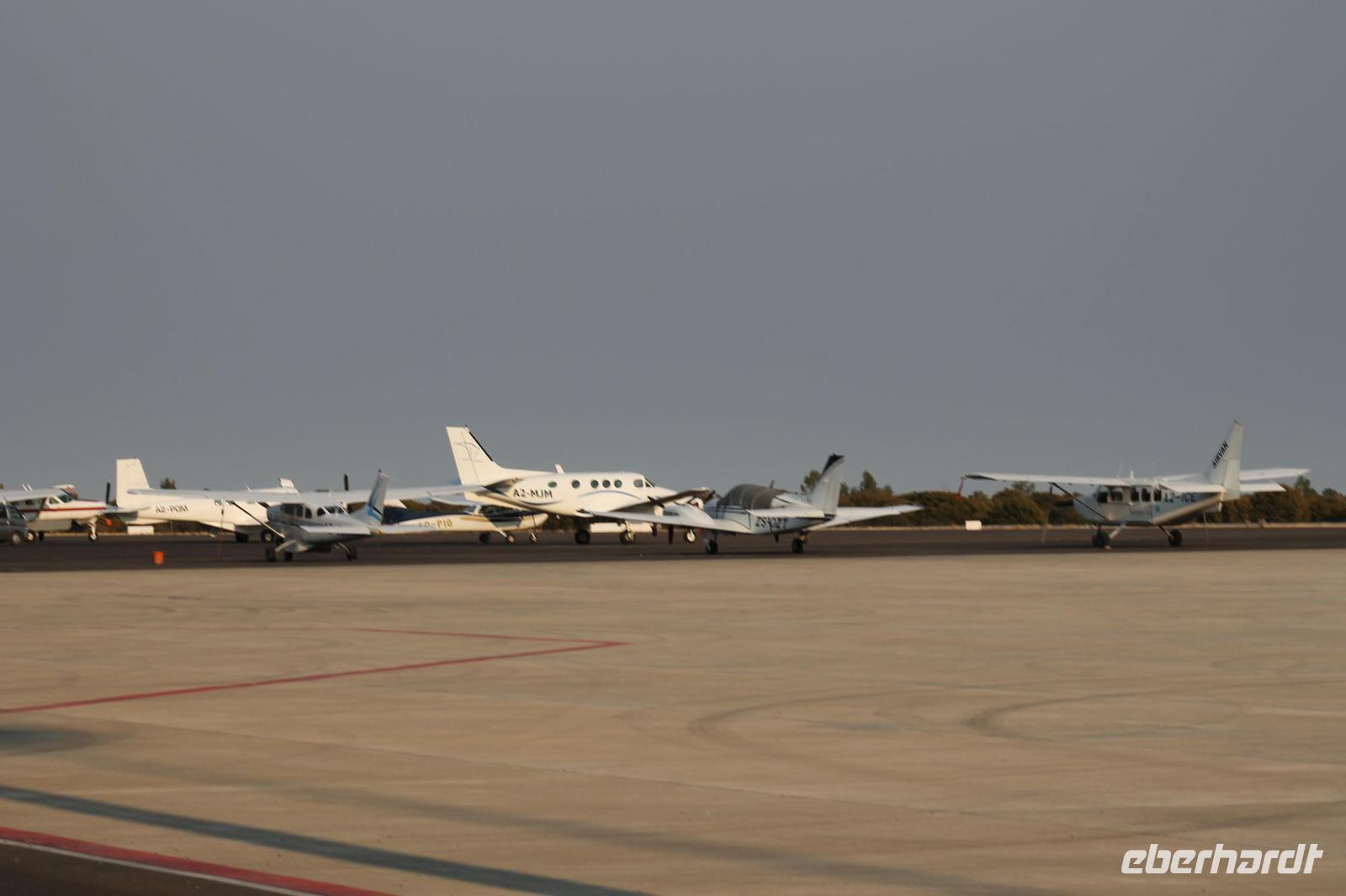 Einige von uns, die „Nichtflieger", müssen heute schon sehr zeitig aufstehen, denn Sie fahren bereits um 06:00 Uhr gemeinsam mit Tom, zwei Jeeps und zwei Rangern in Richtung Okavenga-Delta. Für eine Marschverpflegung ist natürlich gesorgt. Wie wir später erfahren war der Weh sehr beschwerlich und durch die doch etwas kalten Temperaturen nicht gerade einfach, aber Sie hatten in jedem Fall Ihren Spaß und haben auch einige Tiere unterwegs gesehen. Alle anderen treffen sich um 06:30 Uhr zum Frühstück und fahren anschließend mit Chris und Vicky zum nationalen Flughafen von Maun. Hier angekommen und freundlich von Kühen empfangen, erhalten wir mit unseren Reisepässen unsere Flugtickets und begeben uns anschließend mit unserem Piloten zur Sicherheitskontrolle für unseren 45-minütigen Flug über das Delta. Die Taschen sind schnell kontrolliert und so fliegen wir gegen 08:00 Uhr über das Delta, ein einmaliges Erlebnis. Alle Gäste haben einen Fensterplatz und so können wir vorbeiziehende Tiere wie Elefanten, Giraffen und Hippos sowie die Schönheit des Deltas aus der Luft betrachten. Unser „hübscher" Pilot bringt uns sicher zu unserem Landeplatz, wo wir von den „Durchgefrorenen Talibanen" schon erwartet werden. Wir genießen noch einen Kaffee oder Tee bevor wir zur gemeinsamen Pirsch durch das Moremi Reservat starten. Wir erkunden den Park in zwei Teams. Auf unserem Weg sehen wir einige Giraffen, Impalas und ein paar Kudus. Die andere Gruppe hat soviel Glück und sieht sogar einen Leoparden aus nächster Nähe. An einem schattigen Plätzchen unter einem Baum machte es sich der zu den „Big Five" gehörende Gefährte gemütlich und setzte zur Jagd an. Auch sein Baby sah man kurze Zeit später über das Buschfeld spazieren und so kommen einige Gäste den „Big Five" immer näher. Aber wir sagt man so schön: Abgerechnet wird immer zum Schluss. Leider sah die andere Gruppe den Leopard nicht, aber noch ist nicht aller Tage Abend. Gemeinsam „pirschen" wir weiter und sehen kurze Zeit später viele Giraffen, Zebras und am Wasser sogar unzählige Hippos und viele Elefanten. Auch den seltenen Sattelstorch und Hammerkopf sehen wir. Schon jetzt wieder ein gelungener Tag. Unser Picknick nehmen wir inmitten des Reservats ein und genießen wunderbaren Salat, Brötchen mit Wurst und Käse und viele andere kleine Köstlichkeiten. Wir sehnen auch einige Affen, die sich auf dem Baum über uns tummeln und uns ständig beobachten. Nach einer Stärkung fahren wir noch ein wenig durch den Park vor allem auf der Suche nach Löwen, die hier auch zu Hause sind. Leider sehen wir diese nicht. Die andere Gruppe nutzt in der Zwischenzeit die Gelegenheit um ein Löwenbild zu bekommen, welches nicht der Wahrheit entspricht, aber täuschend echt aussah. So glaubten wir, dass Sie heute Leopard und Löwe gesehen haben. Später stellte sich allerdings heraus, dass Tom keine Versuchung auslässt um uns auf den „Arm" zu nehmen und so stellten wir erst später fest, dass dieser Löwe nur abfotografiert war. Aber eine Revanche wird sicher folgen J Nach einer atemberaubenden Pirsch treten wir am späten Nachmittag unsere Heimreise in Richtung Maun an. 100 Kilometer Schotterpiste im offenen Fahrzeug erwarten uns. Eingemummelt machen wir uns auf den Weg und erreichen ein paar Rückenschmerzen später wieder unsere „Maun Lodge". Die Fahrer haben Ihren Job heute fantastisch gemacht und werden auch entsprechend belohnt. Nach so vielen Eindrücken, genießen wir wieder ein tolles Abendessen vom Buffet und freuen uns auf den nächsten Tag. Außerdem erfahren wir, was sich den Nachttischen der Mitreisenden befindet und was man in Hotelzimmern noch so alles vorfinden kann.