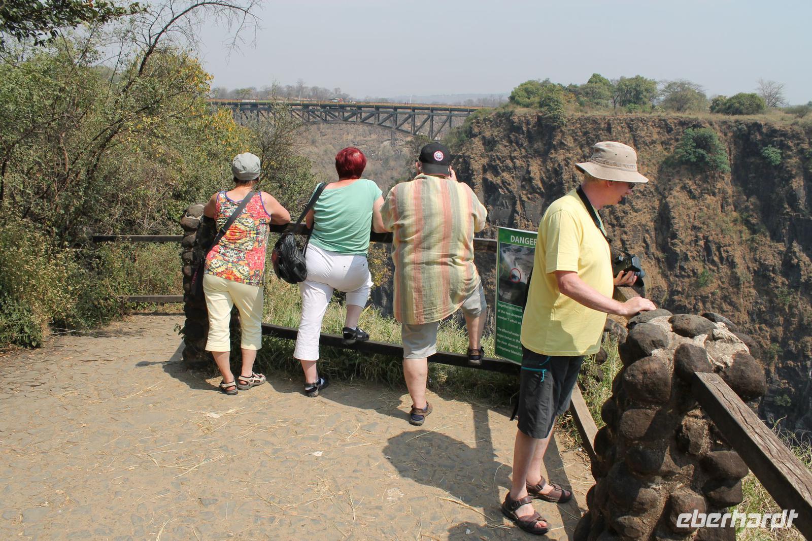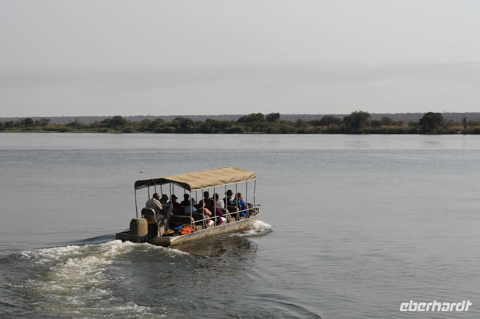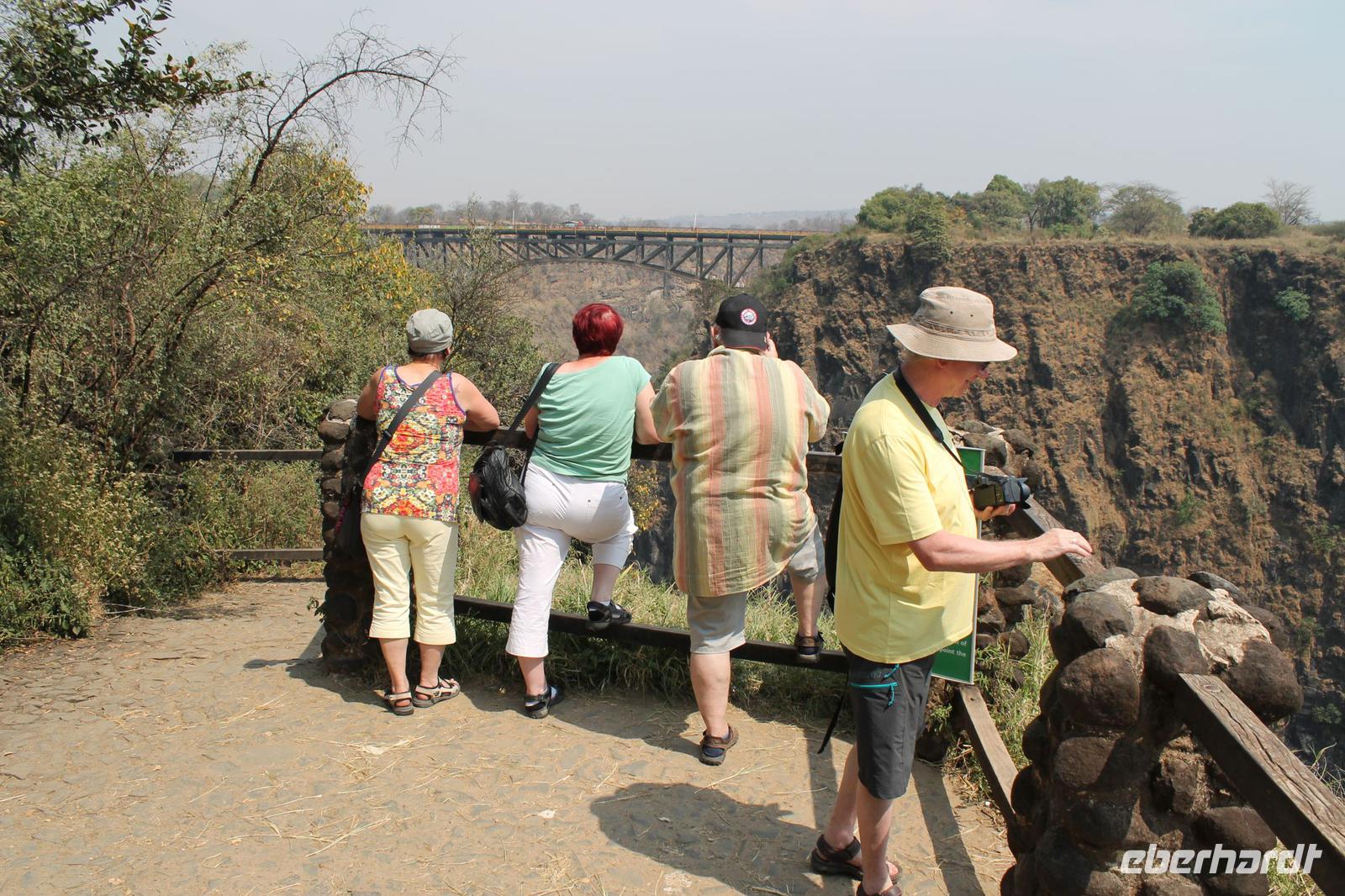 Heute nehmen wir Abschied von unserer schönen Chobe Safari Lodge und reisen weiter zu unserer leider letzten Etappe nach Sambia. Mit all unseren sieben Sachen steigen wir ein letztes Mal in unseren schönen Safari Truck, der uns während unserer langen Reise überall sicher und komfortabel hingebracht hat. Jeder Gast erhält heute außerdem je 50 US Dollar. Diese brauchen wir für die Einreise nach Sambia. Gott sei Dank hat niemand die Dollar vorher ausgegeben sondern siicher im Gepäck verstaut. Zunächst reisen wir aus Botswana aus und erhalten wieder einen Stempel ins unseren Pass. Dann bringt uns Chris zur Grenze nach Sambia. Hier verabschieden wir uns herzlich und nehmen unseren „Pinky" noch einmal in den Arm. Es war einfach eine tolle Zeit. Die ersten Gäste fahren bereits mit dem Boot zur anderen Seite, bevor alle anderen, Vicky und auch das Gepäck schließlich auch an der anderen Seite ankommen. Hier steigen wir in einen Minibus um während Tom mit unseren Pässen und den je 50 US Dollar darin verschwindet. Aber wir haben Vertrauen und so dauert es nicht lange bis er zu uns mit einem frischen Sambia Stempel zurückkommt. Wir erfahren, dass er dort allerhand Schriftkram ausfüllen musste und so einige von uns neue Berufe annehmen mussten wie Bombenleger oder Hausfrau J Danach fahren wir zunächst etwa eine Stunde zu einem Aktivitätencenter in Livingstone. Hier werden uns in einem kurzen Film, die Aktivitäten vorgestellt, die wir hier machen können. Einige Gäste und Vicky entscheiden sich für den morgendlichen Spaziergang mit Löwen und wieder andere von uns buchen nur den Helikopter Flug über die Fälle. Nach diesem Besuch sind wir arm und fahren weiter zu unserem schönen Hotel „Zambezi Sun" direkt an den Victoria-Wasserfällen gelegen. Hier angekommen tut sich leider ein kleines Missverständnis auf, so dass wir bis zum Zimmerbezug zwei Stunden warten müssen. Aber am Ende haben wir die Zeit doch rumbekommen und einige haben sich das gegenüberliegende Luxushotel der 5-Sterne-Kategorie „Royal Livingston" angesehen und noch ein Getränk genossen. Nach langem Hin und Her und einer Überbuchung sollten wir erst hier untergebracht werden, aber dann hatte das „Zambezi Sun" doch Platz für uns. Alles war ein bisschen chaotisch aber am Ende bekamen wir doch wunderbare Zimmer. Am Nachmittag treffen wir uns wieder und Tom nimmt uns mit auf einen kurzen Spaziergang zu den Fällen. Dank unserer Hotelkarte haben wir jederzeit uneingeschränkten Zugang zu den Wasserfällen. Tom erklärt uns etwas zu den Fällen und wir unternehmen einen kleinen Spaziergang und schießen unseren ersten Fotos. Später spazieren wir noch gemeinsam zum Markt. Hier gibt es alles was das Herz begehrt und wir sind froh, dass Tom den ein oder anderen „Deal" für uns aushandeln kann. Hier kann man in allen Währungen bezahlen die es auf der Welt gibt. Viele kaufen Giraffen aus Holz oder andere afrikanische Schnitzereien wie die „Big Five". Auch Vicky kauft etwas für die noch anstehenden Geburtstage in den nächsten zwei Tagen und so waren alle erfolgreich auch wenn die Händler ganz schön aufdringlich waren. Jeder spaziert anschließend individuell zum Hotel zurück und viele genießen nach dem doch etwas anstrengendem Tag ein kühles Bier an der Bar. Tom und Vicky reservieren in der Zwischenzeit unser Restaurant für den heutigen Abend, damit wir die letzten beiden Tage doch alle noch einmal zusammen essen können. Hier genießen wir dann ein tolles Abendessen à la carte und sind froh, dass wir hier in US Dollar bezahlen können. So bleibt uns der Umtausch in die Landeswährung Kwacha erspart. So verbringen wir die heutige Nacht in Sambia.