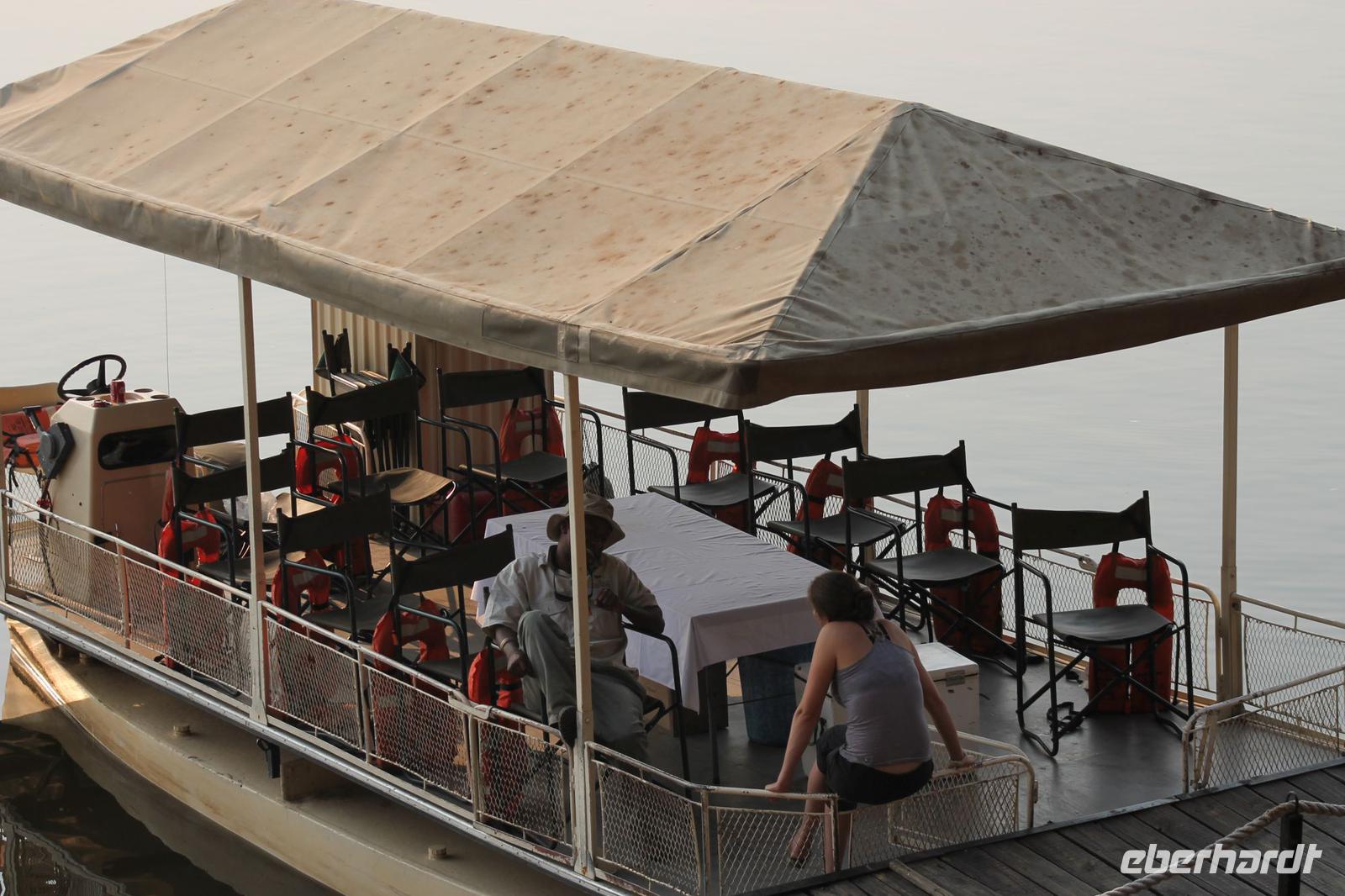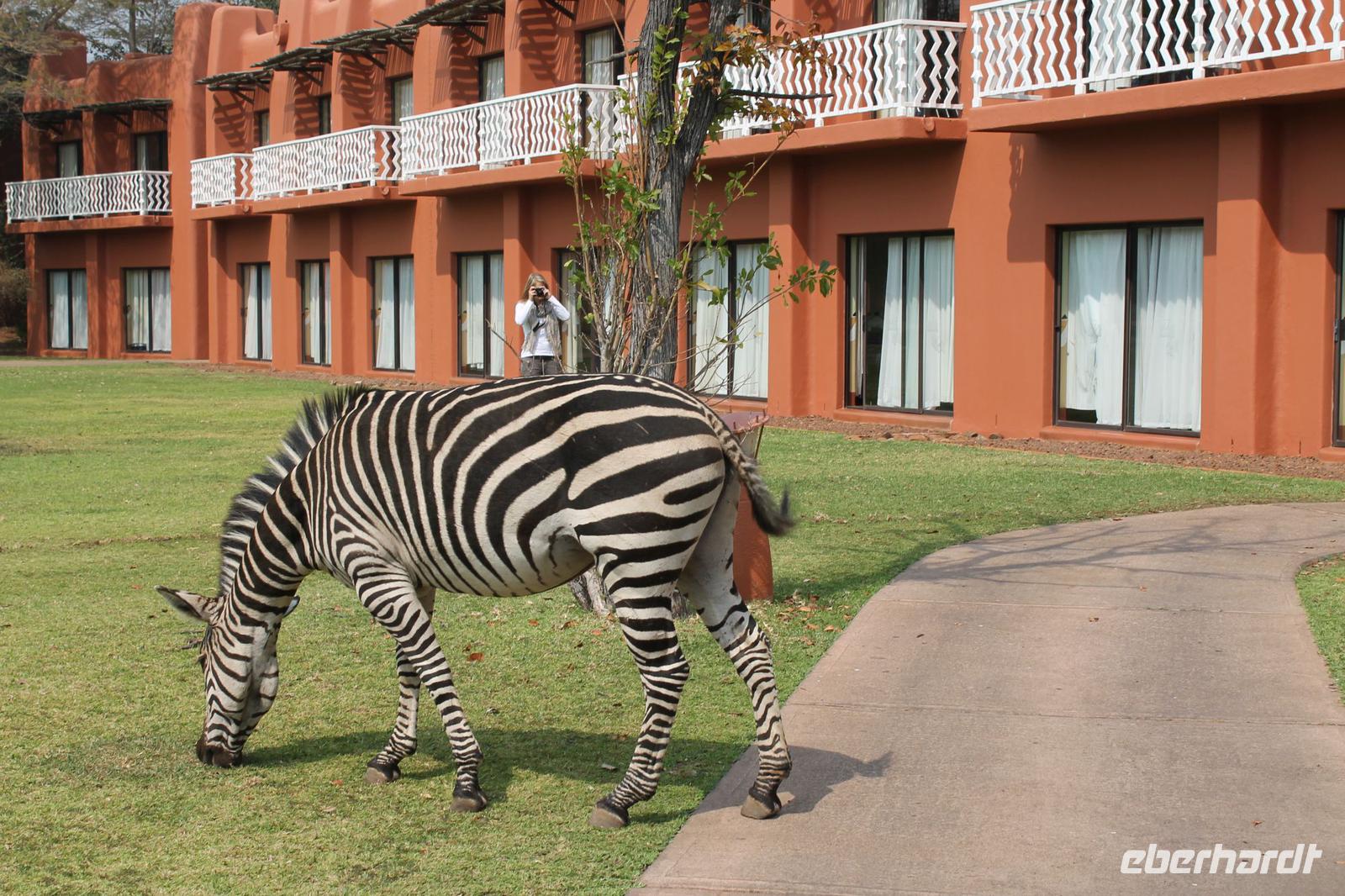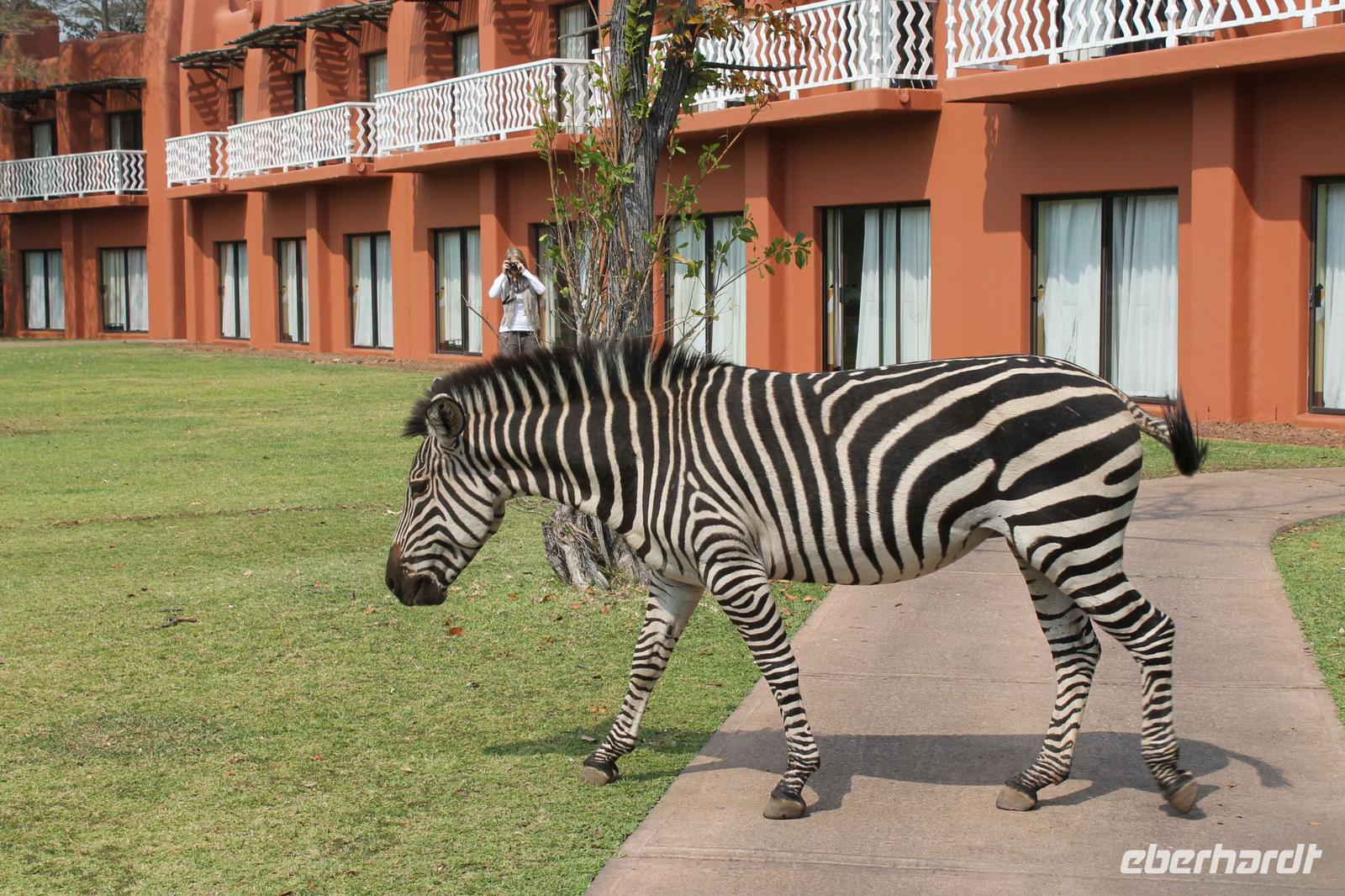 Heute nehmen wir Abschied von unserer schönen Chobe Safari Lodge und reisen weiter zu unserer leider letzten Etappe nach Sambia. Mit all unseren sieben Sachen steigen wir ein letztes Mal in unseren schönen Safari Truck, der uns während unserer langen Reise überall sicher und komfortabel hingebracht hat. Jeder Gast erhält heute außerdem je 50 US Dollar. Diese brauchen wir für die Einreise nach Sambia. Gott sei Dank hat niemand die Dollar vorher ausgegeben sondern siicher im Gepäck verstaut. Zunächst reisen wir aus Botswana aus und erhalten wieder einen Stempel ins unseren Pass. Dann bringt uns Chris zur Grenze nach Sambia. Hier verabschieden wir uns herzlich und nehmen unseren „Pinky" noch einmal in den Arm. Es war einfach eine tolle Zeit. Die ersten Gäste fahren bereits mit dem Boot zur anderen Seite, bevor alle anderen, Vicky und auch das Gepäck schließlich auch an der anderen Seite ankommen. Hier steigen wir in einen Minibus um während Tom mit unseren Pässen und den je 50 US Dollar darin verschwindet. Aber wir haben Vertrauen und so dauert es nicht lange bis er zu uns mit einem frischen Sambia Stempel zurückkommt. Wir erfahren, dass er dort allerhand Schriftkram ausfüllen musste und so einige von uns neue Berufe annehmen mussten wie Bombenleger oder Hausfrau J Danach fahren wir zunächst etwa eine Stunde zu einem Aktivitätencenter in Livingstone. Hier werden uns in einem kurzen Film, die Aktivitäten vorgestellt, die wir hier machen können. Einige Gäste und Vicky entscheiden sich für den morgendlichen Spaziergang mit Löwen und wieder andere von uns buchen nur den Helikopter Flug über die Fälle. Nach diesem Besuch sind wir arm und fahren weiter zu unserem schönen Hotel „Zambezi Sun" direkt an den Victoria-Wasserfällen gelegen. Hier angekommen tut sich leider ein kleines Missverständnis auf, so dass wir bis zum Zimmerbezug zwei Stunden warten müssen. Aber am Ende haben wir die Zeit doch rumbekommen und einige haben sich das gegenüberliegende Luxushotel der 5-Sterne-Kategorie „Royal Livingston" angesehen und noch ein Getränk genossen. Nach langem Hin und Her und einer Überbuchung sollten wir erst hier untergebracht werden, aber dann hatte das „Zambezi Sun" doch Platz für uns. Alles war ein bisschen chaotisch aber am Ende bekamen wir doch wunderbare Zimmer. Am Nachmittag treffen wir uns wieder und Tom nimmt uns mit auf einen kurzen Spaziergang zu den Fällen. Dank unserer Hotelkarte haben wir jederzeit uneingeschränkten Zugang zu den Wasserfällen. Tom erklärt uns etwas zu den Fällen und wir unternehmen einen kleinen Spaziergang und schießen unseren ersten Fotos. Später spazieren wir noch gemeinsam zum Markt. Hier gibt es alles was das Herz begehrt und wir sind froh, dass Tom den ein oder anderen „Deal" für uns aushandeln kann. Hier kann man in allen Währungen bezahlen die es auf der Welt gibt. Viele kaufen Giraffen aus Holz oder andere afrikanische Schnitzereien wie die „Big Five". Auch Vicky kauft etwas für die noch anstehenden Geburtstage in den nächsten zwei Tagen und so waren alle erfolgreich auch wenn die Händler ganz schön aufdringlich waren. Jeder spaziert anschließend individuell zum Hotel zurück und viele genießen nach dem doch etwas anstrengendem Tag ein kühles Bier an der Bar. Tom und Vicky reservieren in der Zwischenzeit unser Restaurant für den heutigen Abend, damit wir die letzten beiden Tage doch alle noch einmal zusammen essen können. Hier genießen wir dann ein tolles Abendessen à la carte und sind froh, dass wir hier in US Dollar bezahlen können. So bleibt uns der Umtausch in die Landeswährung Kwacha erspart. So verbringen wir die heutige Nacht in Sambia.