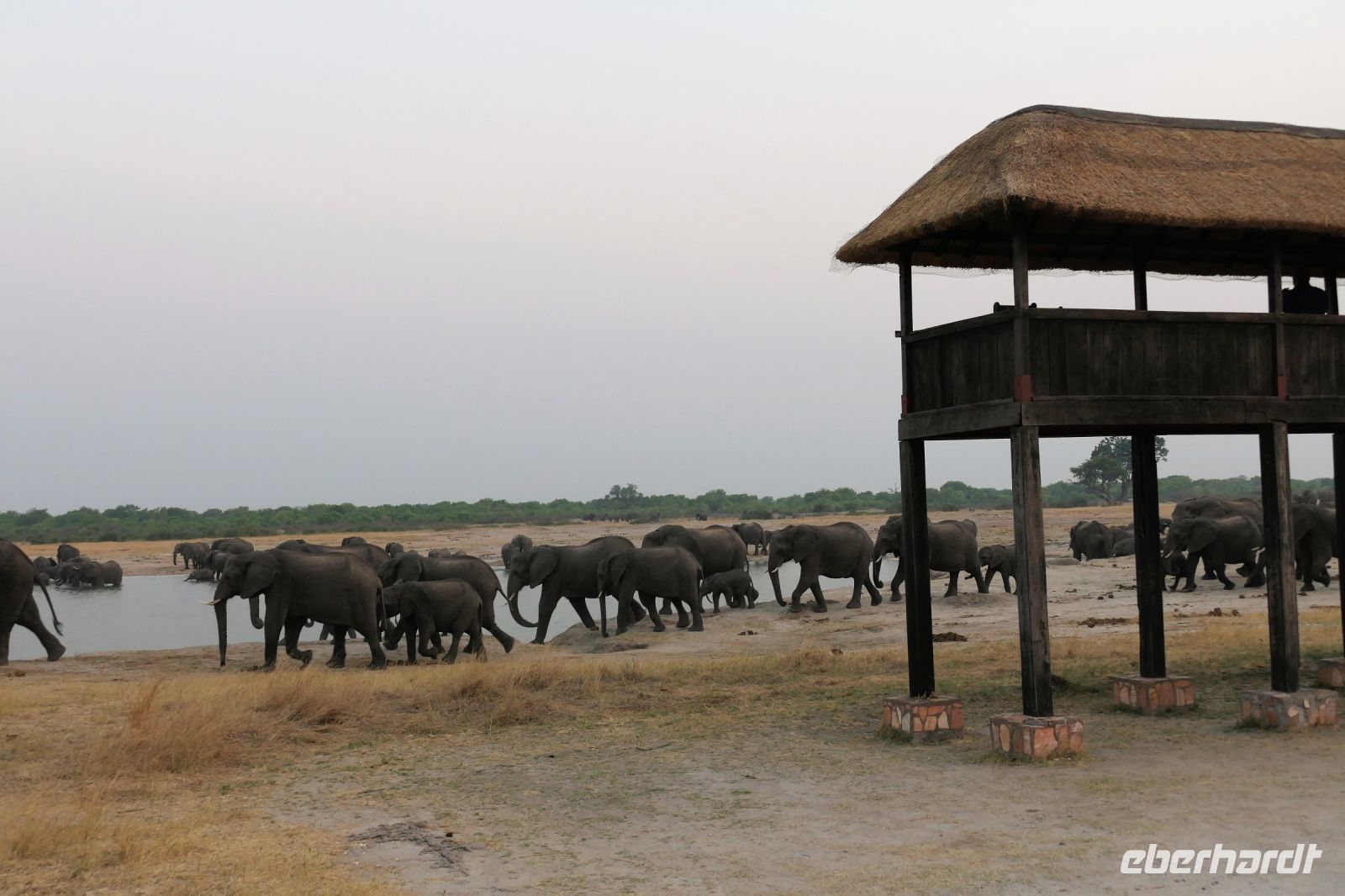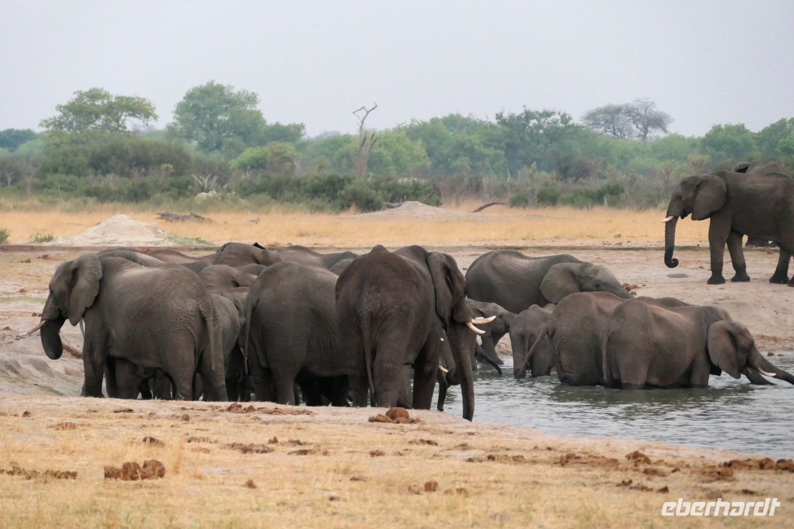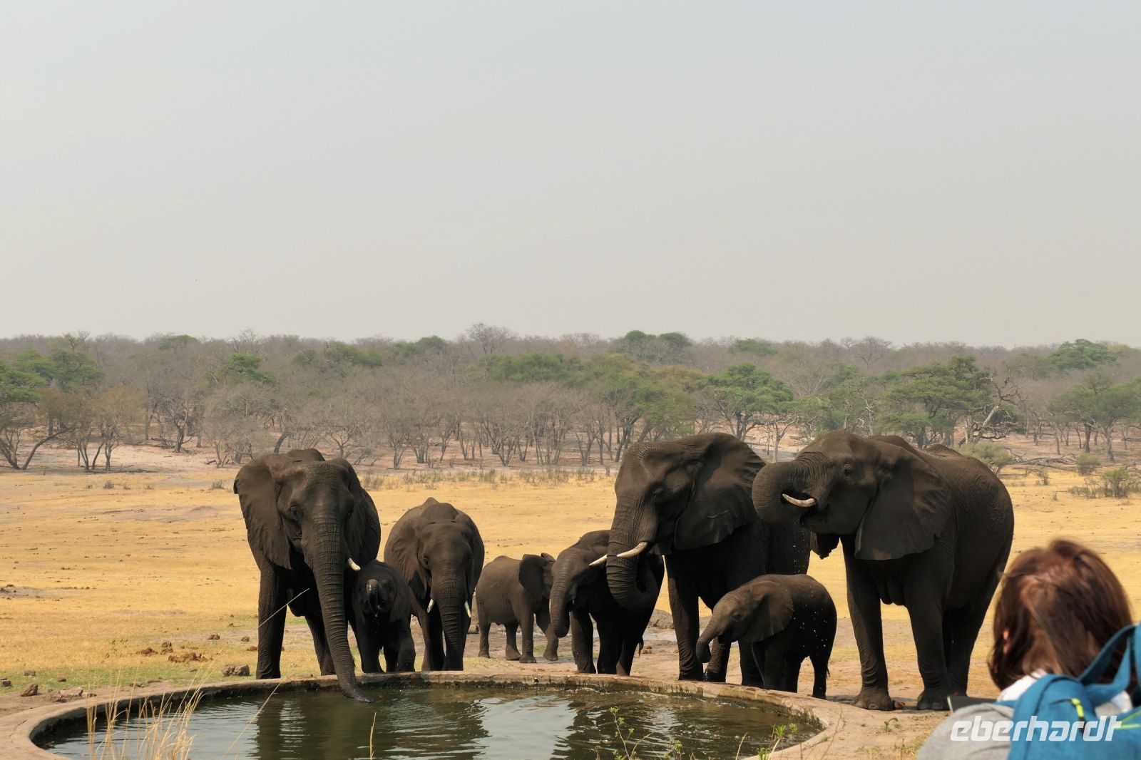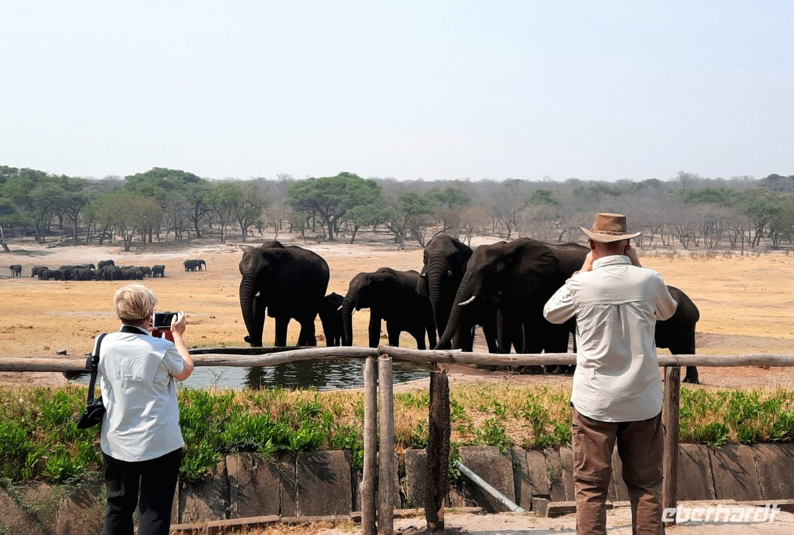 Am Mittag landeten wir in Vic Falls in Simbabwe. Es erfolgte ein kurzer Gesundheitscheck (Temperaturmessung) und Abgabe des bereits ausgefüllten Gesundheitsformular. Wir waren alle gesund und munter, also kein Problem. Auch wurde hier kurz das aktuelle Impfzertifikat kontrolliert. An der Passkontrolle ging es weiter mit der Zettelwirtschaft mit der Abgabe des ebenfalls bereits ausgefüllten Einreiseformulars. Nach Zahlung der Visagebühr in USD erhielten wir unser Visa für Simbabwe in unsere Pässe. Alle Koffer waren vollständig angekommen und Tutu, unser örtlicher DriverGuide erwartete uns in der Empfangshalle des Flughafens. Tutu ist Namibianer und Ovambo. Sein Name bedeutet Beschützer. Als wir aus dem gut klimatisierten Flughafen traten, empfing uns eine wollige Wärme, die uns die ganze Reise begleitete und sich steigerte - Ja, wir waren in Afrika! Nachdem wir unser Gepäck ins Reisefahrzeug, einem Isuzu mit Allrad (4x4 brauchten wir später auf den Straßen unbedingt) verstaut hatten, ging es auch schon los. Wir verließen Vic Falls und fuhren nach Süden. Unser Ziel war der Hwange Nationalpark. Die etwas löchrige Teerstraße ist eine der wichtigsten Hauptverkehrsadern des Landes. Simbabwe ist ein Binnenland, die Verbindung zu Häfen wie in Mozambik daher sehr wichtig. Simbabwe zählt derzeit zu den ärmsten und hochverschuldeten Ländern, obwohl einst Kornkammer von Afrika und heute noch unendlich reich an Bodenschätzen (u.a. Gold, Kupfer, Kohle). Vorbei an zahlreichen alten und neuen Kohleminen und Kraftwerken beobachteten wir den "Feierabendverkehr" und truckten immer entlang der Eisenbahnlinie, auf der auch der Luxuszug Rovos Rail vom Kap nach Kairo fährt. Später wurde die Landschaft buschiger und die Riviere (Trockenflüsse) waren spärlich mit Wasser gefüllt. Am frühen Nachmittag erreichten wir Hwange am gleichnamigen Nationalpark. Unweit unserer Lodge befindet sich das Painted Dog Conservation Center - ein Projekt zum Schutz der Wildhunde, welches ausschließlich von Spenden finanziert wird. Im kleinem Museum, welches uns Jennifer zeigte, wird interaktiv und anhand von vielen Bildern, die Geschichte von Eyespot, einem Wildhund erzählt. Wildhunde sind faszinierende und sehr soziale Tiere, werden aber von vielen Einheimischen aus Unwissenheit als Bedrohung angesehen. Man findet immer noch verletzte oder tote Tiere, die den grausamen Fallen wie Drahtschlingen zum Opfer fallen. In diesem Zentrum pflegt man sie gesund, um sie später wieder auszuwildern. Die ehrenamtlichen Mitglieder des Projektes suchen auch in der Wildnis nach den Fallen und entfernen diese. Ein kleiner Spaziergang führte uns auch zum Gehege, wo derzeit 2 Wildhunde leben, die aber nicht mehr ausgewildert werden können. Kurze Zeit später checkten wir in der Hwange Safari Lodge ein. Nach kurzen Gesundheitscheck mit Temperaturmessung freuten wir uns auf eine Dusche und ein kühles Bier. Die Anlage ist direkt an einer Wasserstelle gelegen, die Zimmer einfacher eingerichtet. Natürlich sahen wir auch gleich die ersten Tiere wie Elefanten und Impalas. Zum Abendessen bedienten wir uns am Buffet und schauten auch noch einmal am nun beleuchteten Wasserloch vorbei, wo sich erneut Elefanten trafen.