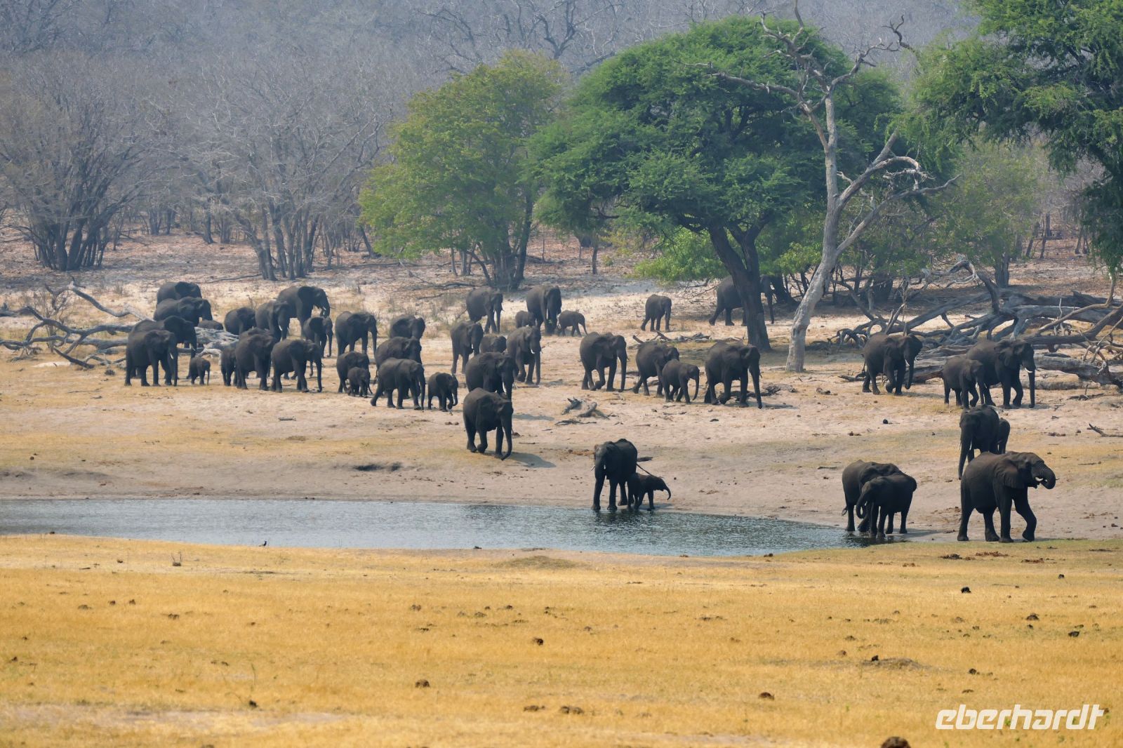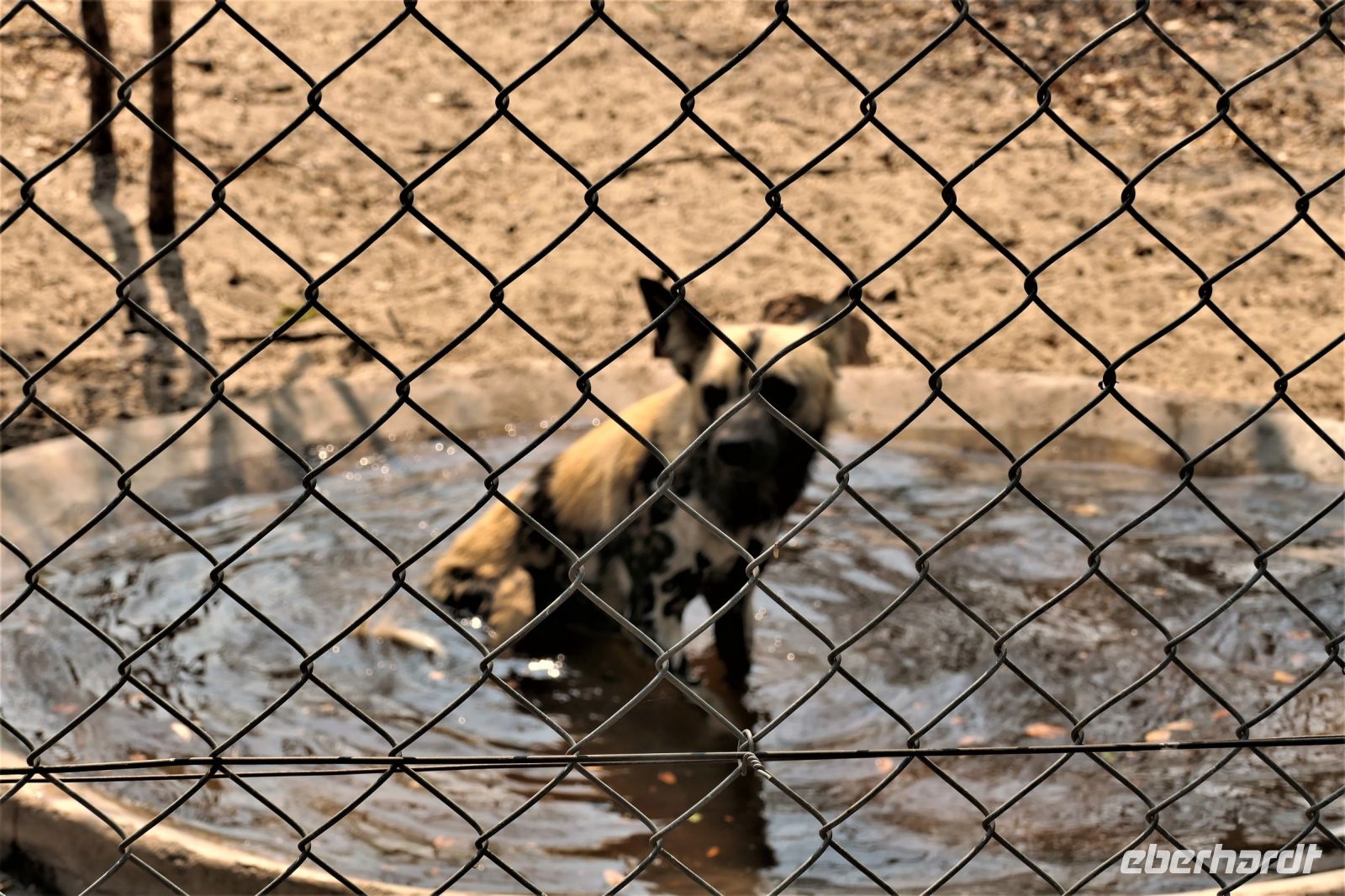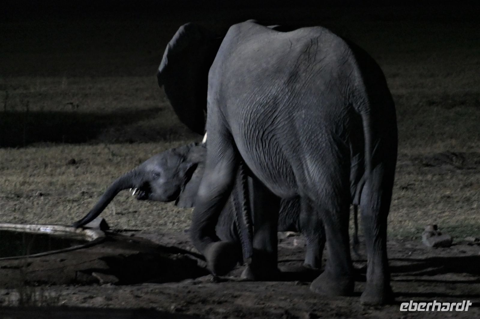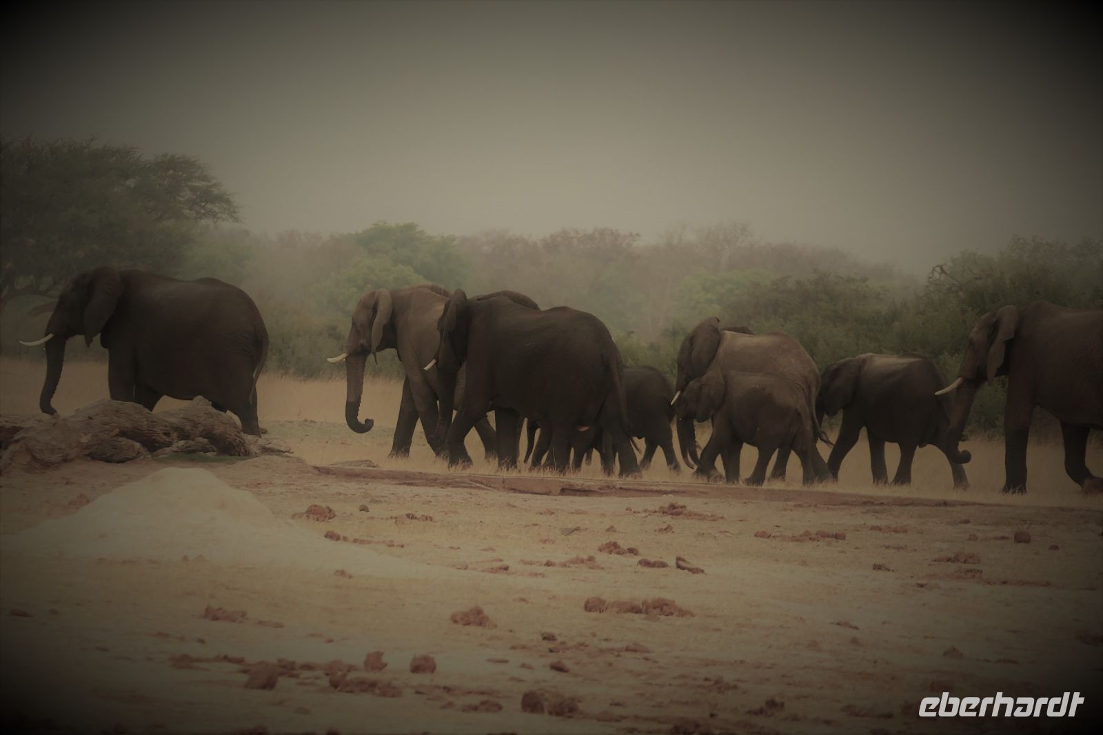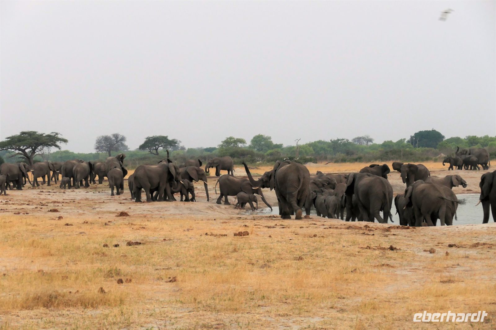 Am Mittag landeten wir in Vic Falls in Simbabwe. Es erfolgte ein kurzer Gesundheitscheck (Temperaturmessung) und Abgabe des bereits ausgefüllten Gesundheitsformular. Wir waren alle gesund und munter, also kein Problem. Auch wurde hier kurz das aktuelle Impfzertifikat kontrolliert. An der Passkontrolle ging es weiter mit der Zettelwirtschaft mit der Abgabe des ebenfalls bereits ausgefüllten Einreiseformulars. Nach Zahlung der Visagebühr in USD erhielten wir unser Visa für Simbabwe in unsere Pässe. Alle Koffer waren vollständig angekommen und Tutu, unser örtlicher DriverGuide erwartete uns in der Empfangshalle des Flughafens. Tutu ist Namibianer und Ovambo. Sein Name bedeutet Beschützer. Als wir aus dem gut klimatisierten Flughafen traten, empfing uns eine wollige Wärme, die uns die ganze Reise begleitete und sich steigerte - Ja, wir waren in Afrika! Nachdem wir unser Gepäck ins Reisefahrzeug, einem Isuzu mit Allrad (4x4 brauchten wir später auf den Straßen unbedingt) verstaut hatten, ging es auch schon los. Wir verließen Vic Falls und fuhren nach Süden. Unser Ziel war der Hwange Nationalpark. Die etwas löchrige Teerstraße ist eine der wichtigsten Hauptverkehrsadern des Landes. Simbabwe ist ein Binnenland, die Verbindung zu Häfen wie in Mozambik daher sehr wichtig. Simbabwe zählt derzeit zu den ärmsten und hochverschuldeten Ländern, obwohl einst Kornkammer von Afrika und heute noch unendlich reich an Bodenschätzen (u.a. Gold, Kupfer, Kohle). Vorbei an zahlreichen alten und neuen Kohleminen und Kraftwerken beobachteten wir den "Feierabendverkehr" und truckten immer entlang der Eisenbahnlinie, auf der auch der Luxuszug Rovos Rail vom Kap nach Kairo fährt. Später wurde die Landschaft buschiger und die Riviere (Trockenflüsse) waren spärlich mit Wasser gefüllt. Am frühen Nachmittag erreichten wir Hwange am gleichnamigen Nationalpark. Unweit unserer Lodge befindet sich das Painted Dog Conservation Center - ein Projekt zum Schutz der Wildhunde, welches ausschließlich von Spenden finanziert wird. Im kleinem Museum, welches uns Jennifer zeigte, wird interaktiv und anhand von vielen Bildern, die Geschichte von Eyespot, einem Wildhund erzählt. Wildhunde sind faszinierende und sehr soziale Tiere, werden aber von vielen Einheimischen aus Unwissenheit als Bedrohung angesehen. Man findet immer noch verletzte oder tote Tiere, die den grausamen Fallen wie Drahtschlingen zum Opfer fallen. In diesem Zentrum pflegt man sie gesund, um sie später wieder auszuwildern. Die ehrenamtlichen Mitglieder des Projektes suchen auch in der Wildnis nach den Fallen und entfernen diese. Ein kleiner Spaziergang führte uns auch zum Gehege, wo derzeit 2 Wildhunde leben, die aber nicht mehr ausgewildert werden können. Kurze Zeit später checkten wir in der Hwange Safari Lodge ein. Nach kurzen Gesundheitscheck mit Temperaturmessung freuten wir uns auf eine Dusche und ein kühles Bier. Die Anlage ist direkt an einer Wasserstelle gelegen, die Zimmer einfacher eingerichtet. Natürlich sahen wir auch gleich die ersten Tiere wie Elefanten und Impalas. Zum Abendessen bedienten wir uns am Buffet und schauten auch noch einmal am nun beleuchteten Wasserloch vorbei, wo sich erneut Elefanten trafen.