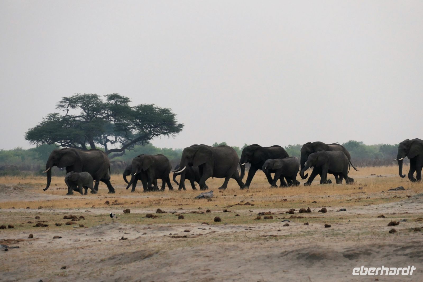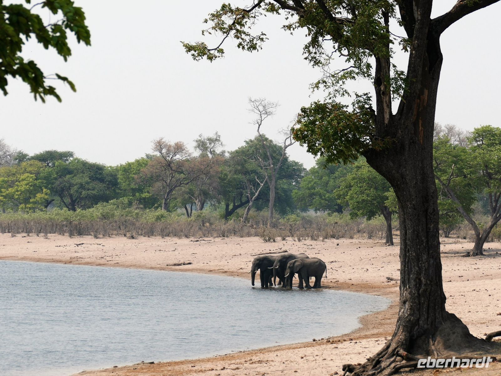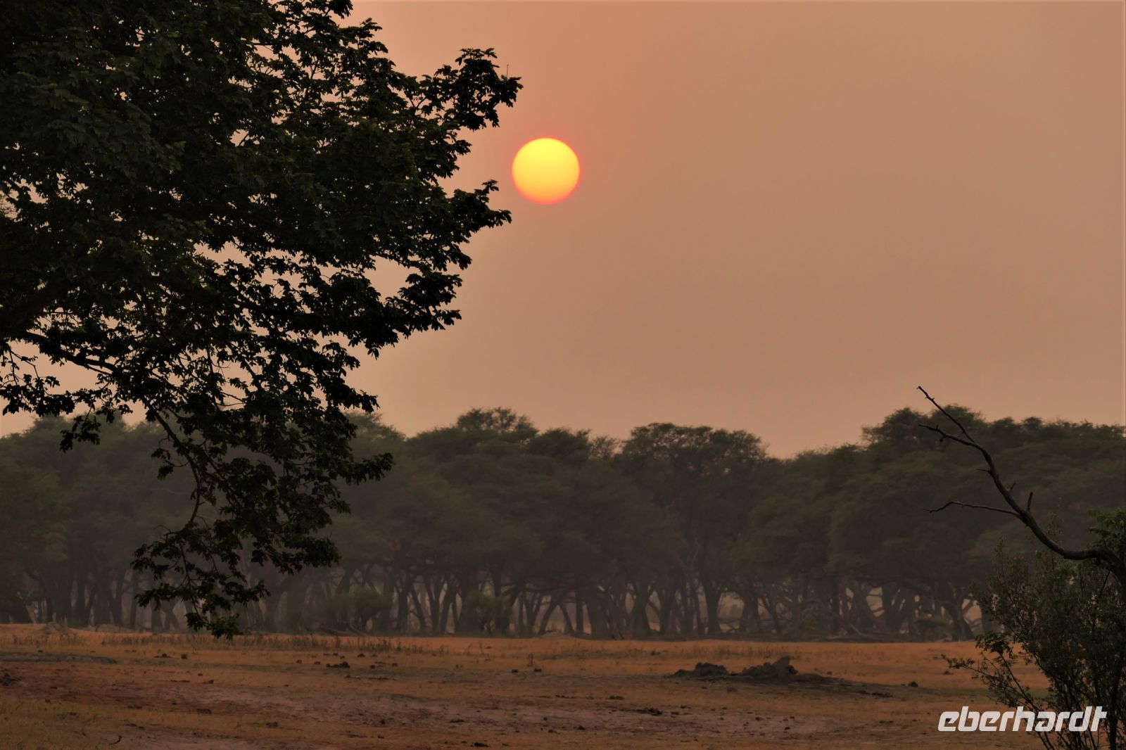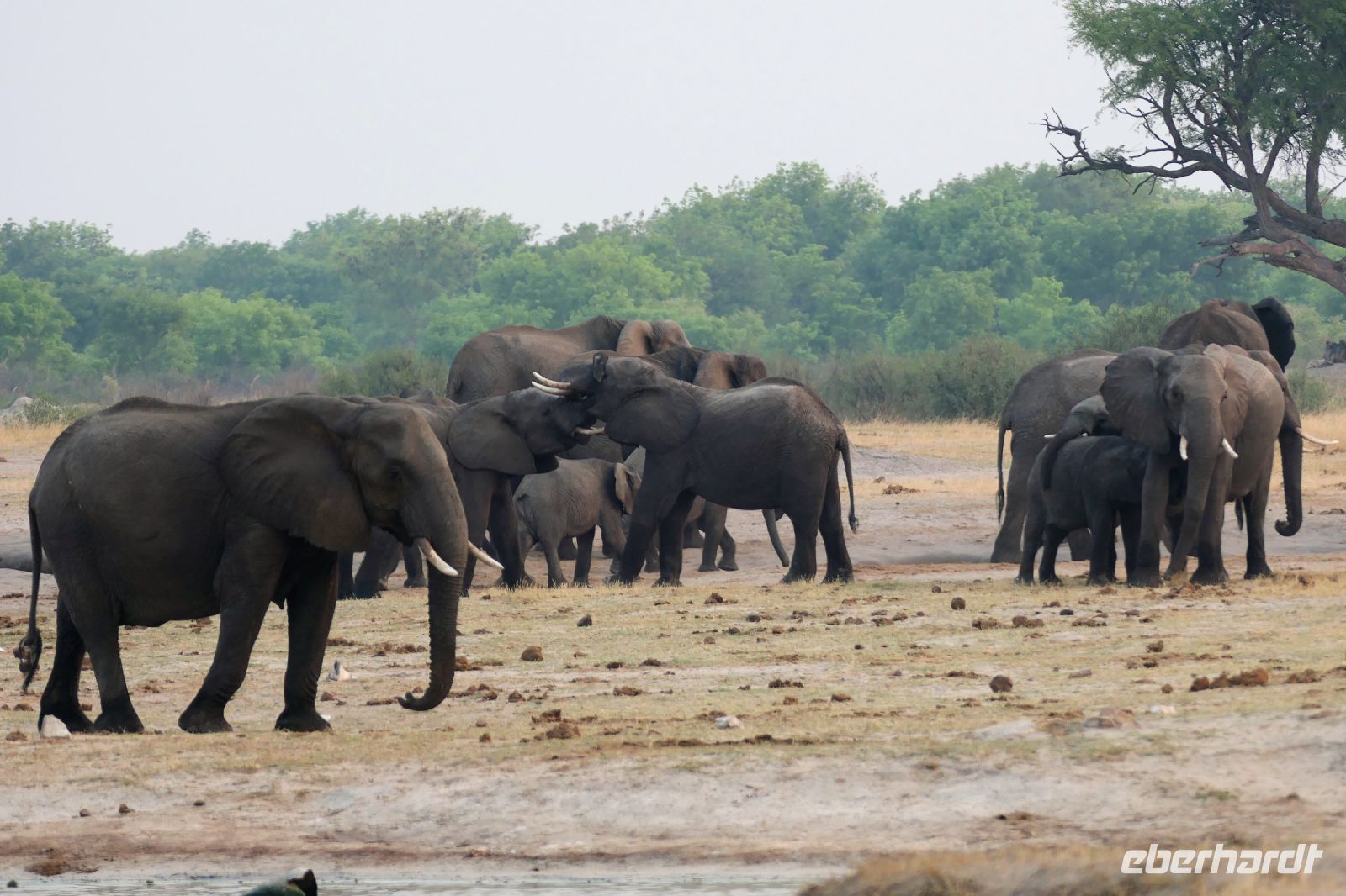 Am Mittag landeten wir in Vic Falls in Simbabwe. Es erfolgte ein kurzer Gesundheitscheck (Temperaturmessung) und Abgabe des bereits ausgefüllten Gesundheitsformular. Wir waren alle gesund und munter, also kein Problem. Auch wurde hier kurz das aktuelle Impfzertifikat kontrolliert. An der Passkontrolle ging es weiter mit der Zettelwirtschaft mit der Abgabe des ebenfalls bereits ausgefüllten Einreiseformulars. Nach Zahlung der Visagebühr in USD erhielten wir unser Visa für Simbabwe in unsere Pässe. Alle Koffer waren vollständig angekommen und Tutu, unser örtlicher DriverGuide erwartete uns in der Empfangshalle des Flughafens. Tutu ist Namibianer und Ovambo. Sein Name bedeutet Beschützer. Als wir aus dem gut klimatisierten Flughafen traten, empfing uns eine wollige Wärme, die uns die ganze Reise begleitete und sich steigerte - Ja, wir waren in Afrika! Nachdem wir unser Gepäck ins Reisefahrzeug, einem Isuzu mit Allrad (4x4 brauchten wir später auf den Straßen unbedingt) verstaut hatten, ging es auch schon los. Wir verließen Vic Falls und fuhren nach Süden. Unser Ziel war der Hwange Nationalpark. Die etwas löchrige Teerstraße ist eine der wichtigsten Hauptverkehrsadern des Landes. Simbabwe ist ein Binnenland, die Verbindung zu Häfen wie in Mozambik daher sehr wichtig. Simbabwe zählt derzeit zu den ärmsten und hochverschuldeten Ländern, obwohl einst Kornkammer von Afrika und heute noch unendlich reich an Bodenschätzen (u.a. Gold, Kupfer, Kohle). Vorbei an zahlreichen alten und neuen Kohleminen und Kraftwerken beobachteten wir den "Feierabendverkehr" und truckten immer entlang der Eisenbahnlinie, auf der auch der Luxuszug Rovos Rail vom Kap nach Kairo fährt. Später wurde die Landschaft buschiger und die Riviere (Trockenflüsse) waren spärlich mit Wasser gefüllt. Am frühen Nachmittag erreichten wir Hwange am gleichnamigen Nationalpark. Unweit unserer Lodge befindet sich das Painted Dog Conservation Center - ein Projekt zum Schutz der Wildhunde, welches ausschließlich von Spenden finanziert wird. Im kleinem Museum, welches uns Jennifer zeigte, wird interaktiv und anhand von vielen Bildern, die Geschichte von Eyespot, einem Wildhund erzählt. Wildhunde sind faszinierende und sehr soziale Tiere, werden aber von vielen Einheimischen aus Unwissenheit als Bedrohung angesehen. Man findet immer noch verletzte oder tote Tiere, die den grausamen Fallen wie Drahtschlingen zum Opfer fallen. In diesem Zentrum pflegt man sie gesund, um sie später wieder auszuwildern. Die ehrenamtlichen Mitglieder des Projektes suchen auch in der Wildnis nach den Fallen und entfernen diese. Ein kleiner Spaziergang führte uns auch zum Gehege, wo derzeit 2 Wildhunde leben, die aber nicht mehr ausgewildert werden können. Kurze Zeit später checkten wir in der Hwange Safari Lodge ein. Nach kurzen Gesundheitscheck mit Temperaturmessung freuten wir uns auf eine Dusche und ein kühles Bier. Die Anlage ist direkt an einer Wasserstelle gelegen, die Zimmer einfacher eingerichtet. Natürlich sahen wir auch gleich die ersten Tiere wie Elefanten und Impalas. Zum Abendessen bedienten wir uns am Buffet und schauten auch noch einmal am nun beleuchteten Wasserloch vorbei, wo sich erneut Elefanten trafen.