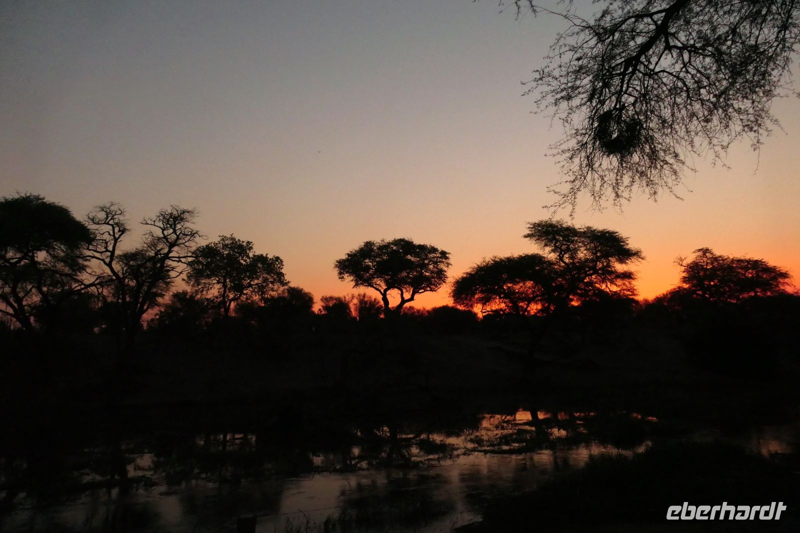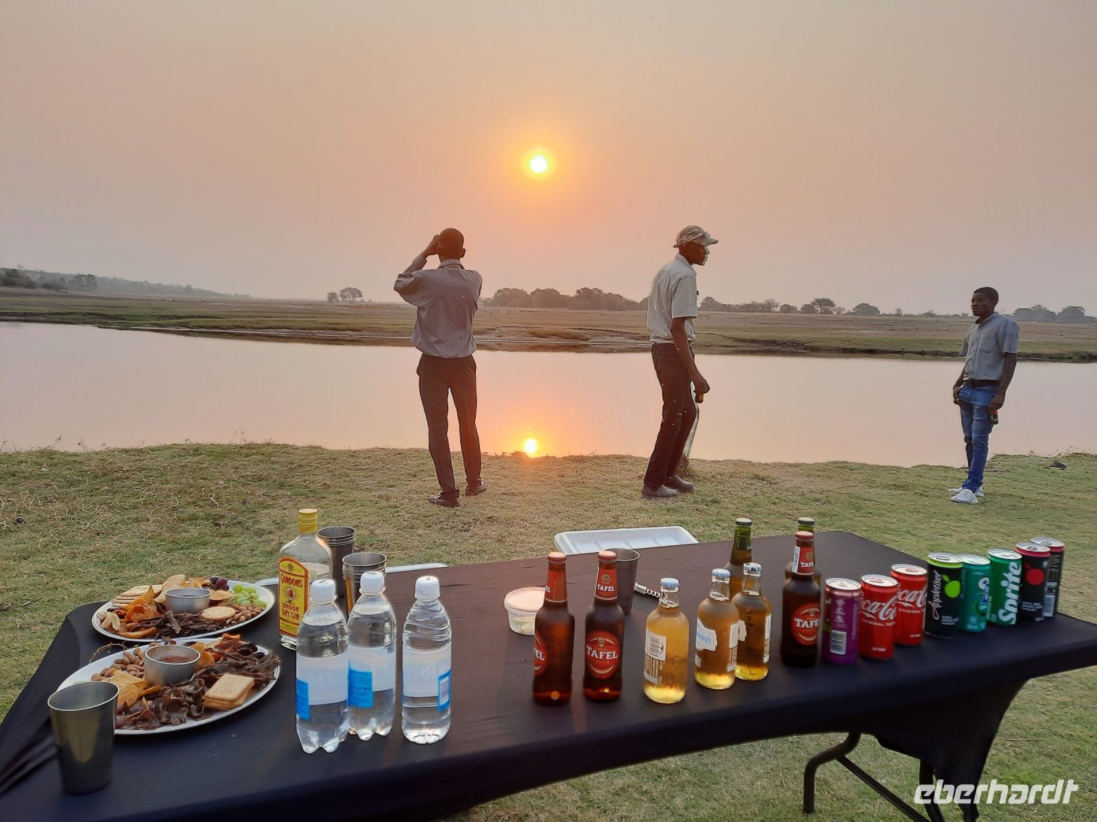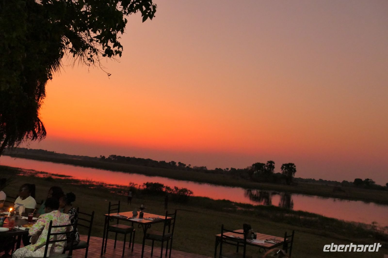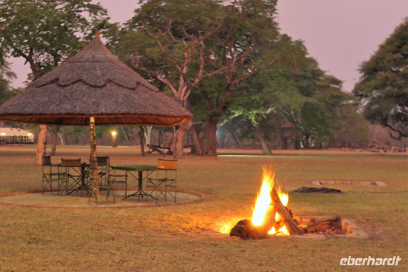Am Lagerfeuer in der romantischen Boma war am Abend ein leckeres Buffet aufgebaut, von dem wir ausgiebig schlemmten und uns einen Absacker gönnten. Der Sternenhimmel in der Nacht war faszinierend. In der Nacht brüllten die Löwen, man hörte das Gelächter von Hyänen und Hippos schmatzten sich genüsslich durch das seichte Wasser.