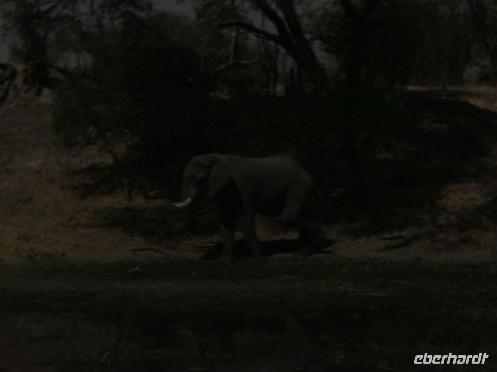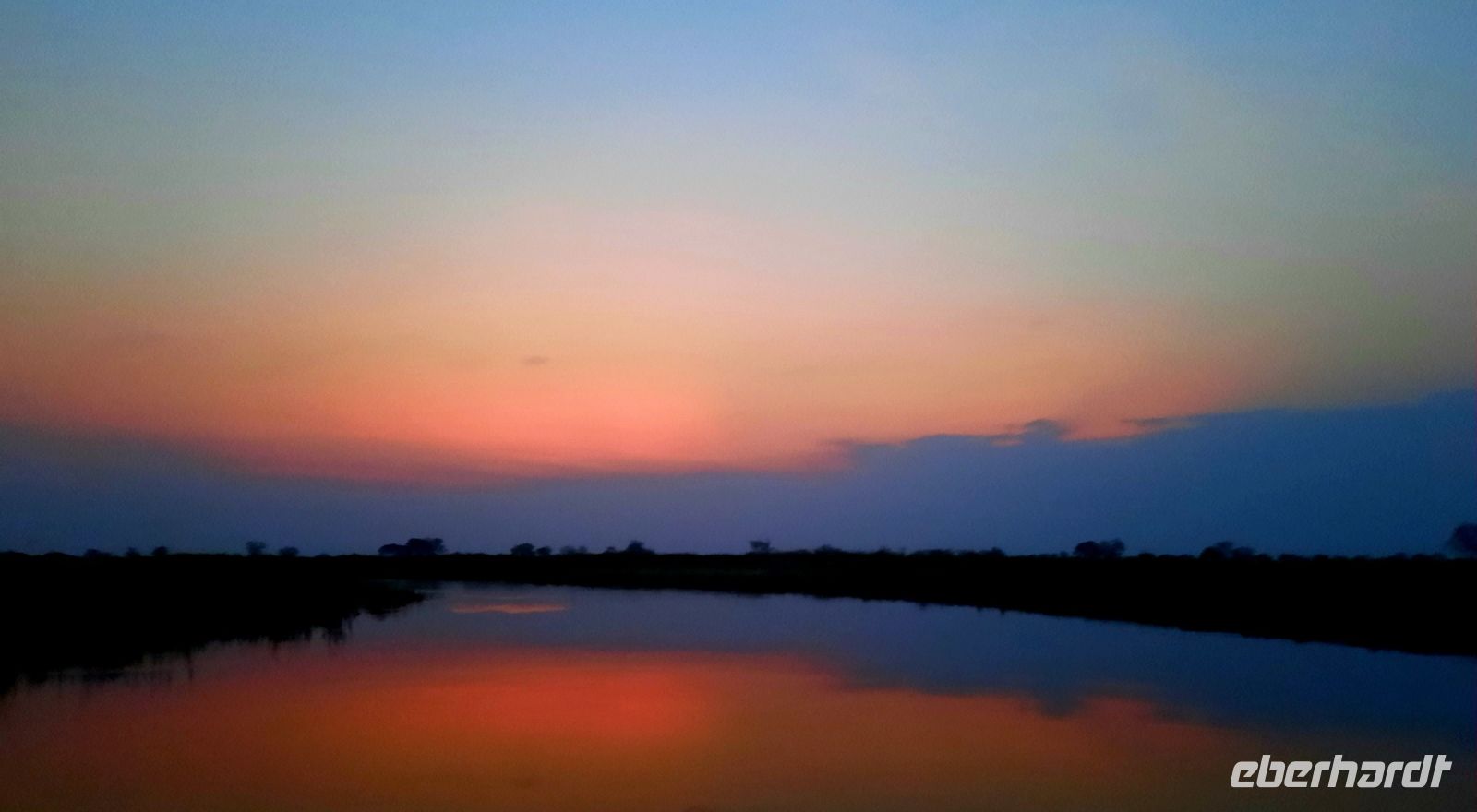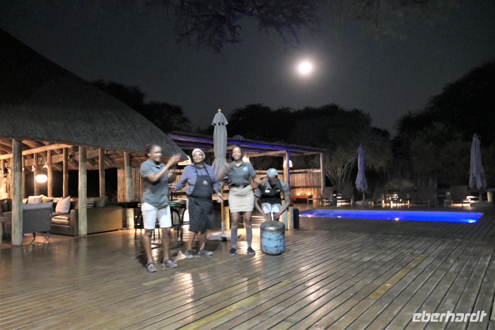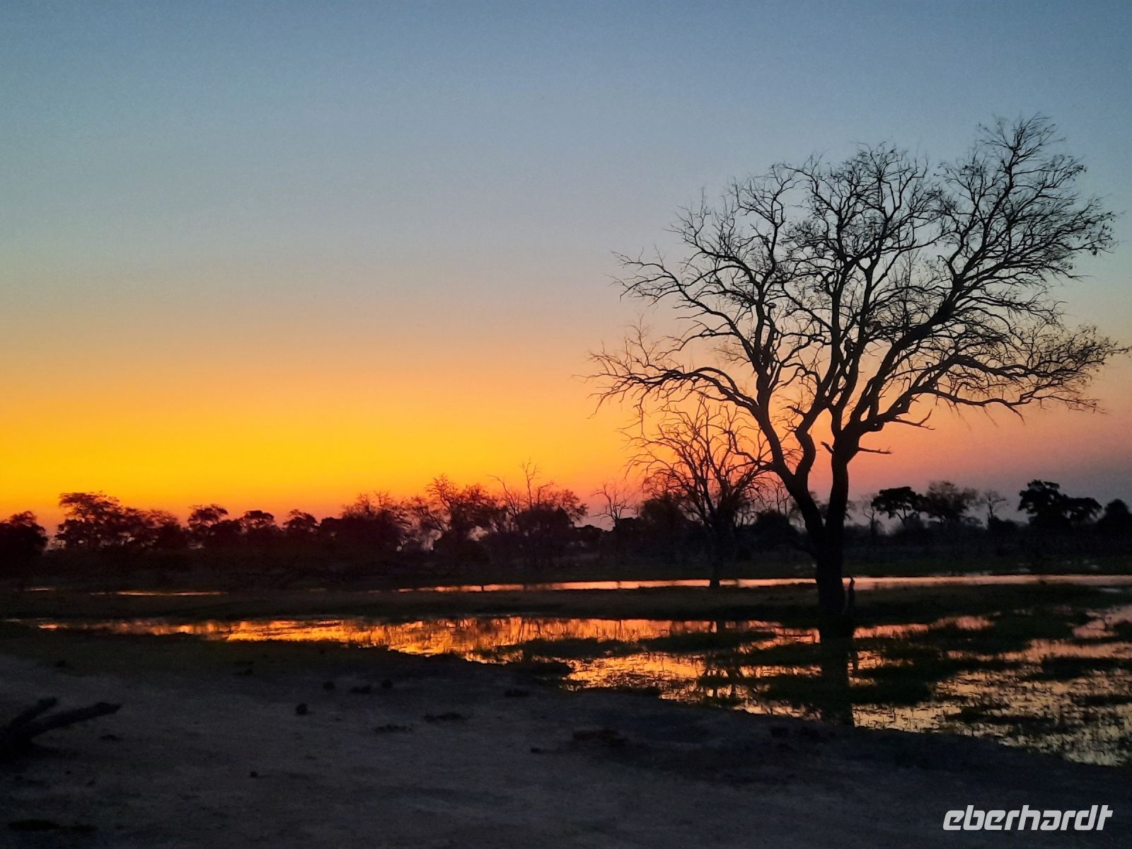 Am Lagerfeuer in der romantischen Boma war am Abend ein leckeres Buffet aufgebaut, von dem wir ausgiebig schlemmten und uns einen Absacker gönnten. Der Sternenhimmel in der Nacht war faszinierend. In der Nacht brüllten die Löwen, man hörte das Gelächter von Hyänen und Hippos schmatzten sich genüsslich durch das seichte Wasser.