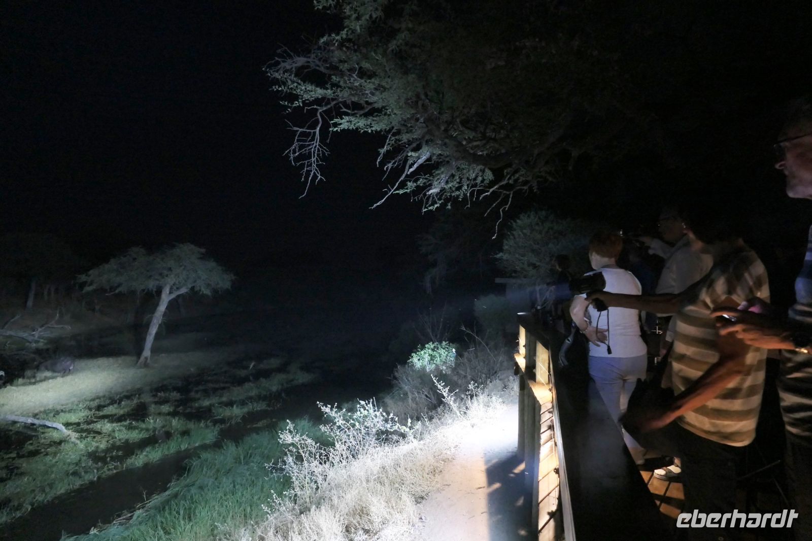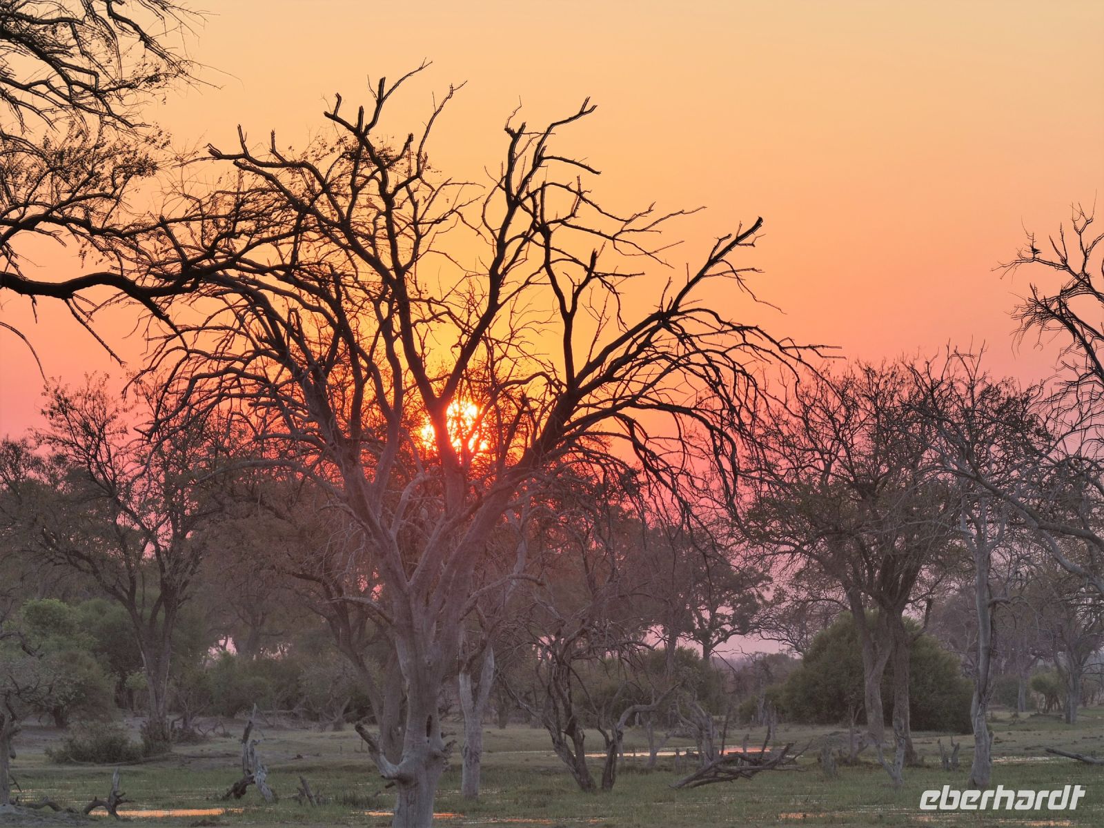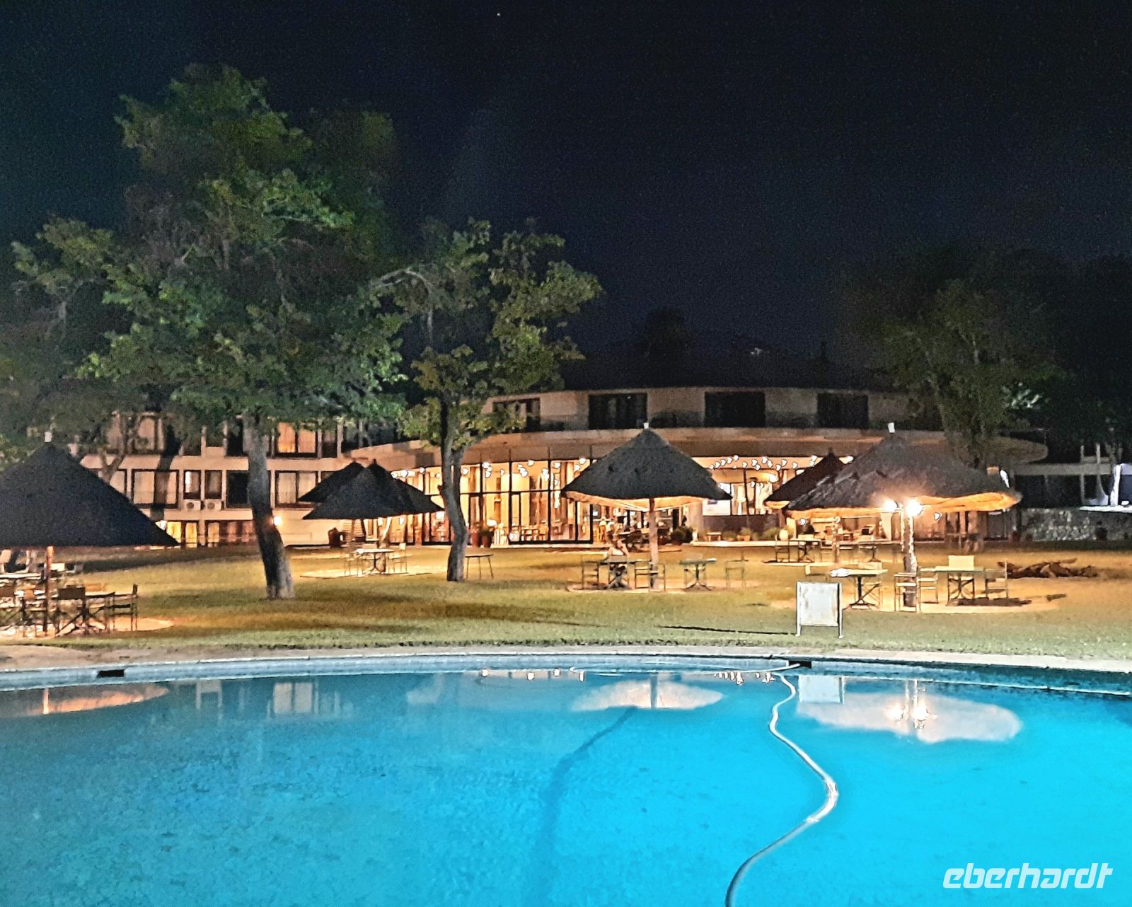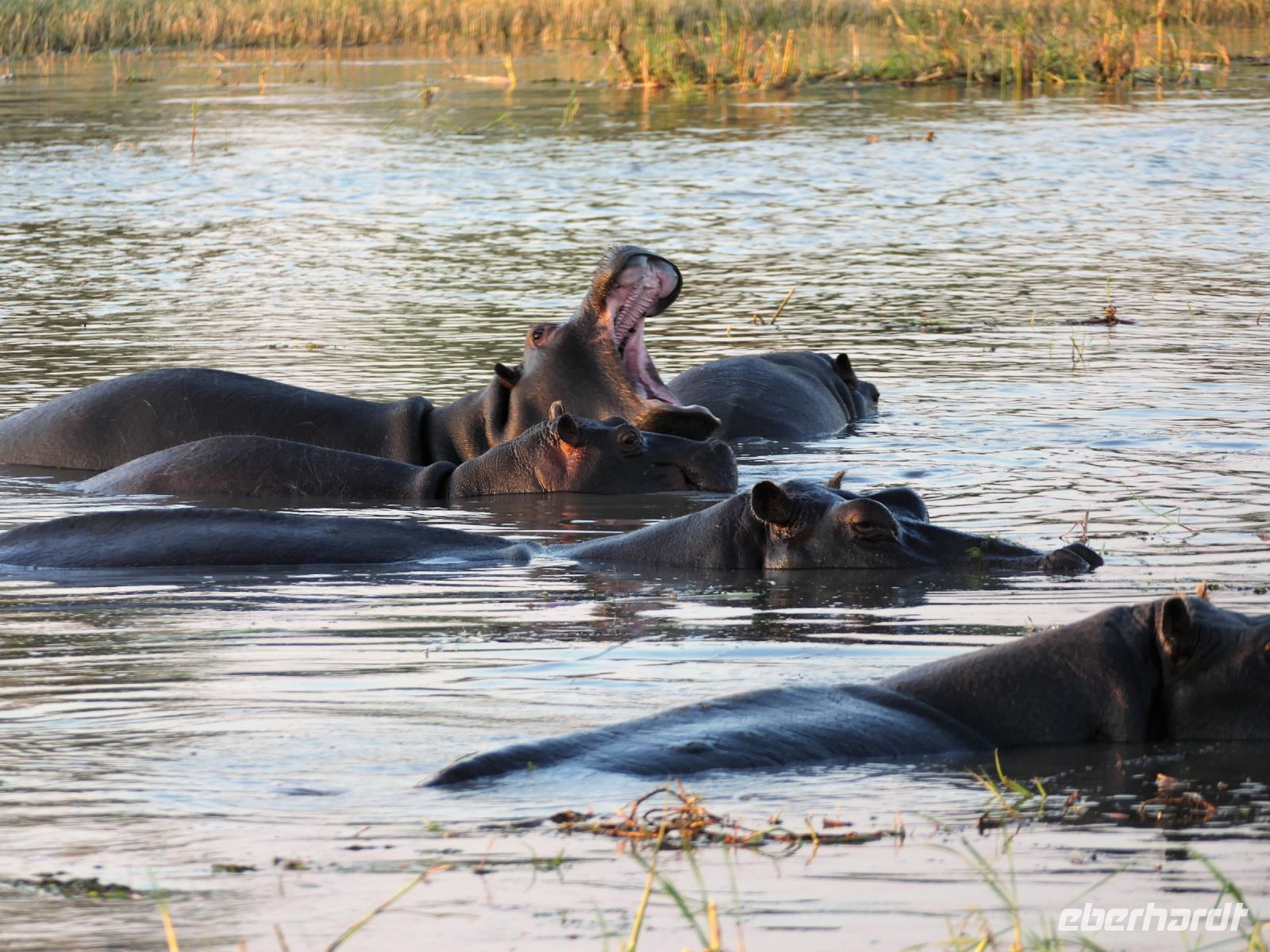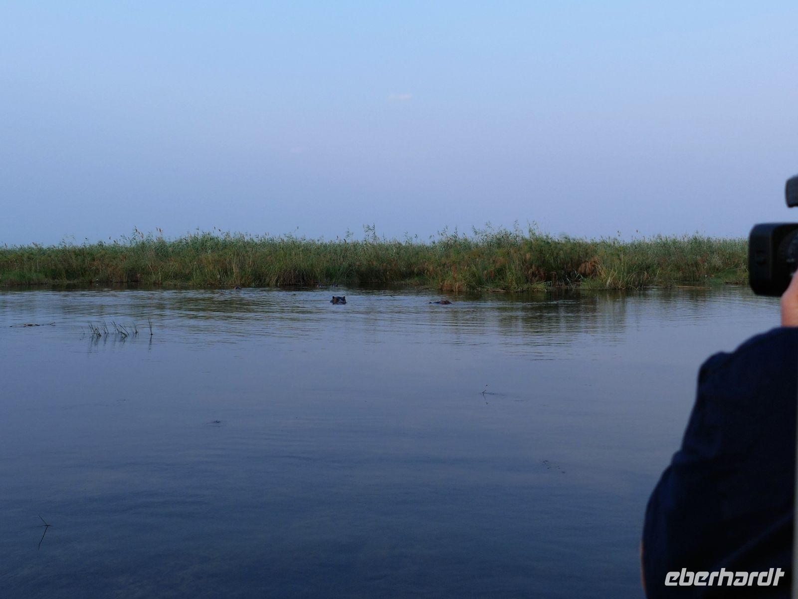 Am Lagerfeuer in der romantischen Boma war am Abend ein leckeres Buffet aufgebaut, von dem wir ausgiebig schlemmten und uns einen Absacker gönnten. Der Sternenhimmel in der Nacht war faszinierend. In der Nacht brüllten die Löwen, man hörte das Gelächter von Hyänen und Hippos schmatzten sich genüsslich durch das seichte Wasser.