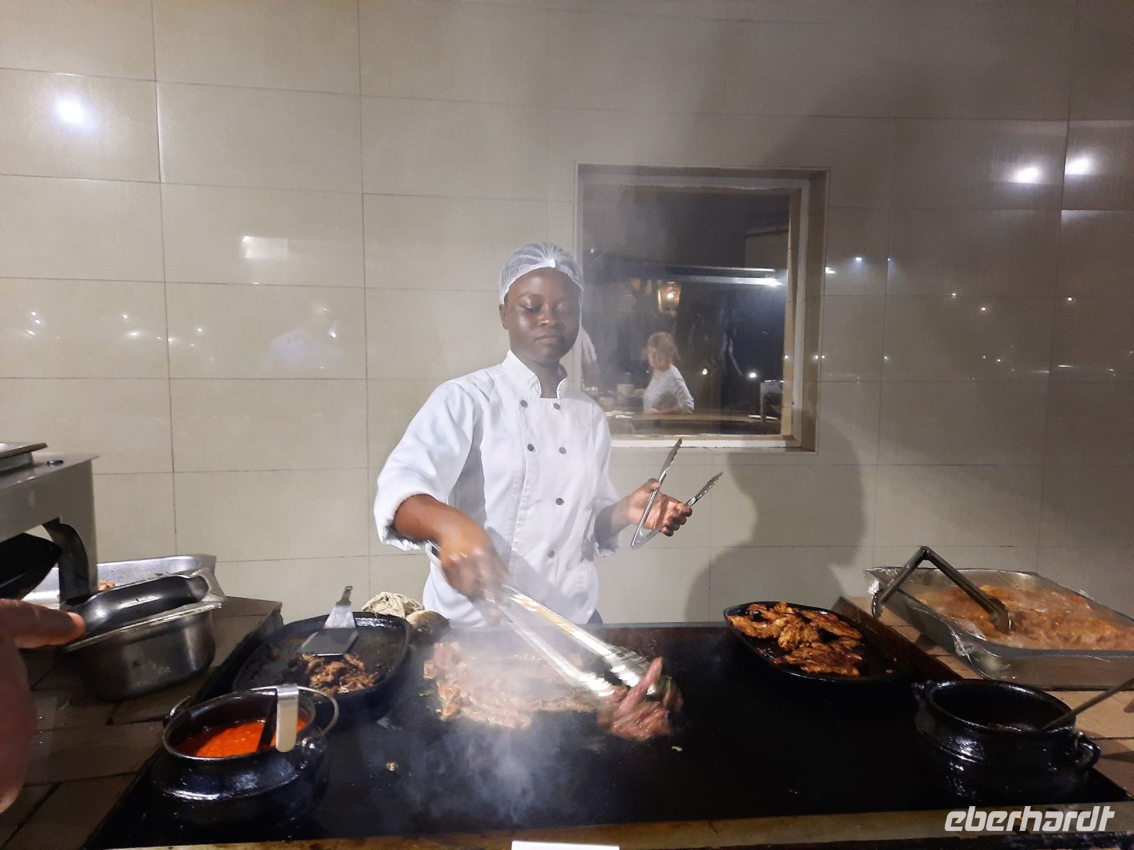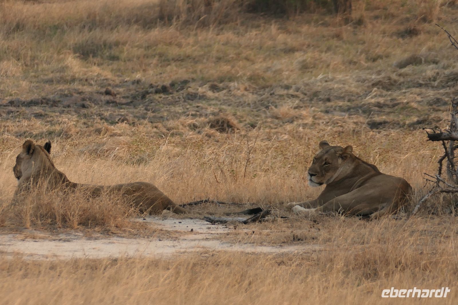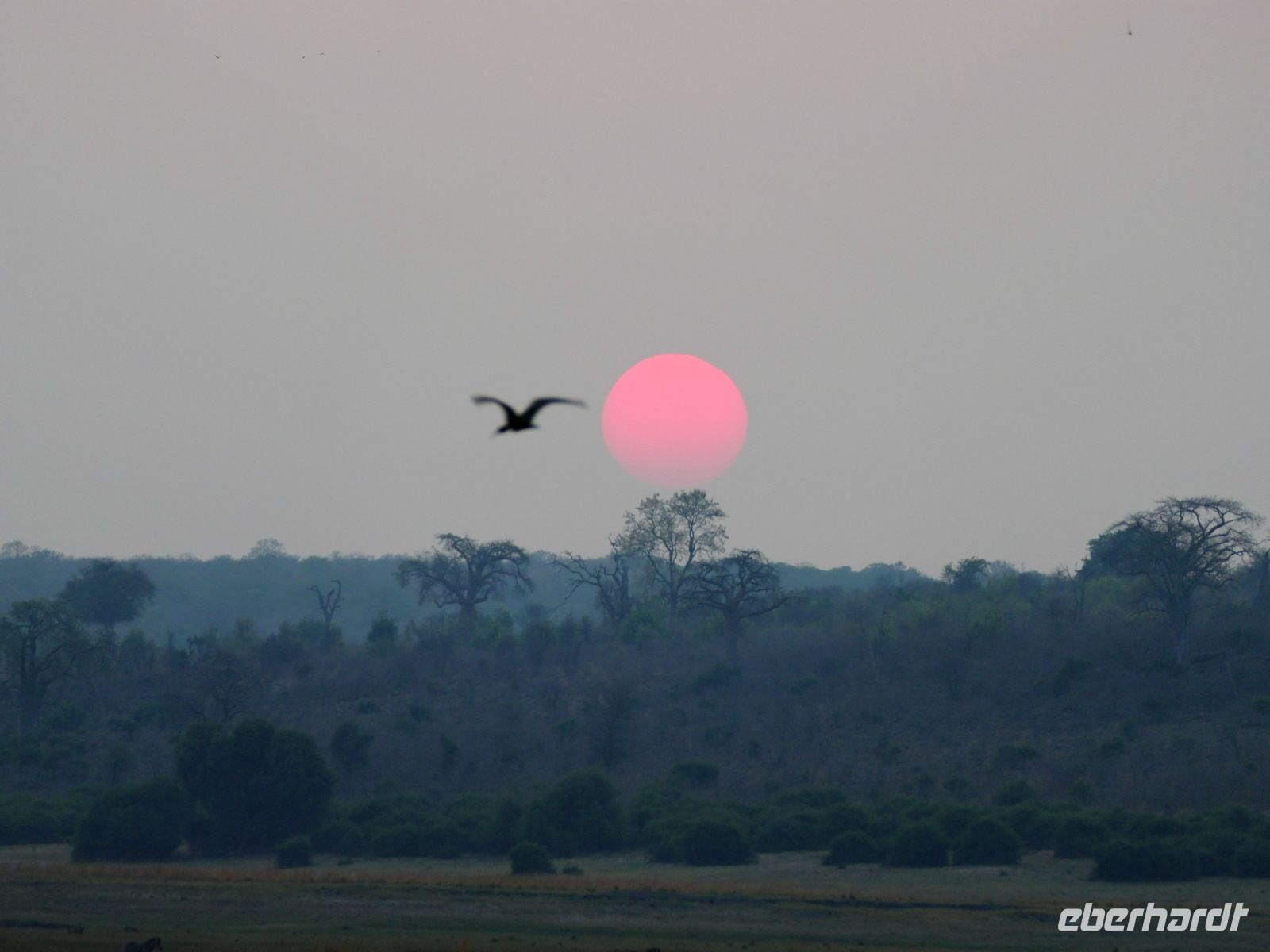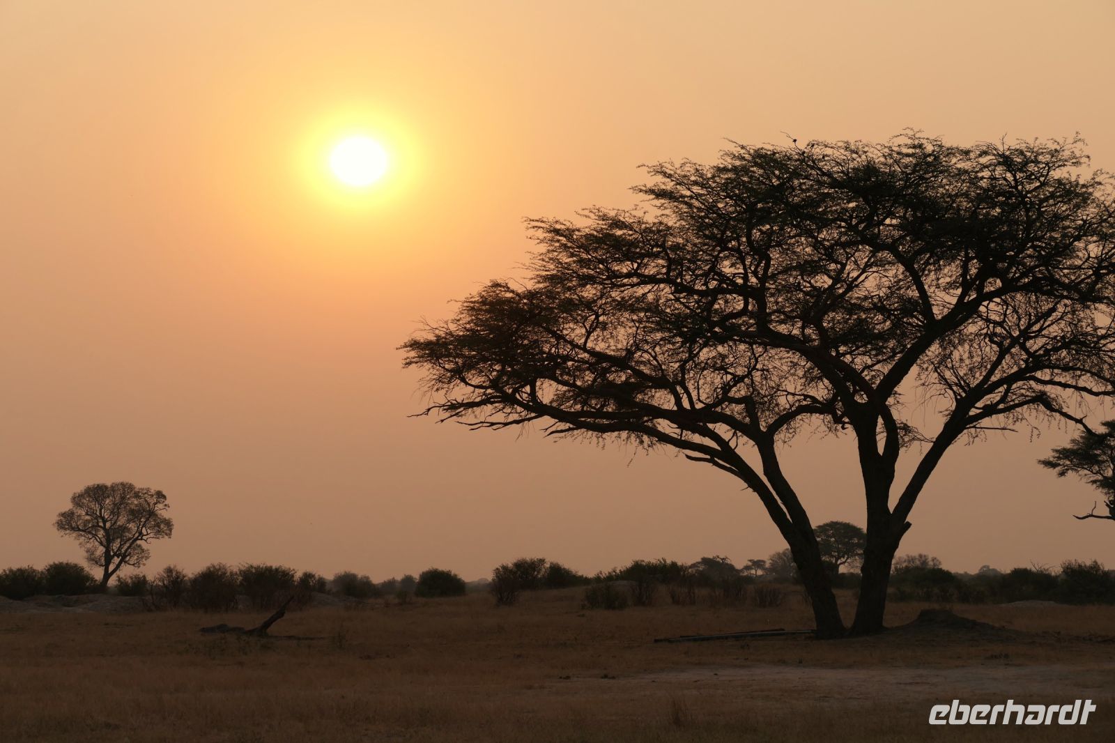 Am Lagerfeuer in der romantischen Boma war am Abend ein leckeres Buffet aufgebaut, von dem wir ausgiebig schlemmten und uns einen Absacker gönnten. Der Sternenhimmel in der Nacht war faszinierend. In der Nacht brüllten die Löwen, man hörte das Gelächter von Hyänen und Hippos schmatzten sich genüsslich durch das seichte Wasser.