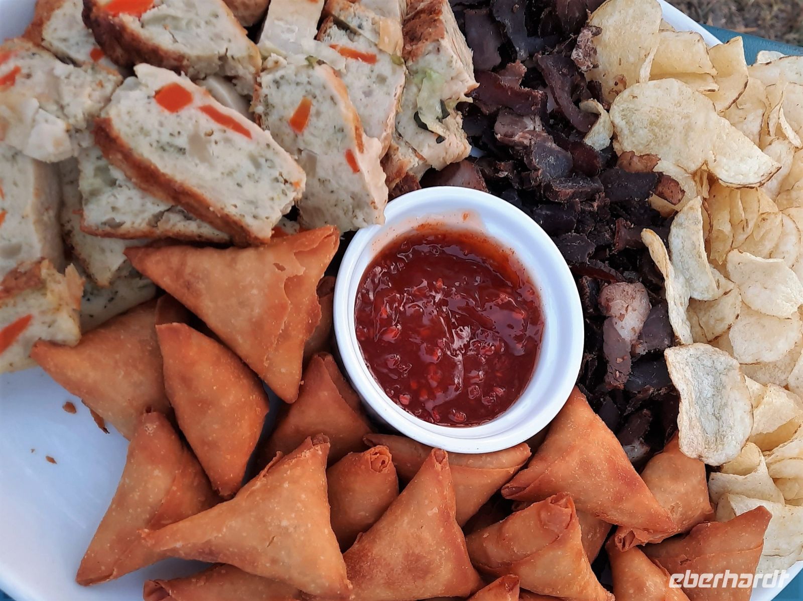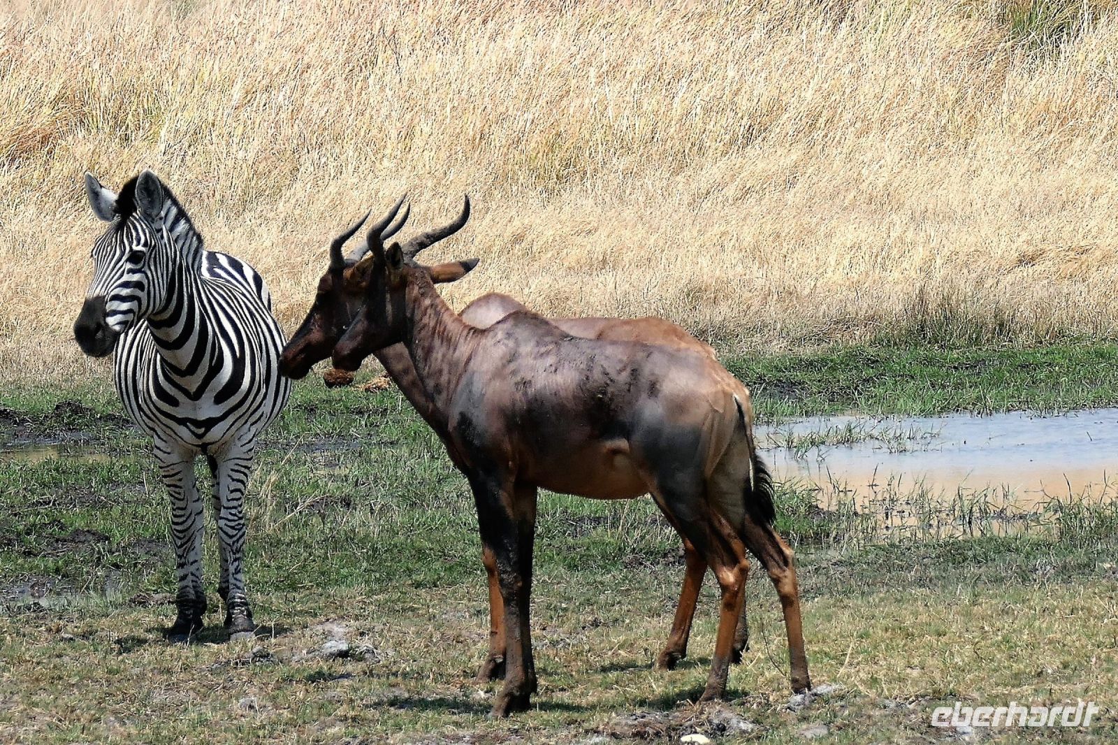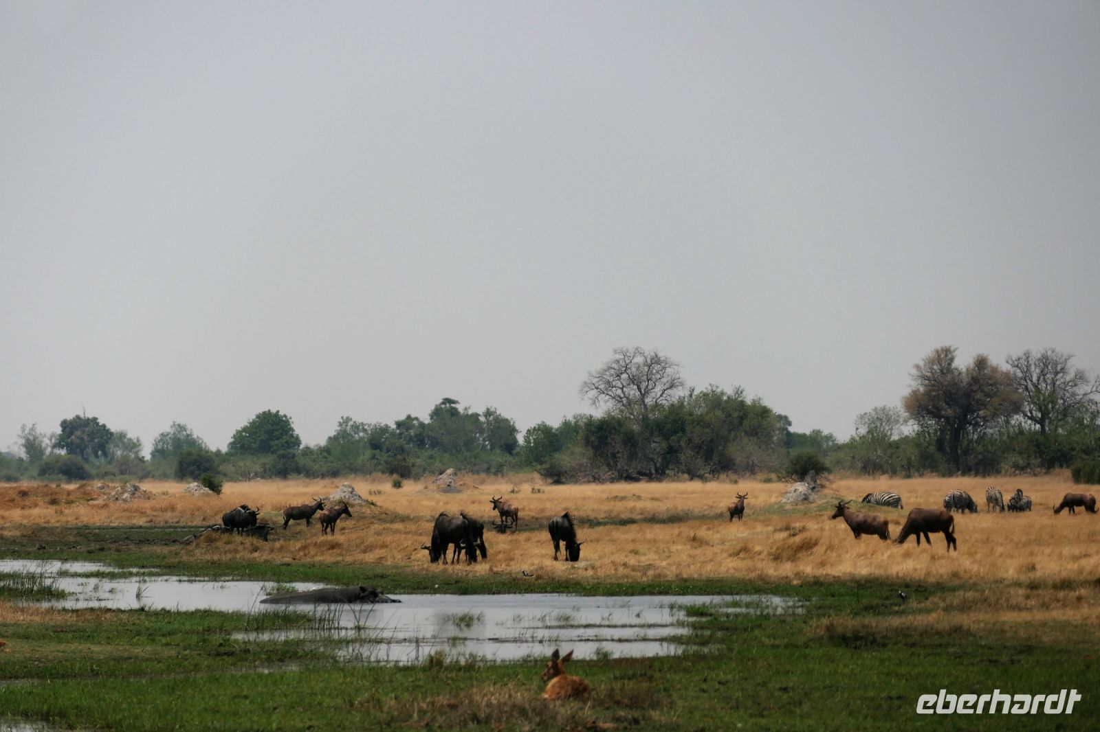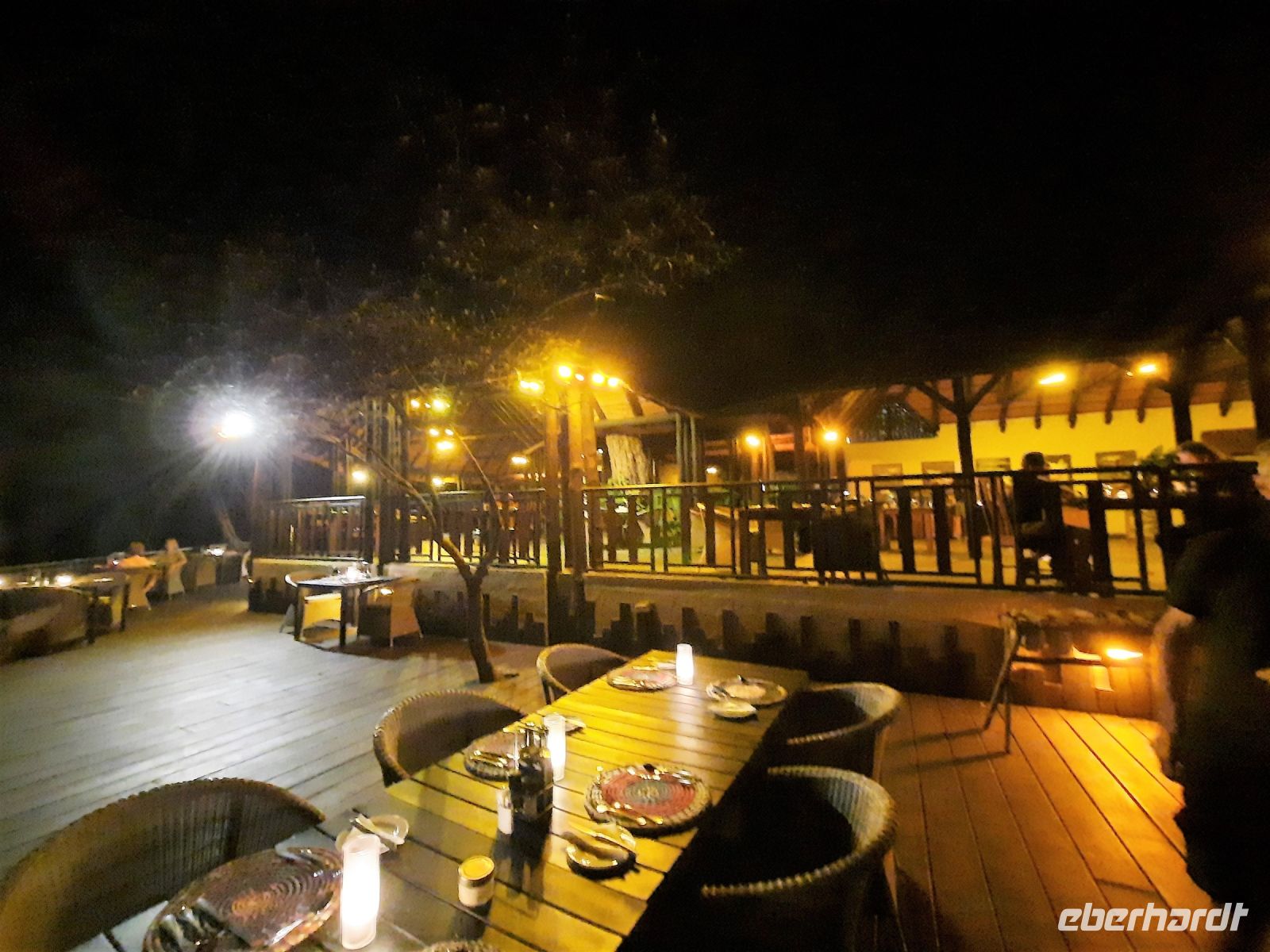 Am Lagerfeuer in der romantischen Boma war am Abend ein leckeres Buffet aufgebaut, von dem wir ausgiebig schlemmten und uns einen Absacker gönnten. Der Sternenhimmel in der Nacht war faszinierend. In der Nacht brüllten die Löwen, man hörte das Gelächter von Hyänen und Hippos schmatzten sich genüsslich durch das seichte Wasser.