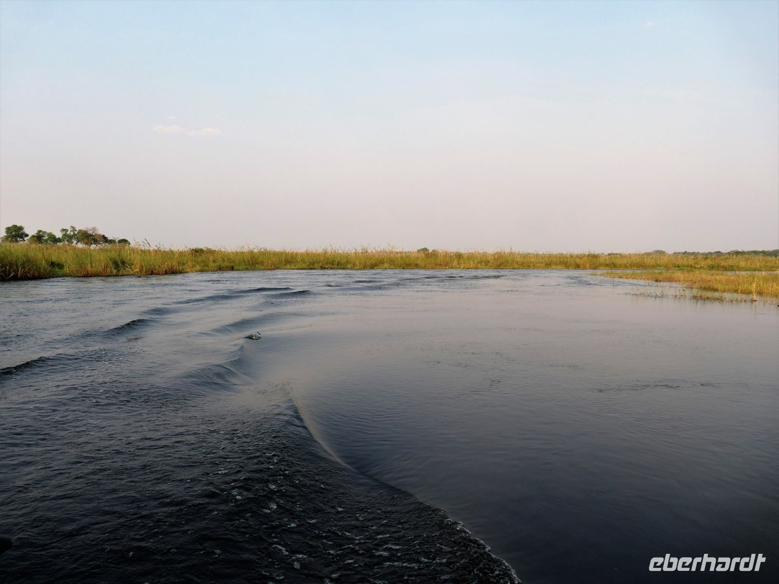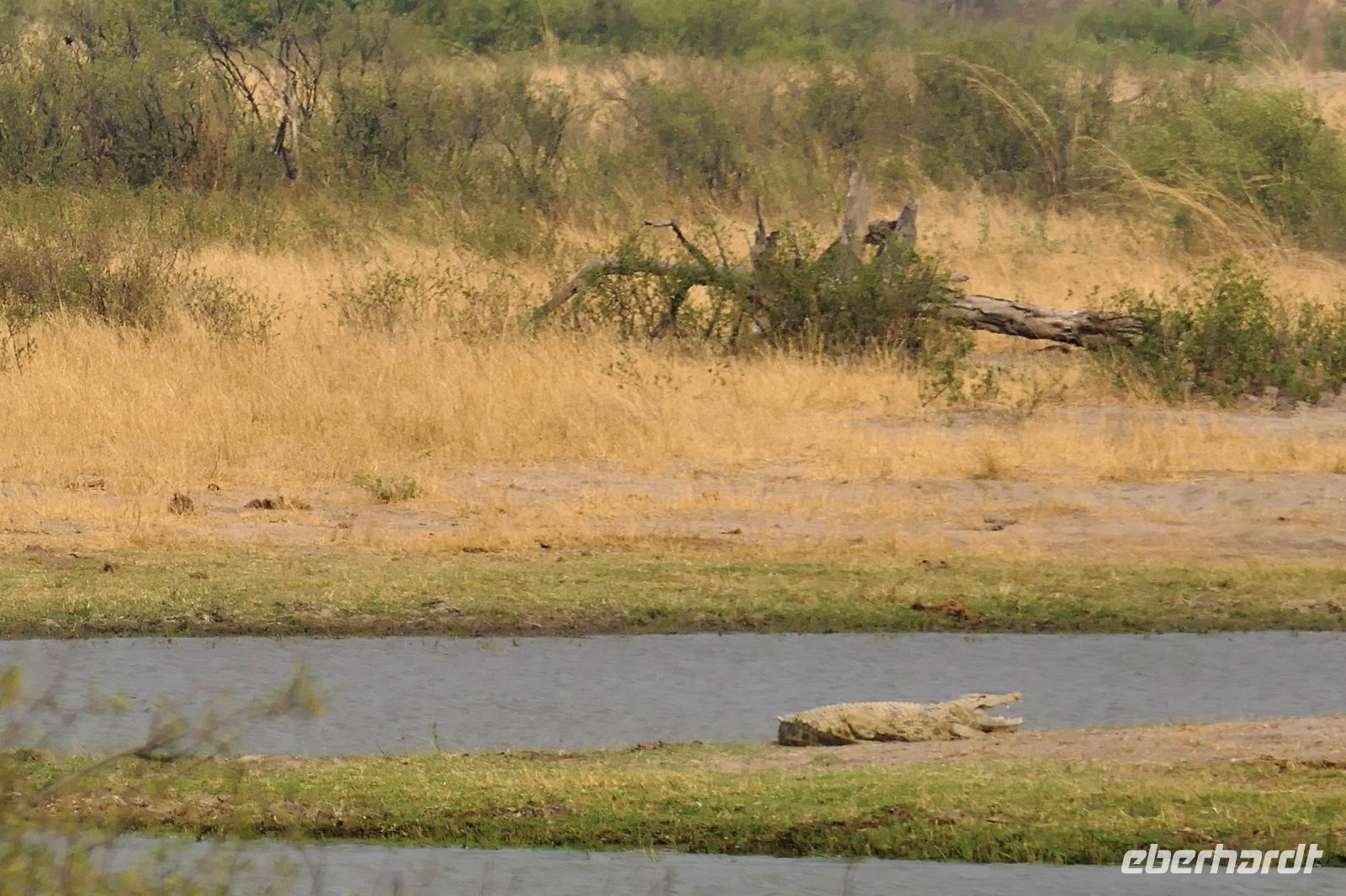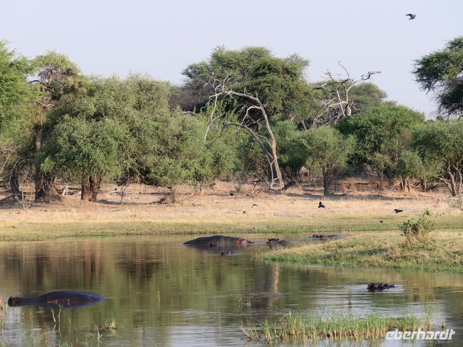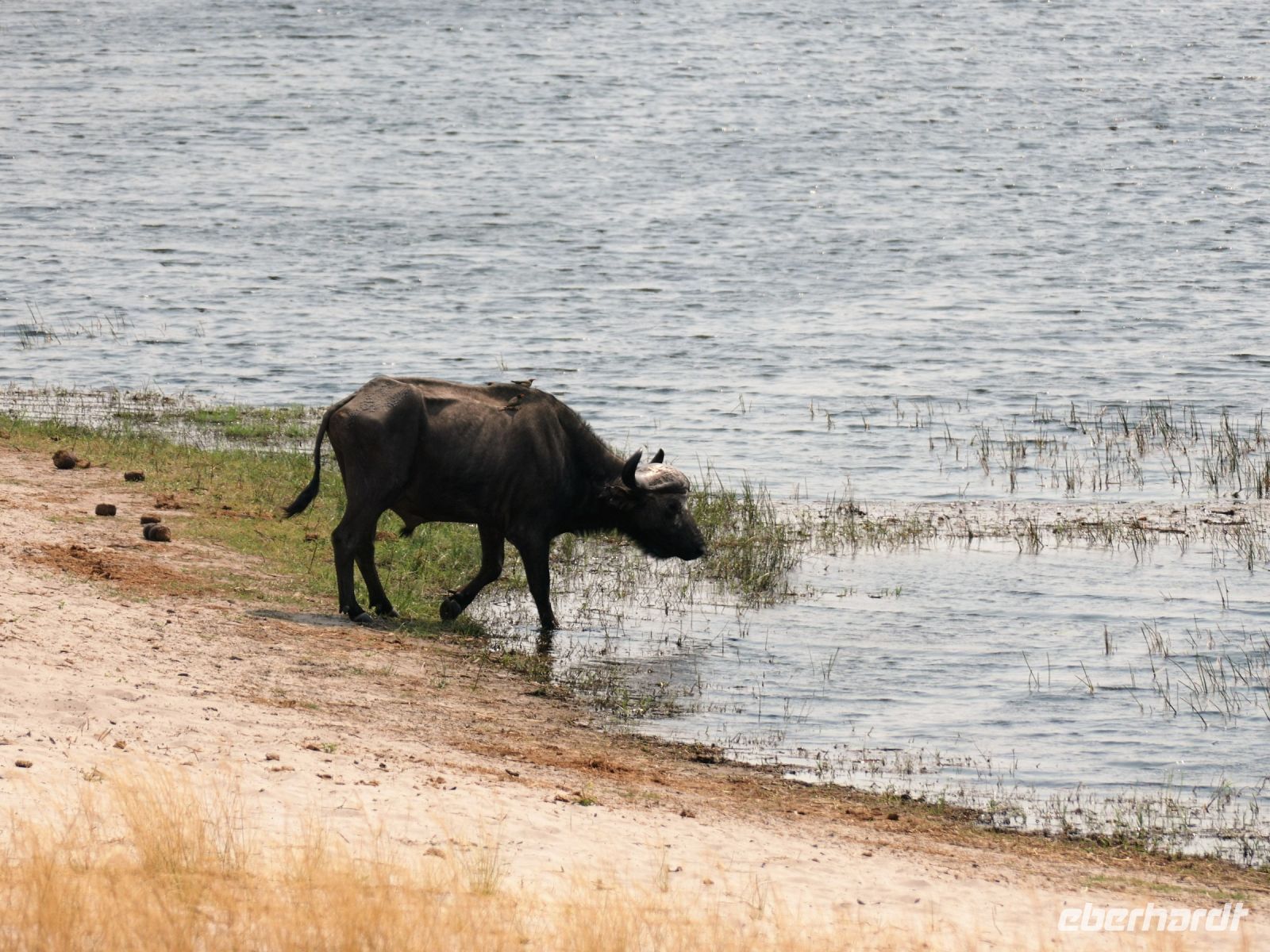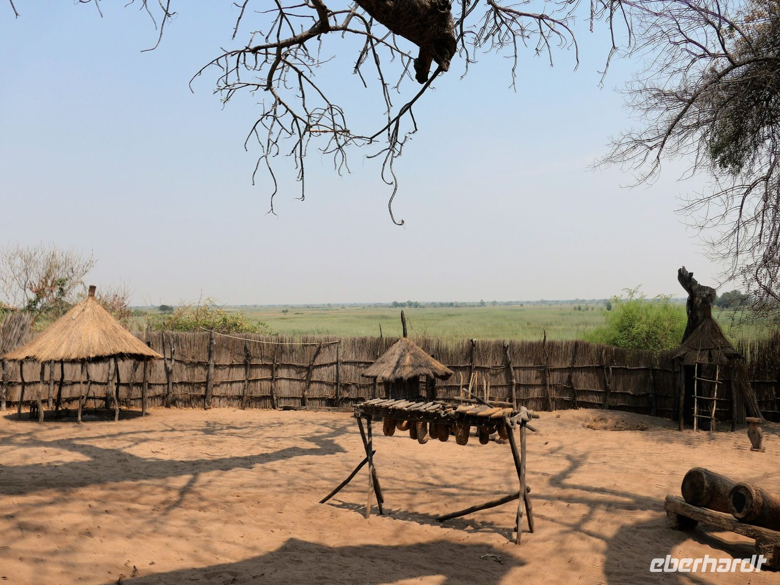 Heute konnten wir ausschlafen, dennoch wurden viele vom Zwitschern der Vögel schon früher geweckt. Zum späten Frühstück begrüßte uns eine Büffelherde, später kam noch ein Krokodil vorbei. In den hohen Bäumen hingen Fledermäuse ab. Unsere Reise ging heute weiter in die Chobe Region. Doch zunächst besuchten wir noch das benachbarte Namushasha Culture Village, ein lebendiges Museumsdorf. Unter einem ca. 1.000 bis 1.500 Jahre alten Baobab erhielten wir von einem Stammesmitglied Einblicke in die Kultur und frühere Lebensweise der Clans: Wie ist so ein Dorf aufgebaut, wie baut man Häuser, wie wohnt man, wer geht welcher Arbeit nach, wie baut und stellt man Fallen, was wird gekocht, gegessen und wie wird getanzt und gesungen. Auch dieser Besuch war interessant und spannend, zumal wir verschiedene Dinge auch selbst ausprobieren konnten, wie Mais stampfen, Fallen stellen oder der "Busch-Trommel" Geräusche zu entlocken, um Flusspferde nachzuahmen und somit zu verscheuchen. Spontan entscheiden wir uns einen anderen Weg zu unserer nächsten Lodge einzuschlagen. Wir fahren nicht erst zurück nach Kongola und fahren die direkte Transitstraße nach Katima Mulilo, sondern fahren auf der erst und Ngoma, sondern fahren die landschaftlich schöner Strecke via Sangwali. Diese Strecke ist seit kurzem vollständig asphaltiert und bequem passierbar. Wir folgten also dem Kwando, der hier den Bogen nach Süden schlägt und Linyanti genannt wird. Via kleiner Nationalparks und entlang der Linyanti Sümpfe an der Grenze zu Botswana begaben wir uns auf die Spuren von David Livingstone. Auf seinen Entdeckungsreise zu den Victoria Wasserfällen kam der berühmte Afrika-Forscher in dieser Region vorbei. Bei Sangwali, ein unscheinbarer Ort, traf Livingstone damals auf den mächtigen Häuptling des Makololo Stammes, der das hier ansässige Volk der Mayeyi als Sklaven unterdrückte. Ein sehr historischer Ort, an dem ein kleines Museum und ein Baobab mit den Initialien von Livingstone noch heute erinnern. Wer mehr darüber erfahren möchte, empfehle ich die Bücher von Konny von Schmettau, die sich ausführlich mit der Geschichte von Livingstone beschäftigt. Unterwegs gab es viel zu schauen: Steppenzebras, Antilopen, vereinzelt Elefanten und natürlich viele Dörfer in dieser wasserreichen und deshalb dicht besiedelten Region. Es war Samstag und die meisten hatten frei. Rinder sind der Stolz der lokalen Bevölkerung. Je größer die Herde, umso reicher der Familienclan. Das sah man auch an den Dörfern. Der Stierkampf zweier Bullen erinnerte an Spanien, Ole! An den Straßenrändern Massenwanderungen der Locals, mit Plastikstühlen bewaffnet. Sie kamen oder gingen wahrscheinlich zu einer Hochzeit oder Feierlichkeit in den benachbarten Dörfern. Die Distanz kann schon ca. 5 bis 10 km sein, das alles zu Fuß und bei Temperaturen um die 35 °C und mehr - kaum vorstellbar für uns. Nach einem kurzen Tankstopp in Katimo Mulilo, dem Verwaltungssitz der Region gelangen wir an den gewaltigen Sambesi, parallel fuhren wir nach Ngoma. Der Kwando (Linyanti), der sich zunächst in südlicher Richtung abwandte, trafen wir in Ngoma wieder. Ab hier heißt der Linyanti dann Chobe. Wir sahen bereits, dass er sehr wenig Wasser führt, extrem wenig für diese Zeit. Kurz vor der Ngoma Bridge bogen wir links ab. Am namibischen Ufer des Chobe befindet sich unsere nächste Unterkunft, das Chobe River Camp, das Camp der langen Wege. Wir bezogen unsere