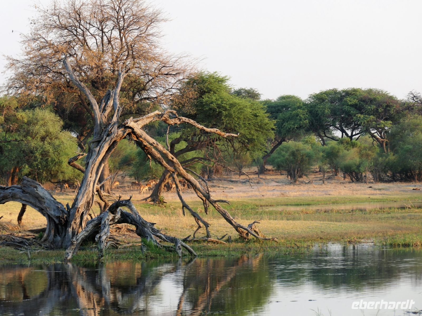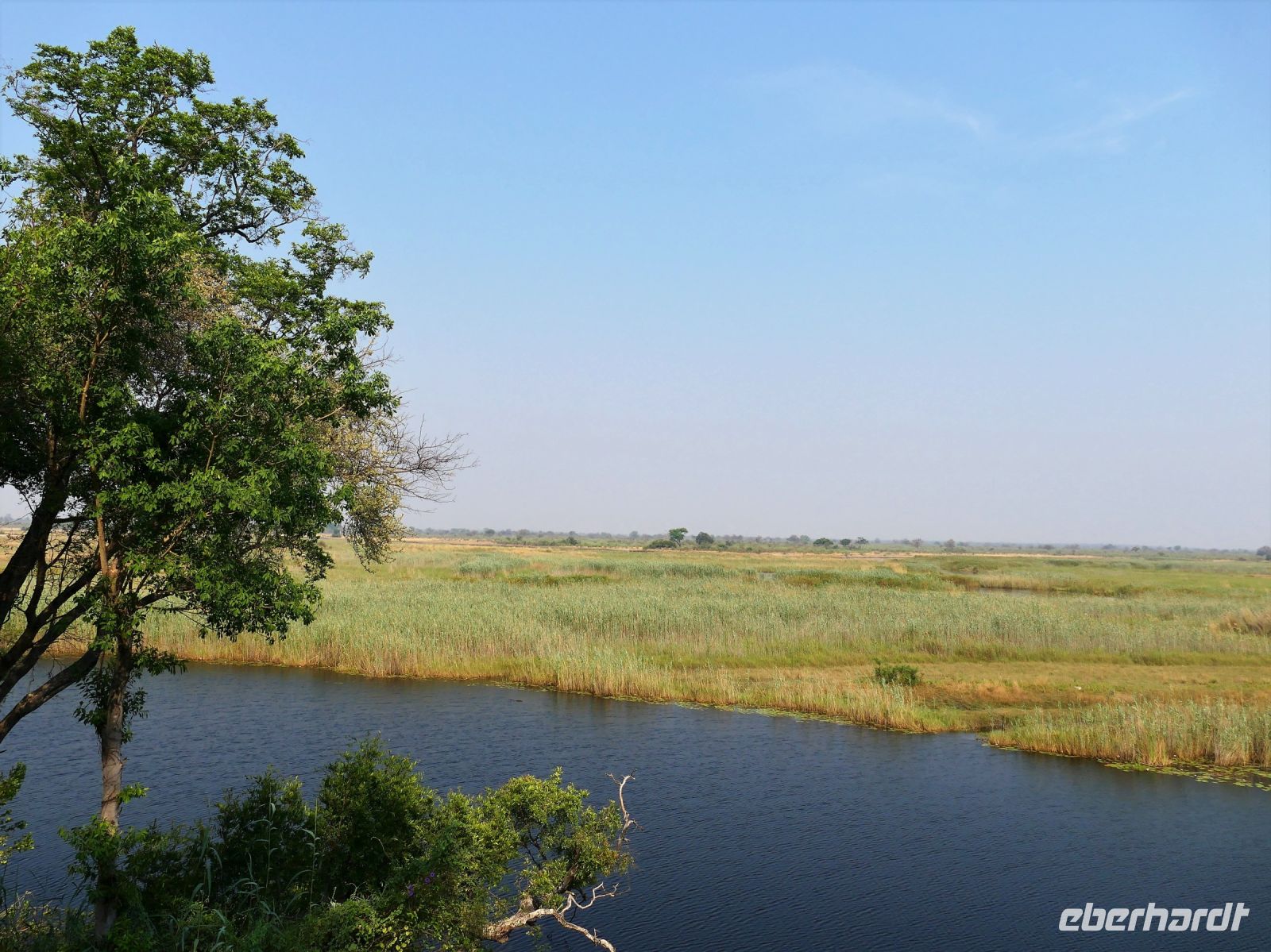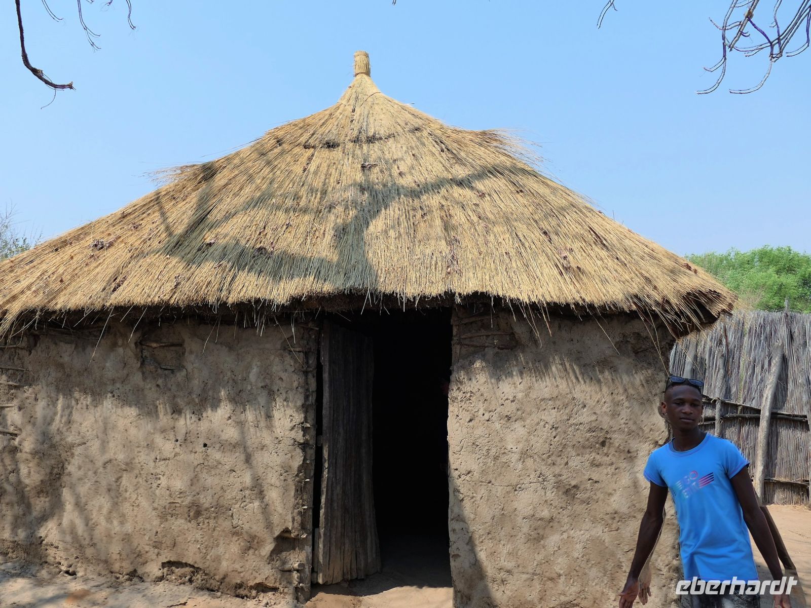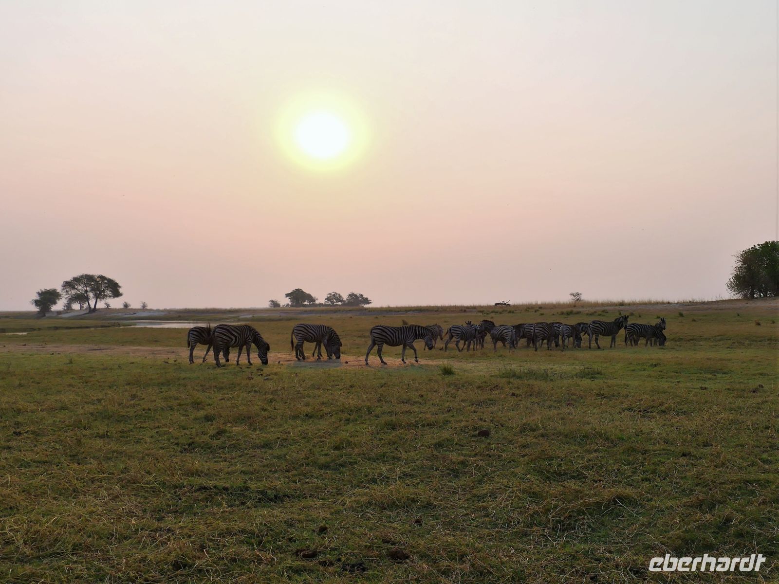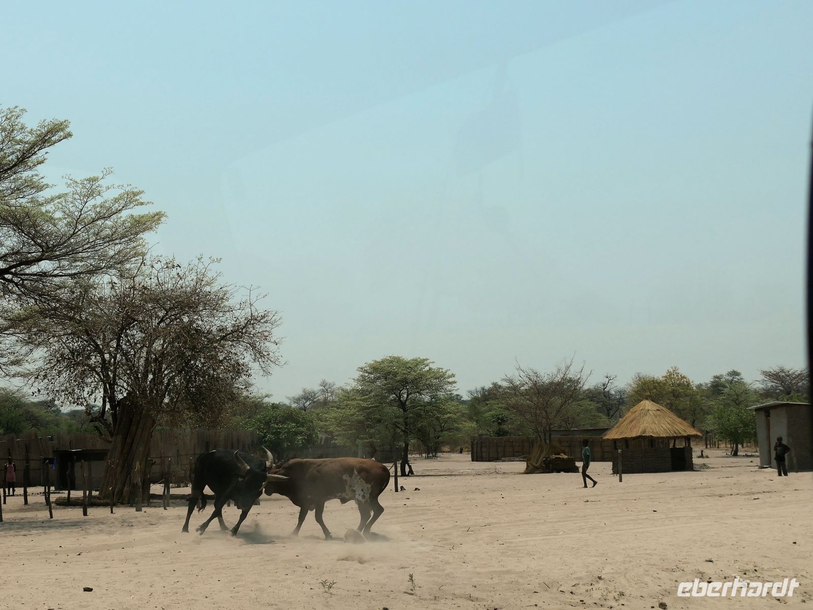 Heute konnten wir ausschlafen, dennoch wurden viele vom Zwitschern der Vögel schon früher geweckt. Zum späten Frühstück begrüßte uns eine Büffelherde, später kam noch ein Krokodil vorbei. In den hohen Bäumen hingen Fledermäuse ab. Unsere Reise ging heute weiter in die Chobe Region. Doch zunächst besuchten wir noch das benachbarte Namushasha Culture Village, ein lebendiges Museumsdorf. Unter einem ca. 1.000 bis 1.500 Jahre alten Baobab erhielten wir von einem Stammesmitglied Einblicke in die Kultur und frühere Lebensweise der Clans: Wie ist so ein Dorf aufgebaut, wie baut man Häuser, wie wohnt man, wer geht welcher Arbeit nach, wie baut und stellt man Fallen, was wird gekocht, gegessen und wie wird getanzt und gesungen. Auch dieser Besuch war interessant und spannend, zumal wir verschiedene Dinge auch selbst ausprobieren konnten, wie Mais stampfen, Fallen stellen oder der "Busch-Trommel" Geräusche zu entlocken, um Flusspferde nachzuahmen und somit zu verscheuchen. Spontan entscheiden wir uns einen anderen Weg zu unserer nächsten Lodge einzuschlagen. Wir fahren nicht erst zurück nach Kongola und fahren die direkte Transitstraße nach Katima Mulilo, sondern fahren auf der erst und Ngoma, sondern fahren die landschaftlich schöner Strecke via Sangwali. Diese Strecke ist seit kurzem vollständig asphaltiert und bequem passierbar. Wir folgten also dem Kwando, der hier den Bogen nach Süden schlägt und Linyanti genannt wird. Via kleiner Nationalparks und entlang der Linyanti Sümpfe an der Grenze zu Botswana begaben wir uns auf die Spuren von David Livingstone. Auf seinen Entdeckungsreise zu den Victoria Wasserfällen kam der berühmte Afrika-Forscher in dieser Region vorbei. Bei Sangwali, ein unscheinbarer Ort, traf Livingstone damals auf den mächtigen Häuptling des Makololo Stammes, der das hier ansässige Volk der Mayeyi als Sklaven unterdrückte. Ein sehr historischer Ort, an dem ein kleines Museum und ein Baobab mit den Initialien von Livingstone noch heute erinnern. Wer mehr darüber erfahren möchte, empfehle ich die Bücher von Konny von Schmettau, die sich ausführlich mit der Geschichte von Livingstone beschäftigt. Unterwegs gab es viel zu schauen: Steppenzebras, Antilopen, vereinzelt Elefanten und natürlich viele Dörfer in dieser wasserreichen und deshalb dicht besiedelten Region. Es war Samstag und die meisten hatten frei. Rinder sind der Stolz der lokalen Bevölkerung. Je größer die Herde, umso reicher der Familienclan. Das sah man auch an den Dörfern. Der Stierkampf zweier Bullen erinnerte an Spanien, Ole! An den Straßenrändern Massenwanderungen der Locals, mit Plastikstühlen bewaffnet. Sie kamen oder gingen wahrscheinlich zu einer Hochzeit oder Feierlichkeit in den benachbarten Dörfern. Die Distanz kann schon ca. 5 bis 10 km sein, das alles zu Fuß und bei Temperaturen um die 35 °C und mehr - kaum vorstellbar für uns. Nach einem kurzen Tankstopp in Katimo Mulilo, dem Verwaltungssitz der Region gelangen wir an den gewaltigen Sambesi, parallel fuhren wir nach Ngoma. Der Kwando (Linyanti), der sich zunächst in südlicher Richtung abwandte, trafen wir in Ngoma wieder. Ab hier heißt der Linyanti dann Chobe. Wir sahen bereits, dass er sehr wenig Wasser führt, extrem wenig für diese Zeit. Kurz vor der Ngoma Bridge bogen wir links ab. Am namibischen Ufer des Chobe befindet sich unsere nächste Unterkunft, das Chobe River Camp, das Camp der langen Wege. Wir bezogen unsere