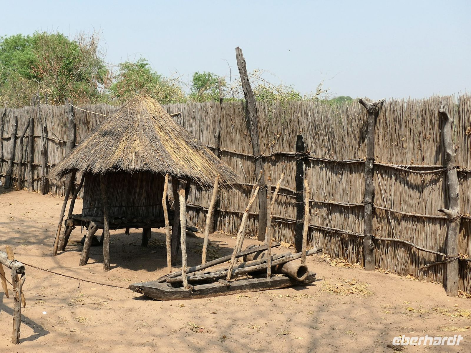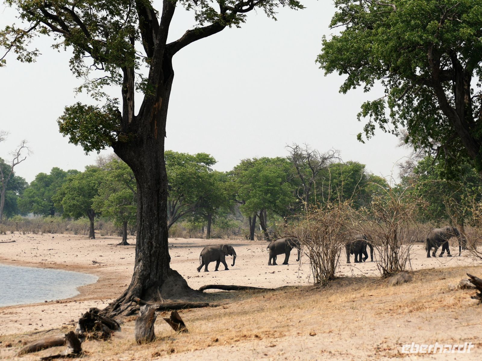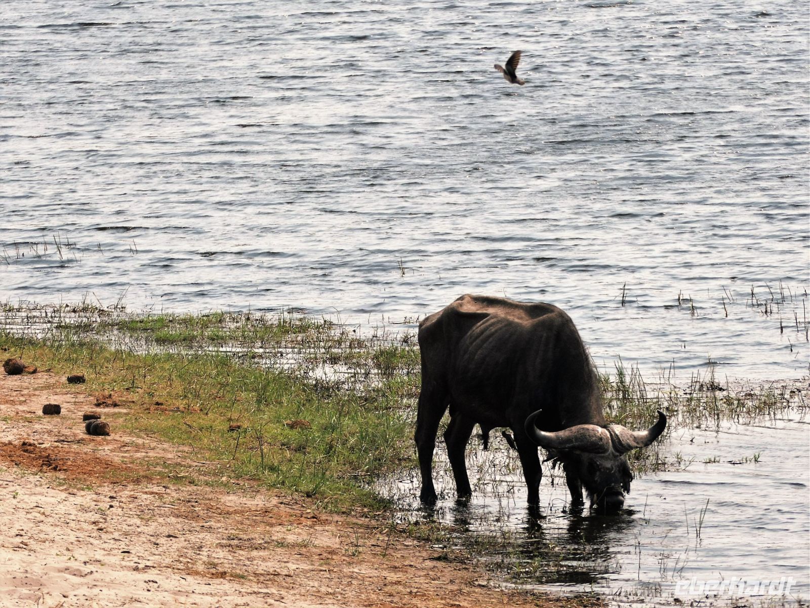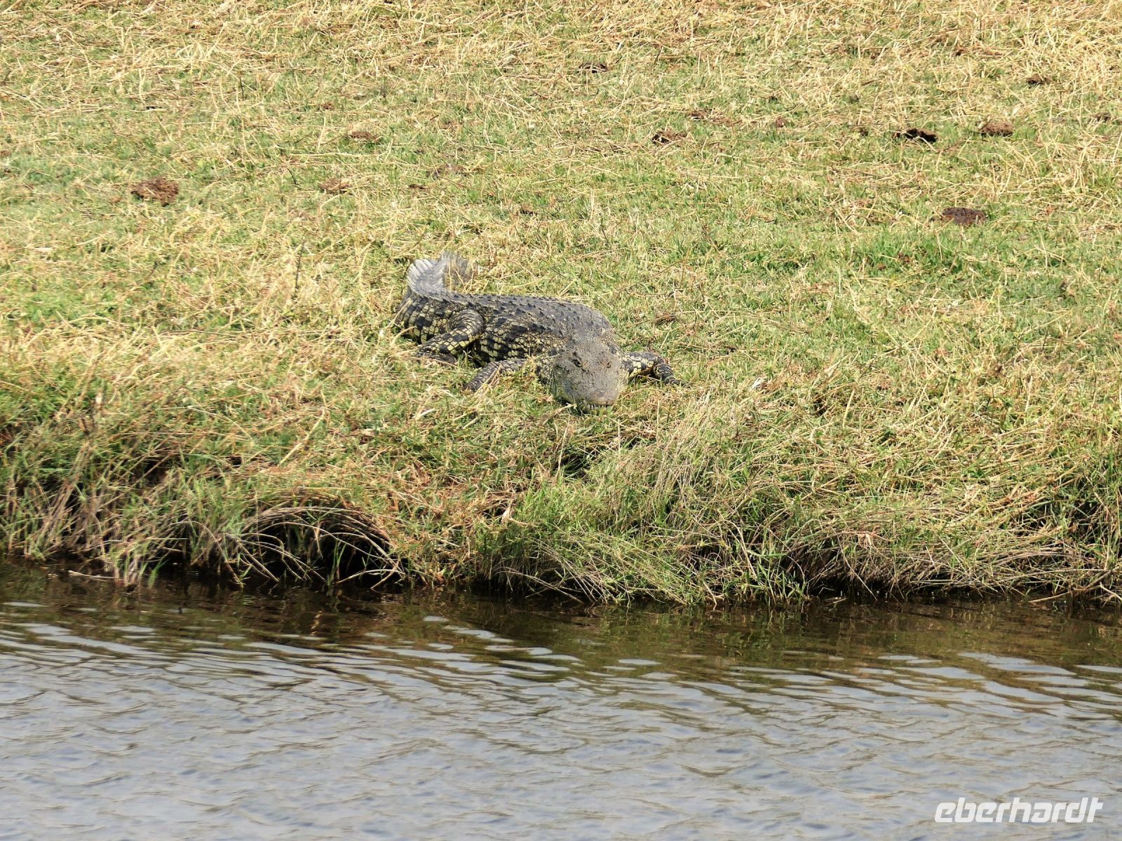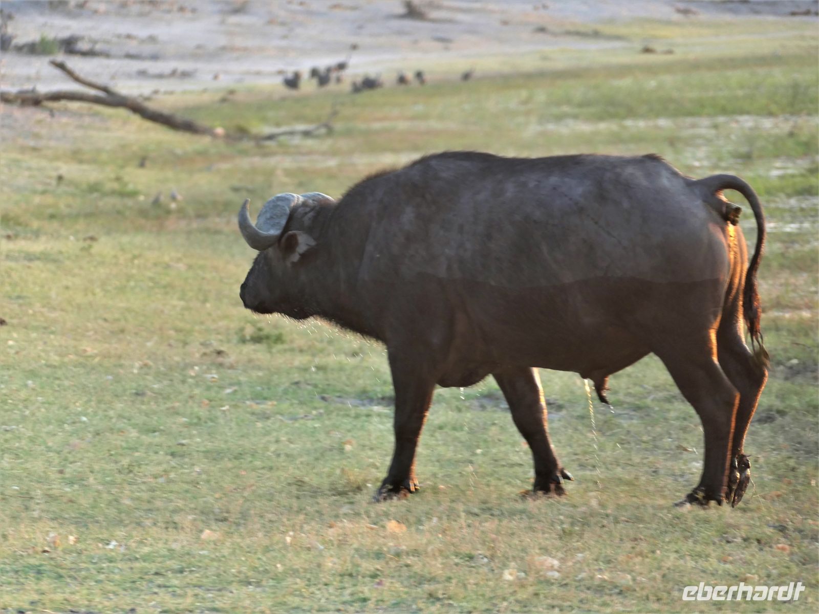 Heute konnten wir ausschlafen, dennoch wurden viele vom Zwitschern der Vögel schon früher geweckt. Zum späten Frühstück begrüßte uns eine Büffelherde, später kam noch ein Krokodil vorbei. In den hohen Bäumen hingen Fledermäuse ab. Unsere Reise ging heute weiter in die Chobe Region. Doch zunächst besuchten wir noch das benachbarte Namushasha Culture Village, ein lebendiges Museumsdorf. Unter einem ca. 1.000 bis 1.500 Jahre alten Baobab erhielten wir von einem Stammesmitglied Einblicke in die Kultur und frühere Lebensweise der Clans: Wie ist so ein Dorf aufgebaut, wie baut man Häuser, wie wohnt man, wer geht welcher Arbeit nach, wie baut und stellt man Fallen, was wird gekocht, gegessen und wie wird getanzt und gesungen. Auch dieser Besuch war interessant und spannend, zumal wir verschiedene Dinge auch selbst ausprobieren konnten, wie Mais stampfen, Fallen stellen oder der "Busch-Trommel" Geräusche zu entlocken, um Flusspferde nachzuahmen und somit zu verscheuchen. Spontan entscheiden wir uns einen anderen Weg zu unserer nächsten Lodge einzuschlagen. Wir fahren nicht erst zurück nach Kongola und fahren die direkte Transitstraße nach Katima Mulilo, sondern fahren auf der erst und Ngoma, sondern fahren die landschaftlich schöner Strecke via Sangwali. Diese Strecke ist seit kurzem vollständig asphaltiert und bequem passierbar. Wir folgten also dem Kwando, der hier den Bogen nach Süden schlägt und Linyanti genannt wird. Via kleiner Nationalparks und entlang der Linyanti Sümpfe an der Grenze zu Botswana begaben wir uns auf die Spuren von David Livingstone. Auf seinen Entdeckungsreise zu den Victoria Wasserfällen kam der berühmte Afrika-Forscher in dieser Region vorbei. Bei Sangwali, ein unscheinbarer Ort, traf Livingstone damals auf den mächtigen Häuptling des Makololo Stammes, der das hier ansässige Volk der Mayeyi als Sklaven unterdrückte. Ein sehr historischer Ort, an dem ein kleines Museum und ein Baobab mit den Initialien von Livingstone noch heute erinnern. Wer mehr darüber erfahren möchte, empfehle ich die Bücher von Konny von Schmettau, die sich ausführlich mit der Geschichte von Livingstone beschäftigt. Unterwegs gab es viel zu schauen: Steppenzebras, Antilopen, vereinzelt Elefanten und natürlich viele Dörfer in dieser wasserreichen und deshalb dicht besiedelten Region. Es war Samstag und die meisten hatten frei. Rinder sind der Stolz der lokalen Bevölkerung. Je größer die Herde, umso reicher der Familienclan. Das sah man auch an den Dörfern. Der Stierkampf zweier Bullen erinnerte an Spanien, Ole! An den Straßenrändern Massenwanderungen der Locals, mit Plastikstühlen bewaffnet. Sie kamen oder gingen wahrscheinlich zu einer Hochzeit oder Feierlichkeit in den benachbarten Dörfern. Die Distanz kann schon ca. 5 bis 10 km sein, das alles zu Fuß und bei Temperaturen um die 35 °C und mehr - kaum vorstellbar für uns. Nach einem kurzen Tankstopp in Katimo Mulilo, dem Verwaltungssitz der Region gelangen wir an den gewaltigen Sambesi, parallel fuhren wir nach Ngoma. Der Kwando (Linyanti), der sich zunächst in südlicher Richtung abwandte, trafen wir in Ngoma wieder. Ab hier heißt der Linyanti dann Chobe. Wir sahen bereits, dass er sehr wenig Wasser führt, extrem wenig für diese Zeit. Kurz vor der Ngoma Bridge bogen wir links ab. Am namibischen Ufer des Chobe befindet sich unsere nächste Unterkunft, das Chobe River Camp, das Camp der langen Wege. Wir bezogen unsere