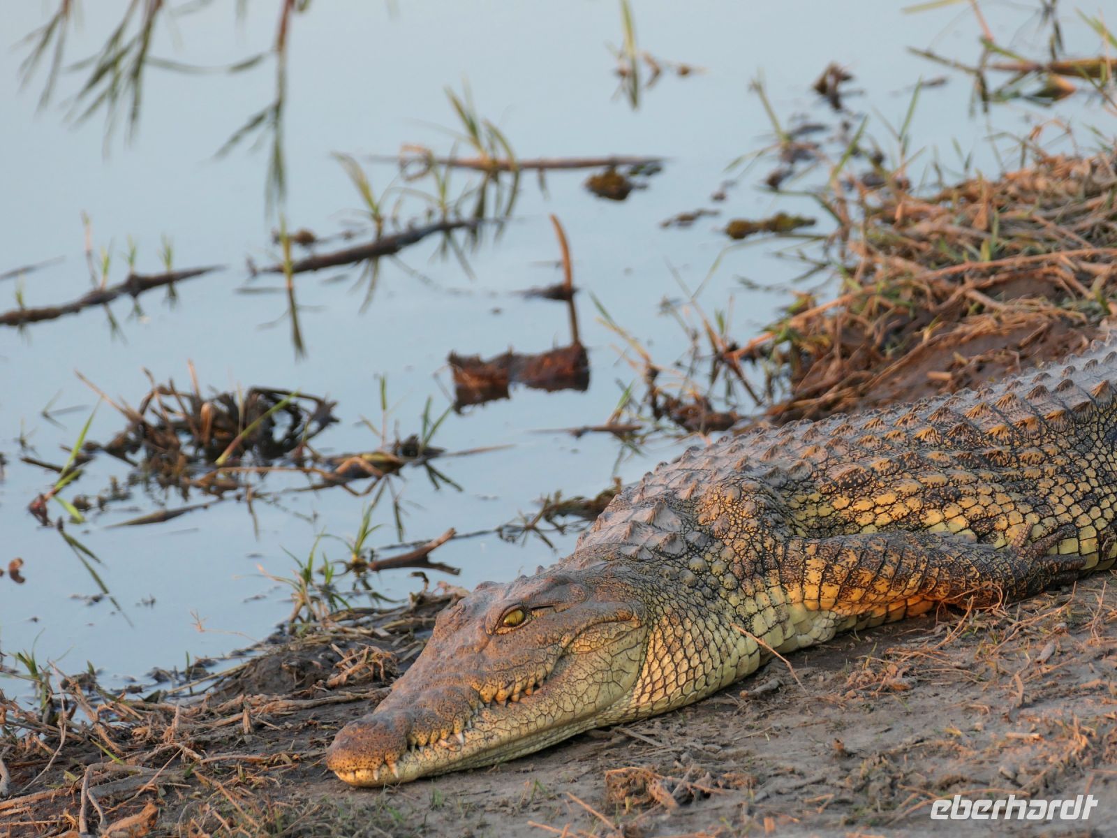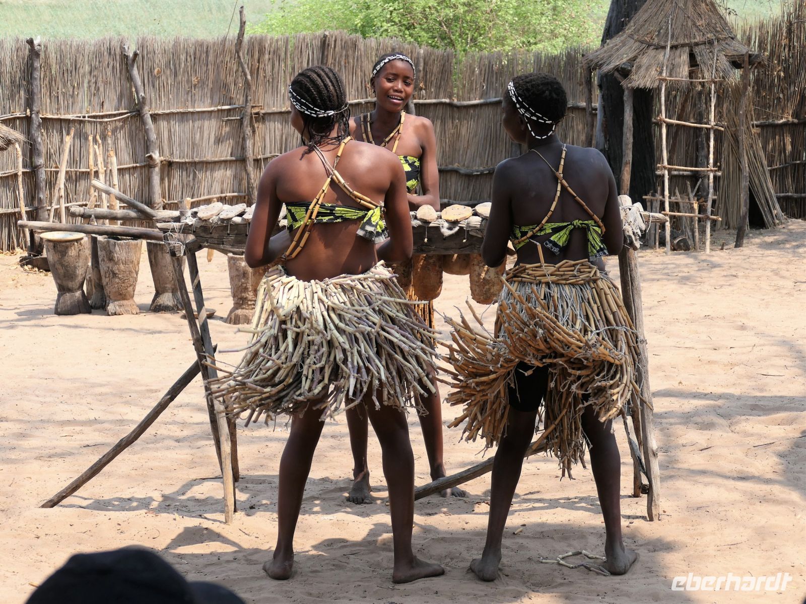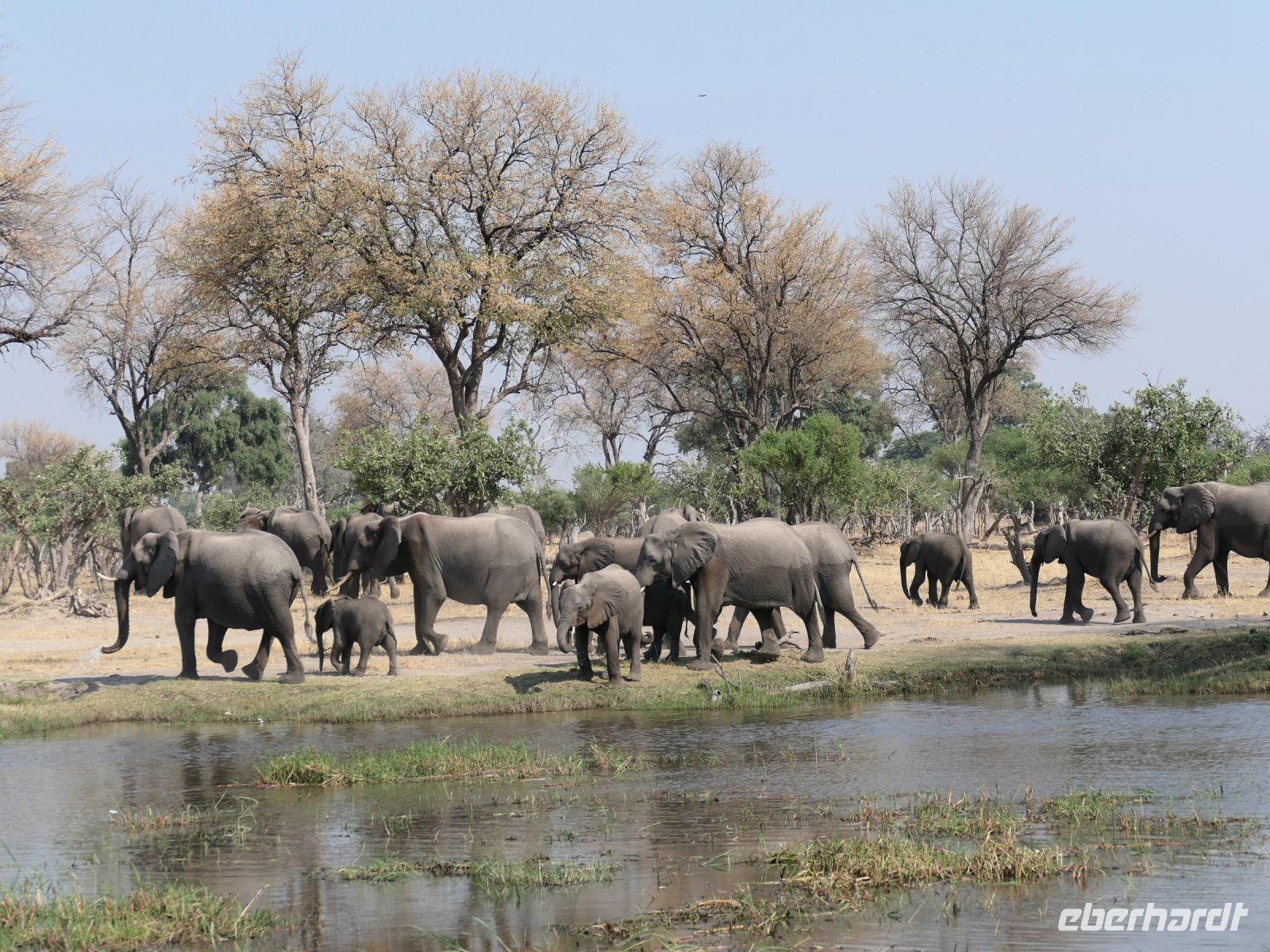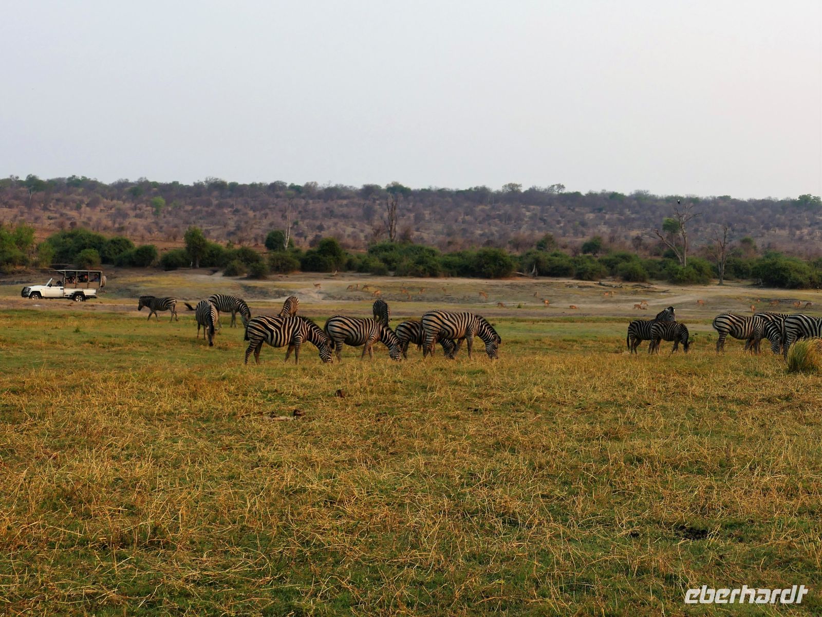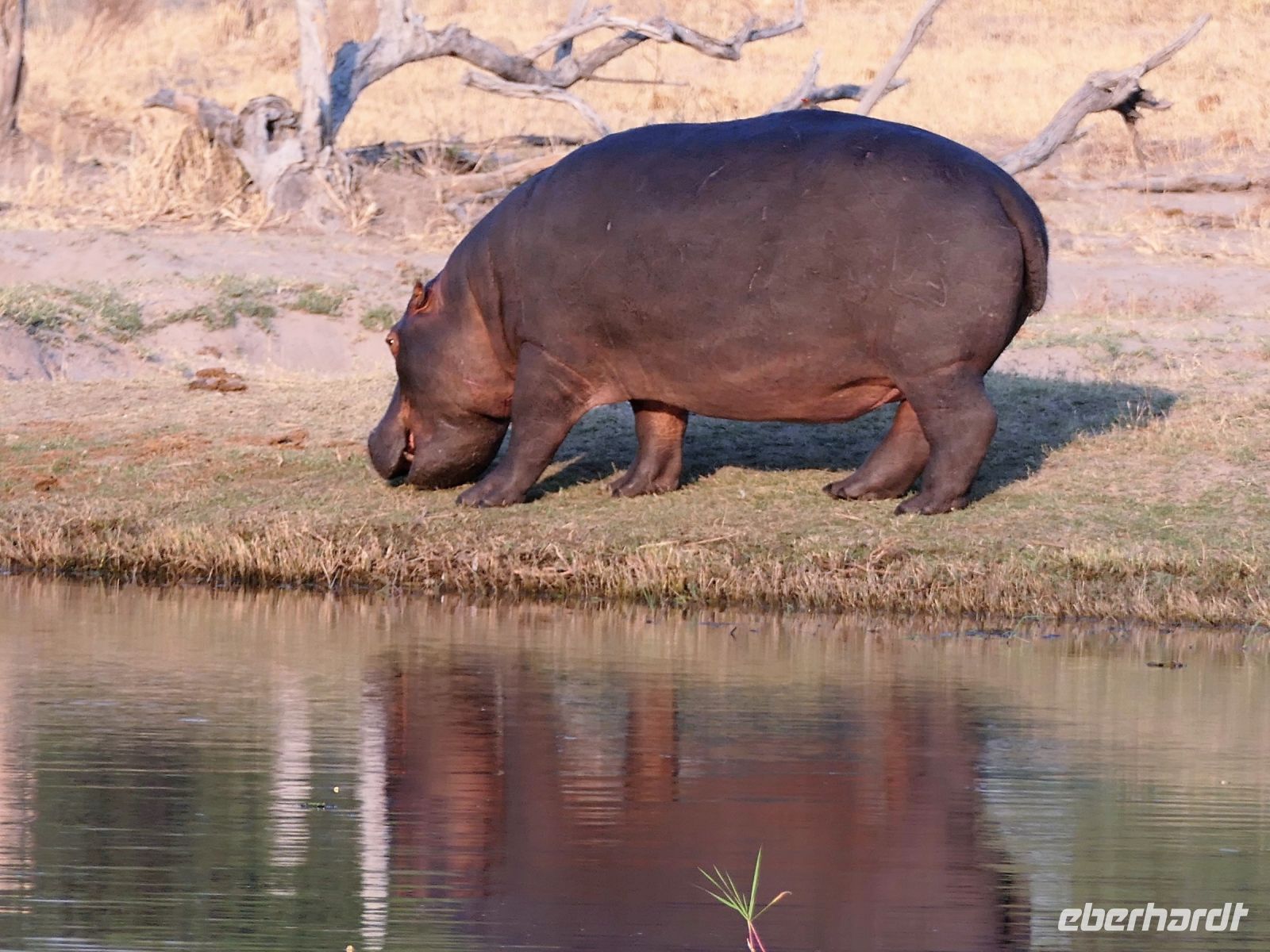 Heute konnten wir ausschlafen, dennoch wurden viele vom Zwitschern der Vögel schon früher geweckt. Zum späten Frühstück begrüßte uns eine Büffelherde, später kam noch ein Krokodil vorbei. In den hohen Bäumen hingen Fledermäuse ab. Unsere Reise ging heute weiter in die Chobe Region. Doch zunächst besuchten wir noch das benachbarte Namushasha Culture Village, ein lebendiges Museumsdorf. Unter einem ca. 1.000 bis 1.500 Jahre alten Baobab erhielten wir von einem Stammesmitglied Einblicke in die Kultur und frühere Lebensweise der Clans: Wie ist so ein Dorf aufgebaut, wie baut man Häuser, wie wohnt man, wer geht welcher Arbeit nach, wie baut und stellt man Fallen, was wird gekocht, gegessen und wie wird getanzt und gesungen. Auch dieser Besuch war interessant und spannend, zumal wir verschiedene Dinge auch selbst ausprobieren konnten, wie Mais stampfen, Fallen stellen oder der "Busch-Trommel" Geräusche zu entlocken, um Flusspferde nachzuahmen und somit zu verscheuchen. Spontan entscheiden wir uns einen anderen Weg zu unserer nächsten Lodge einzuschlagen. Wir fahren nicht erst zurück nach Kongola und fahren die direkte Transitstraße nach Katima Mulilo, sondern fahren auf der erst und Ngoma, sondern fahren die landschaftlich schöner Strecke via Sangwali. Diese Strecke ist seit kurzem vollständig asphaltiert und bequem passierbar. Wir folgten also dem Kwando, der hier den Bogen nach Süden schlägt und Linyanti genannt wird. Via kleiner Nationalparks und entlang der Linyanti Sümpfe an der Grenze zu Botswana begaben wir uns auf die Spuren von David Livingstone. Auf seinen Entdeckungsreise zu den Victoria Wasserfällen kam der berühmte Afrika-Forscher in dieser Region vorbei. Bei Sangwali, ein unscheinbarer Ort, traf Livingstone damals auf den mächtigen Häuptling des Makololo Stammes, der das hier ansässige Volk der Mayeyi als Sklaven unterdrückte. Ein sehr historischer Ort, an dem ein kleines Museum und ein Baobab mit den Initialien von Livingstone noch heute erinnern. Wer mehr darüber erfahren möchte, empfehle ich die Bücher von Konny von Schmettau, die sich ausführlich mit der Geschichte von Livingstone beschäftigt. Unterwegs gab es viel zu schauen: Steppenzebras, Antilopen, vereinzelt Elefanten und natürlich viele Dörfer in dieser wasserreichen und deshalb dicht besiedelten Region. Es war Samstag und die meisten hatten frei. Rinder sind der Stolz der lokalen Bevölkerung. Je größer die Herde, umso reicher der Familienclan. Das sah man auch an den Dörfern. Der Stierkampf zweier Bullen erinnerte an Spanien, Ole! An den Straßenrändern Massenwanderungen der Locals, mit Plastikstühlen bewaffnet. Sie kamen oder gingen wahrscheinlich zu einer Hochzeit oder Feierlichkeit in den benachbarten Dörfern. Die Distanz kann schon ca. 5 bis 10 km sein, das alles zu Fuß und bei Temperaturen um die 35 °C und mehr - kaum vorstellbar für uns. Nach einem kurzen Tankstopp in Katimo Mulilo, dem Verwaltungssitz der Region gelangen wir an den gewaltigen Sambesi, parallel fuhren wir nach Ngoma. Der Kwando (Linyanti), der sich zunächst in südlicher Richtung abwandte, trafen wir in Ngoma wieder. Ab hier heißt der Linyanti dann Chobe. Wir sahen bereits, dass er sehr wenig Wasser führt, extrem wenig für diese Zeit. Kurz vor der Ngoma Bridge bogen wir links ab. Am namibischen Ufer des Chobe befindet sich unsere nächste Unterkunft, das Chobe River Camp, das Camp der langen Wege. Wir bezogen unsere