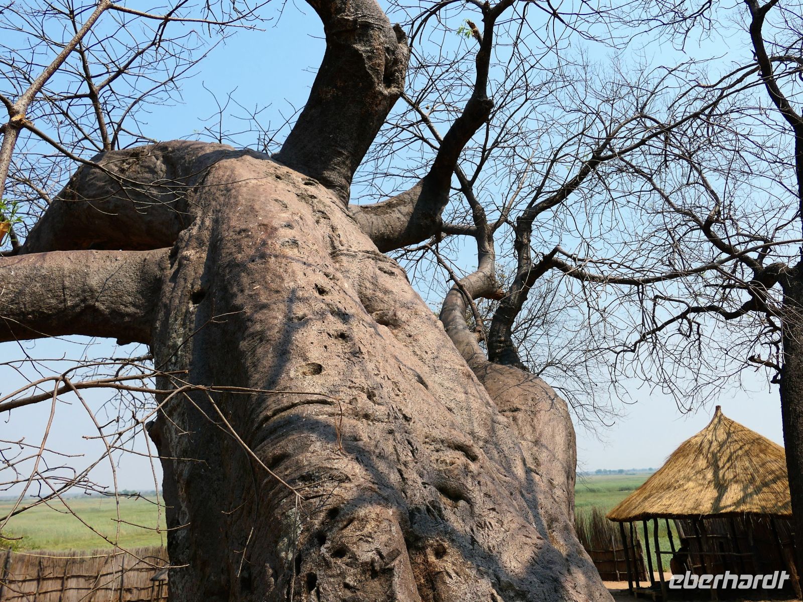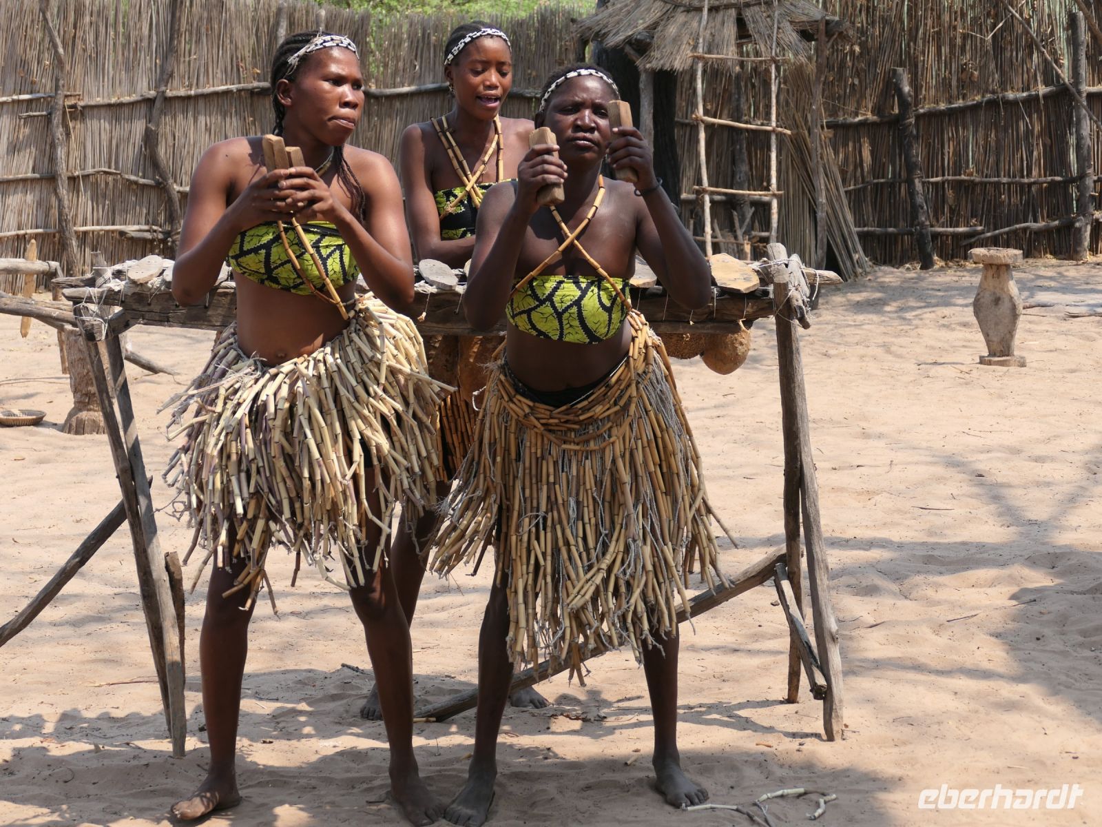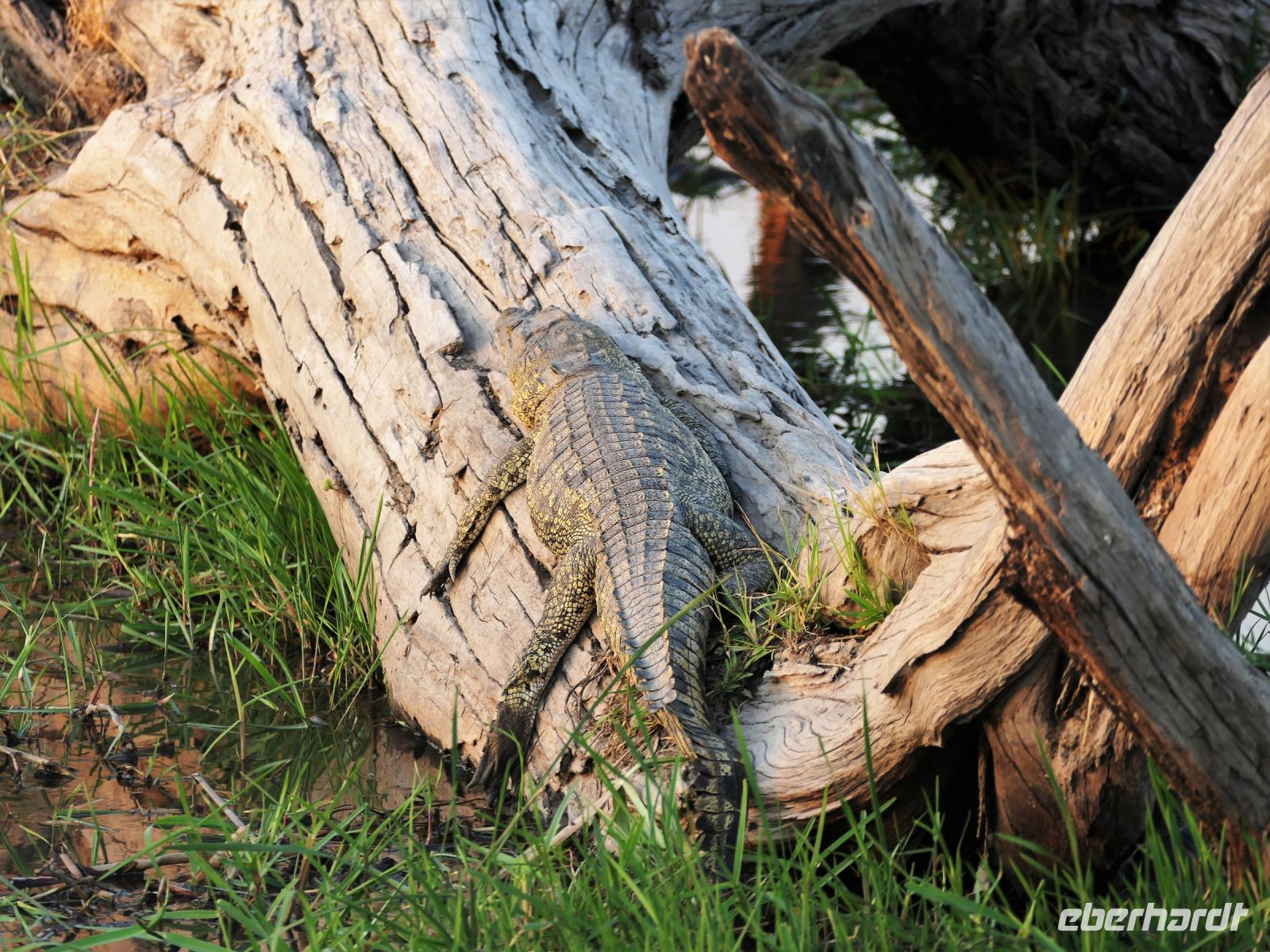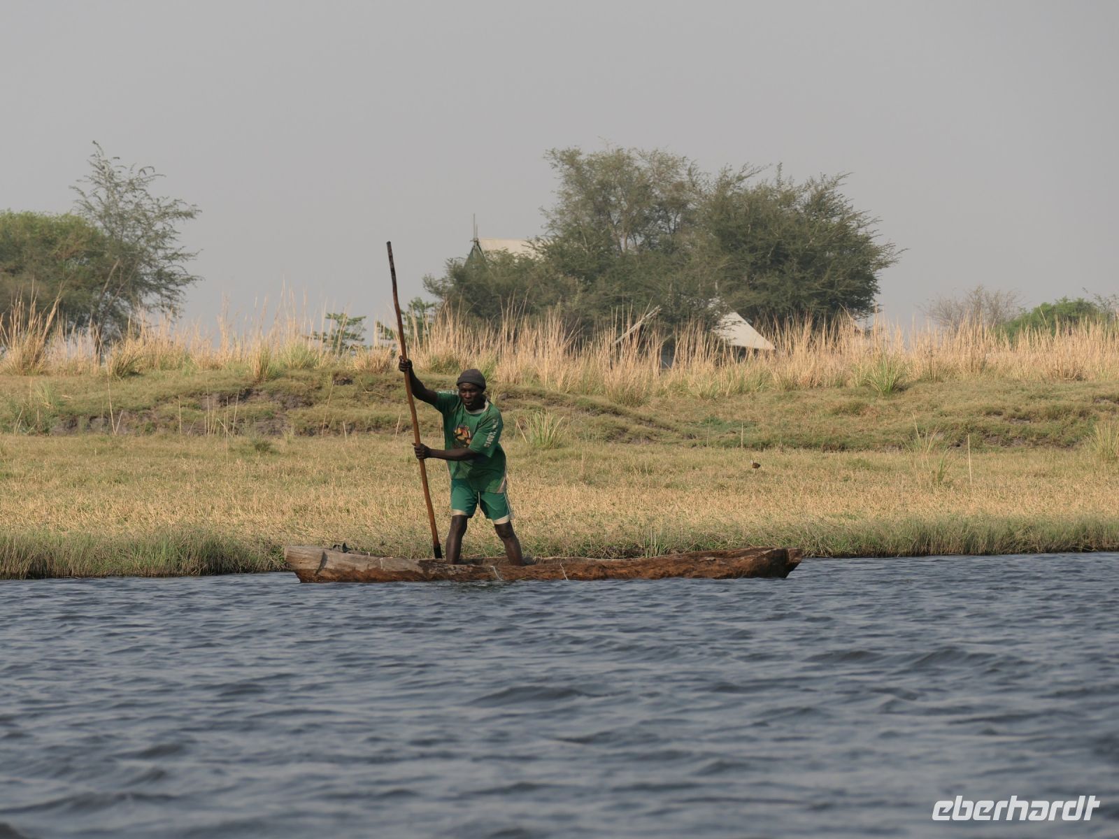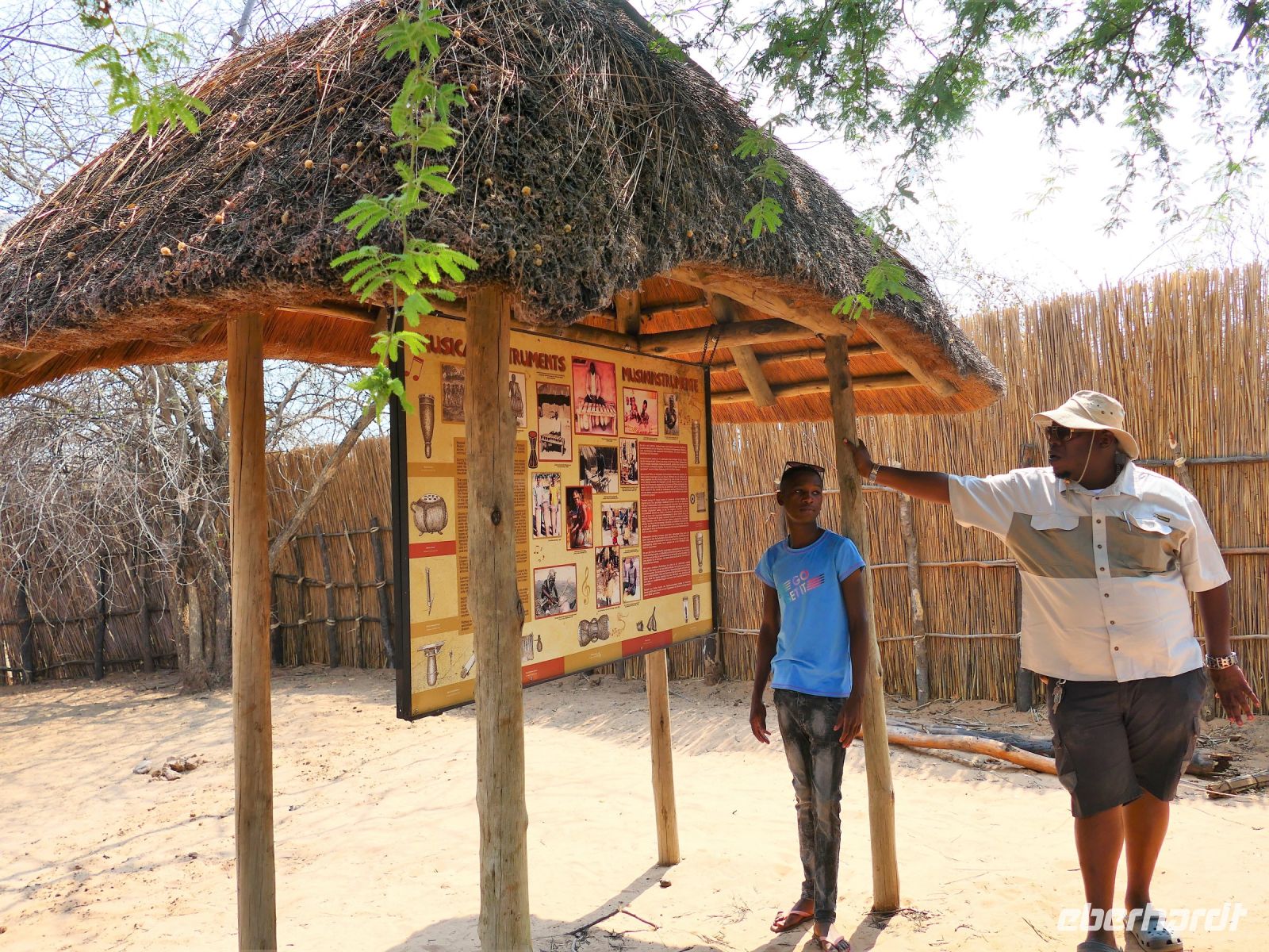 Heute konnten wir ausschlafen, dennoch wurden viele vom Zwitschern der Vögel schon früher geweckt. Zum späten Frühstück begrüßte uns eine Büffelherde, später kam noch ein Krokodil vorbei. In den hohen Bäumen hingen Fledermäuse ab. Unsere Reise ging heute weiter in die Chobe Region. Doch zunächst besuchten wir noch das benachbarte Namushasha Culture Village, ein lebendiges Museumsdorf. Unter einem ca. 1.000 bis 1.500 Jahre alten Baobab erhielten wir von einem Stammesmitglied Einblicke in die Kultur und frühere Lebensweise der Clans: Wie ist so ein Dorf aufgebaut, wie baut man Häuser, wie wohnt man, wer geht welcher Arbeit nach, wie baut und stellt man Fallen, was wird gekocht, gegessen und wie wird getanzt und gesungen. Auch dieser Besuch war interessant und spannend, zumal wir verschiedene Dinge auch selbst ausprobieren konnten, wie Mais stampfen, Fallen stellen oder der "Busch-Trommel" Geräusche zu entlocken, um Flusspferde nachzuahmen und somit zu verscheuchen. Spontan entscheiden wir uns einen anderen Weg zu unserer nächsten Lodge einzuschlagen. Wir fahren nicht erst zurück nach Kongola und fahren die direkte Transitstraße nach Katima Mulilo, sondern fahren auf der erst und Ngoma, sondern fahren die landschaftlich schöner Strecke via Sangwali. Diese Strecke ist seit kurzem vollständig asphaltiert und bequem passierbar. Wir folgten also dem Kwando, der hier den Bogen nach Süden schlägt und Linyanti genannt wird. Via kleiner Nationalparks und entlang der Linyanti Sümpfe an der Grenze zu Botswana begaben wir uns auf die Spuren von David Livingstone. Auf seinen Entdeckungsreise zu den Victoria Wasserfällen kam der berühmte Afrika-Forscher in dieser Region vorbei. Bei Sangwali, ein unscheinbarer Ort, traf Livingstone damals auf den mächtigen Häuptling des Makololo Stammes, der das hier ansässige Volk der Mayeyi als Sklaven unterdrückte. Ein sehr historischer Ort, an dem ein kleines Museum und ein Baobab mit den Initialien von Livingstone noch heute erinnern. Wer mehr darüber erfahren möchte, empfehle ich die Bücher von Konny von Schmettau, die sich ausführlich mit der Geschichte von Livingstone beschäftigt. Unterwegs gab es viel zu schauen: Steppenzebras, Antilopen, vereinzelt Elefanten und natürlich viele Dörfer in dieser wasserreichen und deshalb dicht besiedelten Region. Es war Samstag und die meisten hatten frei. Rinder sind der Stolz der lokalen Bevölkerung. Je größer die Herde, umso reicher der Familienclan. Das sah man auch an den Dörfern. Der Stierkampf zweier Bullen erinnerte an Spanien, Ole! An den Straßenrändern Massenwanderungen der Locals, mit Plastikstühlen bewaffnet. Sie kamen oder gingen wahrscheinlich zu einer Hochzeit oder Feierlichkeit in den benachbarten Dörfern. Die Distanz kann schon ca. 5 bis 10 km sein, das alles zu Fuß und bei Temperaturen um die 35 °C und mehr - kaum vorstellbar für uns. Nach einem kurzen Tankstopp in Katimo Mulilo, dem Verwaltungssitz der Region gelangen wir an den gewaltigen Sambesi, parallel fuhren wir nach Ngoma. Der Kwando (Linyanti), der sich zunächst in südlicher Richtung abwandte, trafen wir in Ngoma wieder. Ab hier heißt der Linyanti dann Chobe. Wir sahen bereits, dass er sehr wenig Wasser führt, extrem wenig für diese Zeit. Kurz vor der Ngoma Bridge bogen wir links ab. Am namibischen Ufer des Chobe befindet sich unsere nächste Unterkunft, das Chobe River Camp, das Camp der langen Wege. Wir bezogen unsere