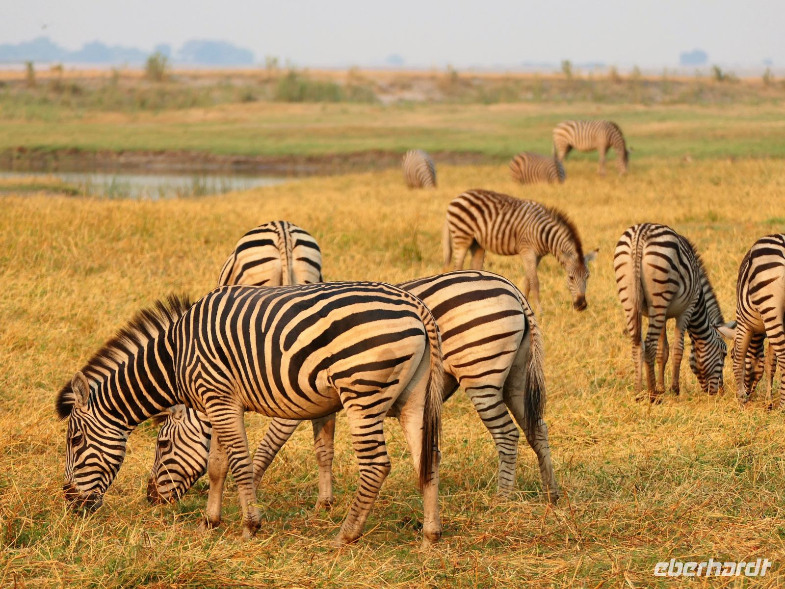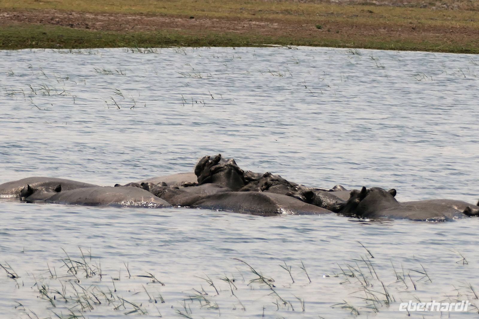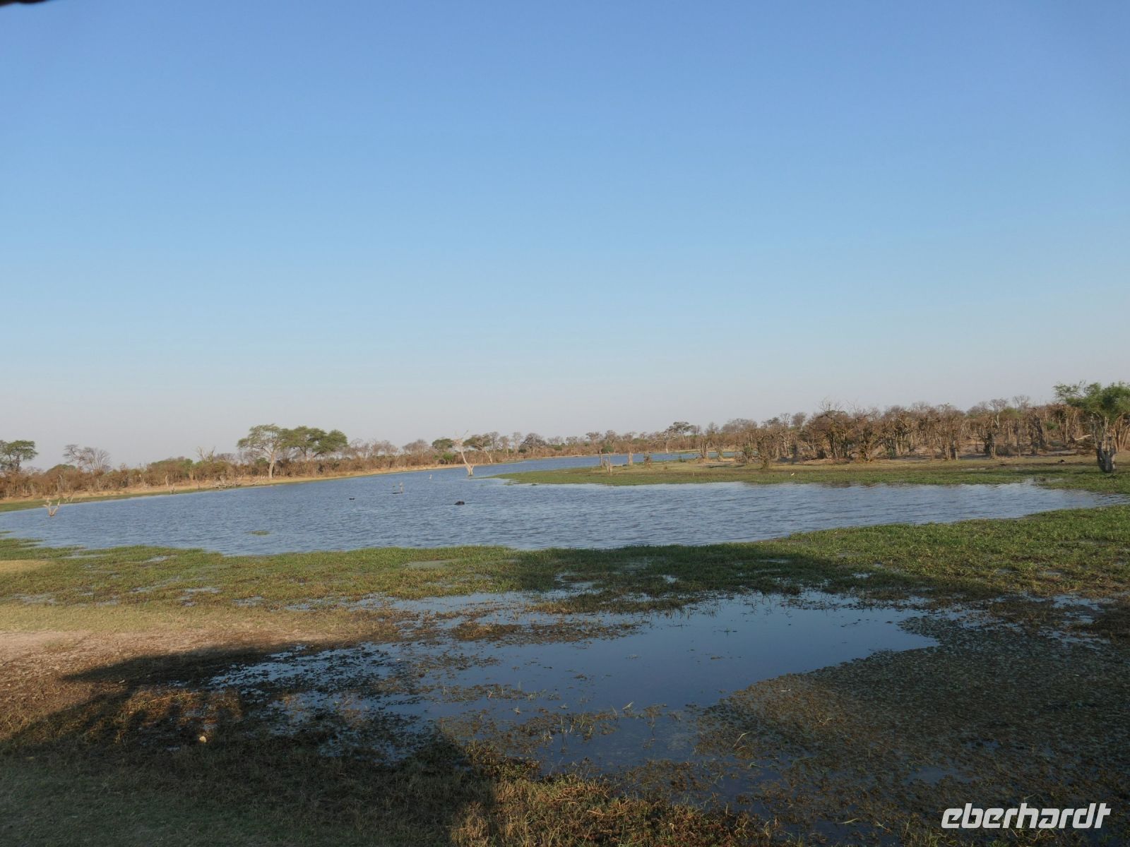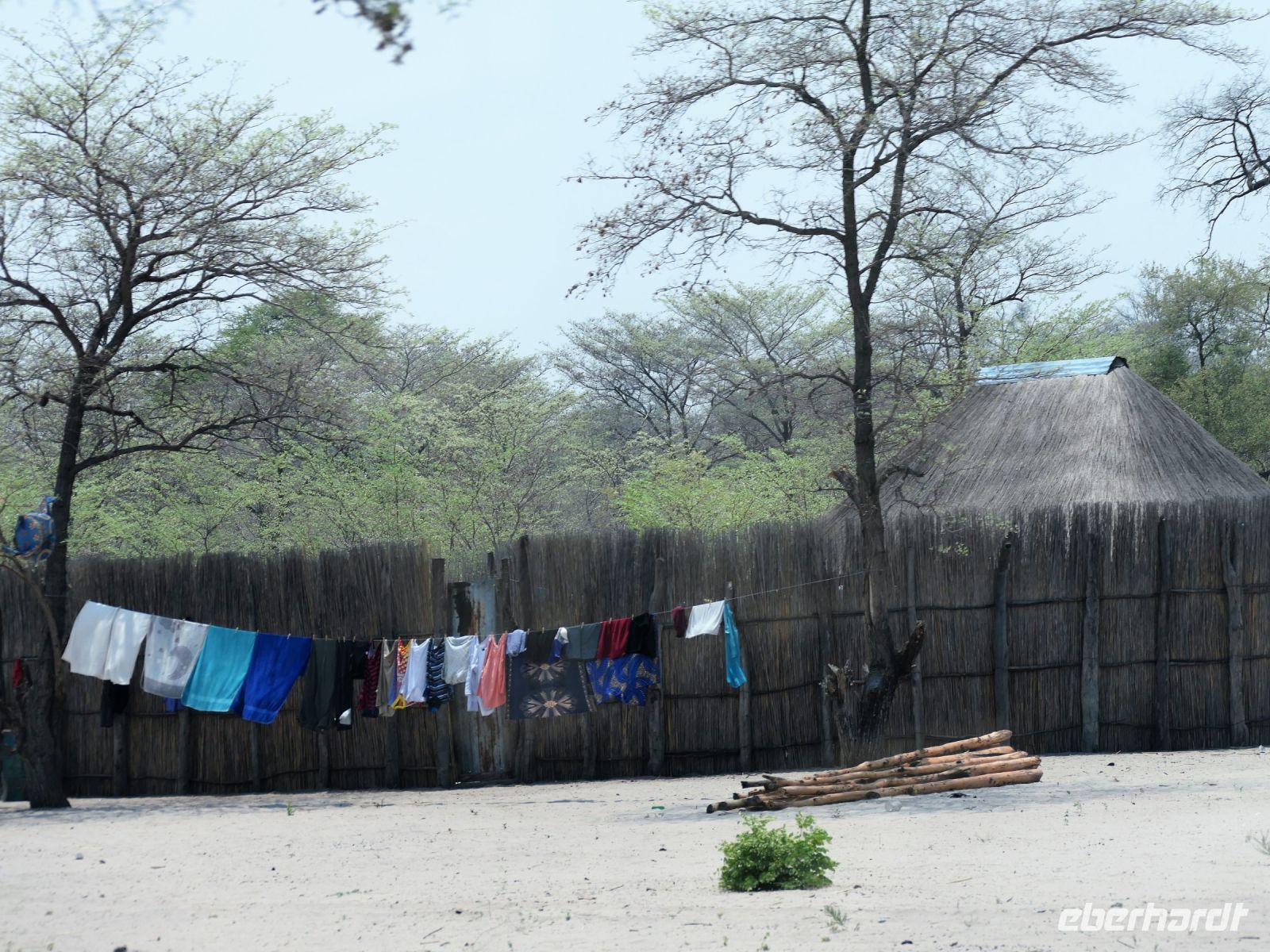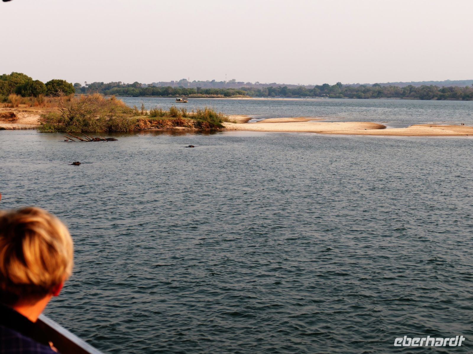 Heute konnten wir ausschlafen, dennoch wurden viele vom Zwitschern der Vögel schon früher geweckt. Zum späten Frühstück begrüßte uns eine Büffelherde, später kam noch ein Krokodil vorbei. In den hohen Bäumen hingen Fledermäuse ab. Unsere Reise ging heute weiter in die Chobe Region. Doch zunächst besuchten wir noch das benachbarte Namushasha Culture Village, ein lebendiges Museumsdorf. Unter einem ca. 1.000 bis 1.500 Jahre alten Baobab erhielten wir von einem Stammesmitglied Einblicke in die Kultur und frühere Lebensweise der Clans: Wie ist so ein Dorf aufgebaut, wie baut man Häuser, wie wohnt man, wer geht welcher Arbeit nach, wie baut und stellt man Fallen, was wird gekocht, gegessen und wie wird getanzt und gesungen. Auch dieser Besuch war interessant und spannend, zumal wir verschiedene Dinge auch selbst ausprobieren konnten, wie Mais stampfen, Fallen stellen oder der "Busch-Trommel" Geräusche zu entlocken, um Flusspferde nachzuahmen und somit zu verscheuchen. Spontan entscheiden wir uns einen anderen Weg zu unserer nächsten Lodge einzuschlagen. Wir fahren nicht erst zurück nach Kongola und fahren die direkte Transitstraße nach Katima Mulilo, sondern fahren auf der erst und Ngoma, sondern fahren die landschaftlich schöner Strecke via Sangwali. Diese Strecke ist seit kurzem vollständig asphaltiert und bequem passierbar. Wir folgten also dem Kwando, der hier den Bogen nach Süden schlägt und Linyanti genannt wird. Via kleiner Nationalparks und entlang der Linyanti Sümpfe an der Grenze zu Botswana begaben wir uns auf die Spuren von David Livingstone. Auf seinen Entdeckungsreise zu den Victoria Wasserfällen kam der berühmte Afrika-Forscher in dieser Region vorbei. Bei Sangwali, ein unscheinbarer Ort, traf Livingstone damals auf den mächtigen Häuptling des Makololo Stammes, der das hier ansässige Volk der Mayeyi als Sklaven unterdrückte. Ein sehr historischer Ort, an dem ein kleines Museum und ein Baobab mit den Initialien von Livingstone noch heute erinnern. Wer mehr darüber erfahren möchte, empfehle ich die Bücher von Konny von Schmettau, die sich ausführlich mit der Geschichte von Livingstone beschäftigt. Unterwegs gab es viel zu schauen: Steppenzebras, Antilopen, vereinzelt Elefanten und natürlich viele Dörfer in dieser wasserreichen und deshalb dicht besiedelten Region. Es war Samstag und die meisten hatten frei. Rinder sind der Stolz der lokalen Bevölkerung. Je größer die Herde, umso reicher der Familienclan. Das sah man auch an den Dörfern. Der Stierkampf zweier Bullen erinnerte an Spanien, Ole! An den Straßenrändern Massenwanderungen der Locals, mit Plastikstühlen bewaffnet. Sie kamen oder gingen wahrscheinlich zu einer Hochzeit oder Feierlichkeit in den benachbarten Dörfern. Die Distanz kann schon ca. 5 bis 10 km sein, das alles zu Fuß und bei Temperaturen um die 35 °C und mehr - kaum vorstellbar für uns. Nach einem kurzen Tankstopp in Katimo Mulilo, dem Verwaltungssitz der Region gelangen wir an den gewaltigen Sambesi, parallel fuhren wir nach Ngoma. Der Kwando (Linyanti), der sich zunächst in südlicher Richtung abwandte, trafen wir in Ngoma wieder. Ab hier heißt der Linyanti dann Chobe. Wir sahen bereits, dass er sehr wenig Wasser führt, extrem wenig für diese Zeit. Kurz vor der Ngoma Bridge bogen wir links ab. Am namibischen Ufer des Chobe befindet sich unsere nächste Unterkunft, das Chobe River Camp, das Camp der langen Wege. Wir bezogen unsere