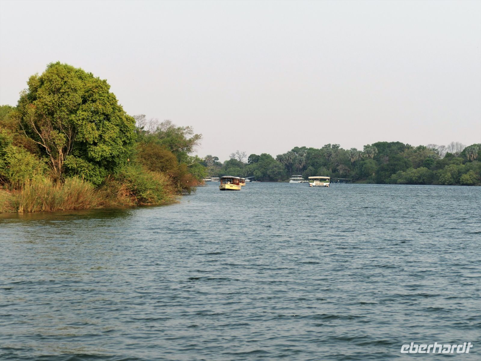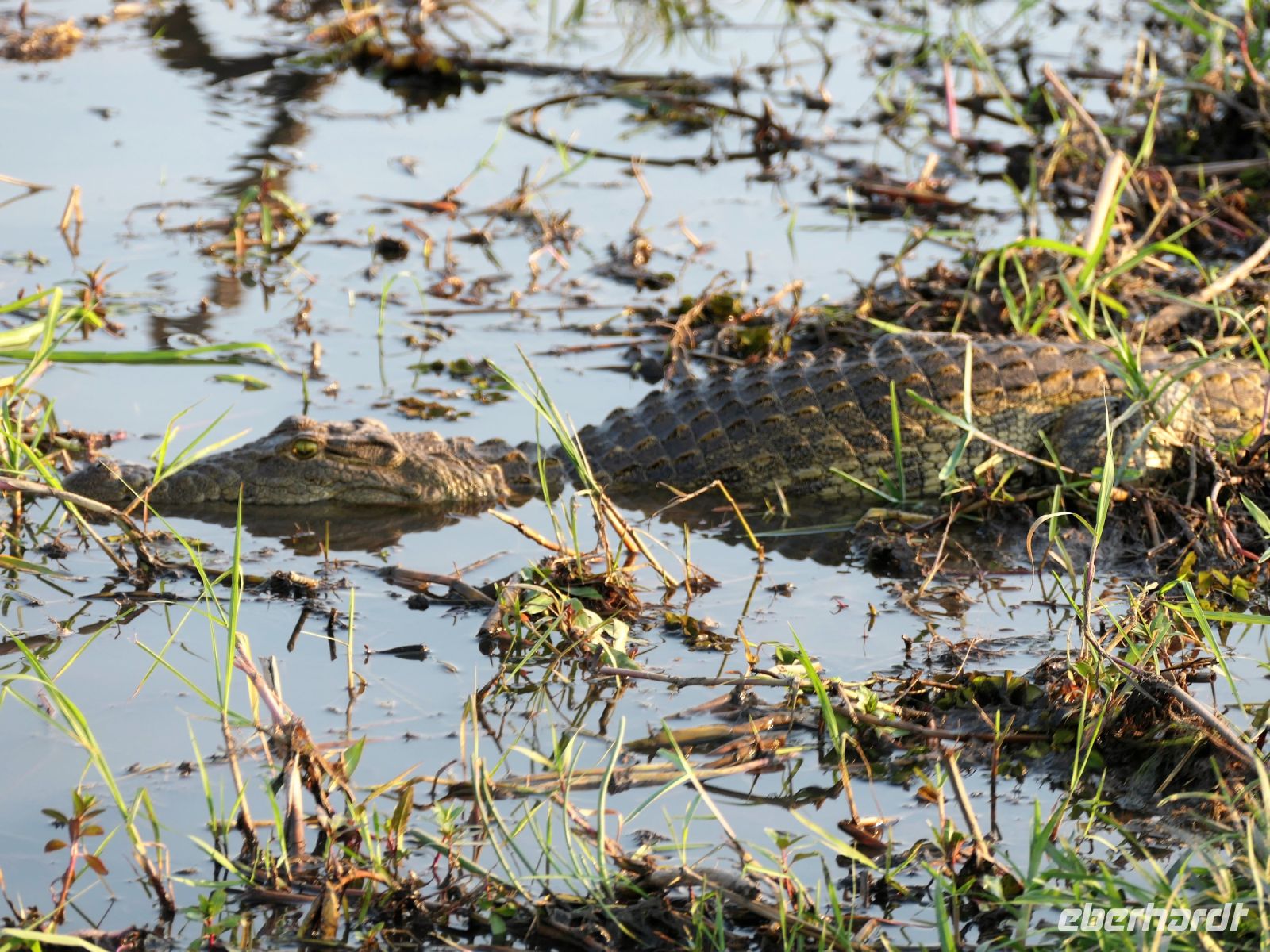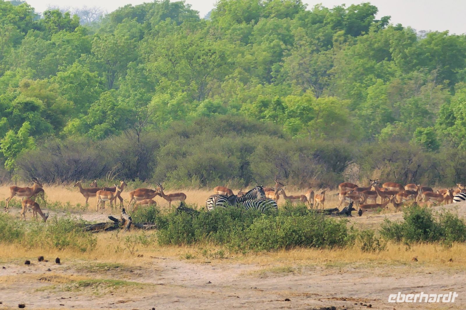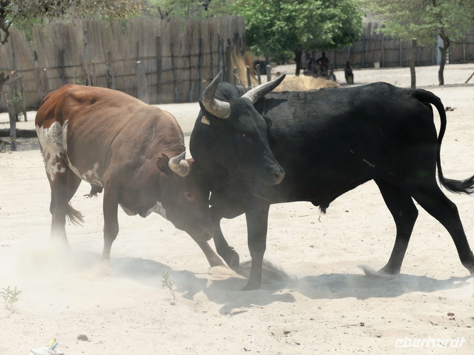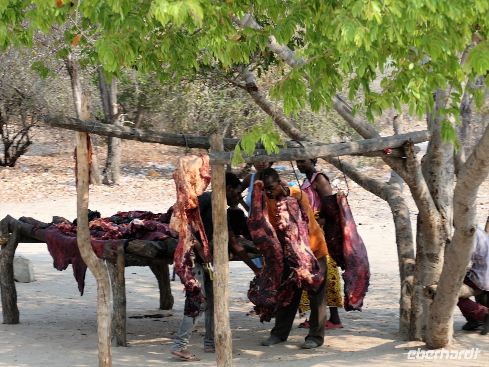 Heute konnten wir ausschlafen, dennoch wurden viele vom Zwitschern der Vögel schon früher geweckt. Zum späten Frühstück begrüßte uns eine Büffelherde, später kam noch ein Krokodil vorbei. In den hohen Bäumen hingen Fledermäuse ab. Unsere Reise ging heute weiter in die Chobe Region. Doch zunächst besuchten wir noch das benachbarte Namushasha Culture Village, ein lebendiges Museumsdorf. Unter einem ca. 1.000 bis 1.500 Jahre alten Baobab erhielten wir von einem Stammesmitglied Einblicke in die Kultur und frühere Lebensweise der Clans: Wie ist so ein Dorf aufgebaut, wie baut man Häuser, wie wohnt man, wer geht welcher Arbeit nach, wie baut und stellt man Fallen, was wird gekocht, gegessen und wie wird getanzt und gesungen. Auch dieser Besuch war interessant und spannend, zumal wir verschiedene Dinge auch selbst ausprobieren konnten, wie Mais stampfen, Fallen stellen oder der "Busch-Trommel" Geräusche zu entlocken, um Flusspferde nachzuahmen und somit zu verscheuchen. Spontan entscheiden wir uns einen anderen Weg zu unserer nächsten Lodge einzuschlagen. Wir fahren nicht erst zurück nach Kongola und fahren die direkte Transitstraße nach Katima Mulilo, sondern fahren auf der erst und Ngoma, sondern fahren die landschaftlich schöner Strecke via Sangwali. Diese Strecke ist seit kurzem vollständig asphaltiert und bequem passierbar. Wir folgten also dem Kwando, der hier den Bogen nach Süden schlägt und Linyanti genannt wird. Via kleiner Nationalparks und entlang der Linyanti Sümpfe an der Grenze zu Botswana begaben wir uns auf die Spuren von David Livingstone. Auf seinen Entdeckungsreise zu den Victoria Wasserfällen kam der berühmte Afrika-Forscher in dieser Region vorbei. Bei Sangwali, ein unscheinbarer Ort, traf Livingstone damals auf den mächtigen Häuptling des Makololo Stammes, der das hier ansässige Volk der Mayeyi als Sklaven unterdrückte. Ein sehr historischer Ort, an dem ein kleines Museum und ein Baobab mit den Initialien von Livingstone noch heute erinnern. Wer mehr darüber erfahren möchte, empfehle ich die Bücher von Konny von Schmettau, die sich ausführlich mit der Geschichte von Livingstone beschäftigt. Unterwegs gab es viel zu schauen: Steppenzebras, Antilopen, vereinzelt Elefanten und natürlich viele Dörfer in dieser wasserreichen und deshalb dicht besiedelten Region. Es war Samstag und die meisten hatten frei. Rinder sind der Stolz der lokalen Bevölkerung. Je größer die Herde, umso reicher der Familienclan. Das sah man auch an den Dörfern. Der Stierkampf zweier Bullen erinnerte an Spanien, Ole! An den Straßenrändern Massenwanderungen der Locals, mit Plastikstühlen bewaffnet. Sie kamen oder gingen wahrscheinlich zu einer Hochzeit oder Feierlichkeit in den benachbarten Dörfern. Die Distanz kann schon ca. 5 bis 10 km sein, das alles zu Fuß und bei Temperaturen um die 35 °C und mehr - kaum vorstellbar für uns. Nach einem kurzen Tankstopp in Katimo Mulilo, dem Verwaltungssitz der Region gelangen wir an den gewaltigen Sambesi, parallel fuhren wir nach Ngoma. Der Kwando (Linyanti), der sich zunächst in südlicher Richtung abwandte, trafen wir in Ngoma wieder. Ab hier heißt der Linyanti dann Chobe. Wir sahen bereits, dass er sehr wenig Wasser führt, extrem wenig für diese Zeit. Kurz vor der Ngoma Bridge bogen wir links ab. Am namibischen Ufer des Chobe befindet sich unsere nächste Unterkunft, das Chobe River Camp, das Camp der langen Wege. Wir bezogen unsere