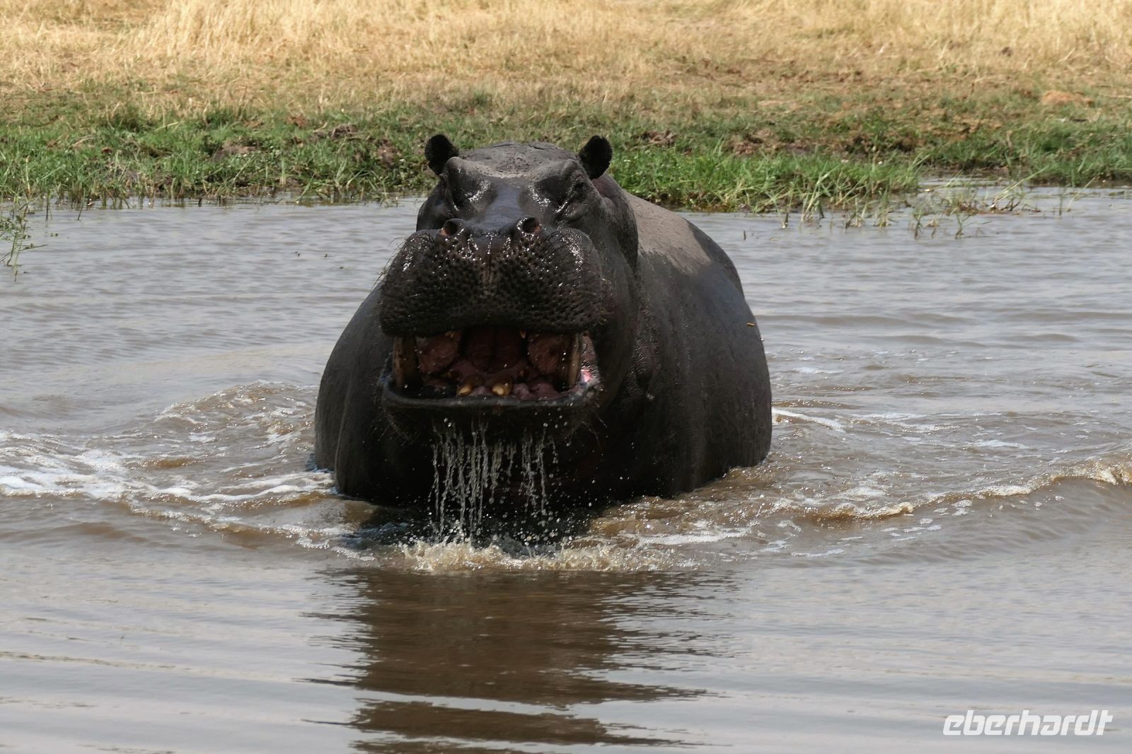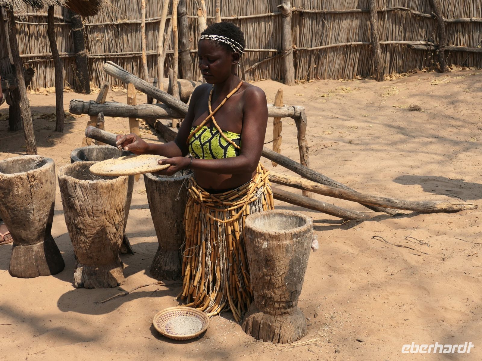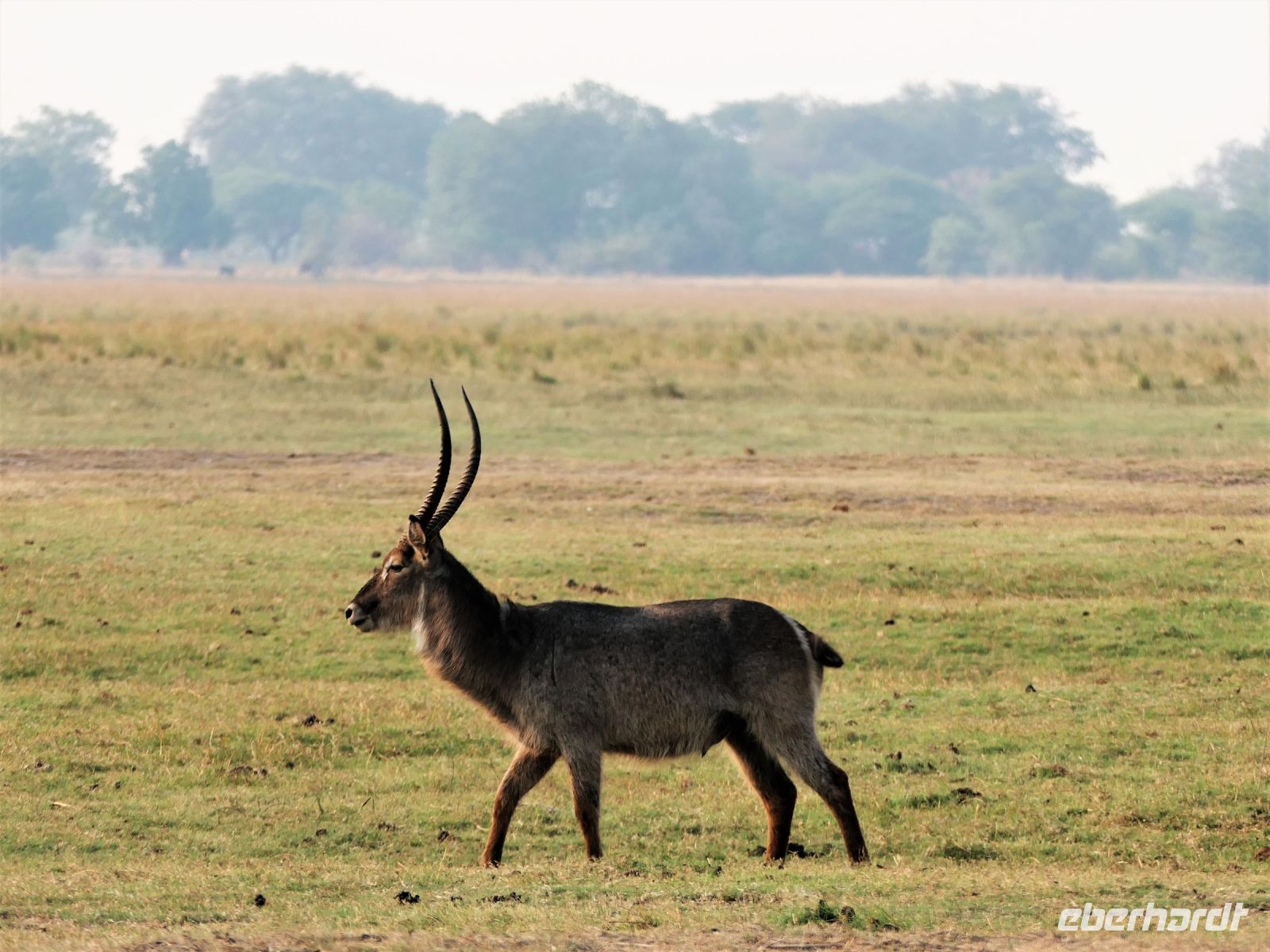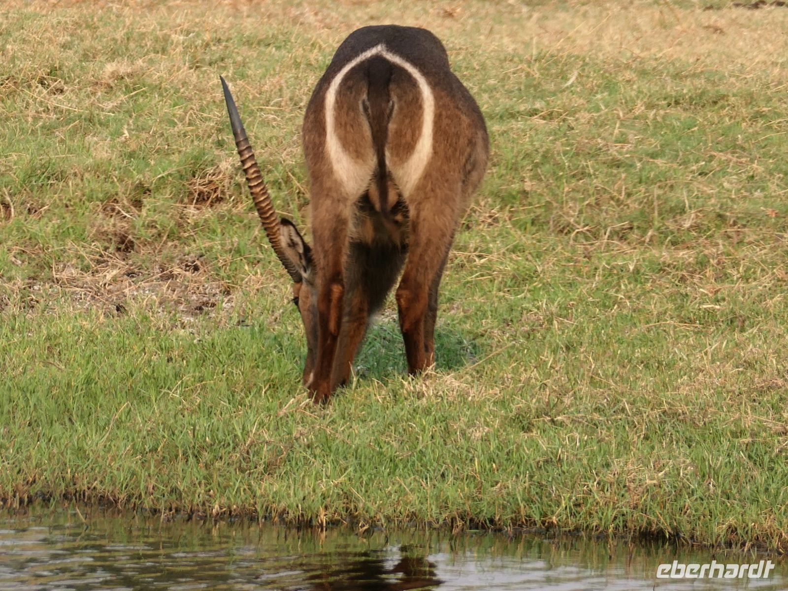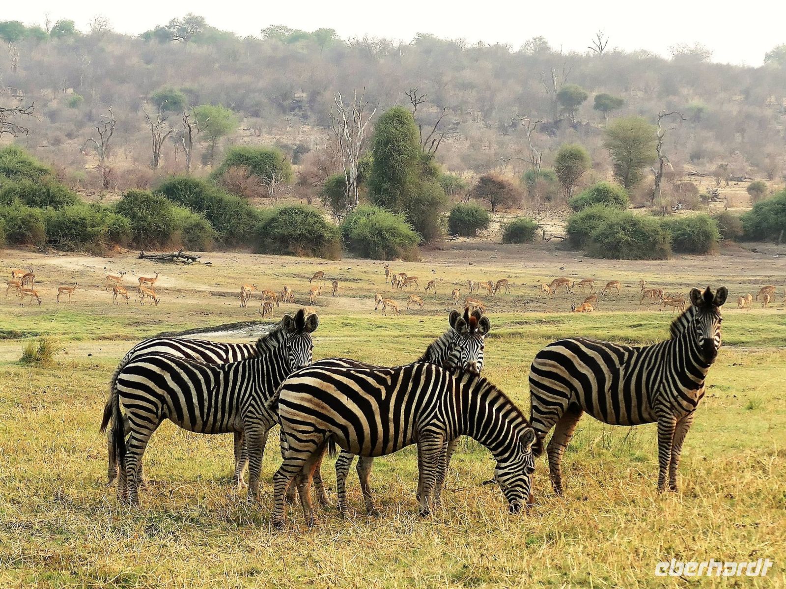 Heute konnten wir ausschlafen, dennoch wurden viele vom Zwitschern der Vögel schon früher geweckt. Zum späten Frühstück begrüßte uns eine Büffelherde, später kam noch ein Krokodil vorbei. In den hohen Bäumen hingen Fledermäuse ab. Unsere Reise ging heute weiter in die Chobe Region. Doch zunächst besuchten wir noch das benachbarte Namushasha Culture Village, ein lebendiges Museumsdorf. Unter einem ca. 1.000 bis 1.500 Jahre alten Baobab erhielten wir von einem Stammesmitglied Einblicke in die Kultur und frühere Lebensweise der Clans: Wie ist so ein Dorf aufgebaut, wie baut man Häuser, wie wohnt man, wer geht welcher Arbeit nach, wie baut und stellt man Fallen, was wird gekocht, gegessen und wie wird getanzt und gesungen. Auch dieser Besuch war interessant und spannend, zumal wir verschiedene Dinge auch selbst ausprobieren konnten, wie Mais stampfen, Fallen stellen oder der "Busch-Trommel" Geräusche zu entlocken, um Flusspferde nachzuahmen und somit zu verscheuchen. Spontan entscheiden wir uns einen anderen Weg zu unserer nächsten Lodge einzuschlagen. Wir fahren nicht erst zurück nach Kongola und fahren die direkte Transitstraße nach Katima Mulilo, sondern fahren auf der erst und Ngoma, sondern fahren die landschaftlich schöner Strecke via Sangwali. Diese Strecke ist seit kurzem vollständig asphaltiert und bequem passierbar. Wir folgten also dem Kwando, der hier den Bogen nach Süden schlägt und Linyanti genannt wird. Via kleiner Nationalparks und entlang der Linyanti Sümpfe an der Grenze zu Botswana begaben wir uns auf die Spuren von David Livingstone. Auf seinen Entdeckungsreise zu den Victoria Wasserfällen kam der berühmte Afrika-Forscher in dieser Region vorbei. Bei Sangwali, ein unscheinbarer Ort, traf Livingstone damals auf den mächtigen Häuptling des Makololo Stammes, der das hier ansässige Volk der Mayeyi als Sklaven unterdrückte. Ein sehr historischer Ort, an dem ein kleines Museum und ein Baobab mit den Initialien von Livingstone noch heute erinnern. Wer mehr darüber erfahren möchte, empfehle ich die Bücher von Konny von Schmettau, die sich ausführlich mit der Geschichte von Livingstone beschäftigt. Unterwegs gab es viel zu schauen: Steppenzebras, Antilopen, vereinzelt Elefanten und natürlich viele Dörfer in dieser wasserreichen und deshalb dicht besiedelten Region. Es war Samstag und die meisten hatten frei. Rinder sind der Stolz der lokalen Bevölkerung. Je größer die Herde, umso reicher der Familienclan. Das sah man auch an den Dörfern. Der Stierkampf zweier Bullen erinnerte an Spanien, Ole! An den Straßenrändern Massenwanderungen der Locals, mit Plastikstühlen bewaffnet. Sie kamen oder gingen wahrscheinlich zu einer Hochzeit oder Feierlichkeit in den benachbarten Dörfern. Die Distanz kann schon ca. 5 bis 10 km sein, das alles zu Fuß und bei Temperaturen um die 35 °C und mehr - kaum vorstellbar für uns. Nach einem kurzen Tankstopp in Katimo Mulilo, dem Verwaltungssitz der Region gelangen wir an den gewaltigen Sambesi, parallel fuhren wir nach Ngoma. Der Kwando (Linyanti), der sich zunächst in südlicher Richtung abwandte, trafen wir in Ngoma wieder. Ab hier heißt der Linyanti dann Chobe. Wir sahen bereits, dass er sehr wenig Wasser führt, extrem wenig für diese Zeit. Kurz vor der Ngoma Bridge bogen wir links ab. Am namibischen Ufer des Chobe befindet sich unsere nächste Unterkunft, das Chobe River Camp, das Camp der langen Wege. Wir bezogen unsere