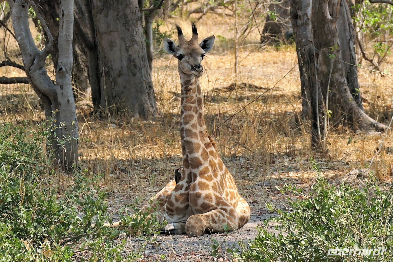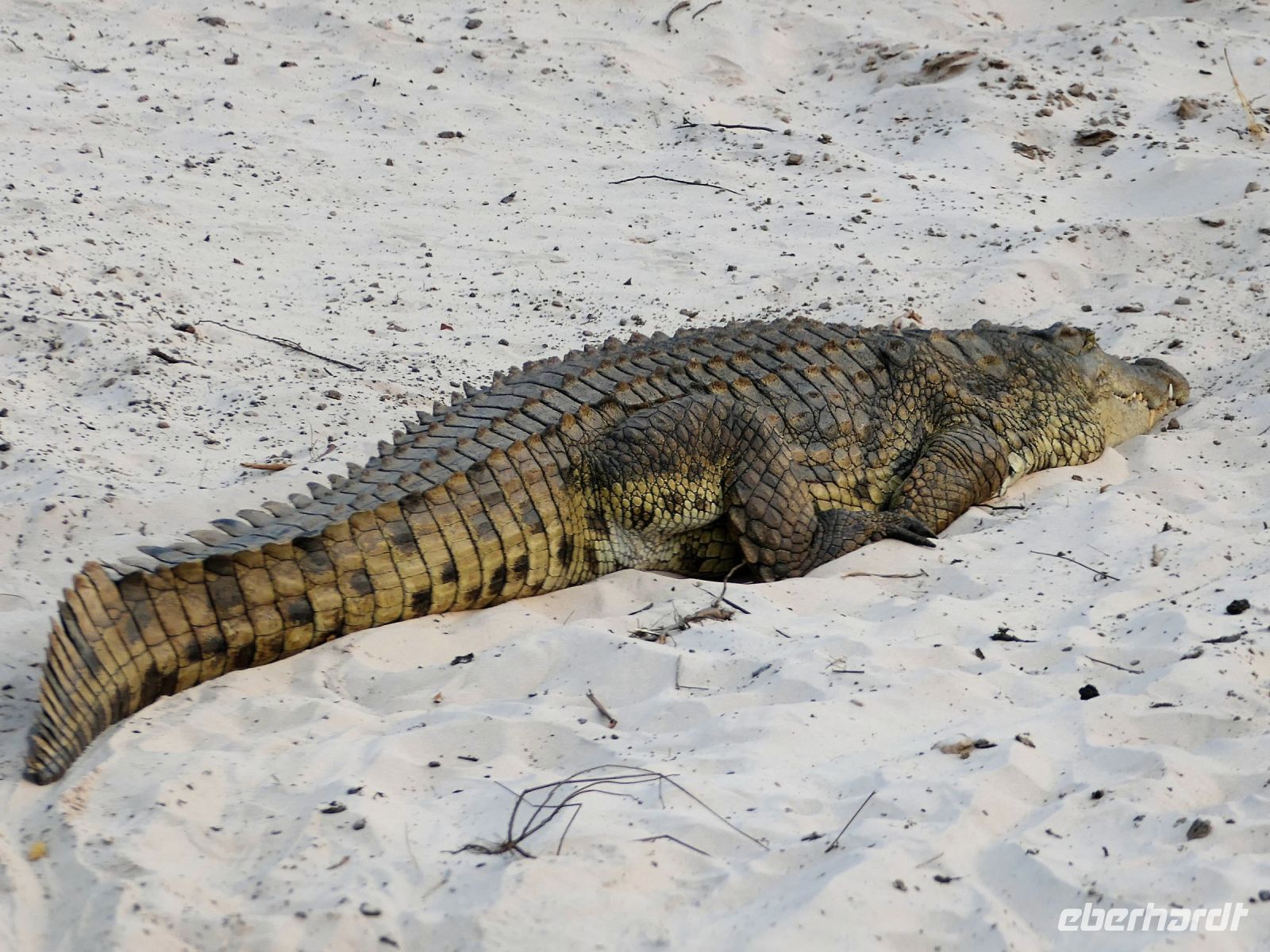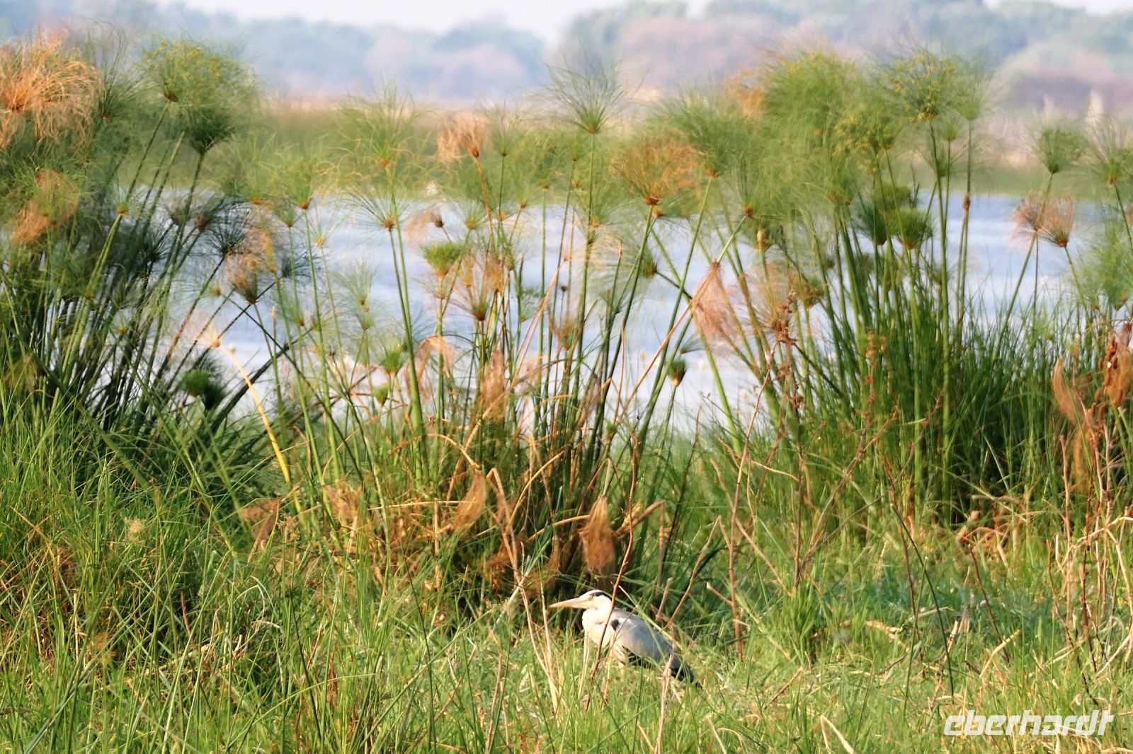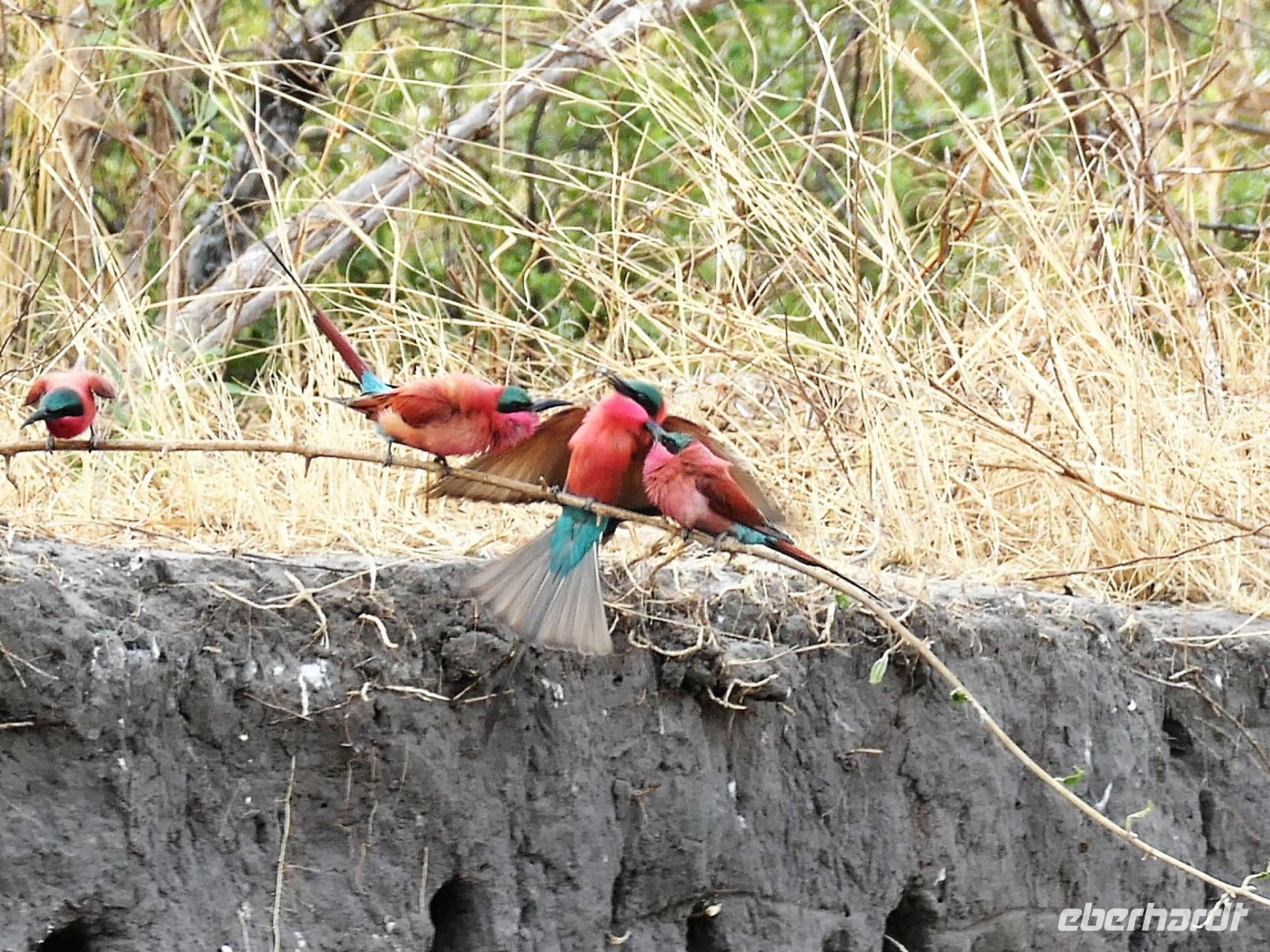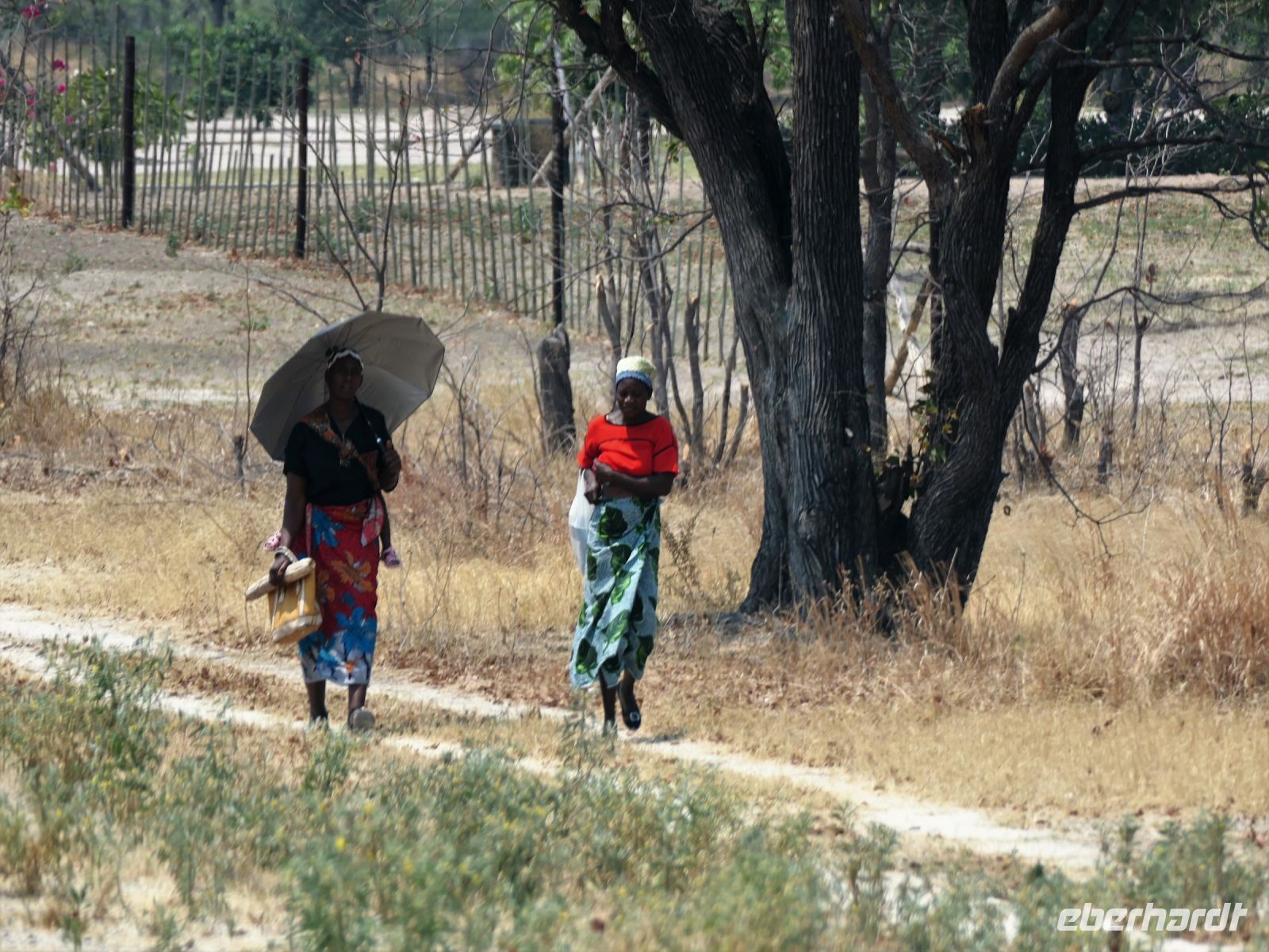 Heute konnten wir ausschlafen, dennoch wurden viele vom Zwitschern der Vögel schon früher geweckt. Zum späten Frühstück begrüßte uns eine Büffelherde, später kam noch ein Krokodil vorbei. In den hohen Bäumen hingen Fledermäuse ab. Unsere Reise ging heute weiter in die Chobe Region. Doch zunächst besuchten wir noch das benachbarte Namushasha Culture Village, ein lebendiges Museumsdorf. Unter einem ca. 1.000 bis 1.500 Jahre alten Baobab erhielten wir von einem Stammesmitglied Einblicke in die Kultur und frühere Lebensweise der Clans: Wie ist so ein Dorf aufgebaut, wie baut man Häuser, wie wohnt man, wer geht welcher Arbeit nach, wie baut und stellt man Fallen, was wird gekocht, gegessen und wie wird getanzt und gesungen. Auch dieser Besuch war interessant und spannend, zumal wir verschiedene Dinge auch selbst ausprobieren konnten, wie Mais stampfen, Fallen stellen oder der "Busch-Trommel" Geräusche zu entlocken, um Flusspferde nachzuahmen und somit zu verscheuchen. Spontan entscheiden wir uns einen anderen Weg zu unserer nächsten Lodge einzuschlagen. Wir fahren nicht erst zurück nach Kongola und fahren die direkte Transitstraße nach Katima Mulilo, sondern fahren auf der erst und Ngoma, sondern fahren die landschaftlich schöner Strecke via Sangwali. Diese Strecke ist seit kurzem vollständig asphaltiert und bequem passierbar. Wir folgten also dem Kwando, der hier den Bogen nach Süden schlägt und Linyanti genannt wird. Via kleiner Nationalparks und entlang der Linyanti Sümpfe an der Grenze zu Botswana begaben wir uns auf die Spuren von David Livingstone. Auf seinen Entdeckungsreise zu den Victoria Wasserfällen kam der berühmte Afrika-Forscher in dieser Region vorbei. Bei Sangwali, ein unscheinbarer Ort, traf Livingstone damals auf den mächtigen Häuptling des Makololo Stammes, der das hier ansässige Volk der Mayeyi als Sklaven unterdrückte. Ein sehr historischer Ort, an dem ein kleines Museum und ein Baobab mit den Initialien von Livingstone noch heute erinnern. Wer mehr darüber erfahren möchte, empfehle ich die Bücher von Konny von Schmettau, die sich ausführlich mit der Geschichte von Livingstone beschäftigt. Unterwegs gab es viel zu schauen: Steppenzebras, Antilopen, vereinzelt Elefanten und natürlich viele Dörfer in dieser wasserreichen und deshalb dicht besiedelten Region. Es war Samstag und die meisten hatten frei. Rinder sind der Stolz der lokalen Bevölkerung. Je größer die Herde, umso reicher der Familienclan. Das sah man auch an den Dörfern. Der Stierkampf zweier Bullen erinnerte an Spanien, Ole! An den Straßenrändern Massenwanderungen der Locals, mit Plastikstühlen bewaffnet. Sie kamen oder gingen wahrscheinlich zu einer Hochzeit oder Feierlichkeit in den benachbarten Dörfern. Die Distanz kann schon ca. 5 bis 10 km sein, das alles zu Fuß und bei Temperaturen um die 35 °C und mehr - kaum vorstellbar für uns. Nach einem kurzen Tankstopp in Katimo Mulilo, dem Verwaltungssitz der Region gelangen wir an den gewaltigen Sambesi, parallel fuhren wir nach Ngoma. Der Kwando (Linyanti), der sich zunächst in südlicher Richtung abwandte, trafen wir in Ngoma wieder. Ab hier heißt der Linyanti dann Chobe. Wir sahen bereits, dass er sehr wenig Wasser führt, extrem wenig für diese Zeit. Kurz vor der Ngoma Bridge bogen wir links ab. Am namibischen Ufer des Chobe befindet sich unsere nächste Unterkunft, das Chobe River Camp, das Camp der langen Wege. Wir bezogen unsere